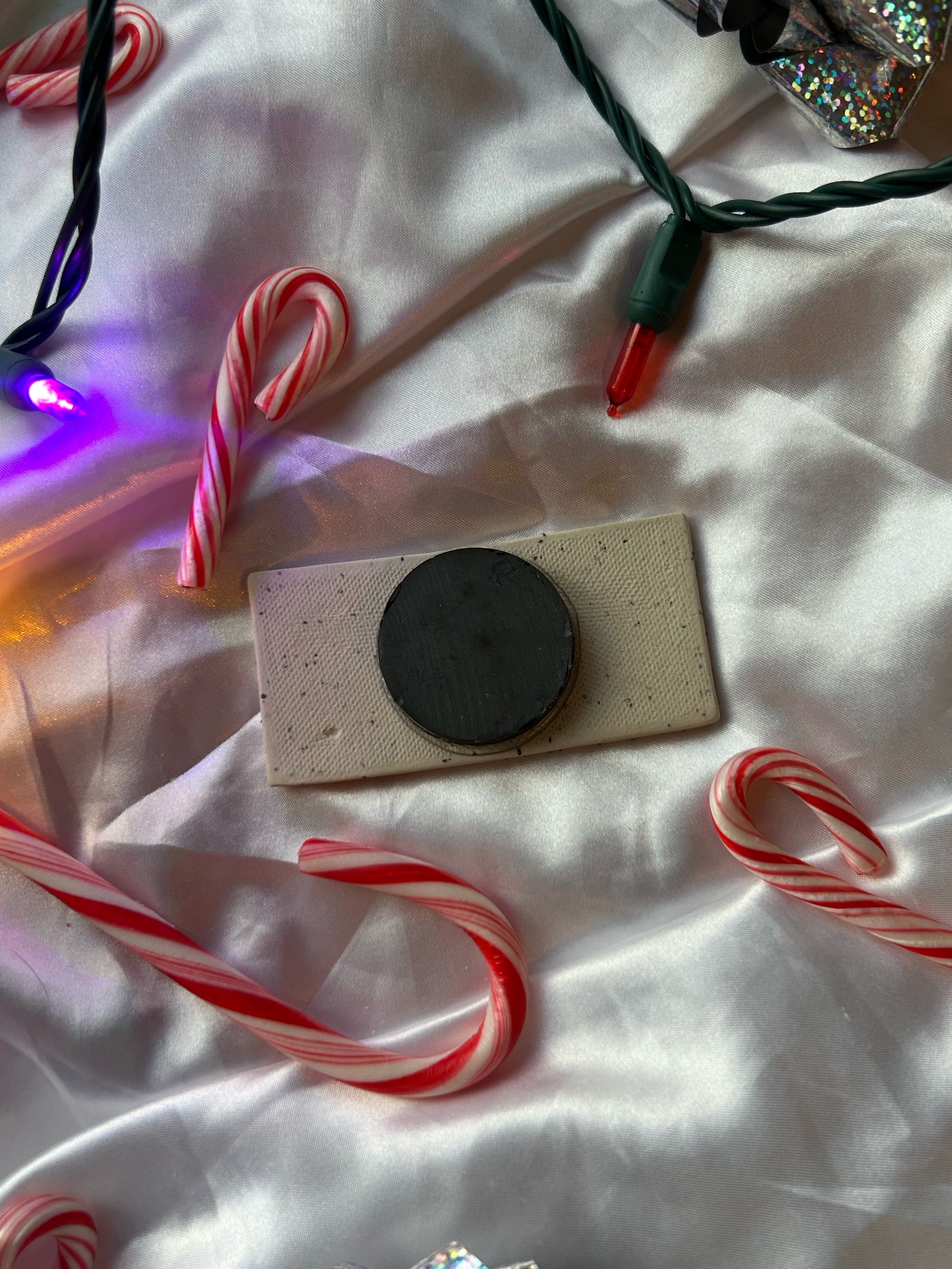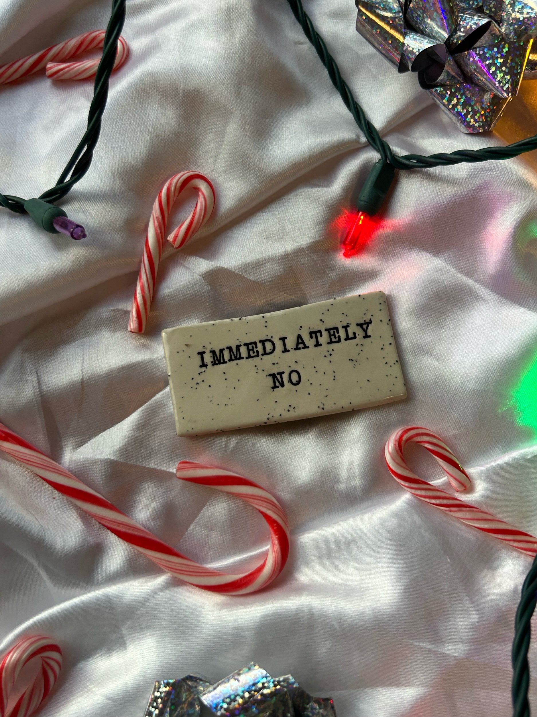 Large rectangle made with black speckled clay and black stamped lettering that reads “IMMEDIATELY NO”