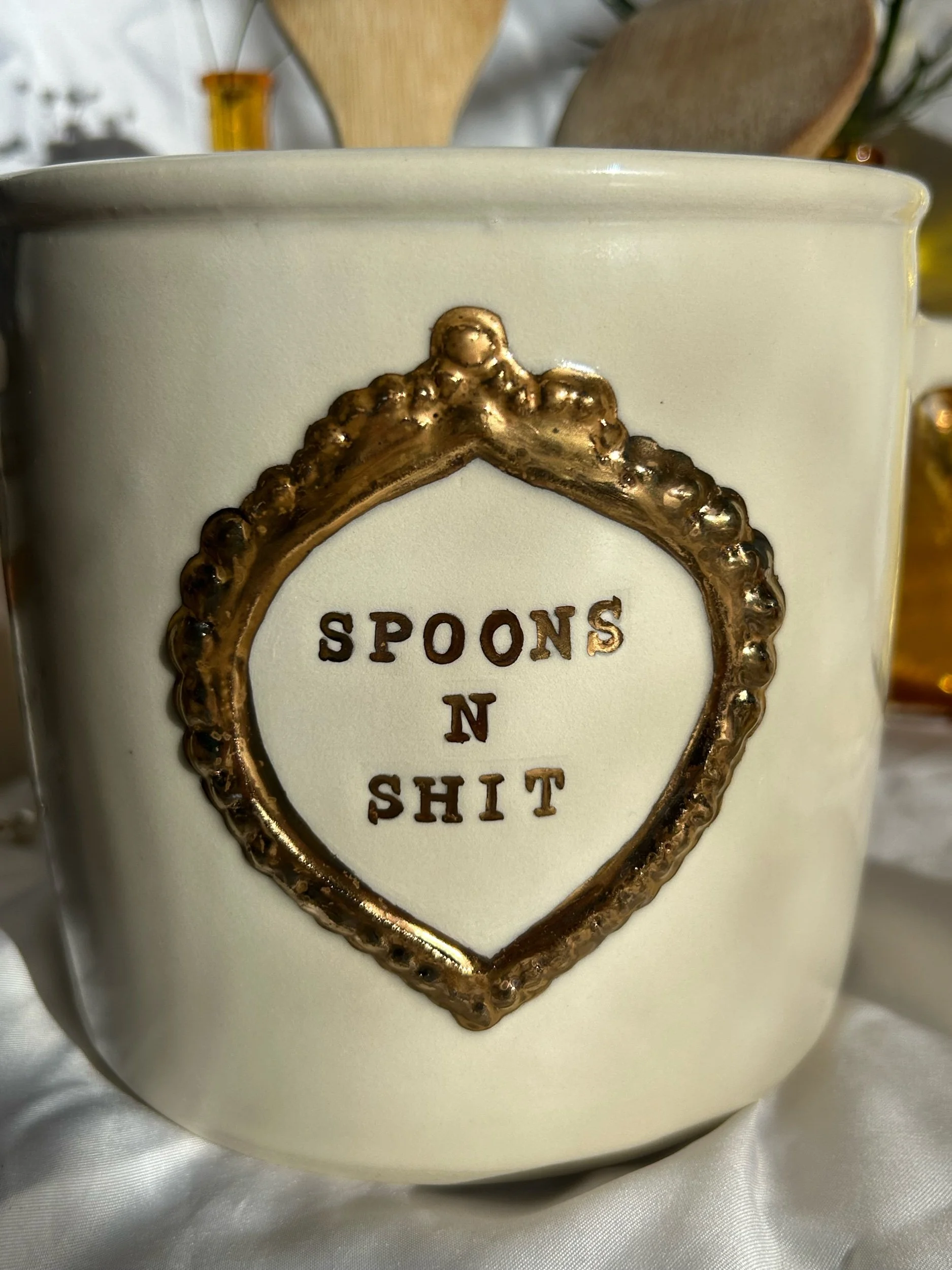 Medium sized utensil holder decorated with an intricate gold frame and gold stamped lettering that reads “spoons n shit”