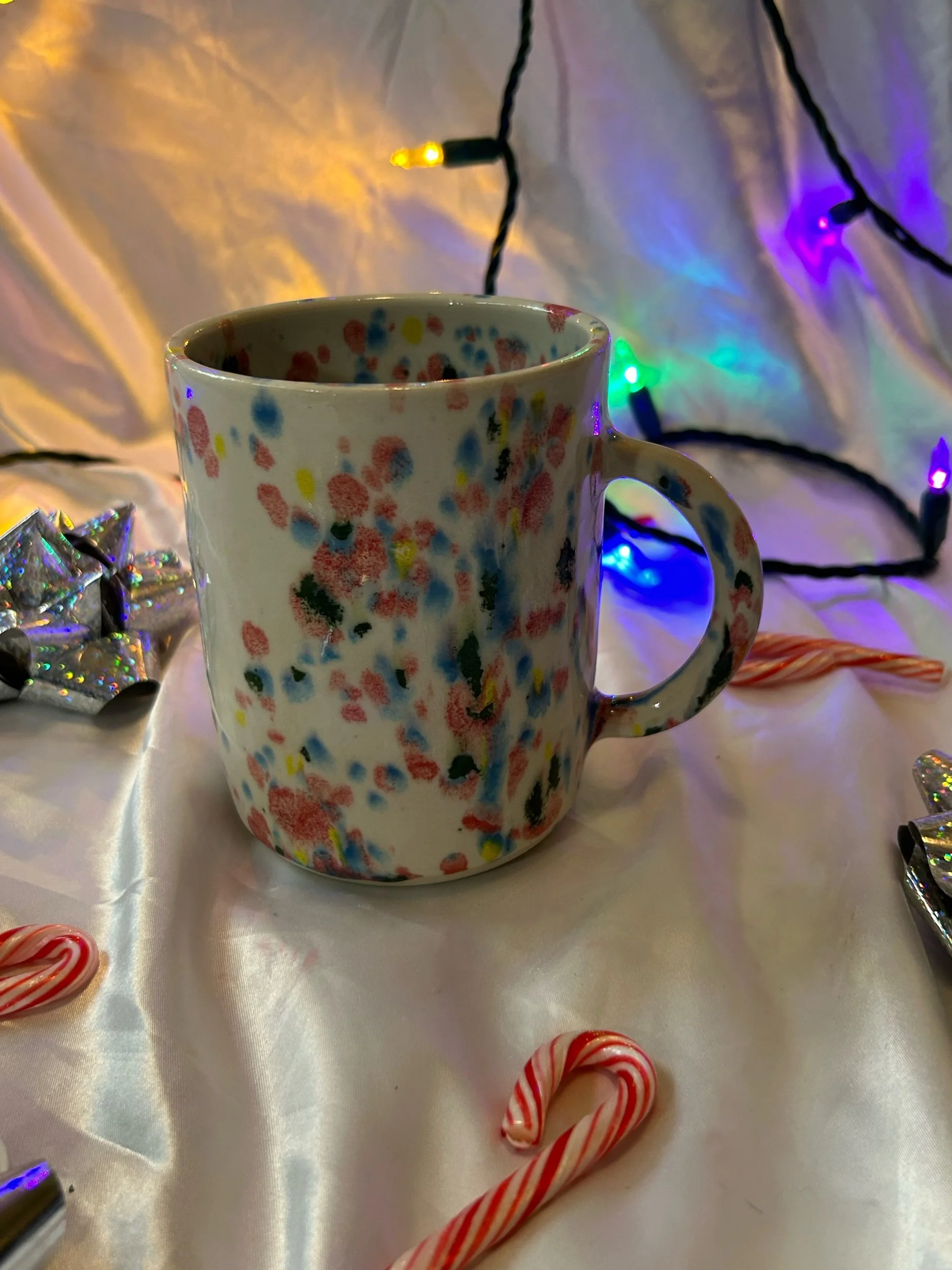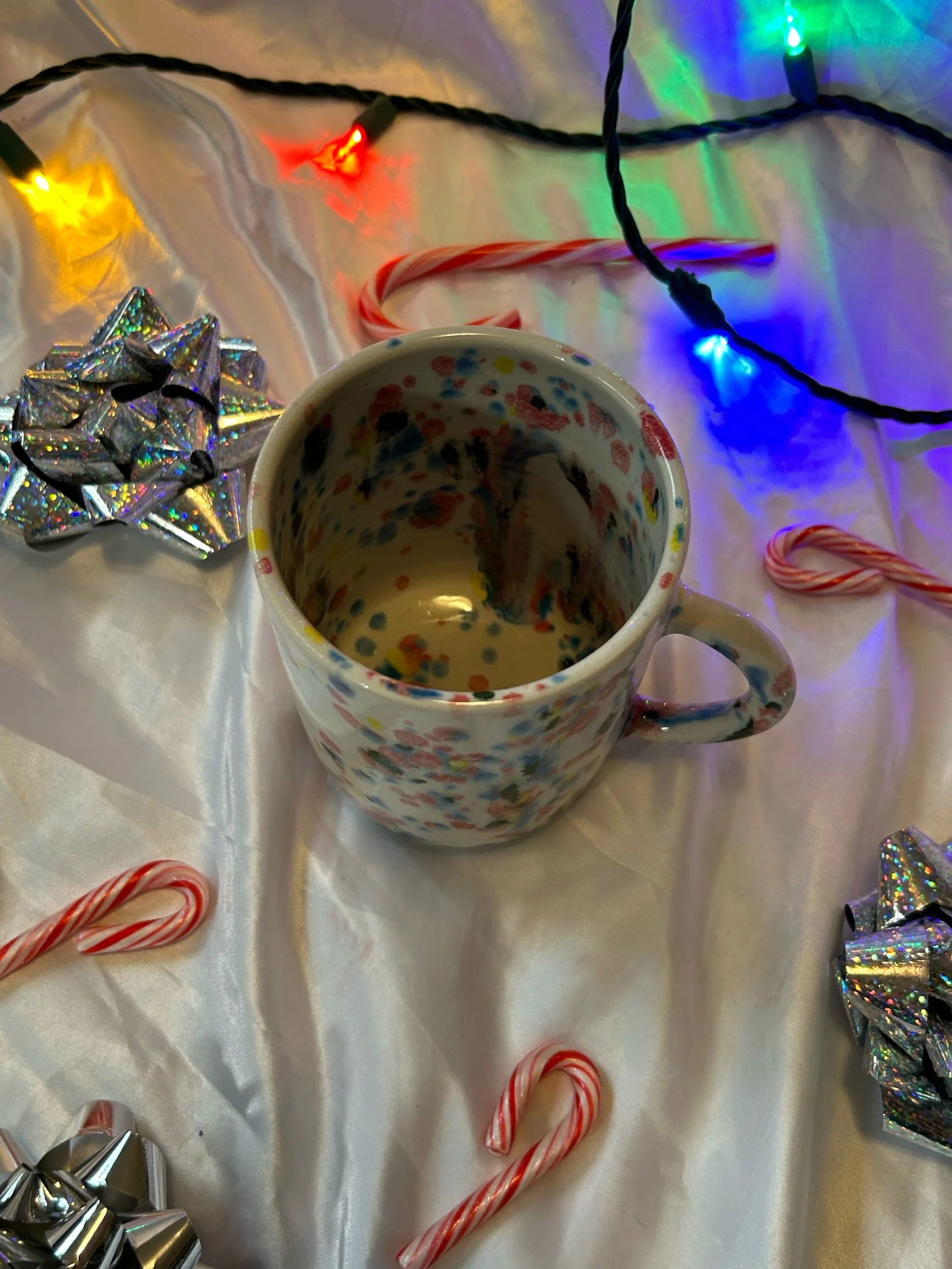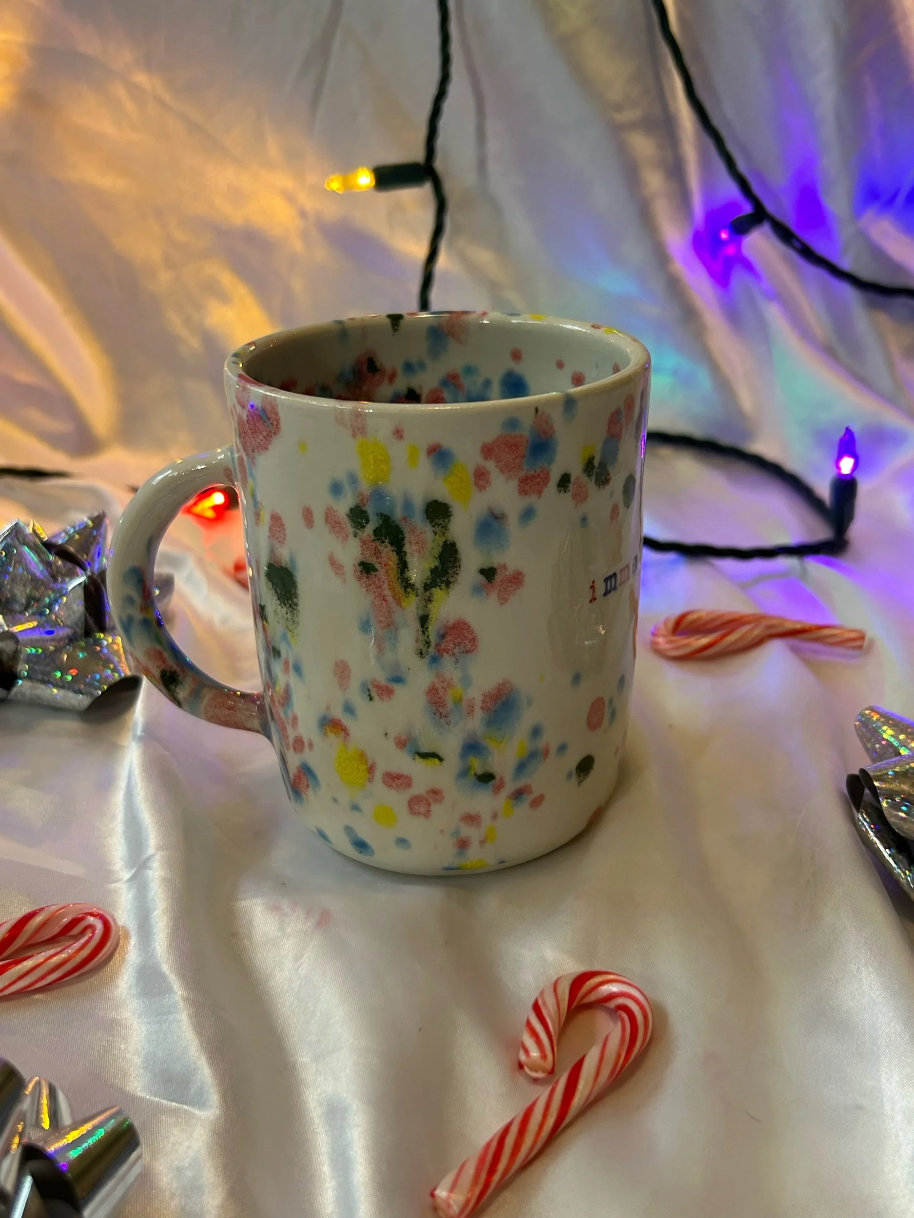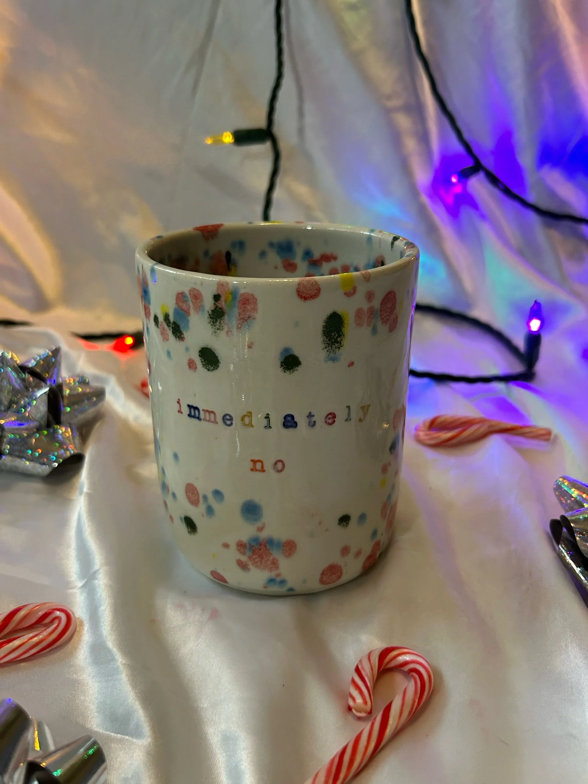 Large sized mug with handle. Glazed in rainbow funfetti colors with rainbow stamped lettering that reads “immediately no”