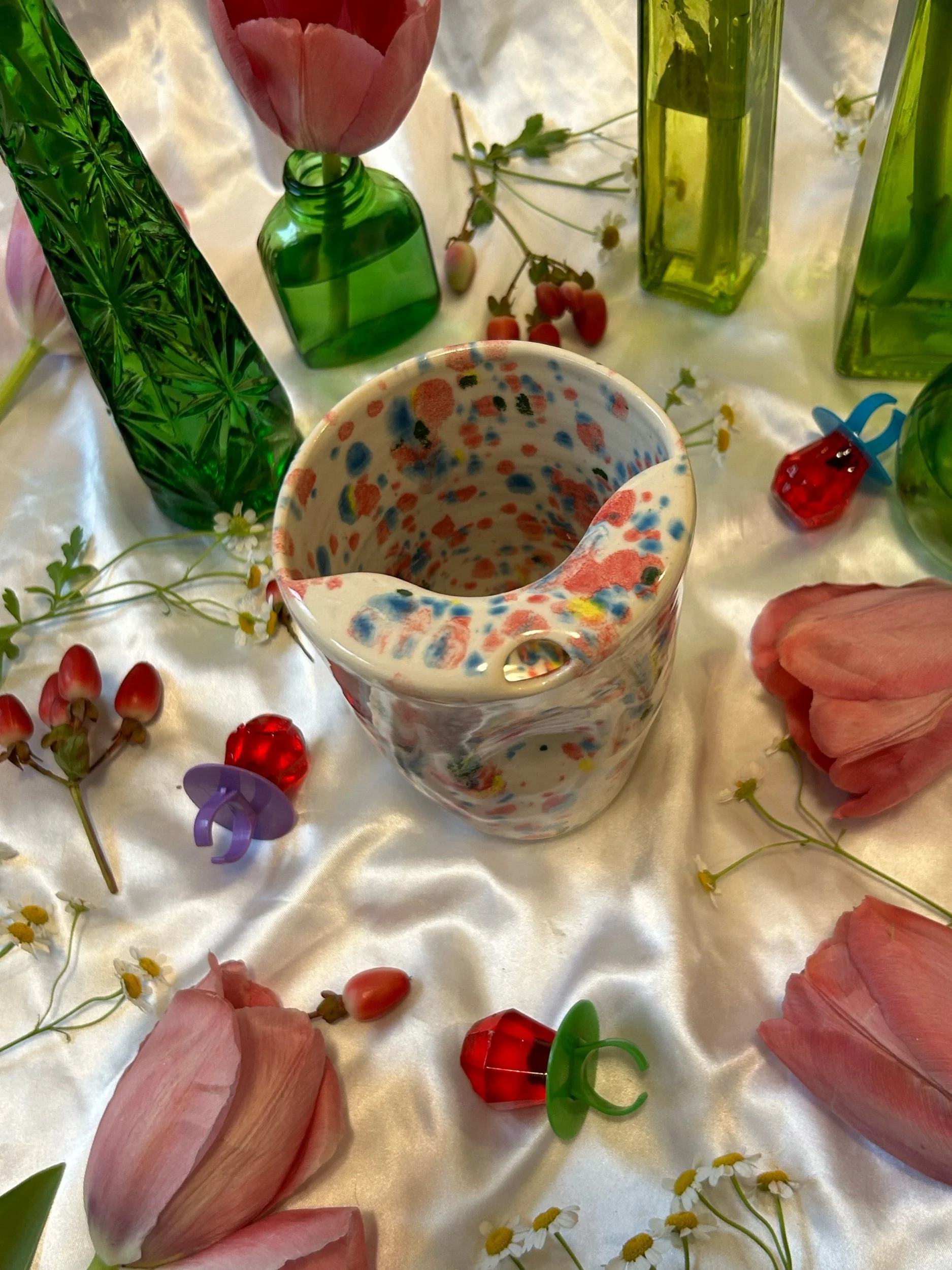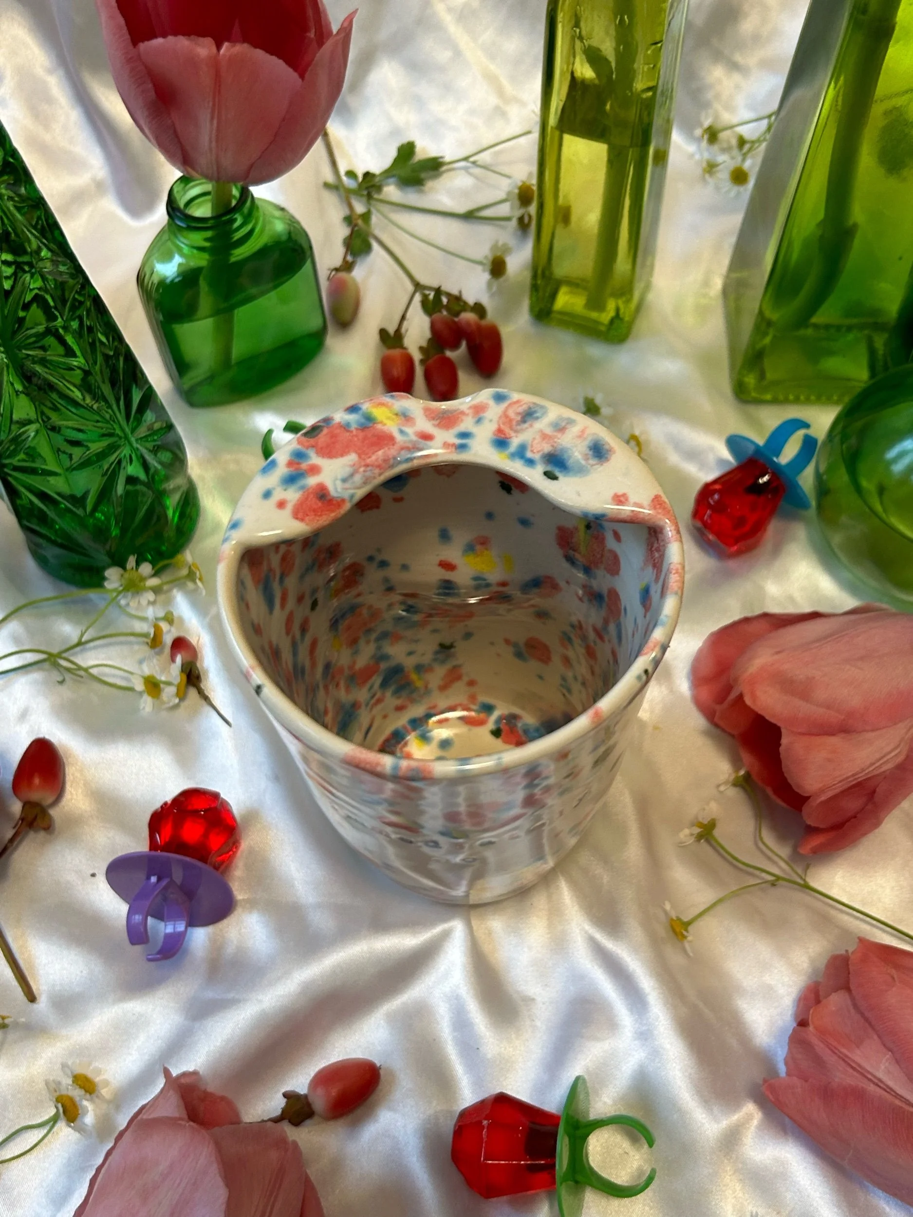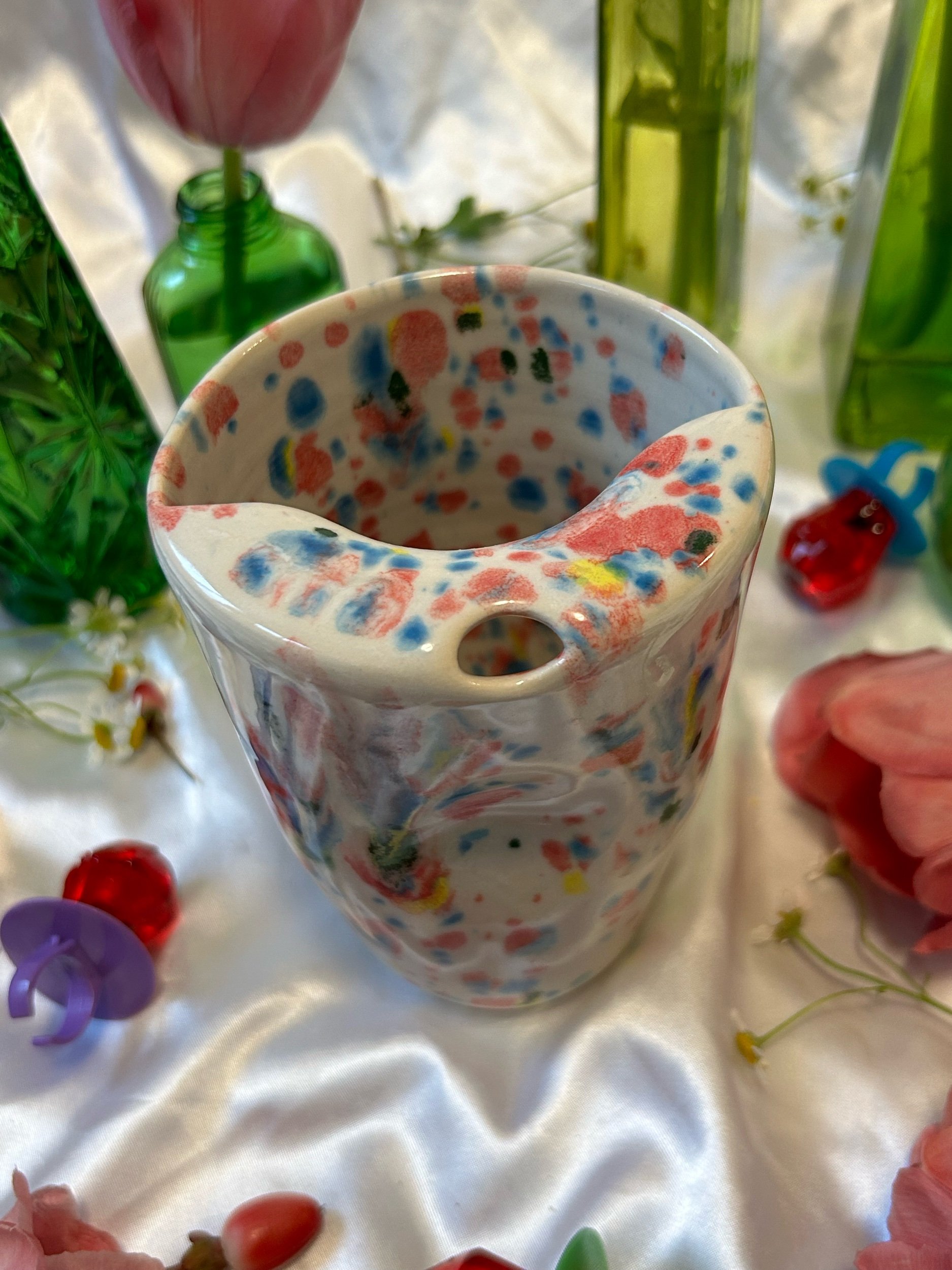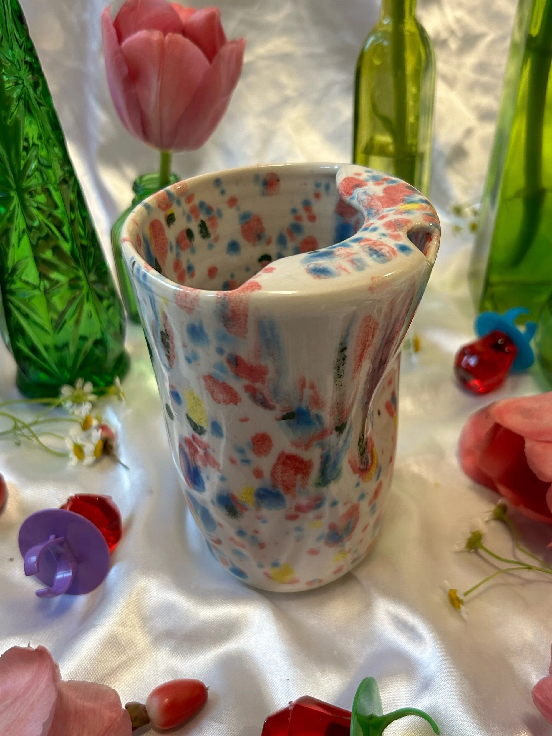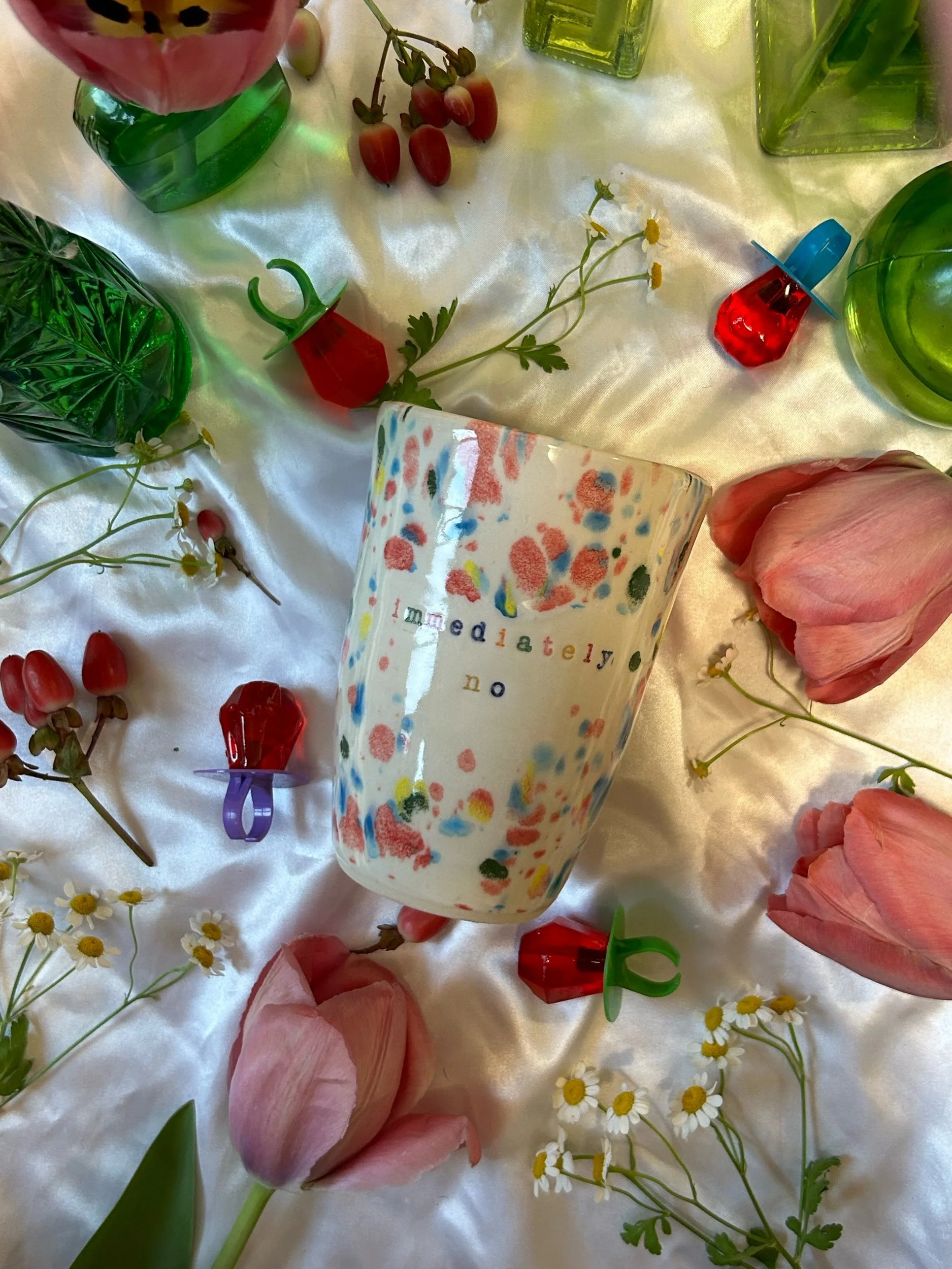 Medium sized tumbler with thumbprint hold and sip “lid” or straw hole, decorated with rainbow stamped lettering that reads “immediately no” and glazed in rainbow funfetti colors.