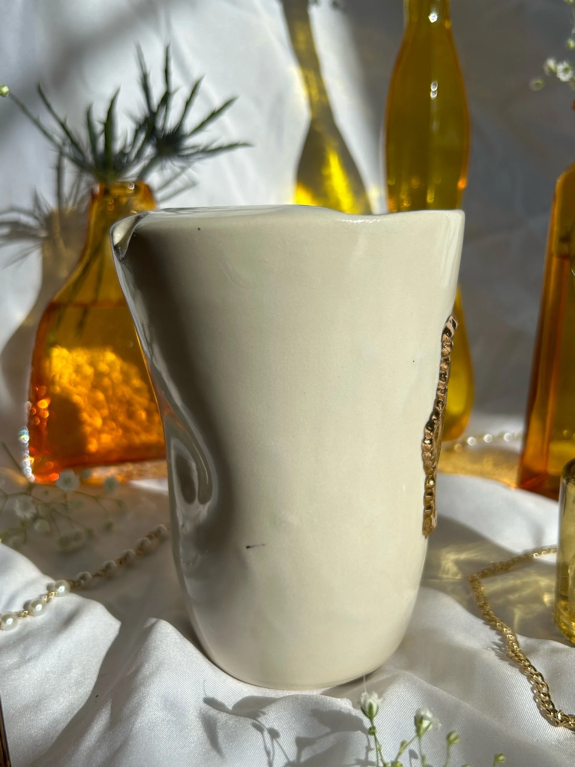 Medium sized tumbler with thumbprint hold and sip “lid” or straw hole, decorated with intricate gold frame and gold stamped lettering that reads “go away, I’m reading”