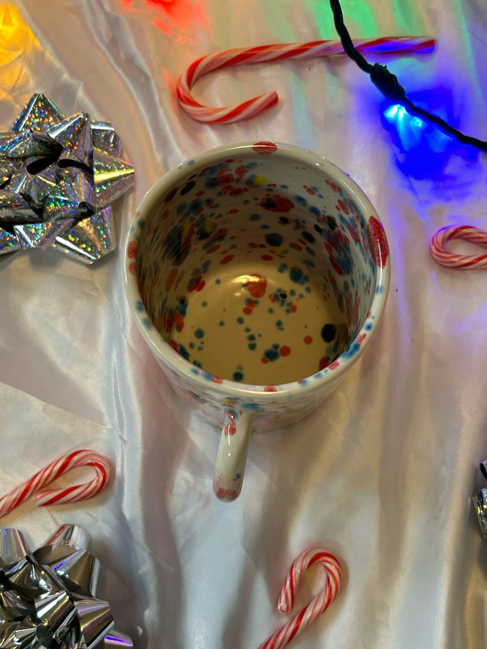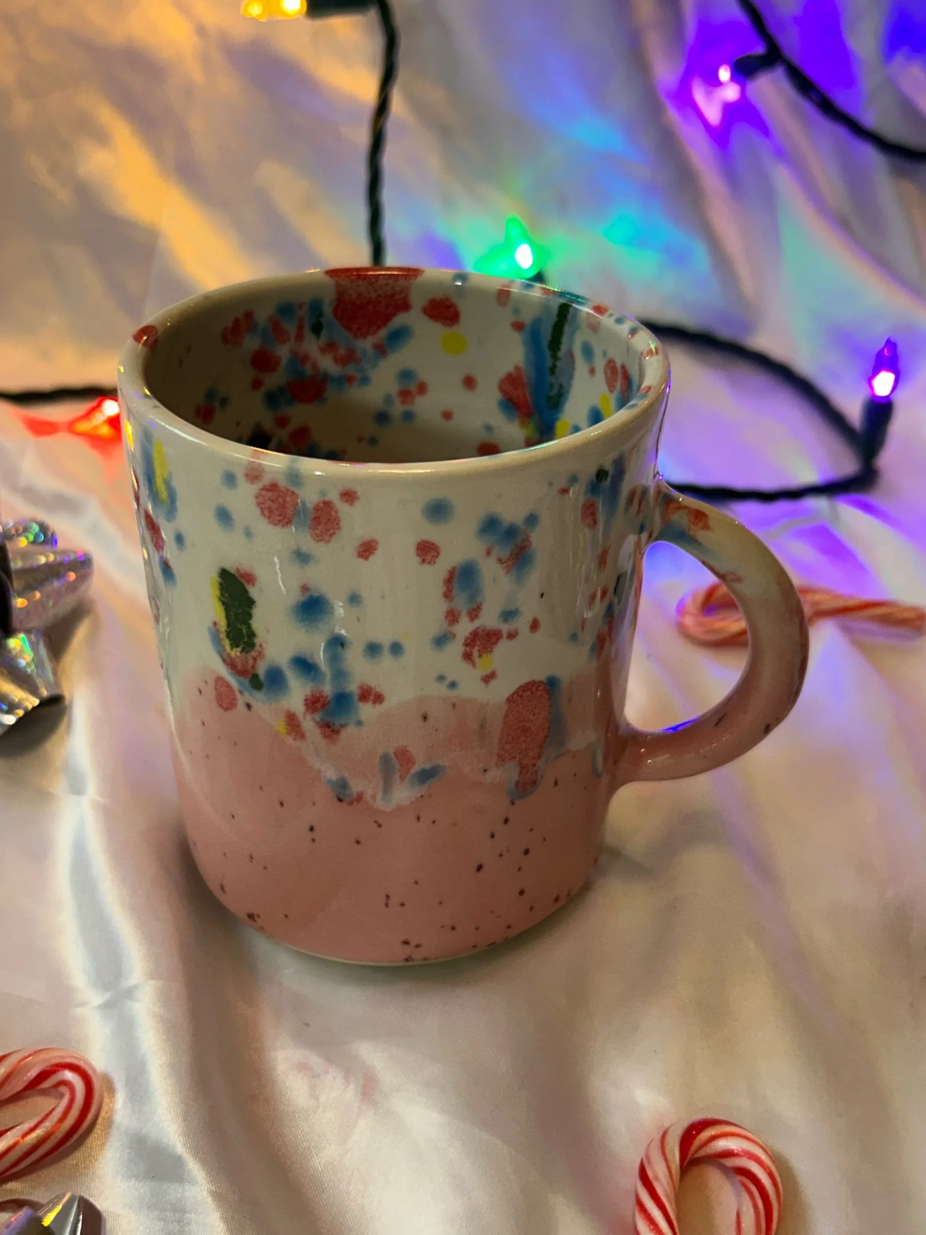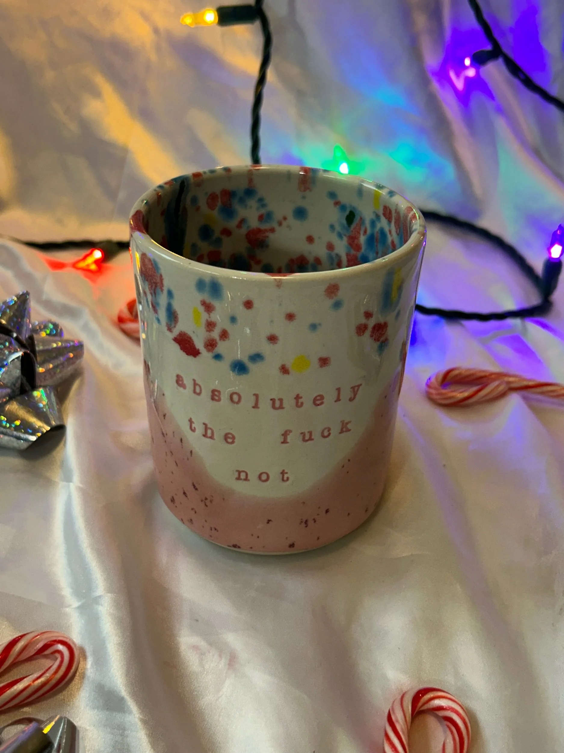 Large mug with handle. Glazed in rainbow funfetti and pink pop-tart colors with pink stamped lettering that reads “absolutely the fuck not”