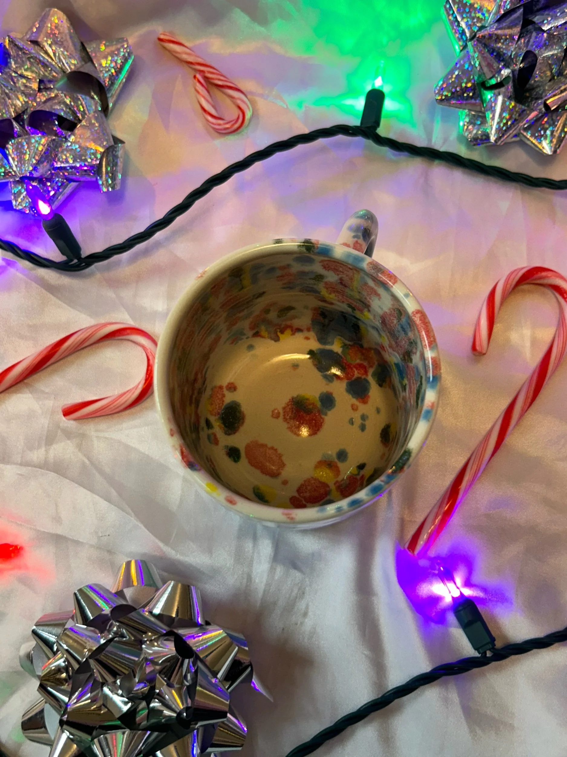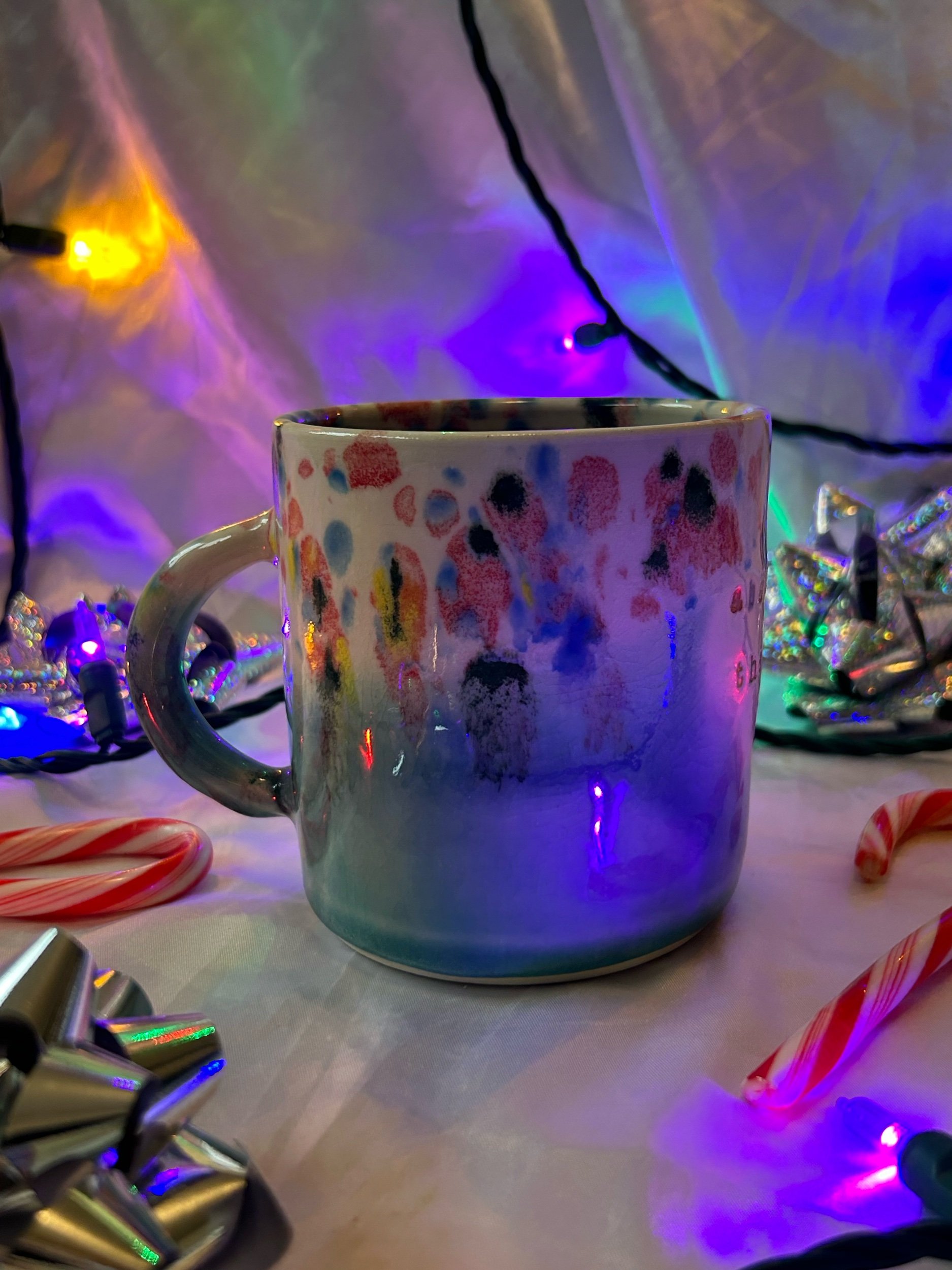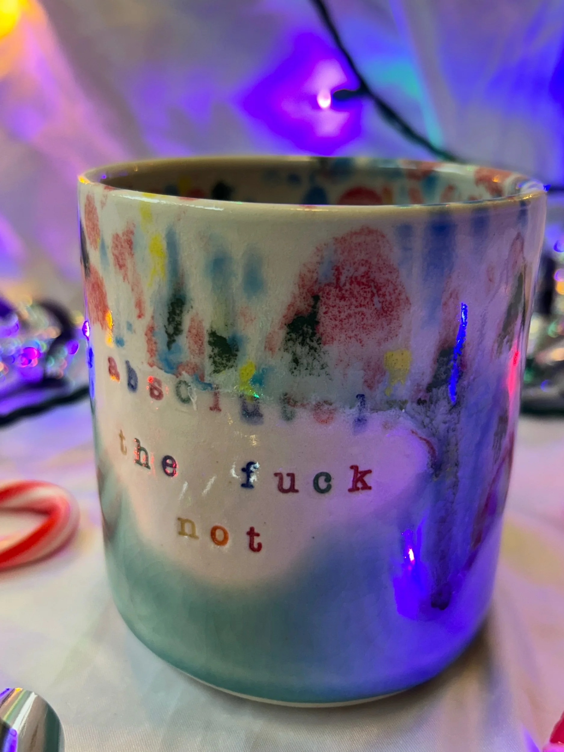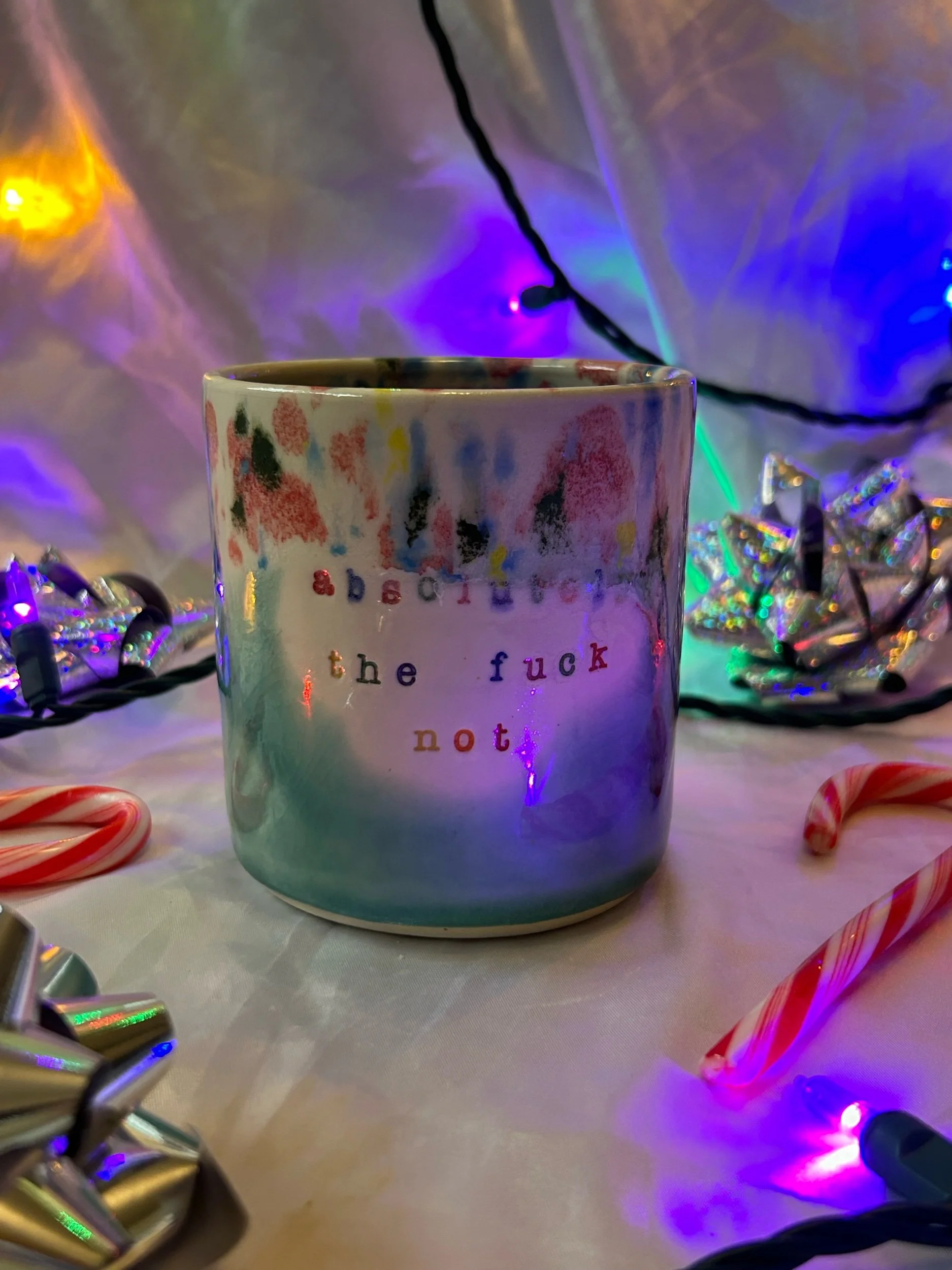 Medium mug with handle. Glazed in rainbow funfetti and turquoise colors with rainbow stamped lettering that reads “absolutely the fuck not”