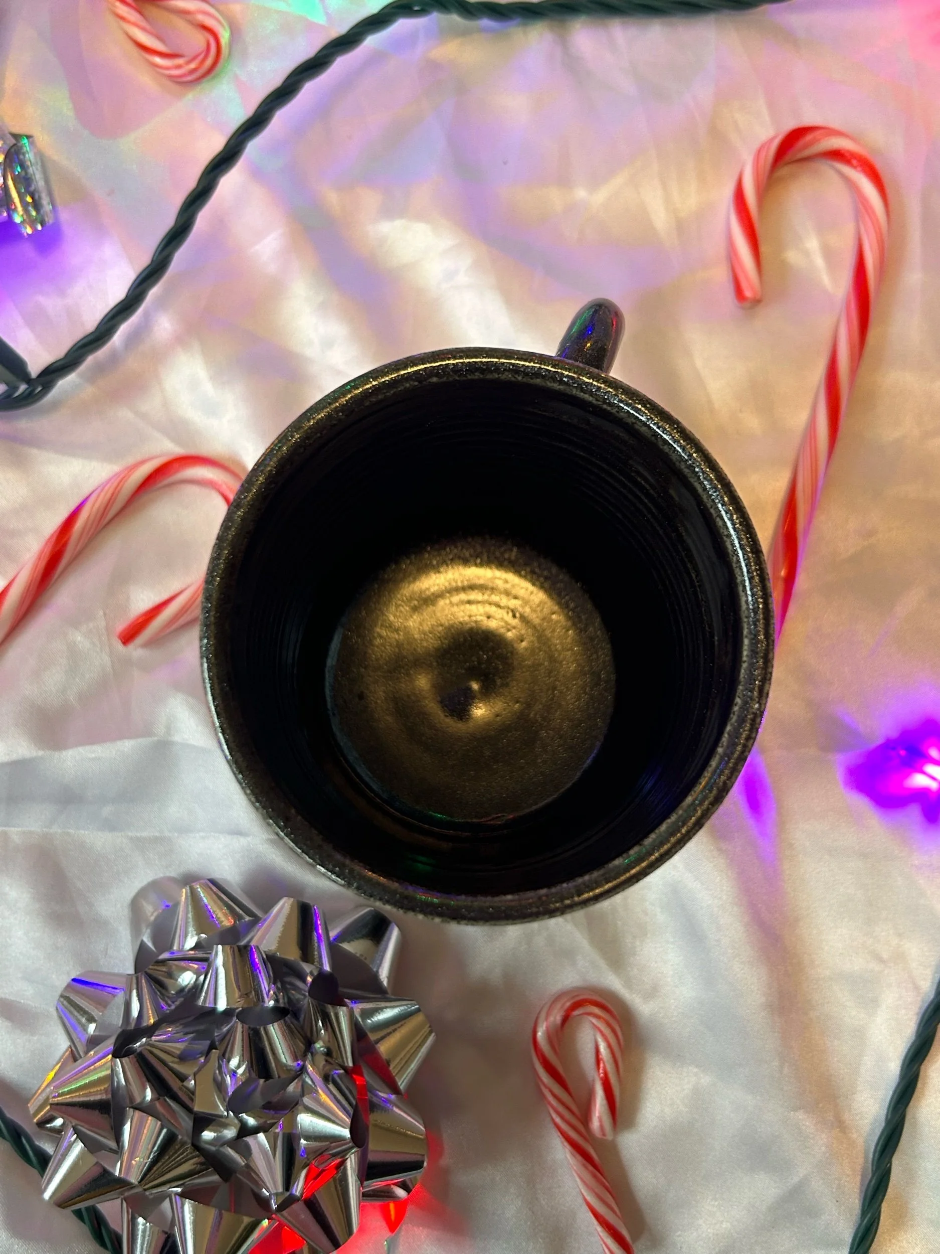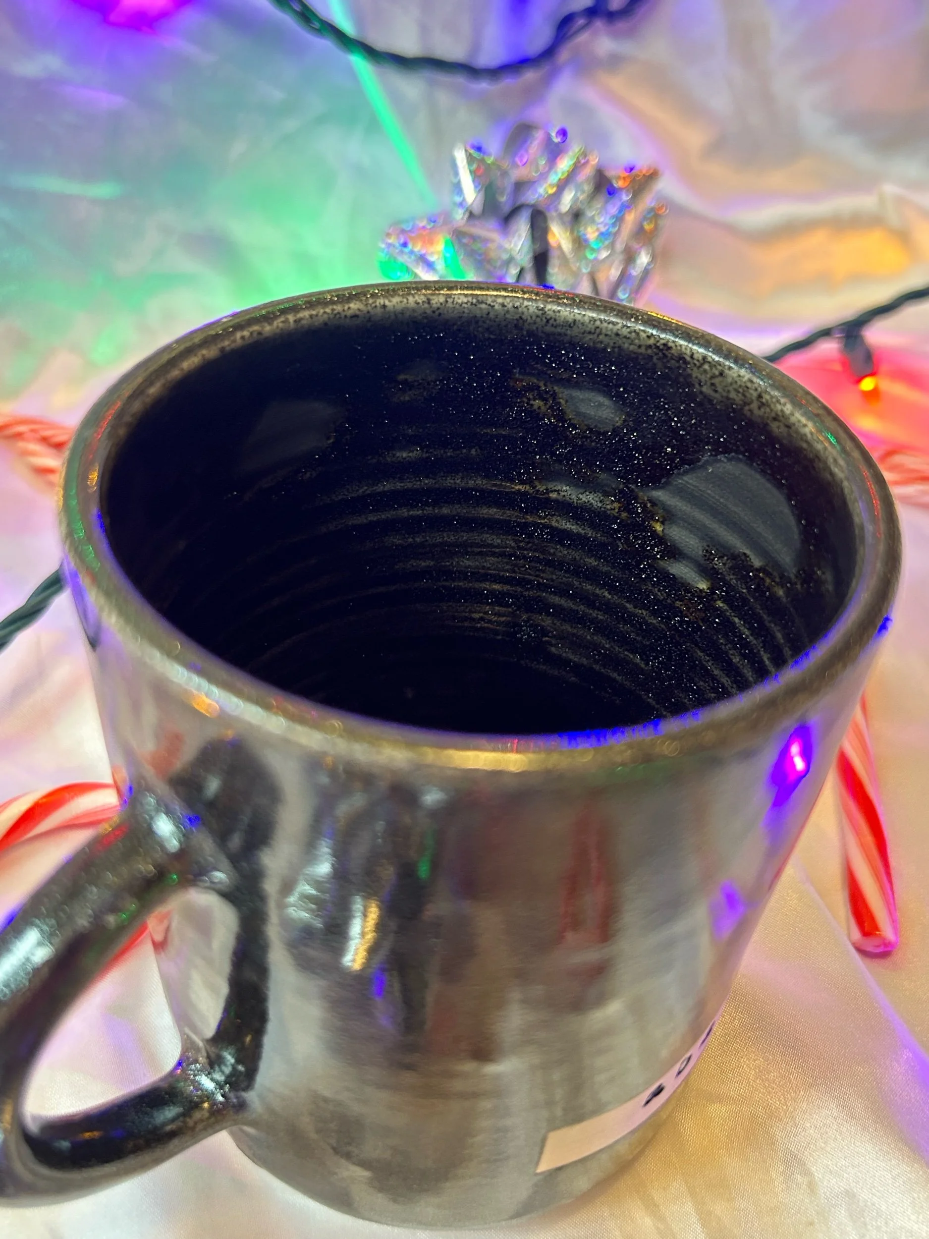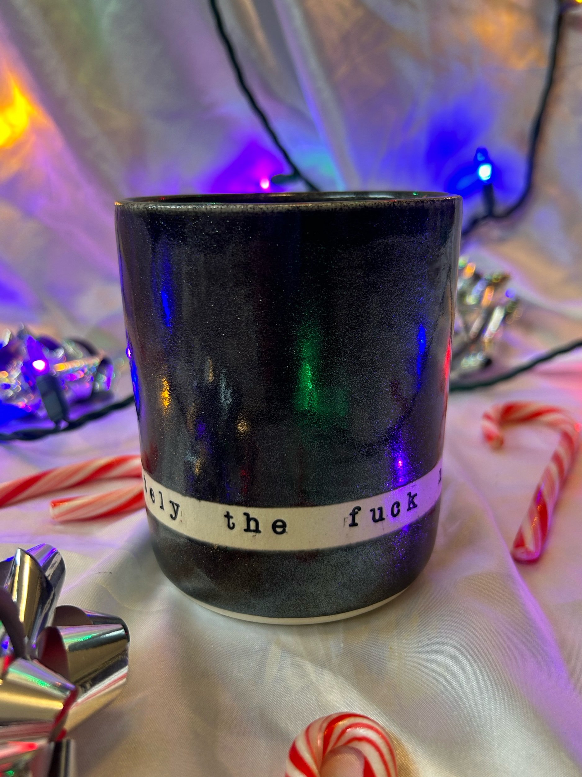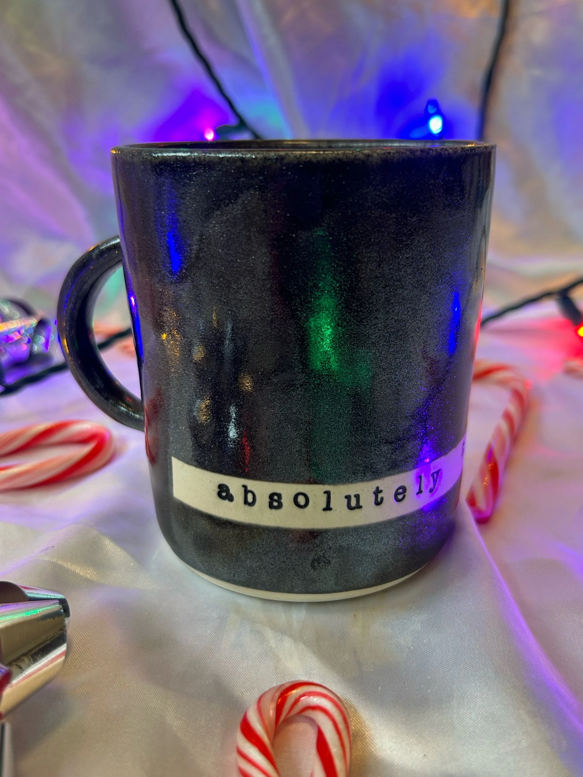 Medium mug with handle. Glazed in a sparkly, iridescent black with black stamped lettering that reads “absolutely the fuck not”