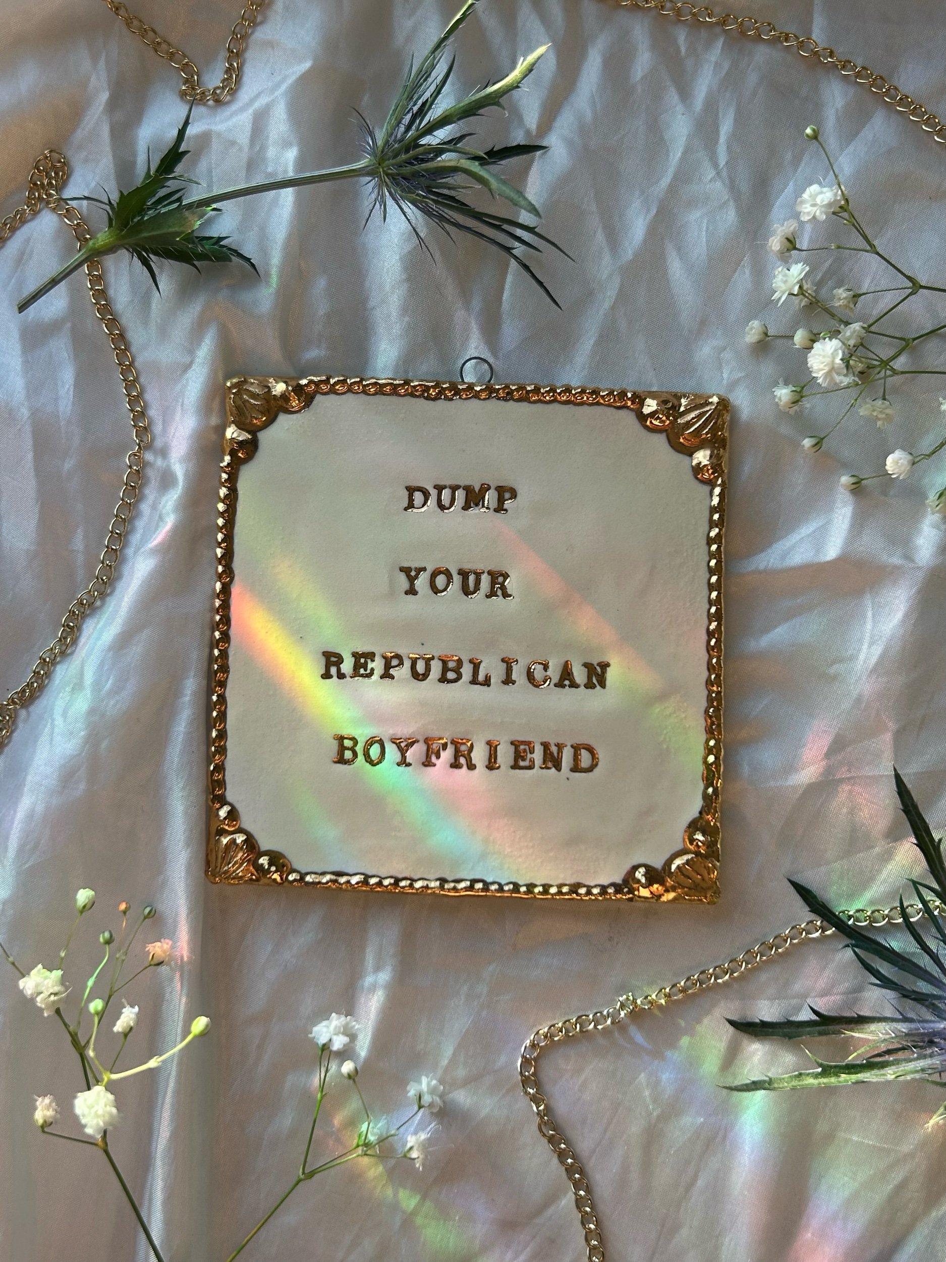 Decorative wall hanging with intricate gold frame detailing around the border and gold stamped lettering that reads “dump your republican boyfriend”