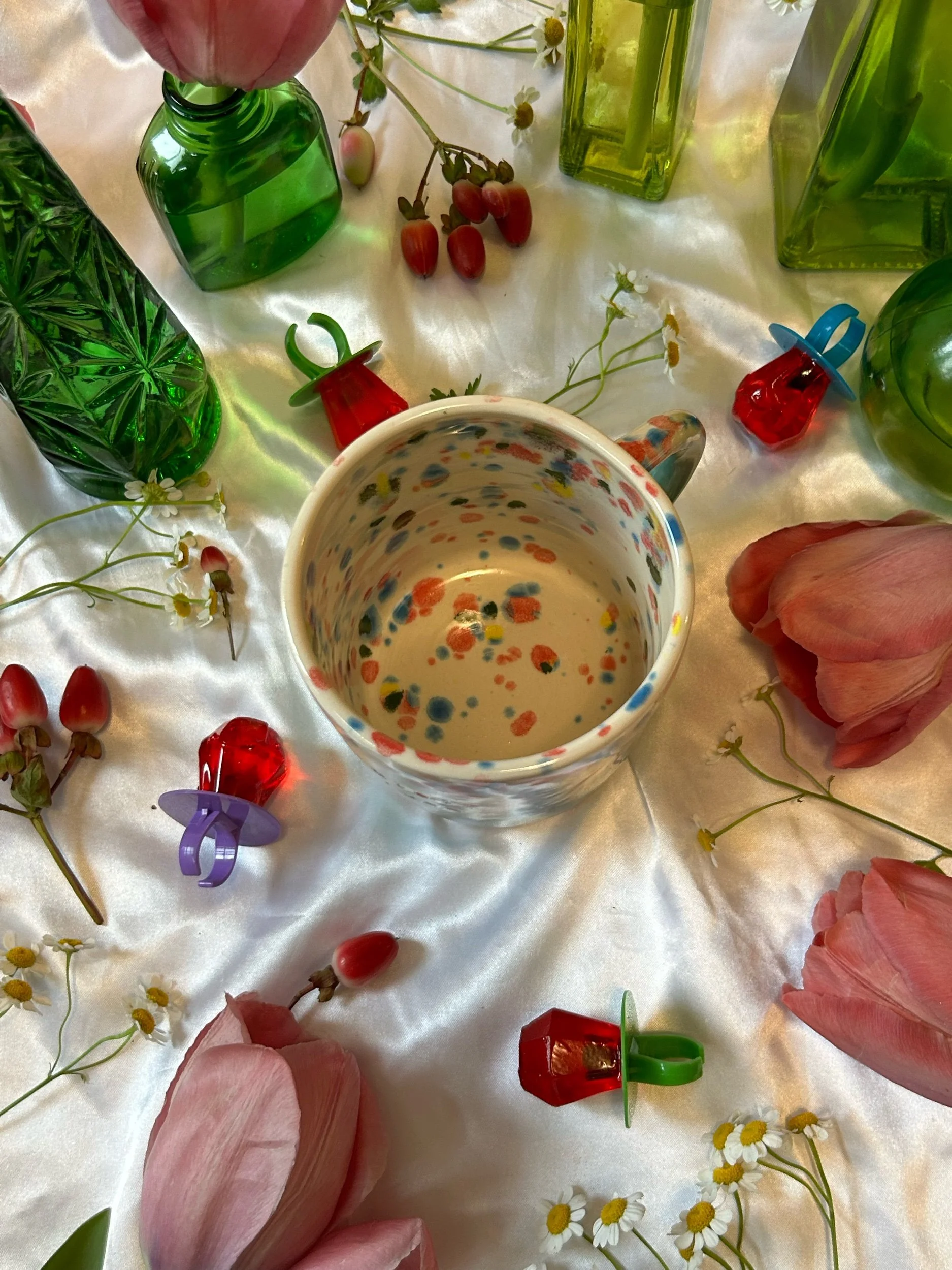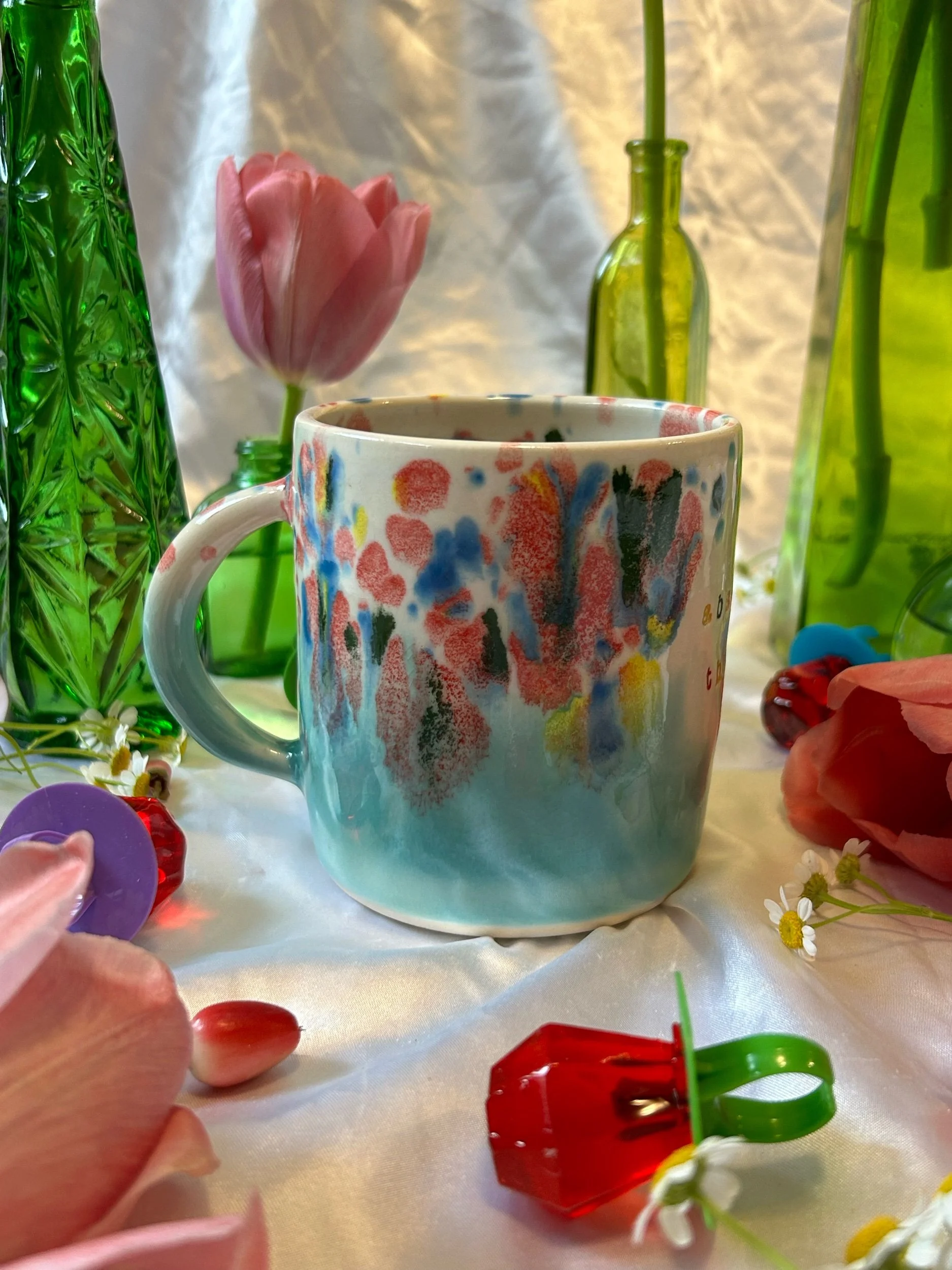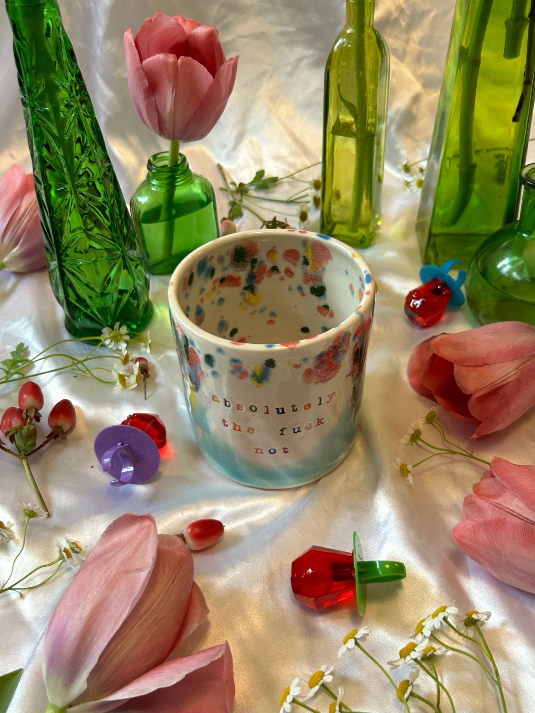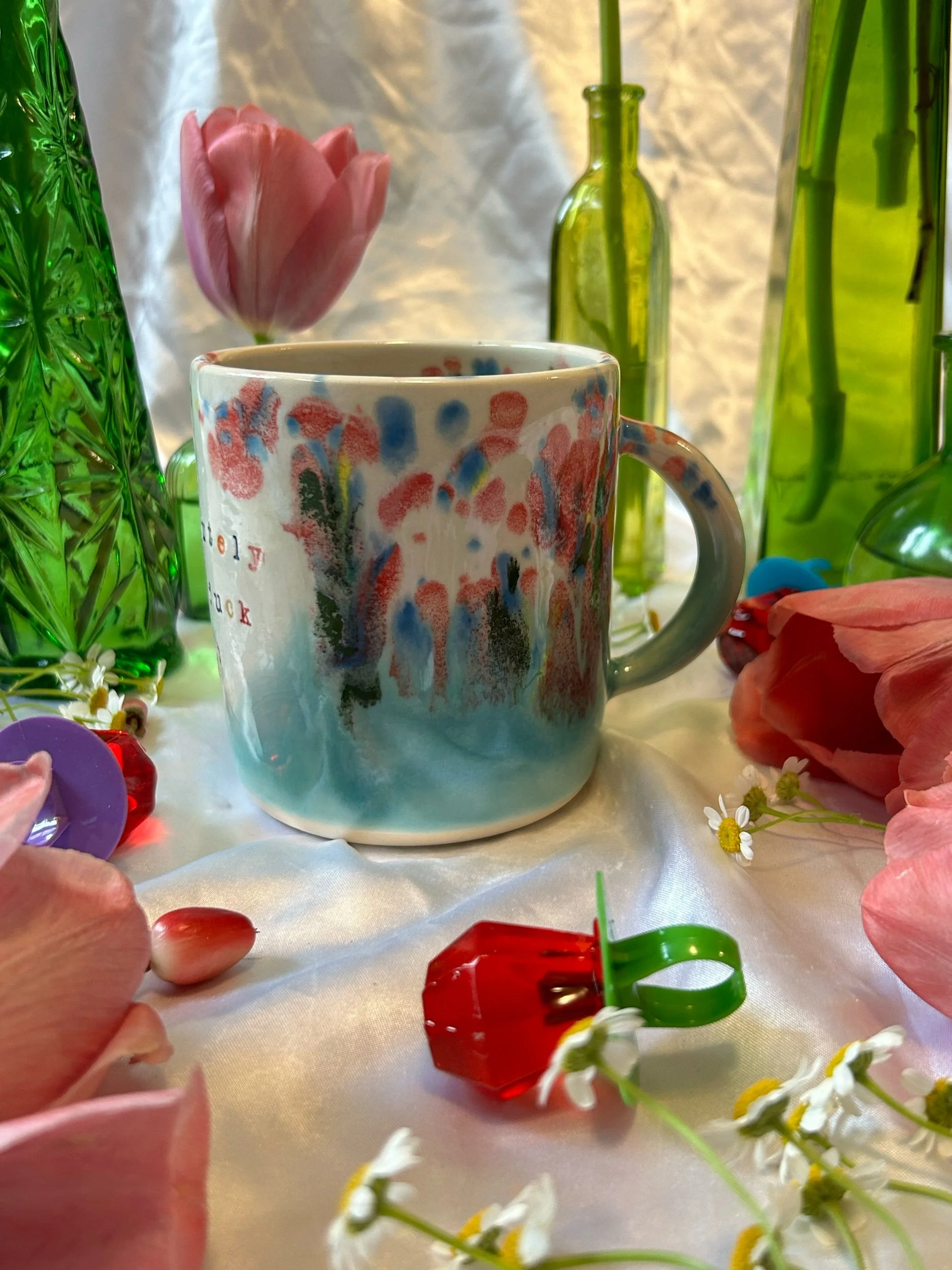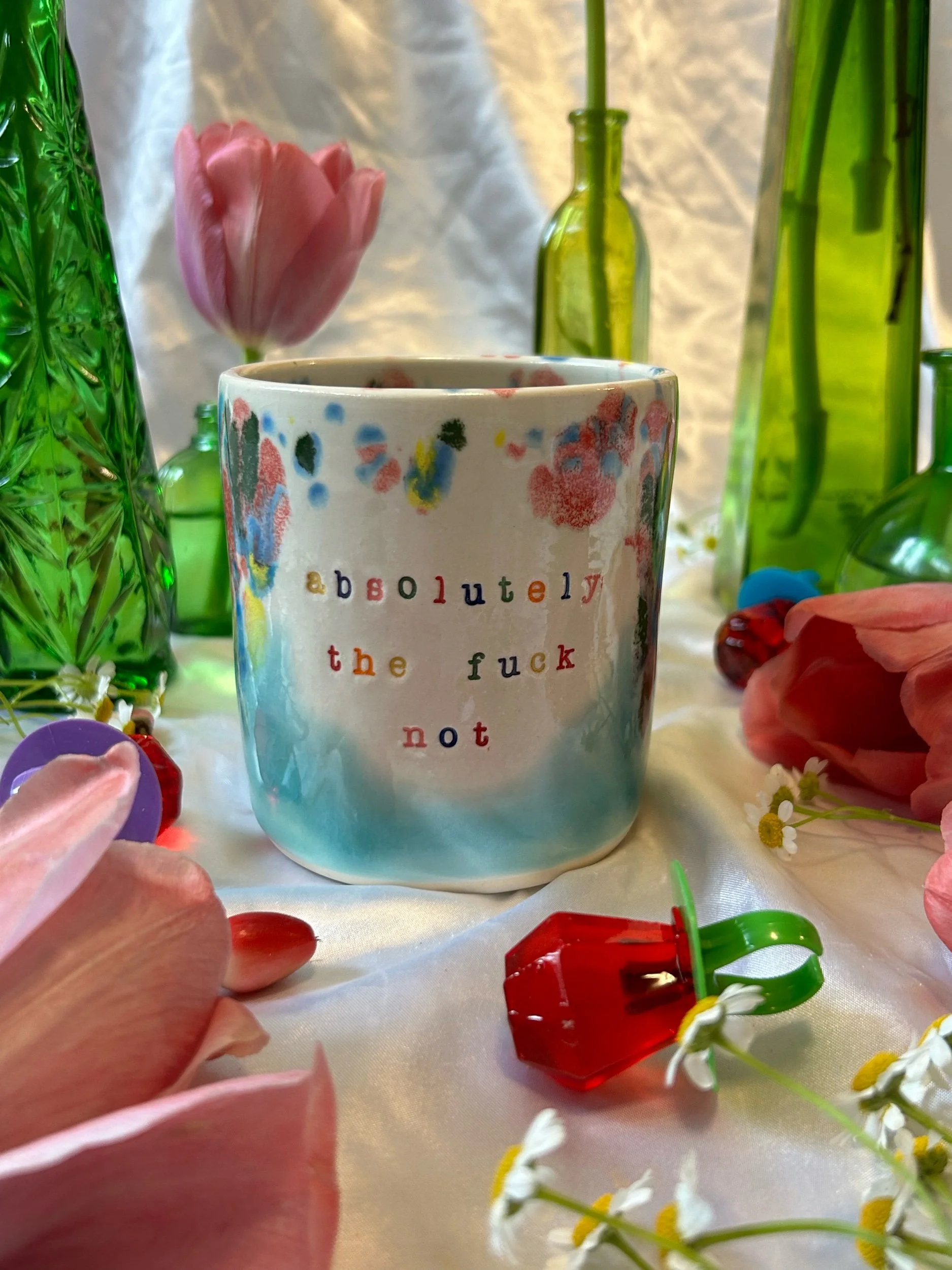 Medium mug with handle, decorated with rainbow stamped lettering that reads “absolutely the fuck not” Glazed in turquoise and rainbow funfetti colors. Holds about 16oz