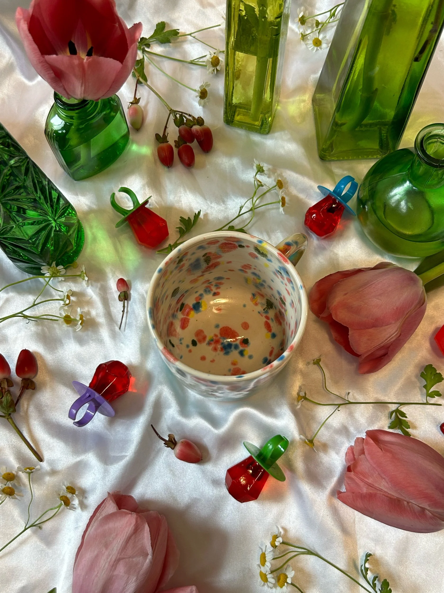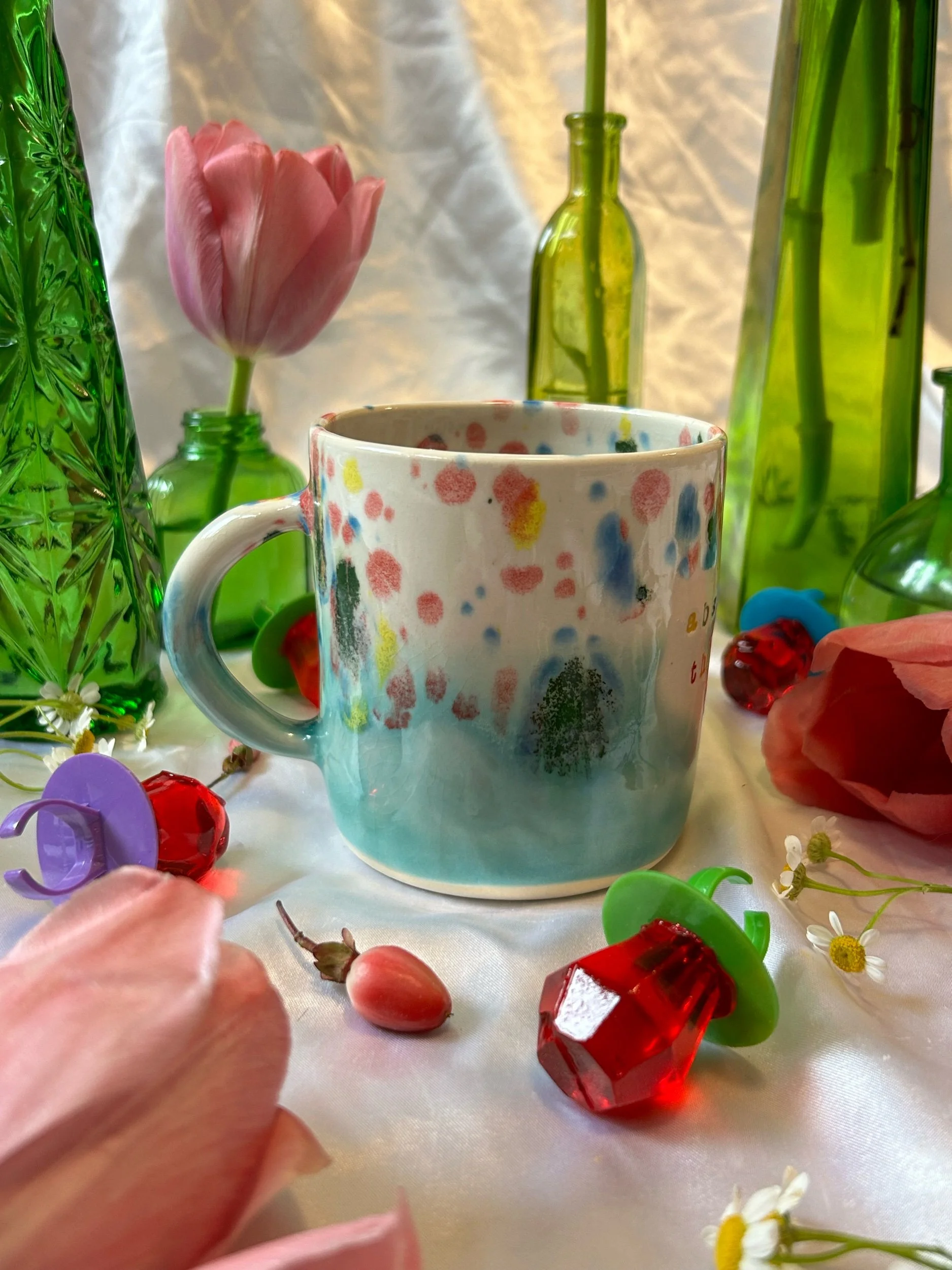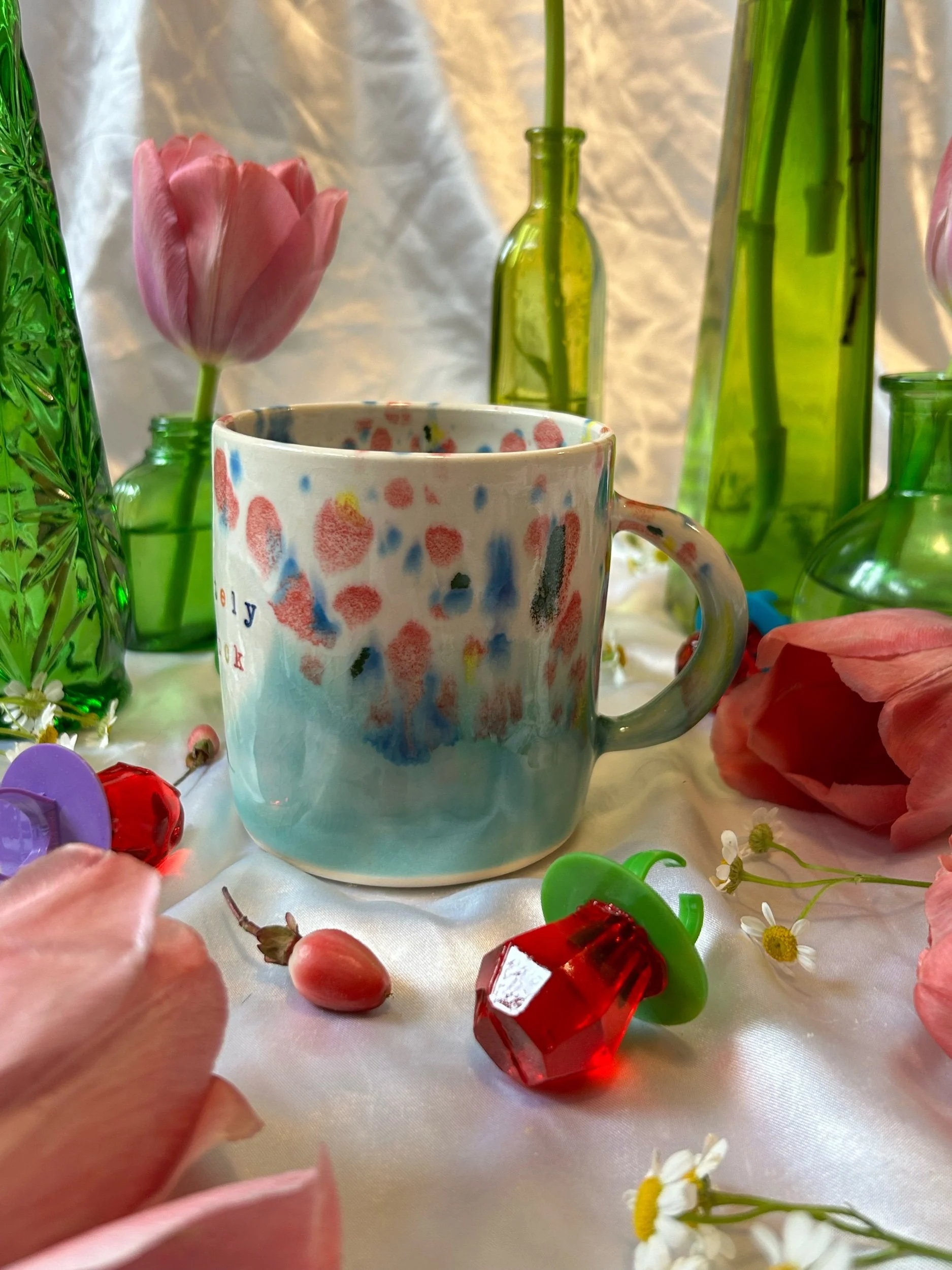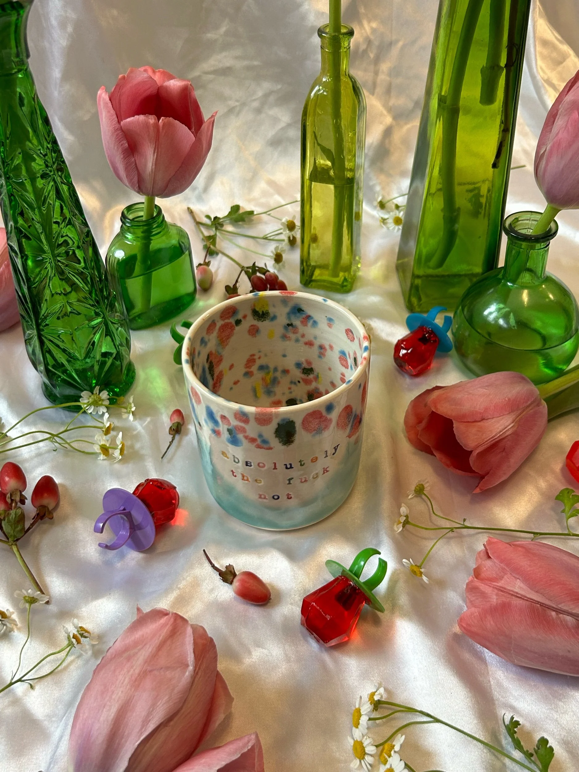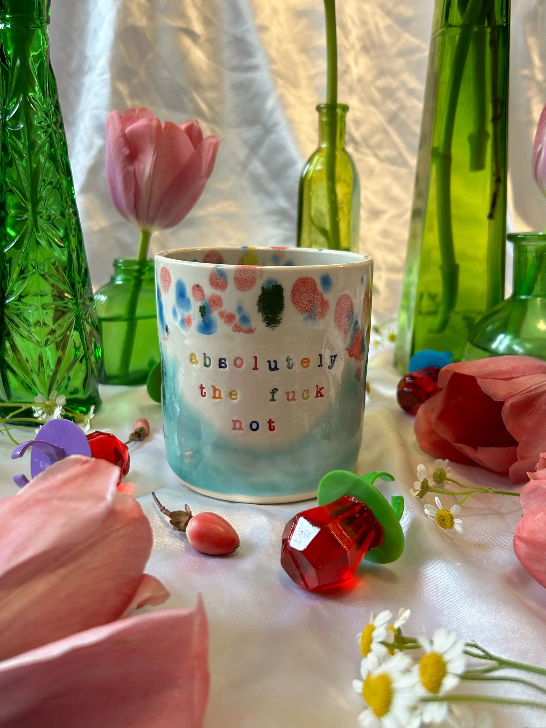 Small mug with handle, decorated with rainbow stamped lettering that reads “absolutely the fuck not” Glazed in turquoise and rainbow funfetti colors. Holds about 12oz