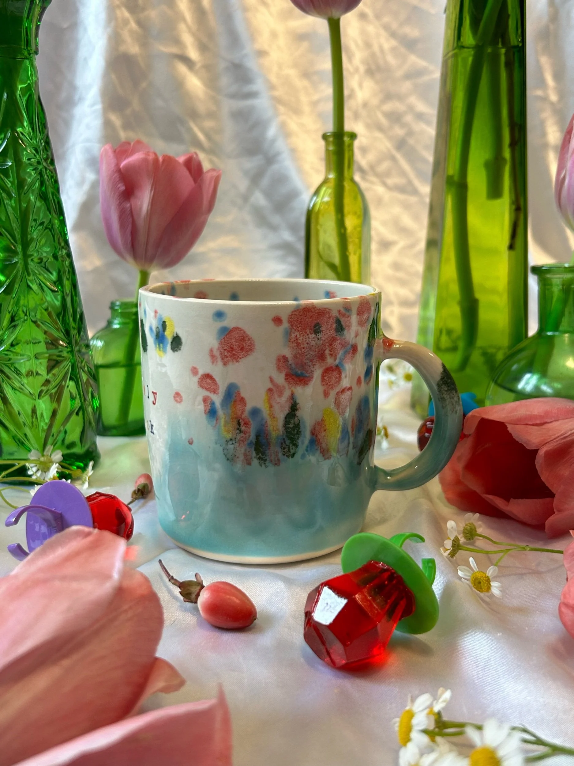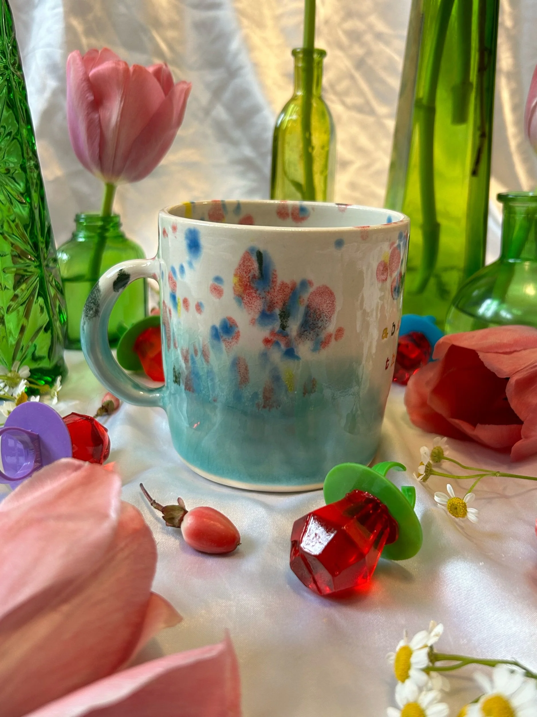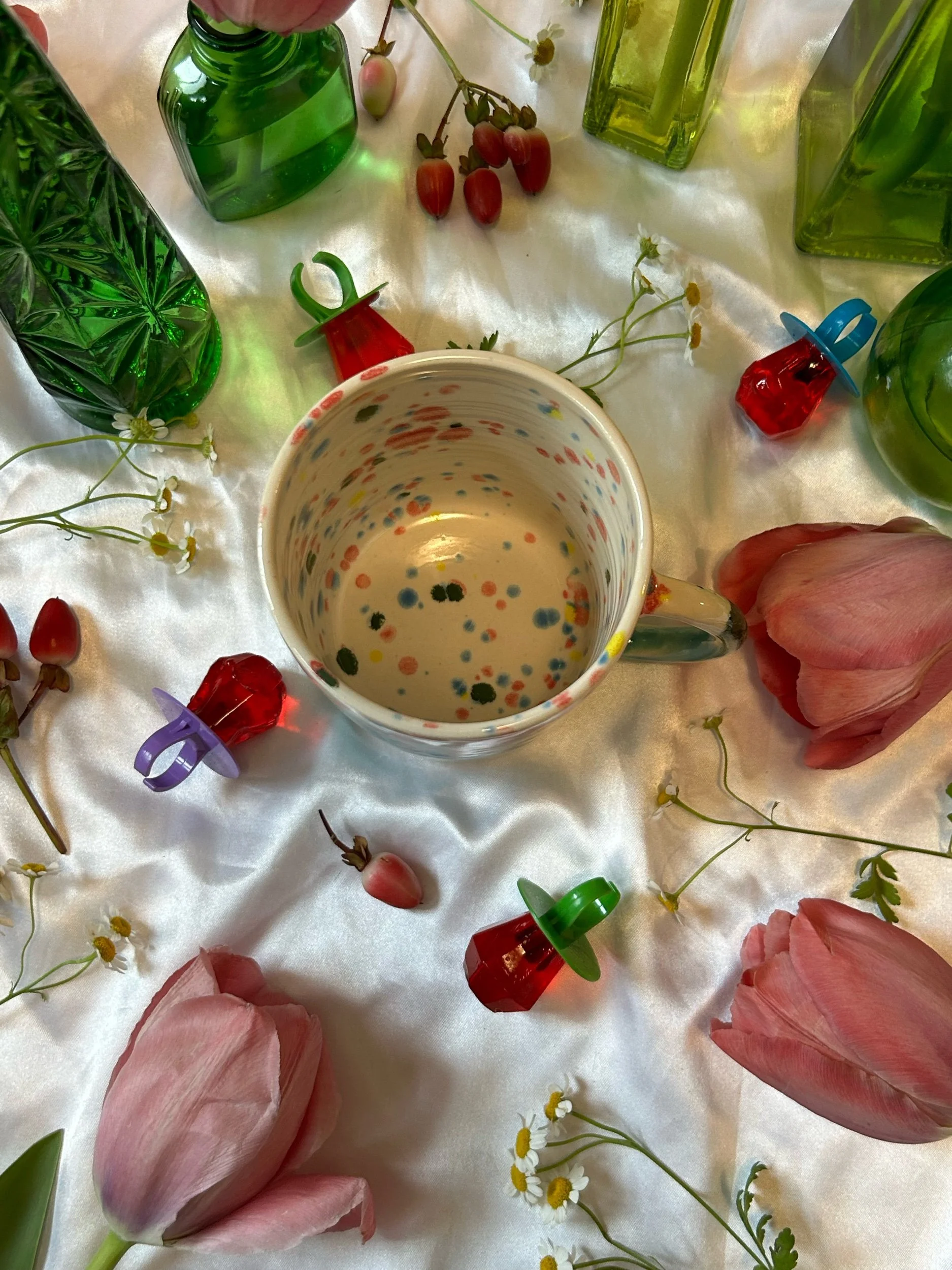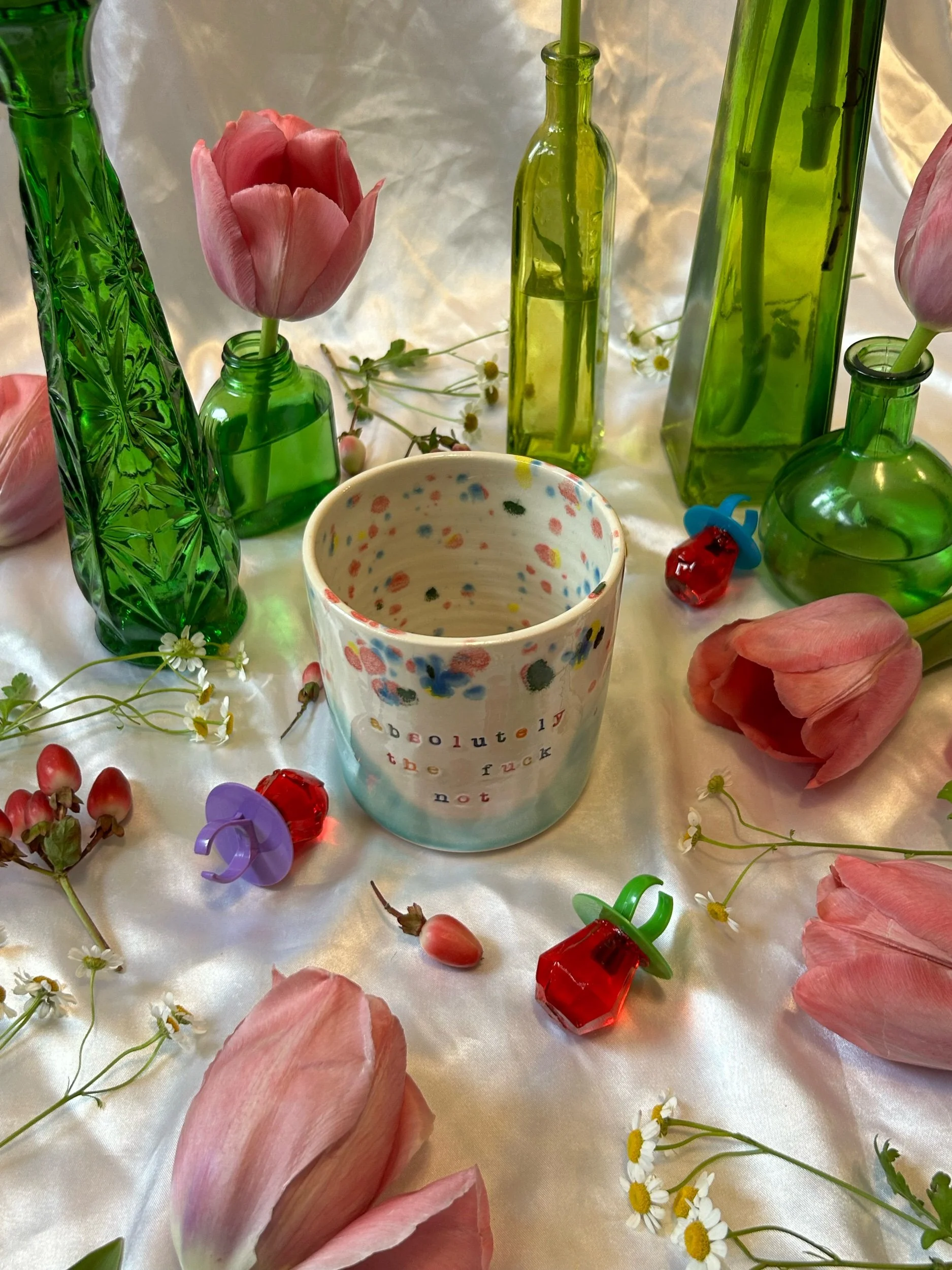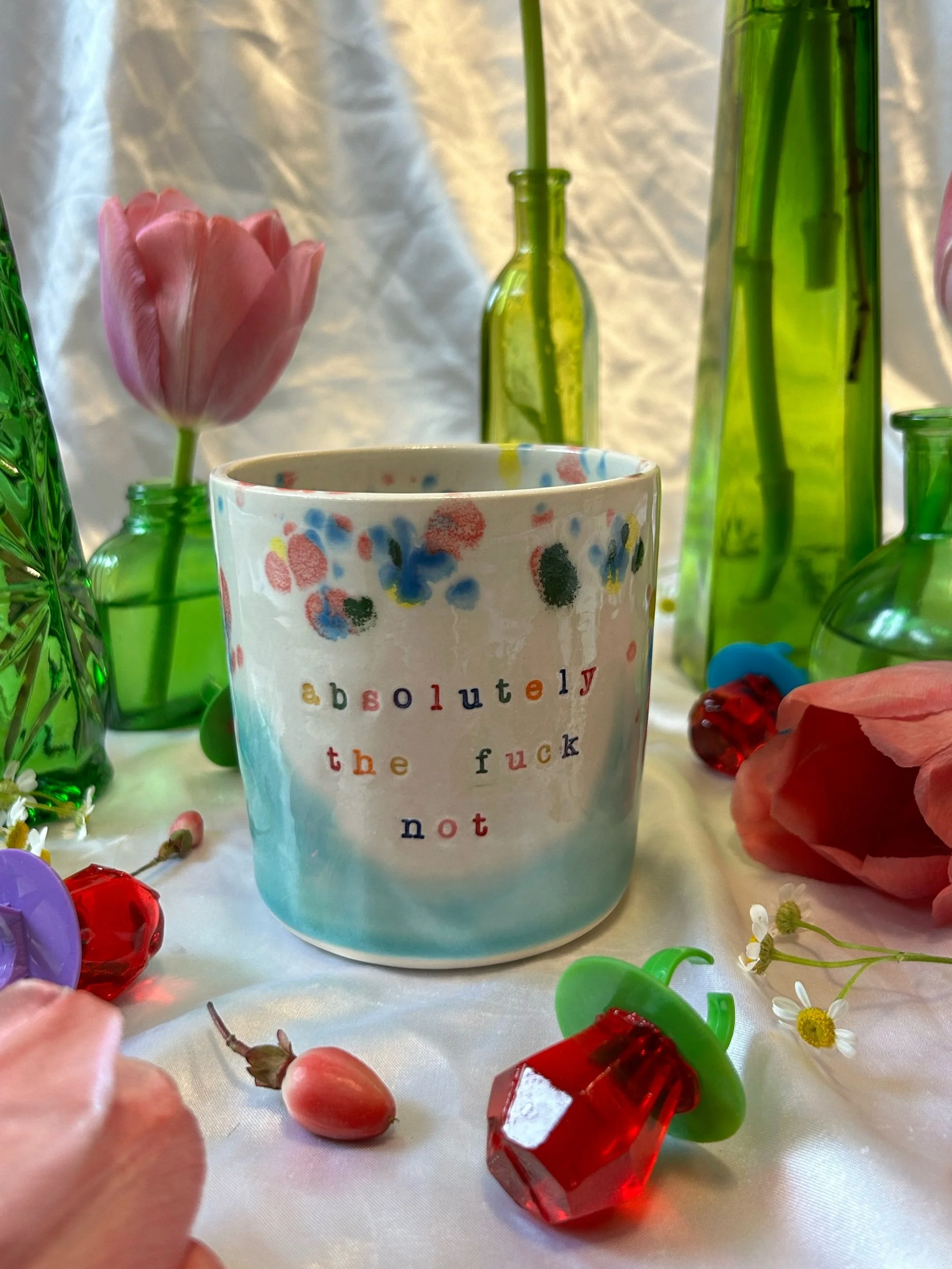 Small mug with handle, decorated with rainbow stamped lettering that reads “absolutely the fuck not” Glazed in turquoise and rainbow funfetti colors. Holds about 12oz