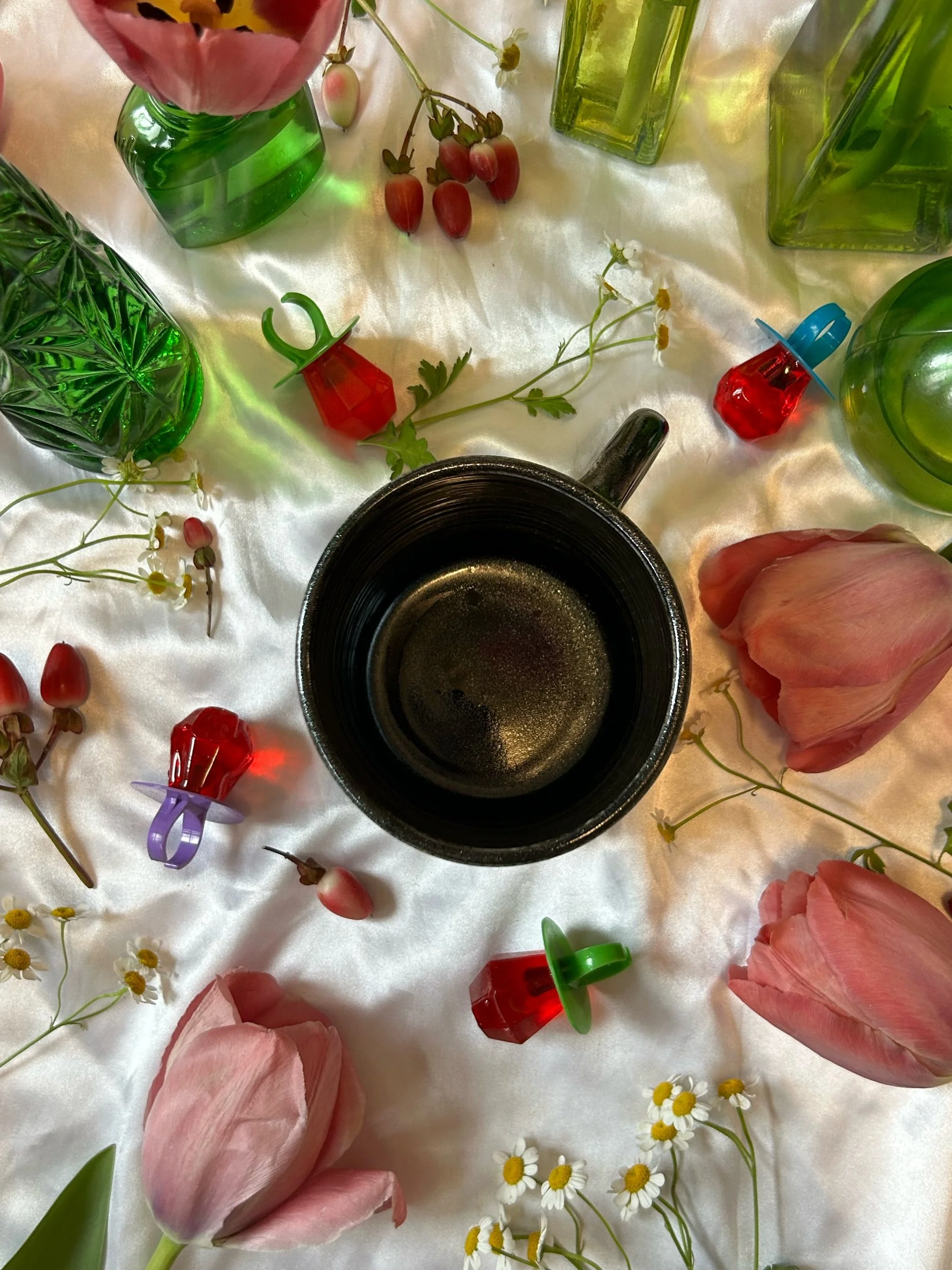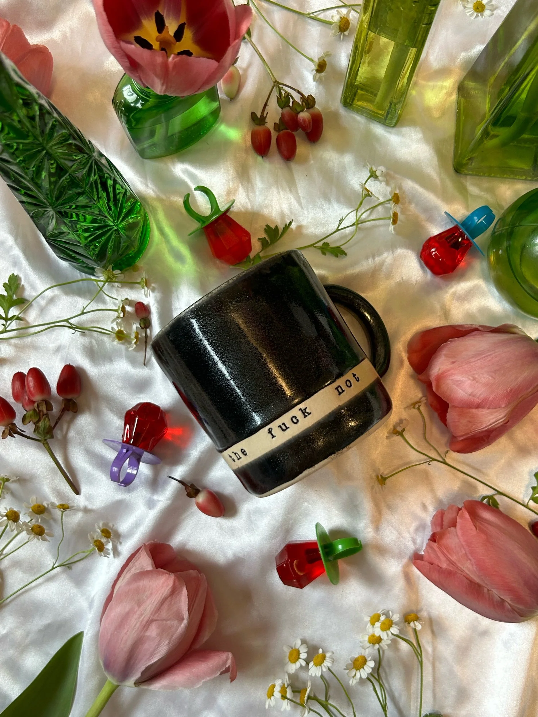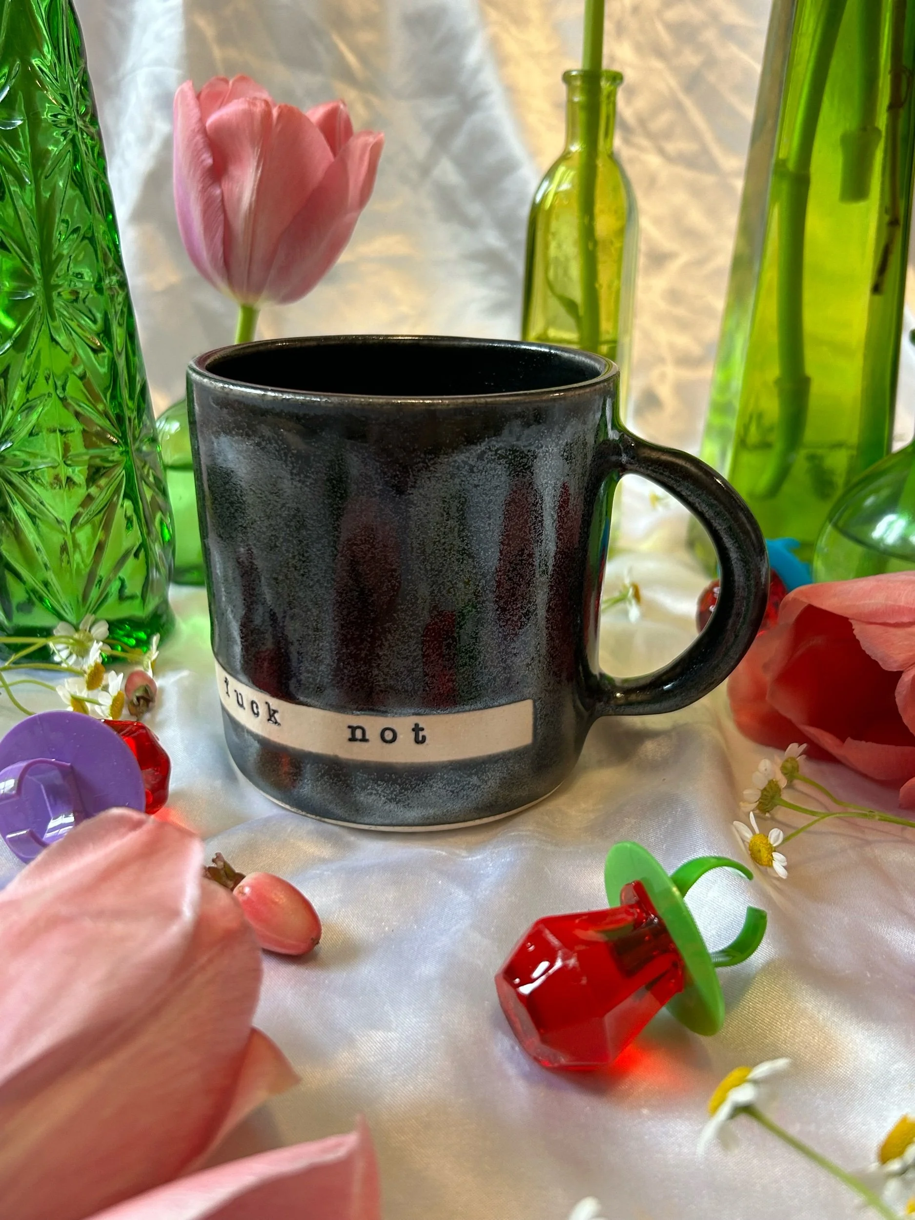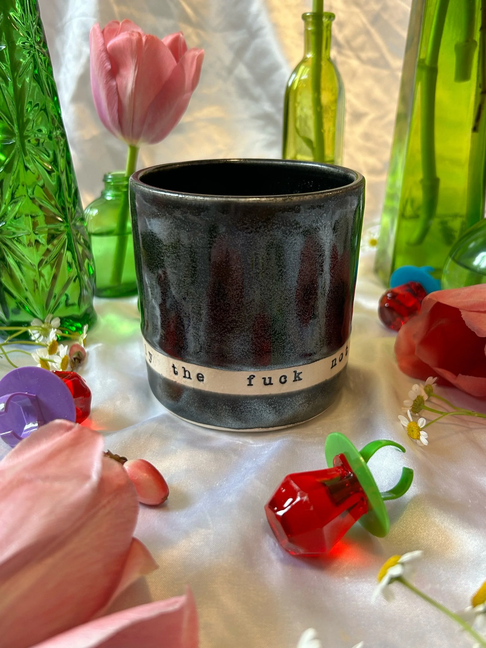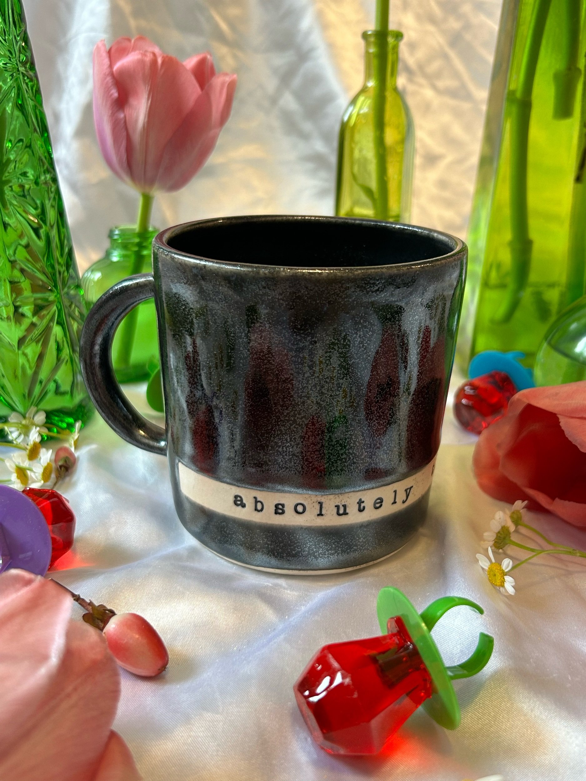Medium mug with handle, decorated with black stamped lettering that reads “absolutely the fuck not” Glazed in sparkly, iridescent black. Holds about 16oz