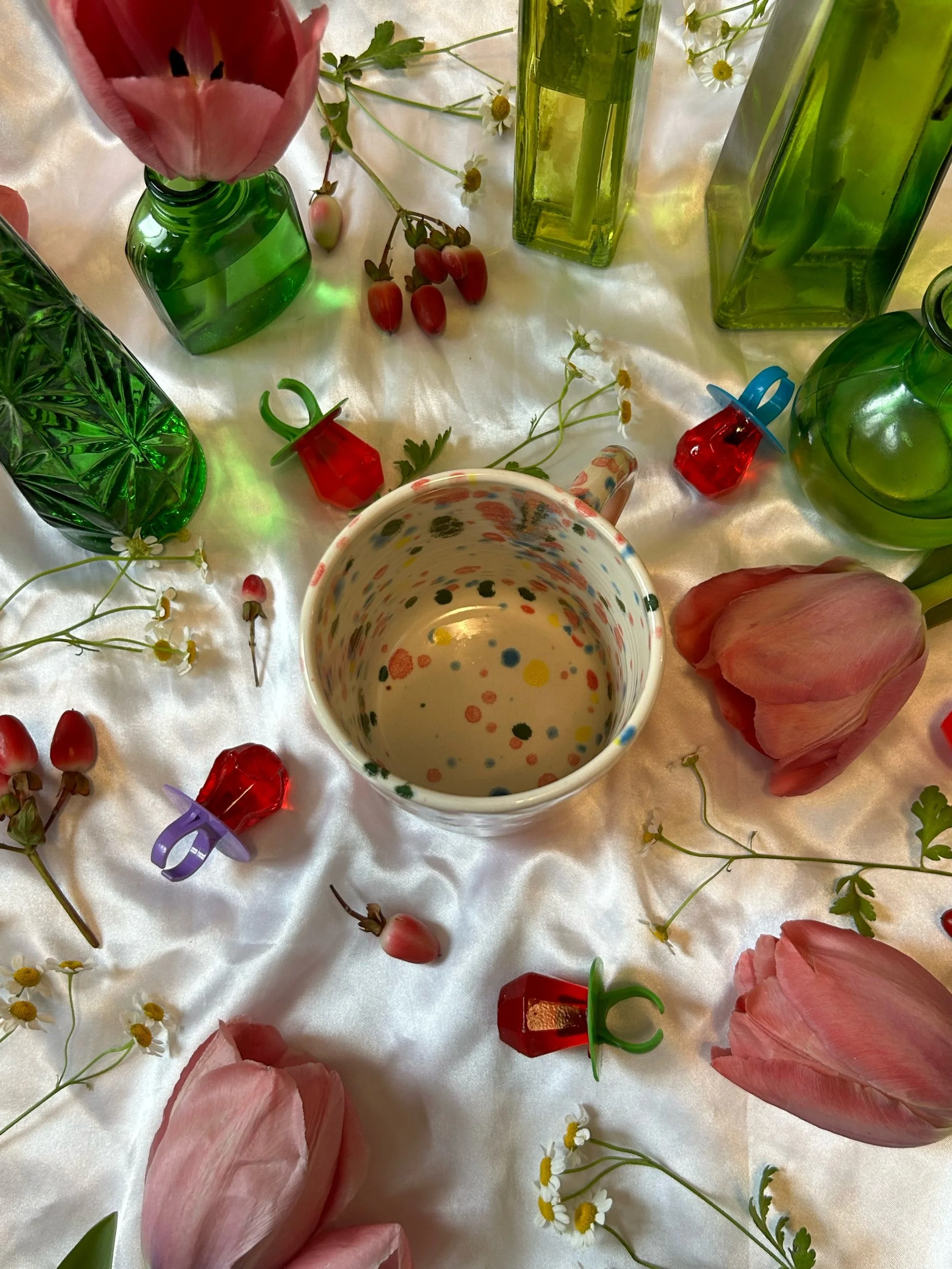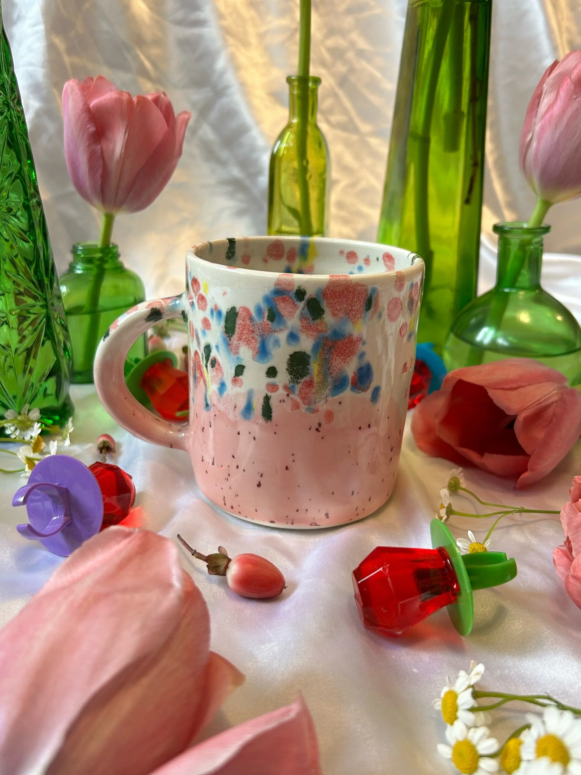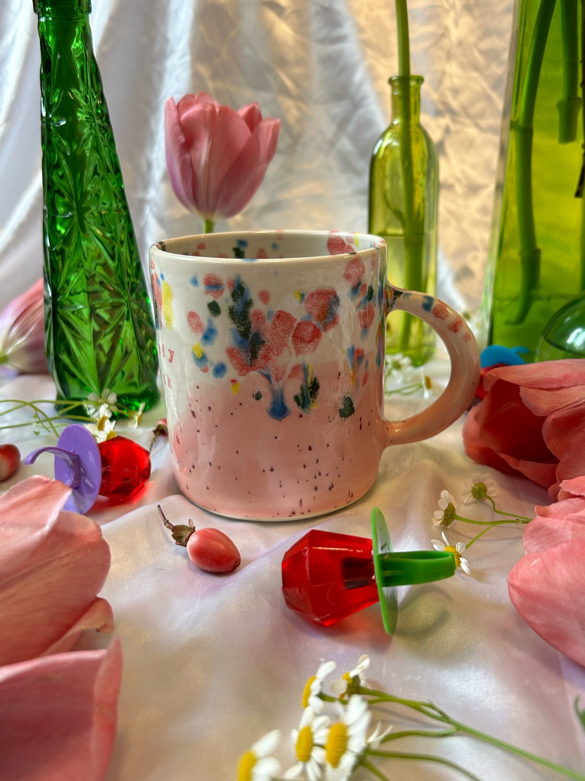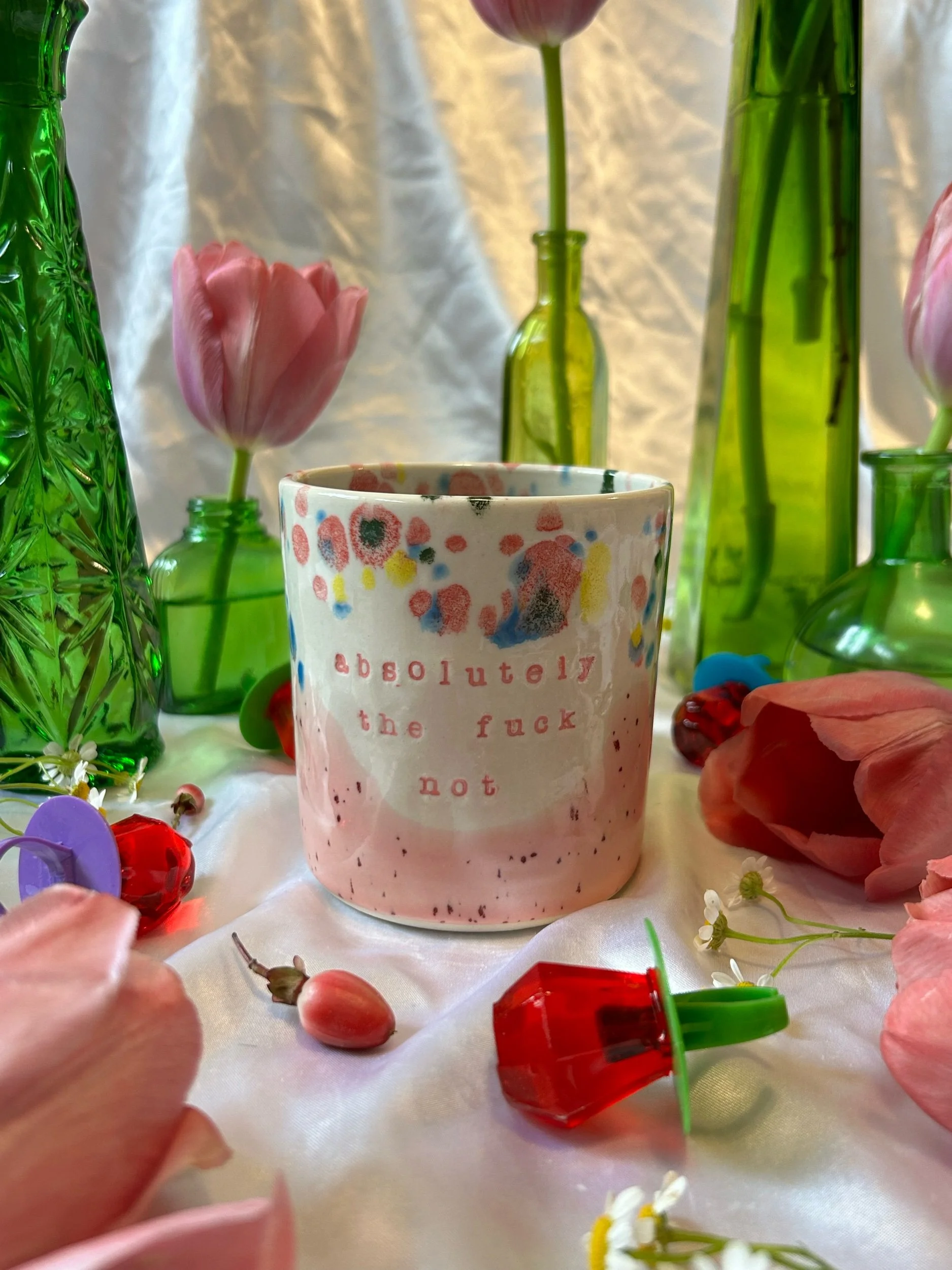 Medium mug with handle, decorated with pink stamped lettering that reads “absolutely the fuck not” Glazed in a speckled pink (reminiscent of cherry pop-tart frosting) and rainbow funfetti colors. Holds about 16oz