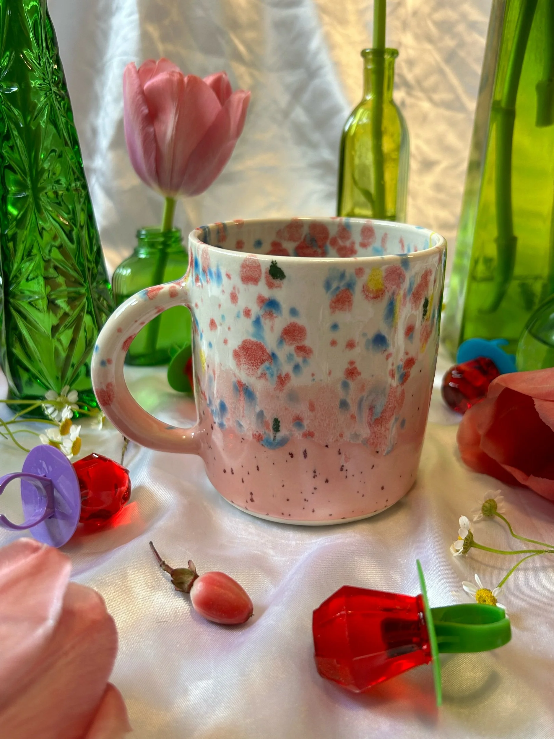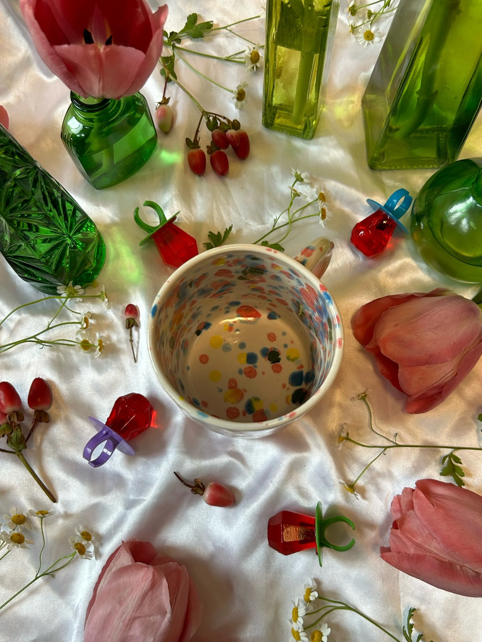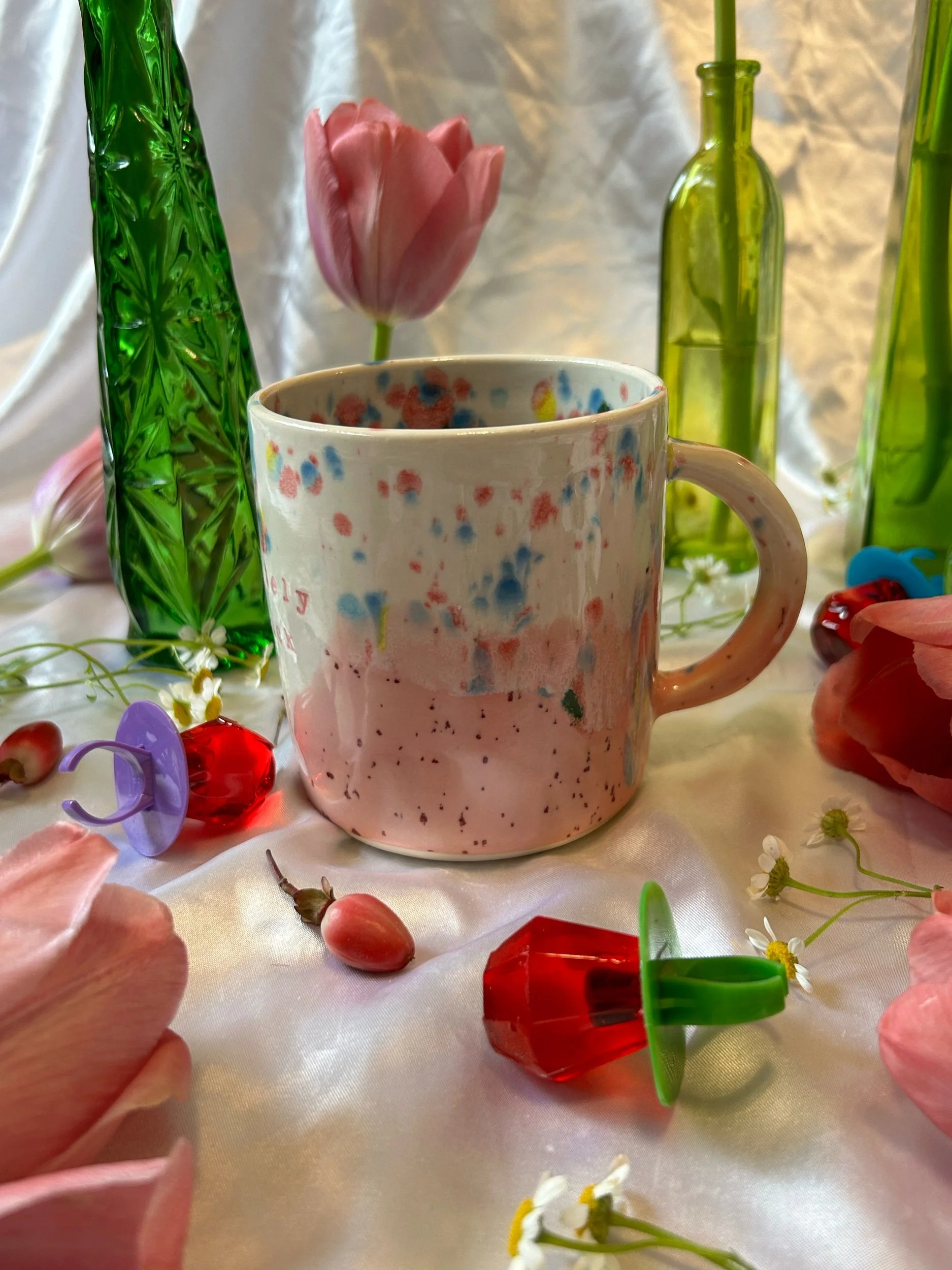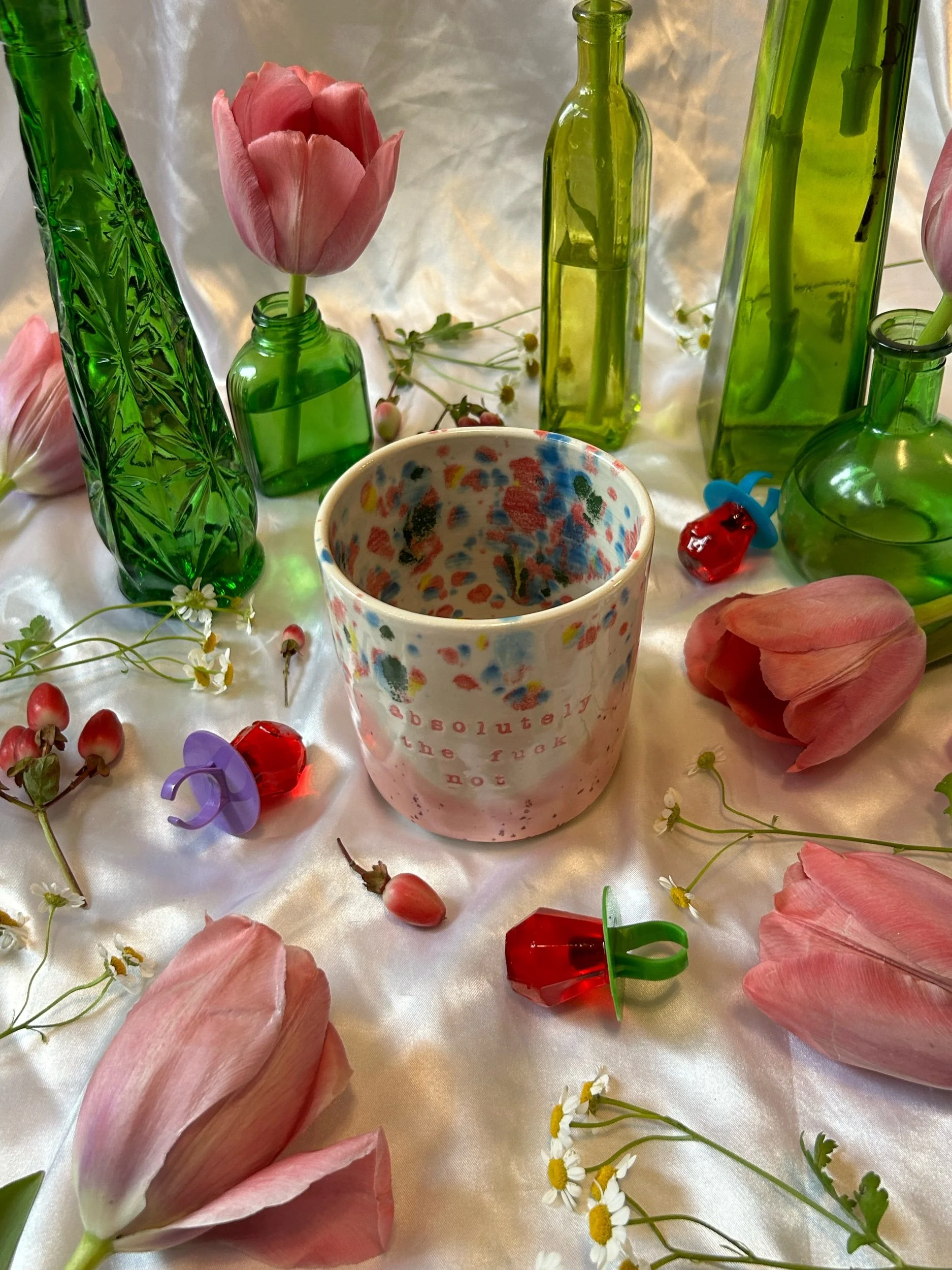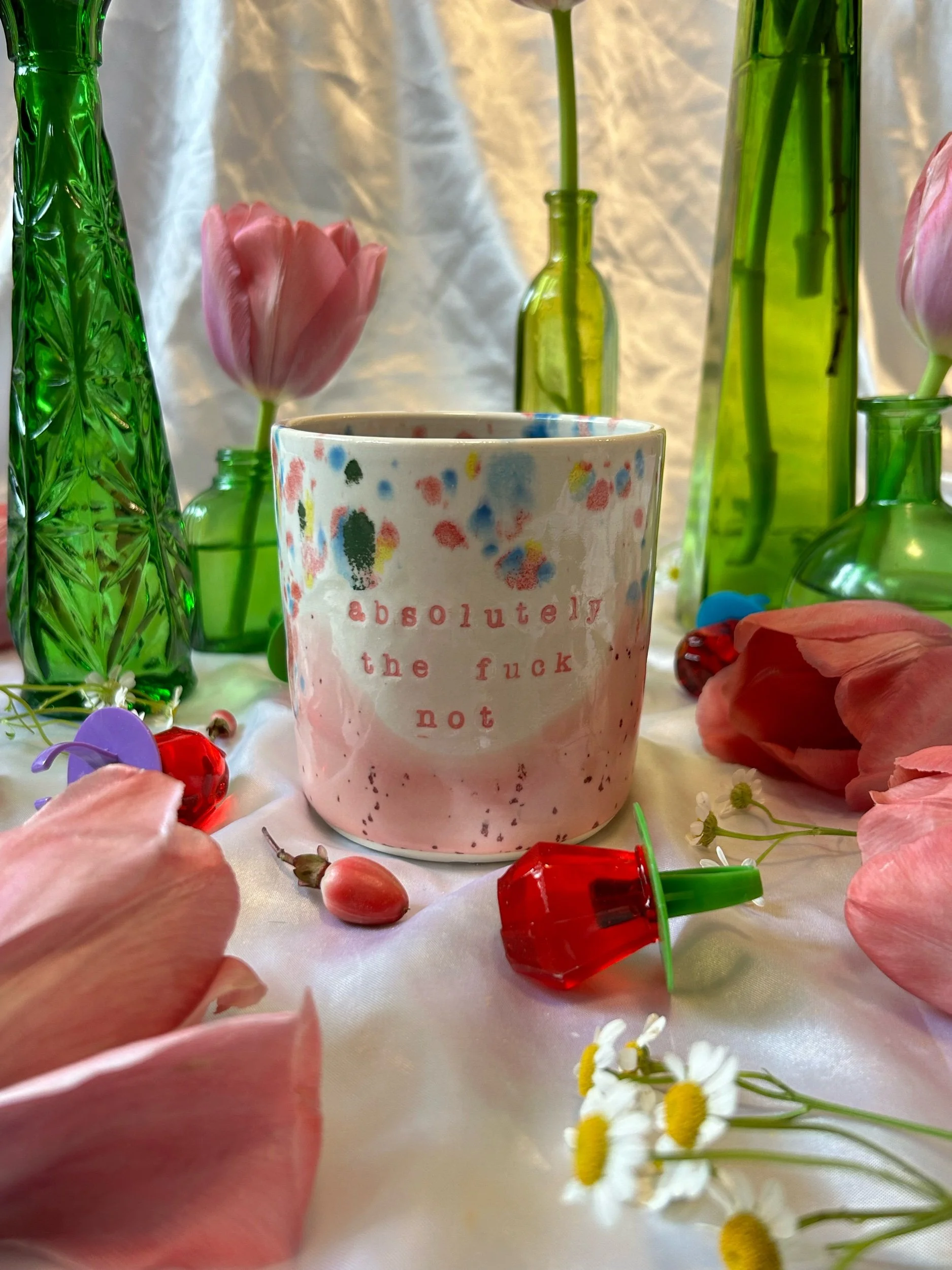 Medium mug with handle, decorated with pink stamped lettering that reads “absolutely the fuck not” Glazed in a speckled pink (reminiscent of cherry pop-tart frosting) and rainbow funfetti colors. Holds about 16oz