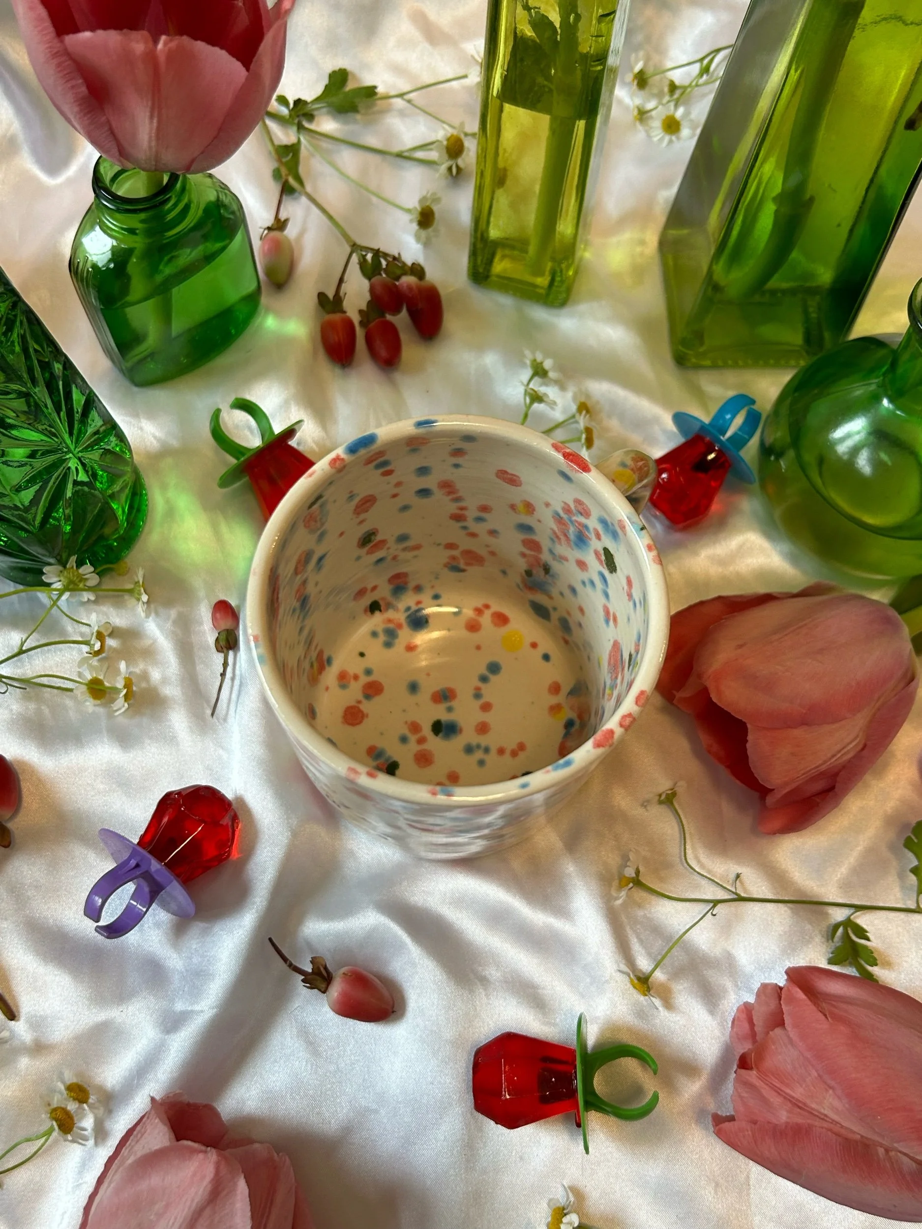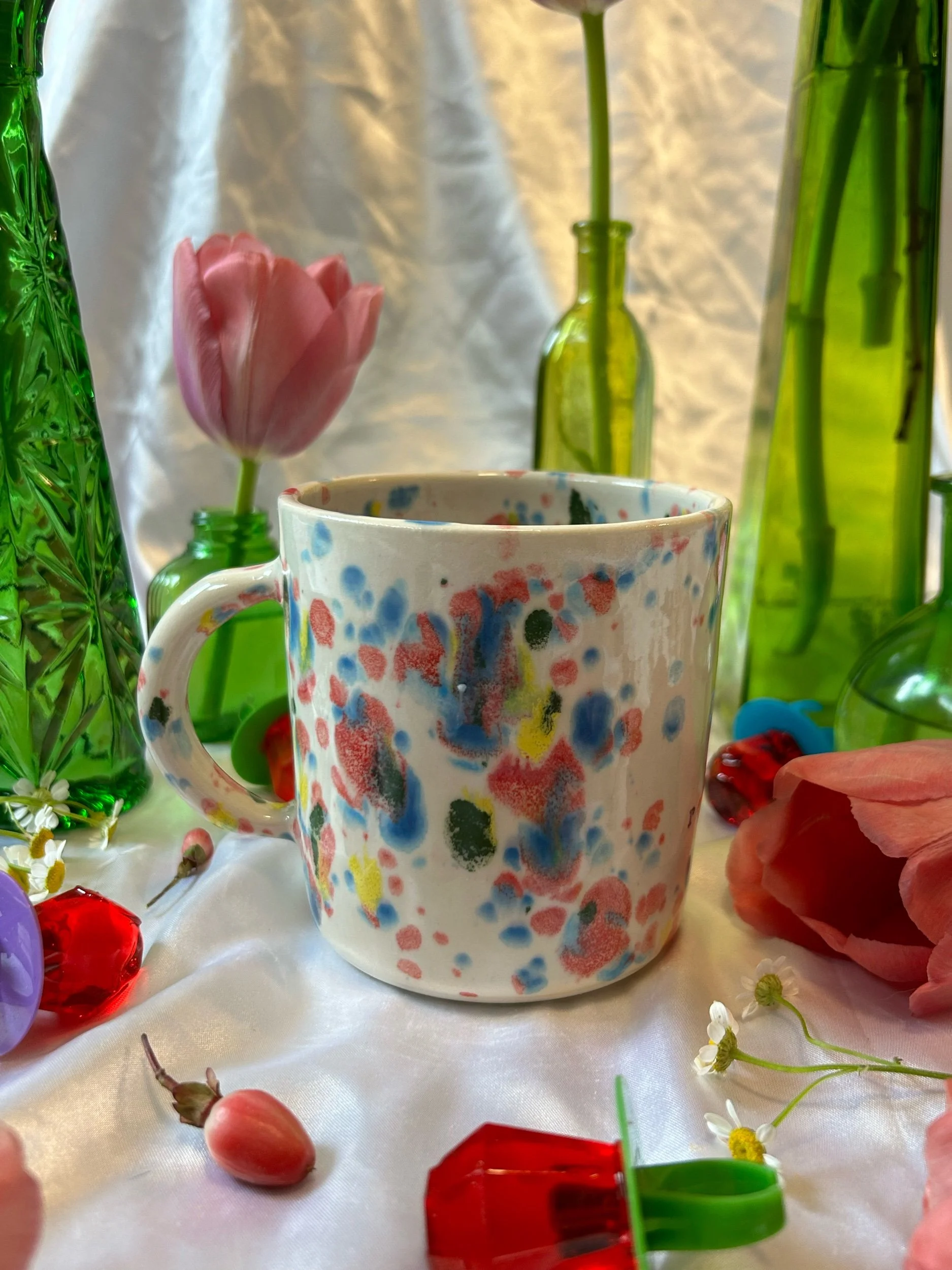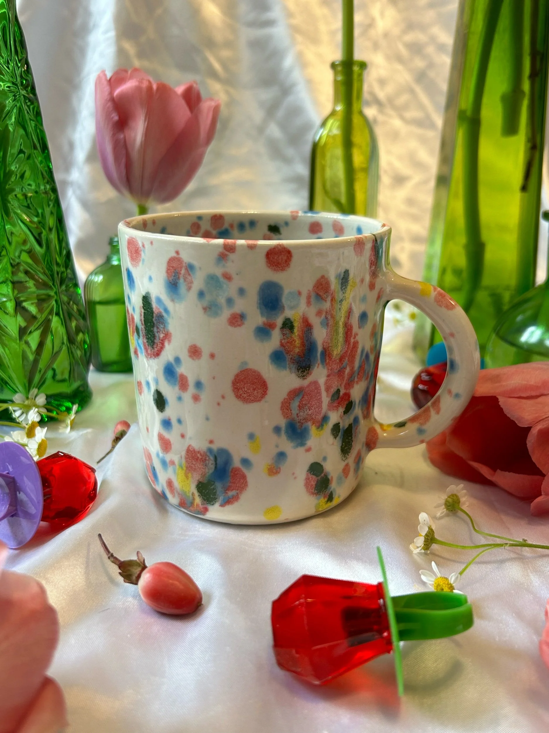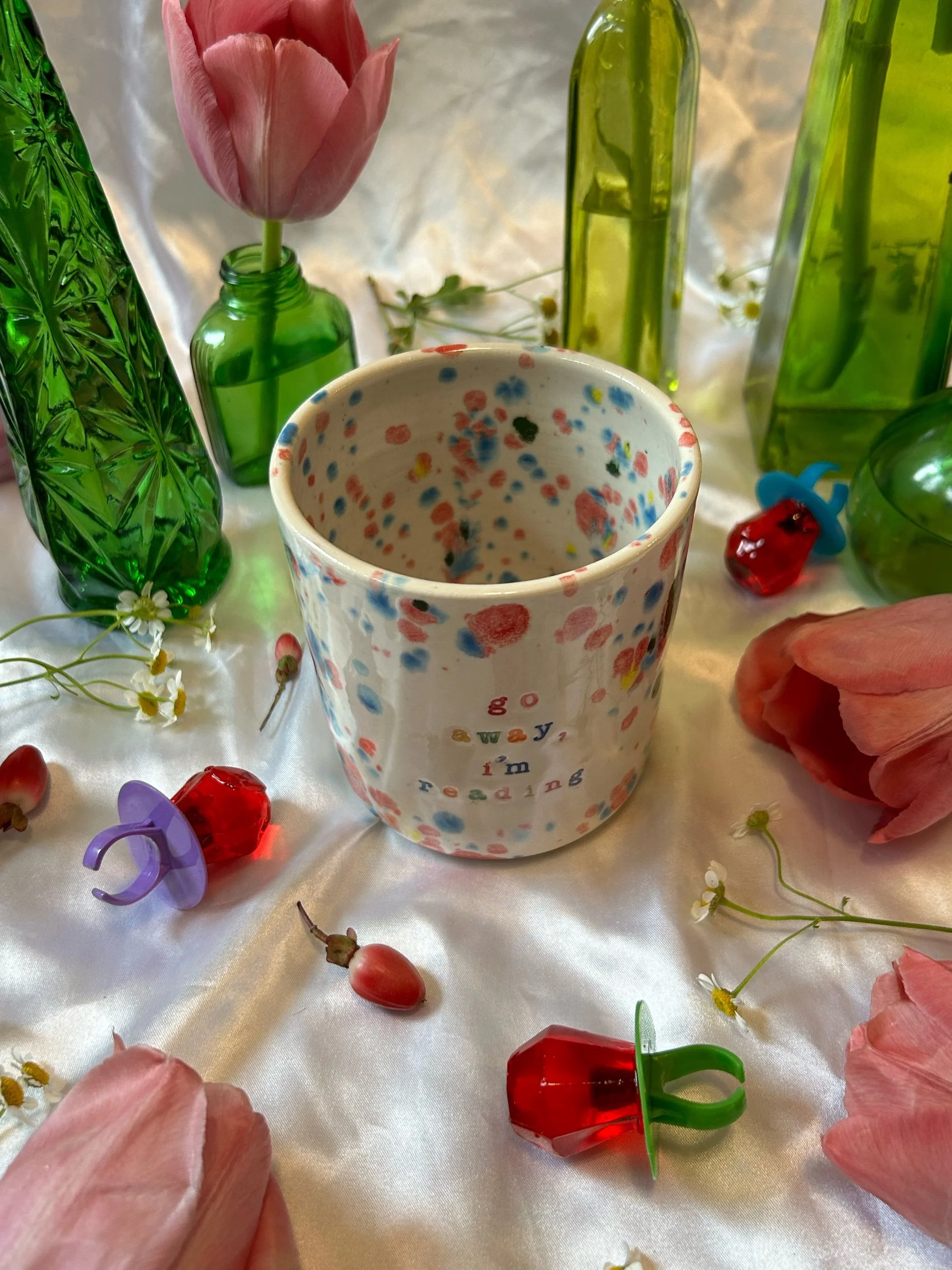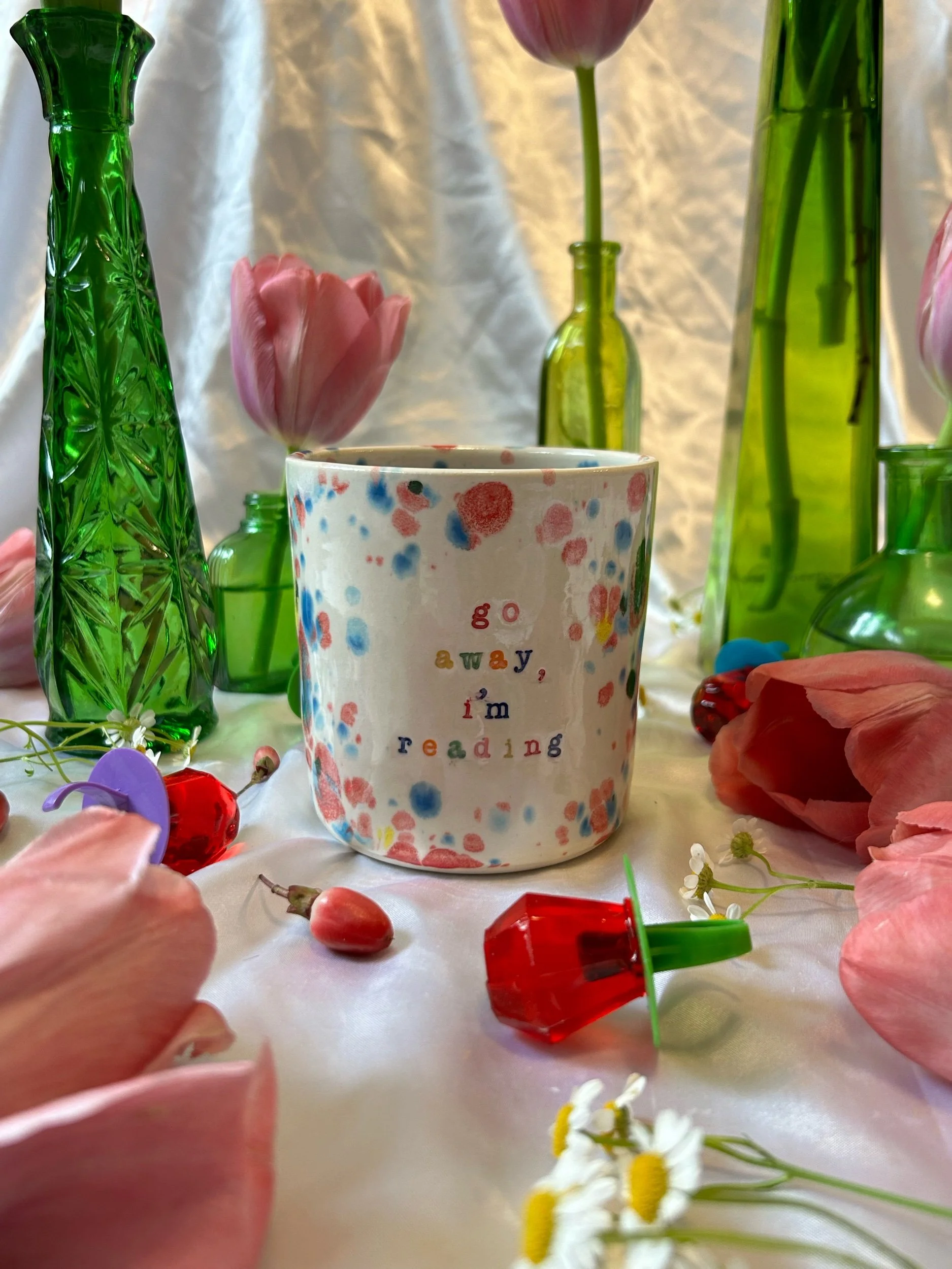 Medium mug with handle, decorated with rainbow stamped lettering that reads “go away, i’m reading” Glazed in rainbow funfetti colors. Holds about 16oz