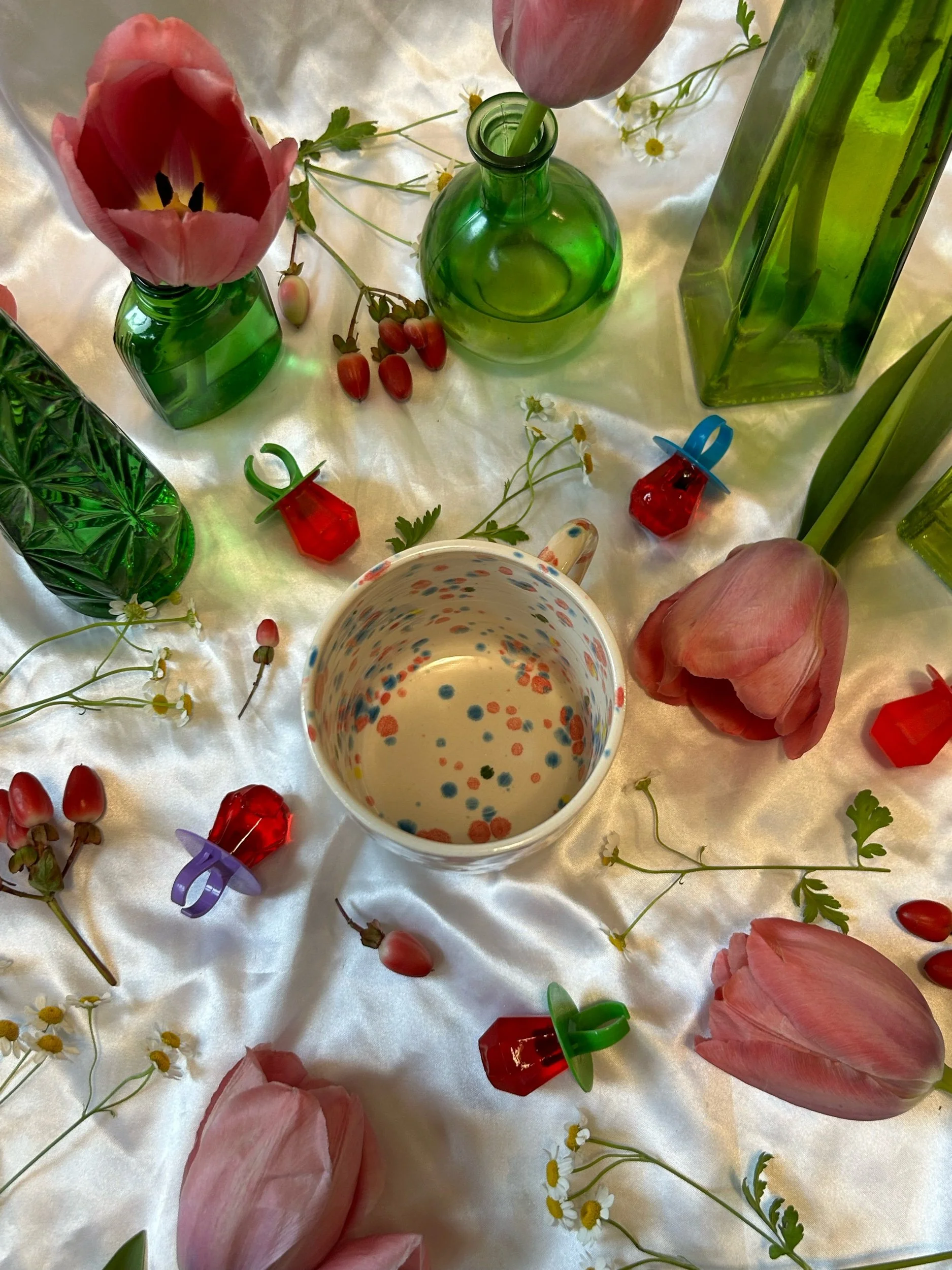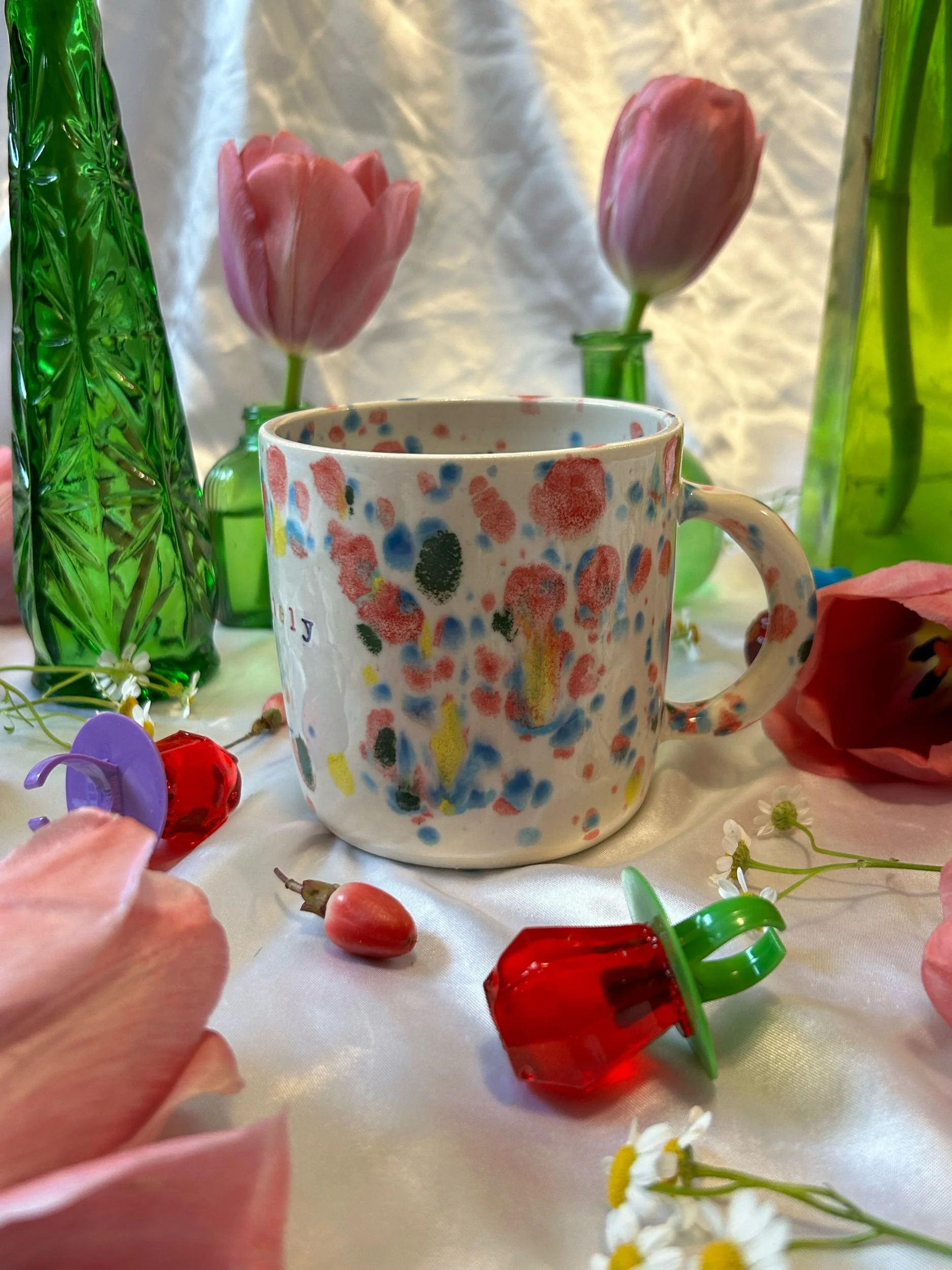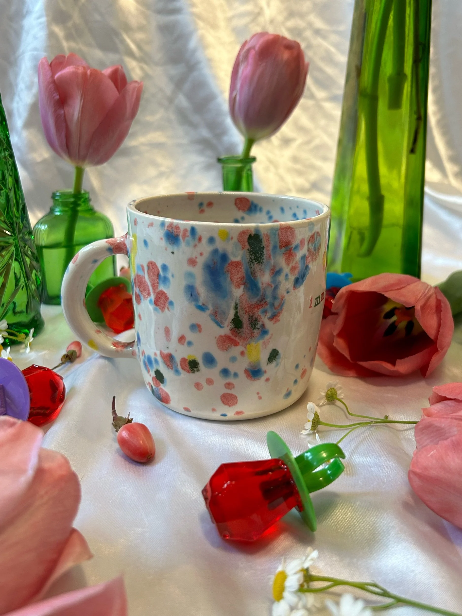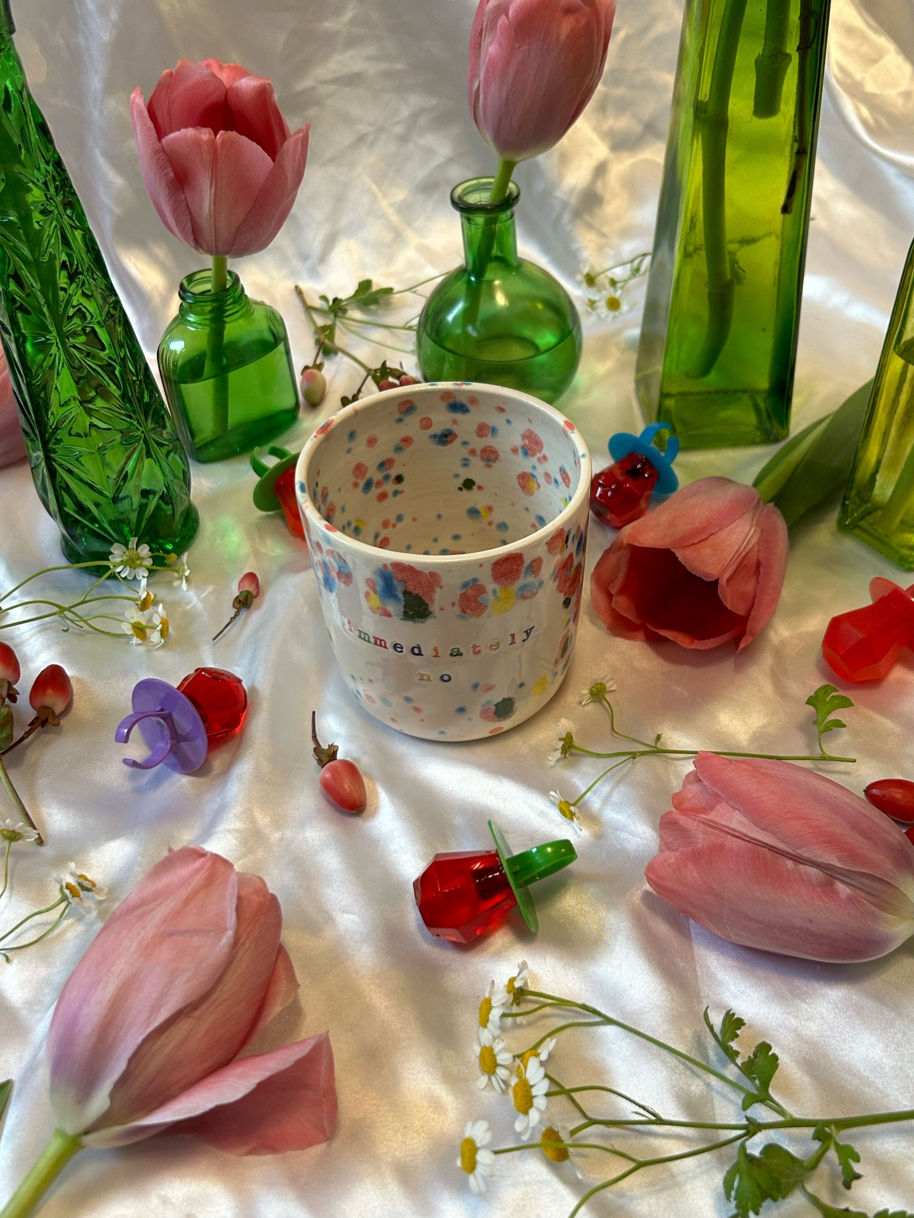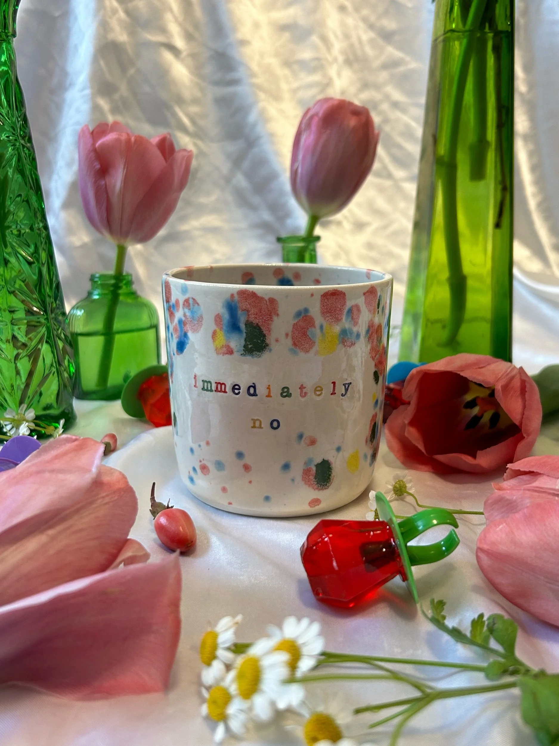 Small mug with handle, decorated with rainbow stamped lettering that reads “immediately no” Glazed in rainbow funfetti colors. Holds about 12oz