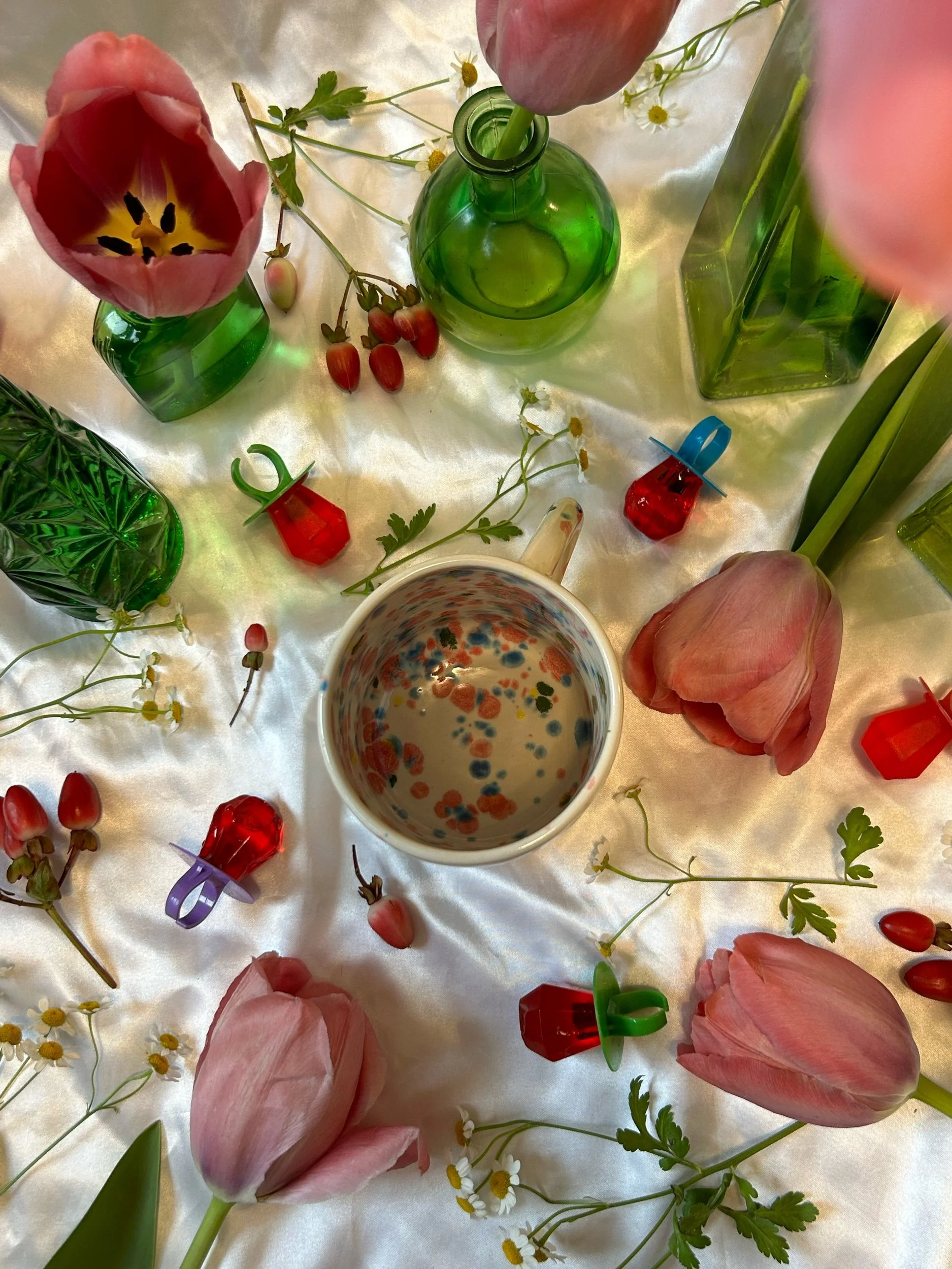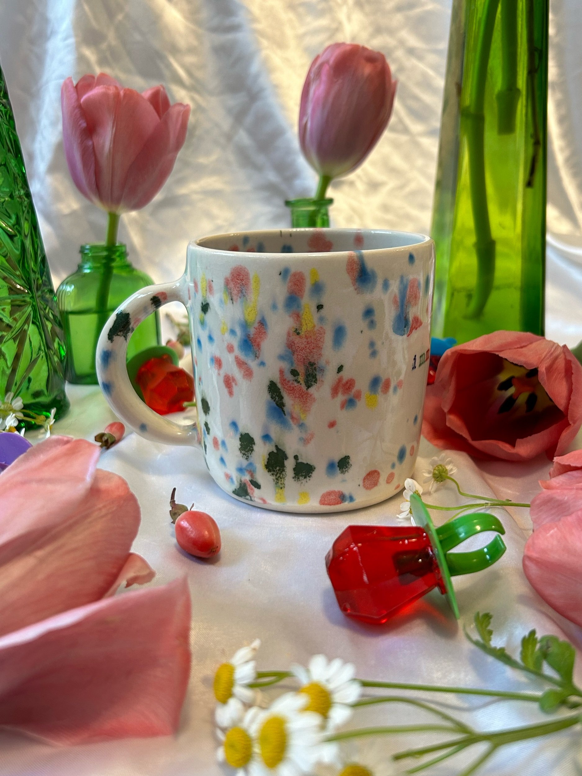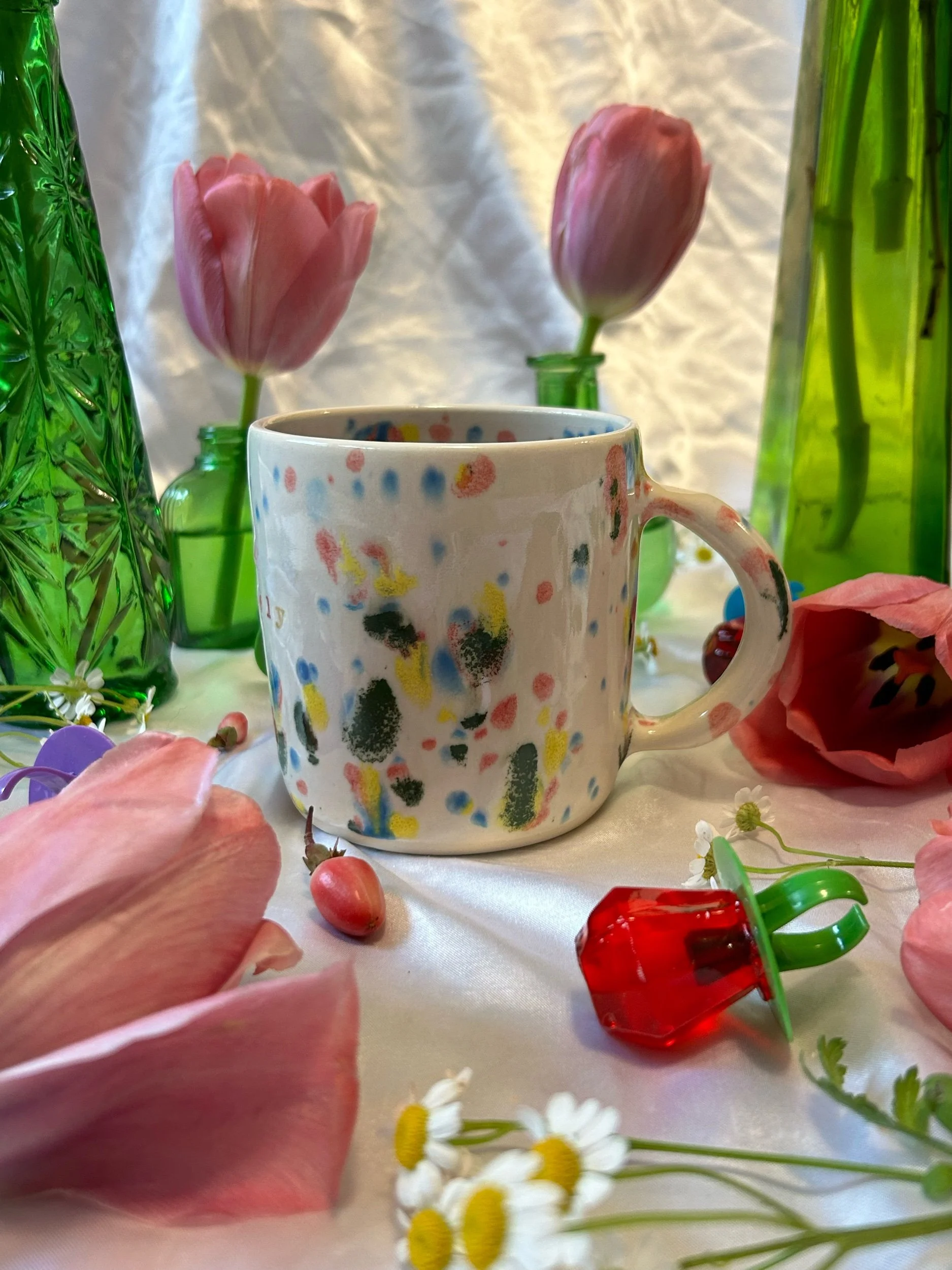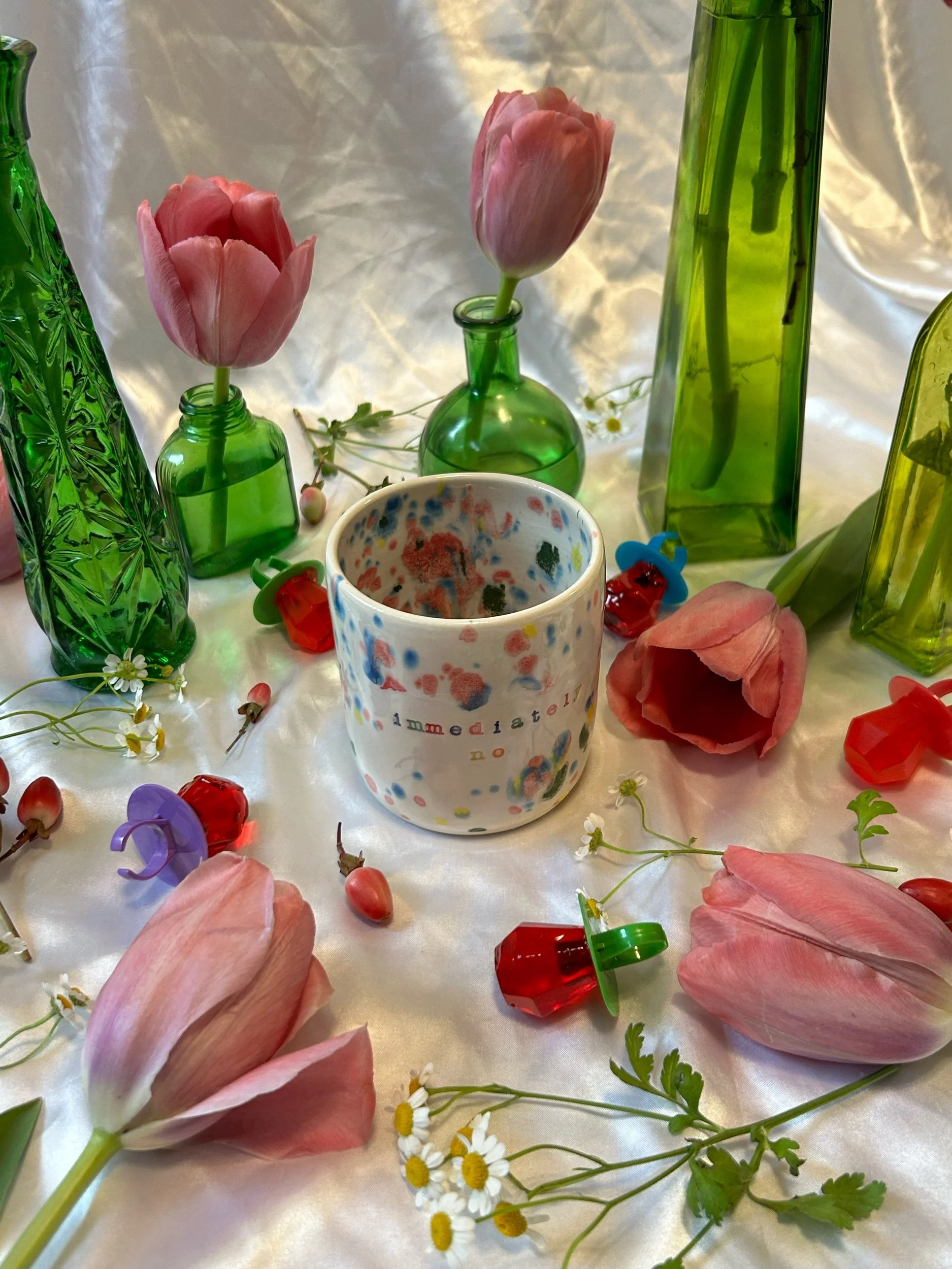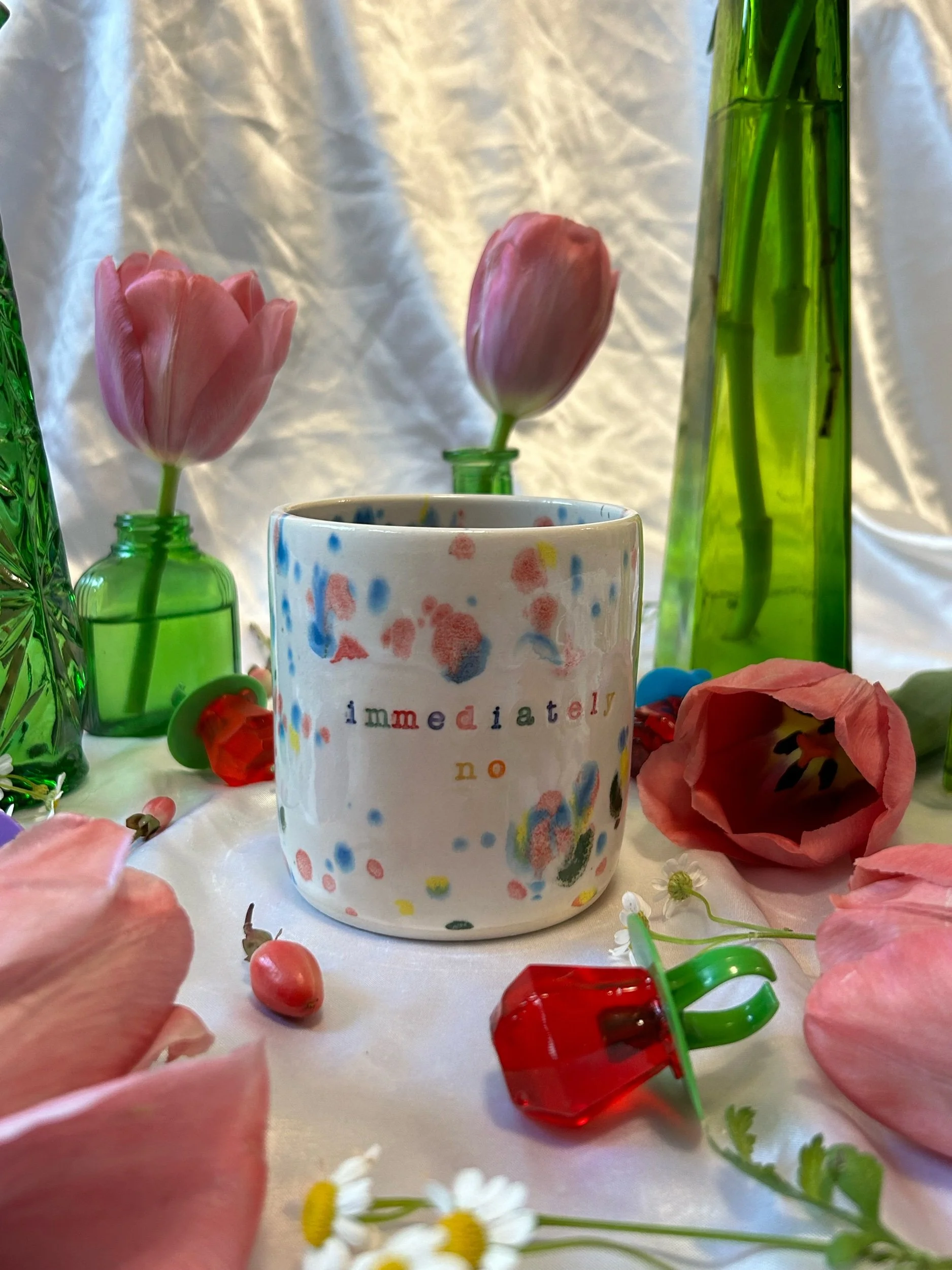 Small mug with handle, decorated with rainbow stamped lettering that reads “immediately no” Glazed in rainbow funfetti colors. Holds about 12oz