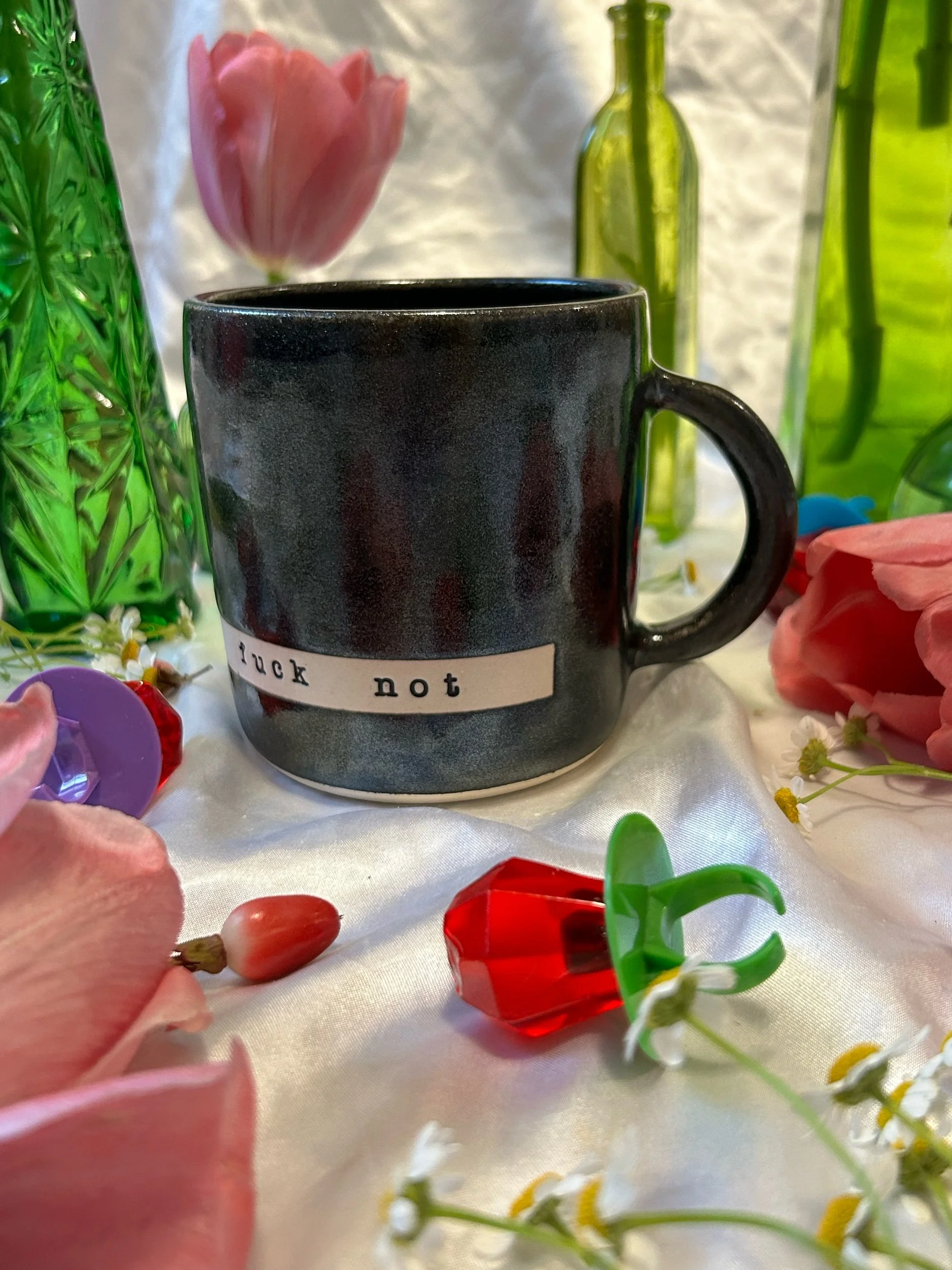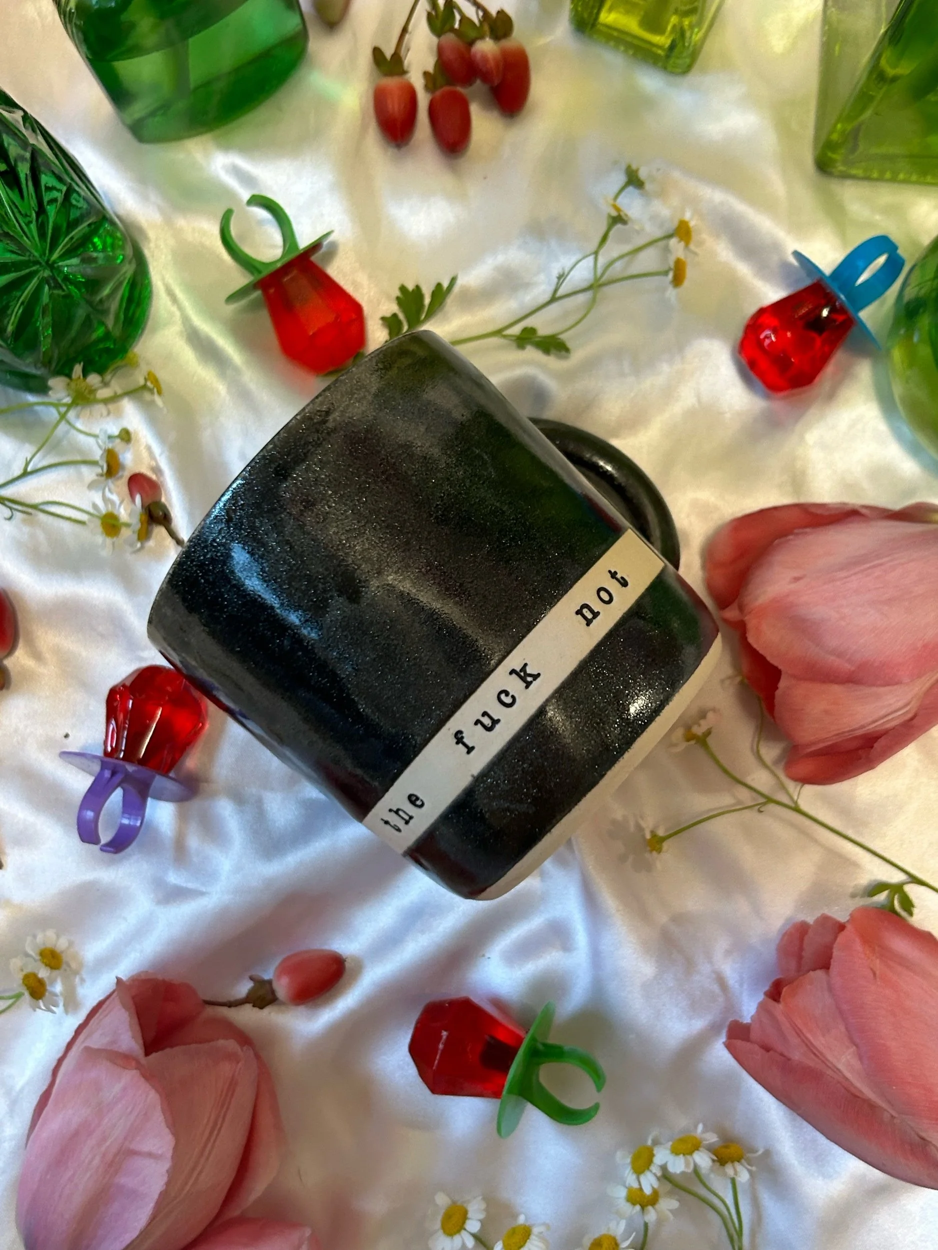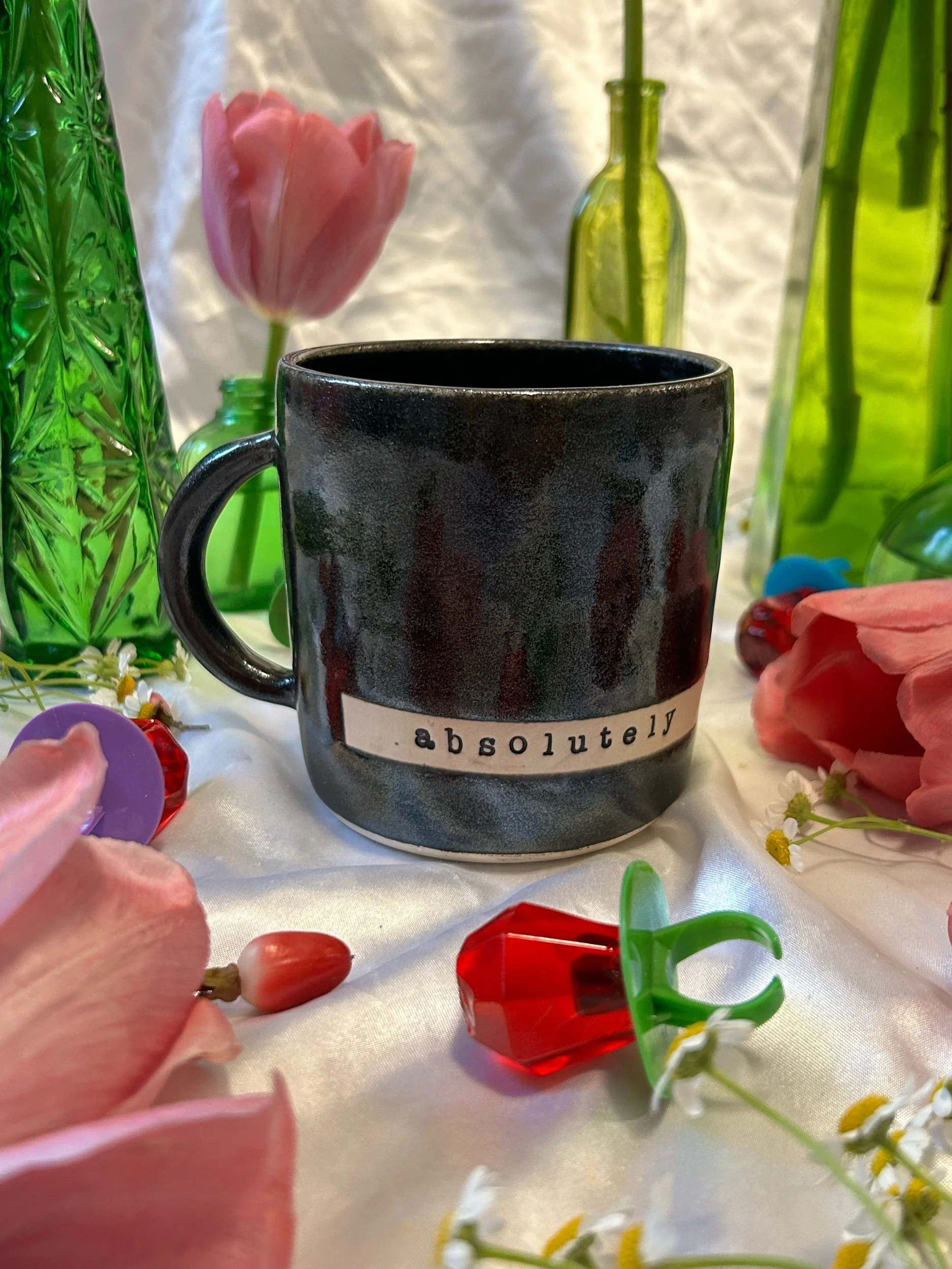 Medium mug with handle, decorated with black stamped lettering that reads “absolutely the fuck not” Glazed in sparkly, iridescent black. Holds about 16oz