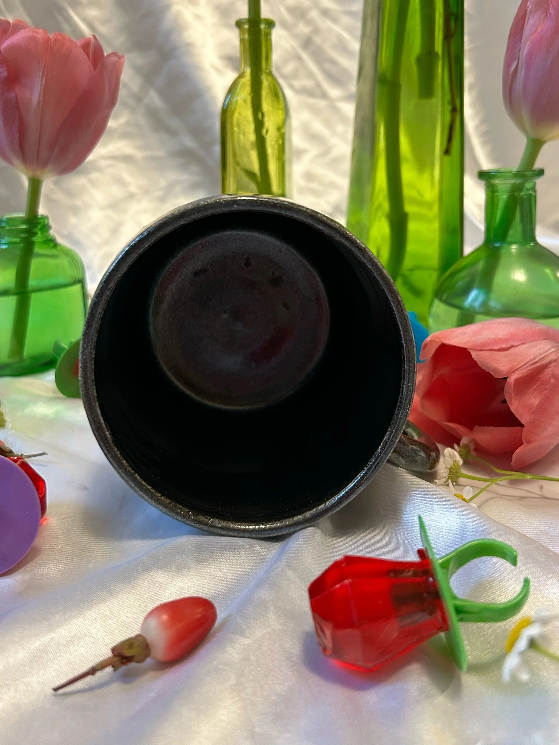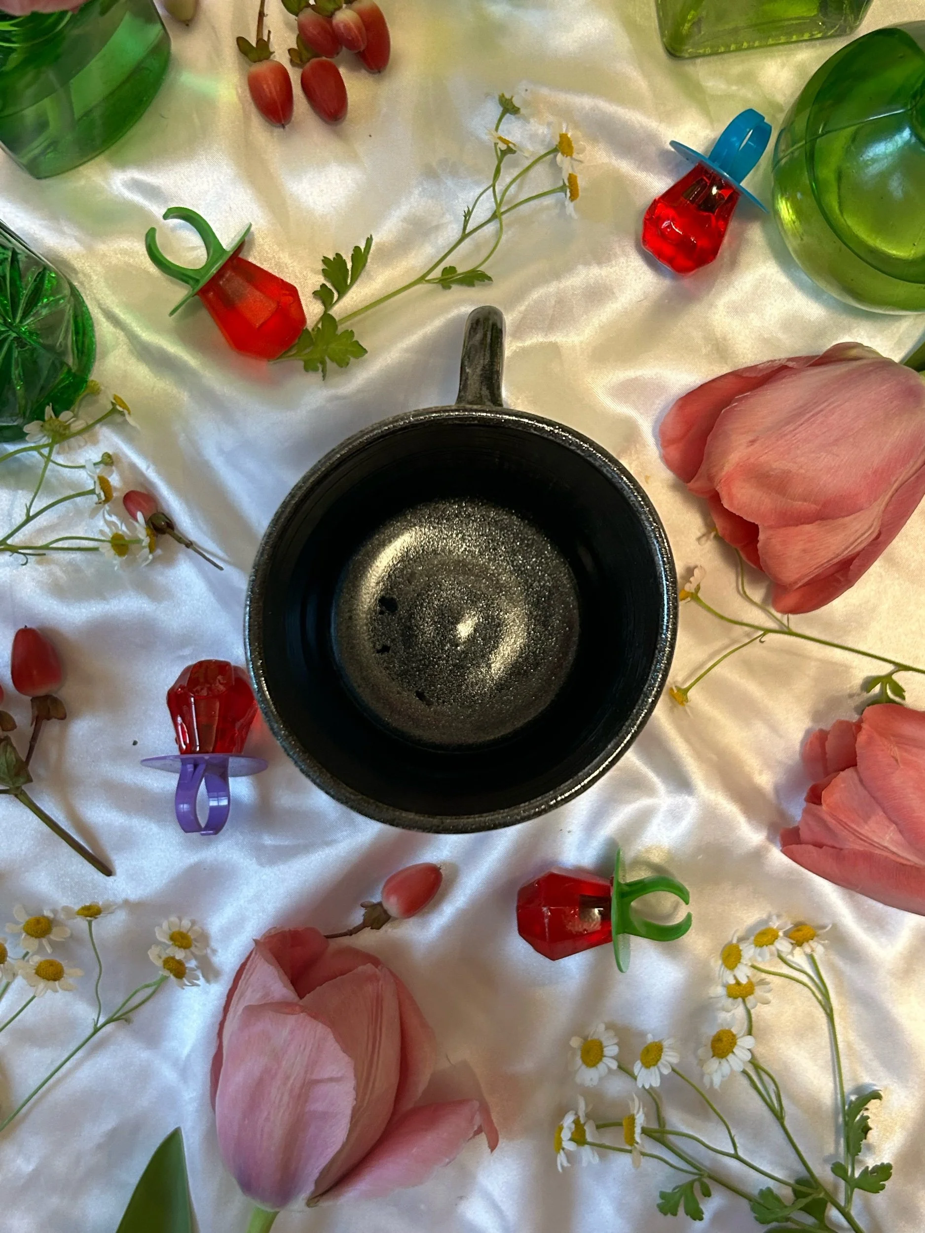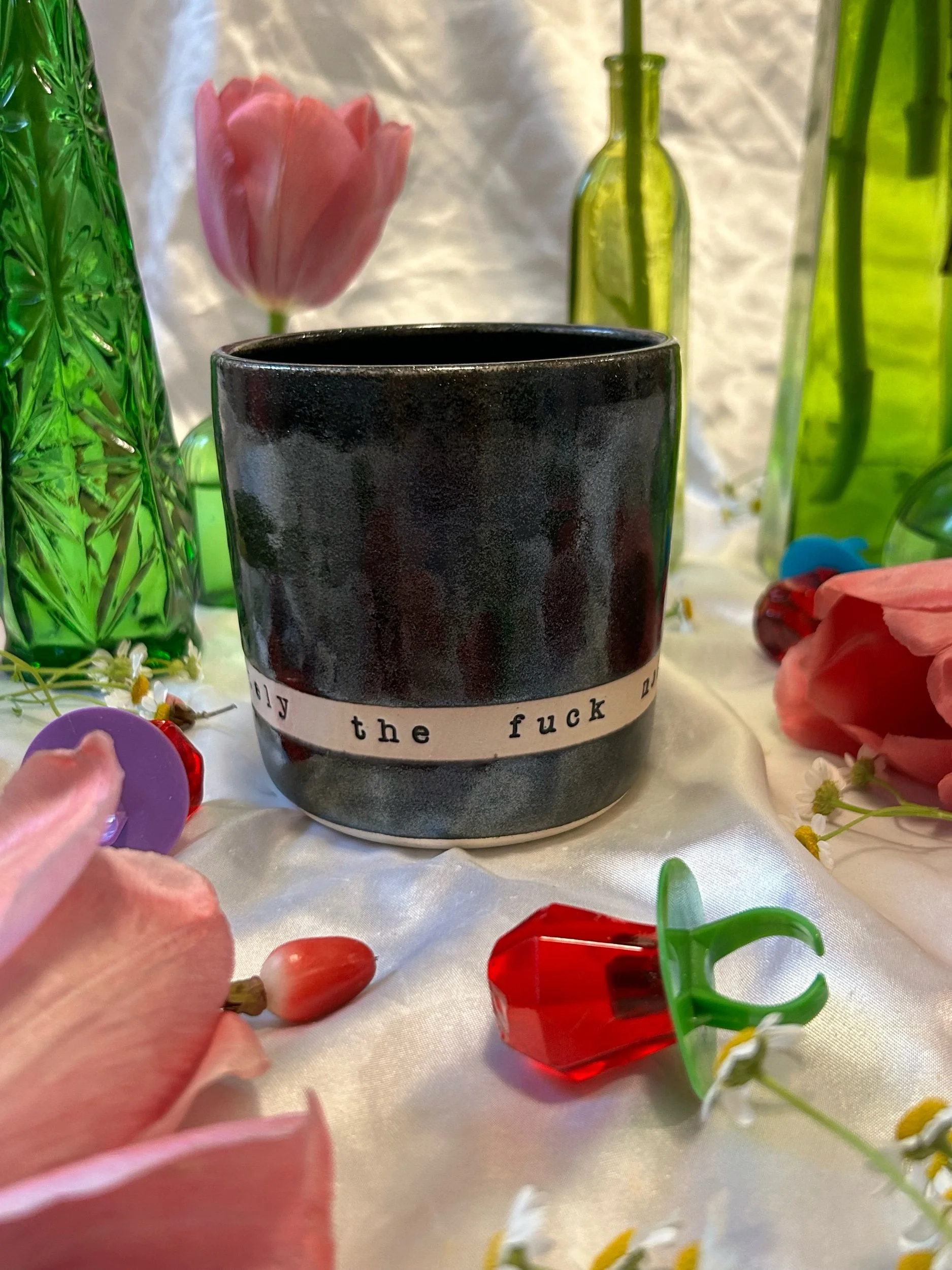 Medium mug with handle, decorated with black stamped lettering that reads “absolutely the fuck not” Glazed in sparkly, iridescent black. Holds about 16oz