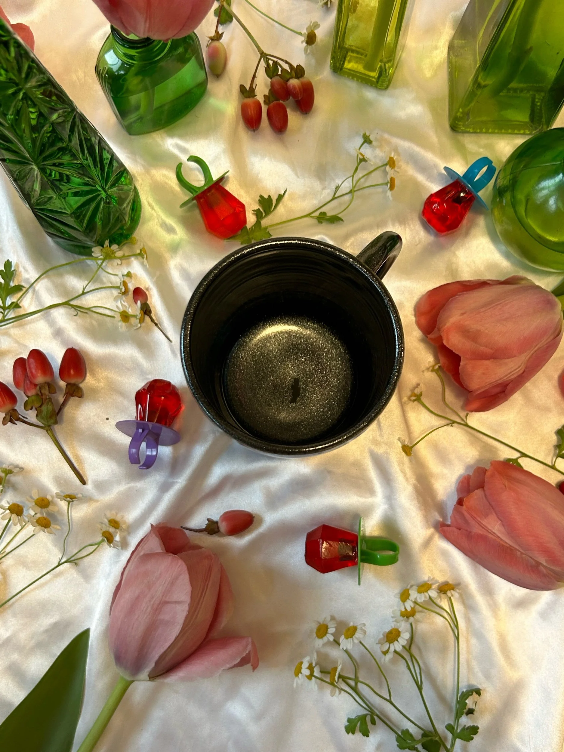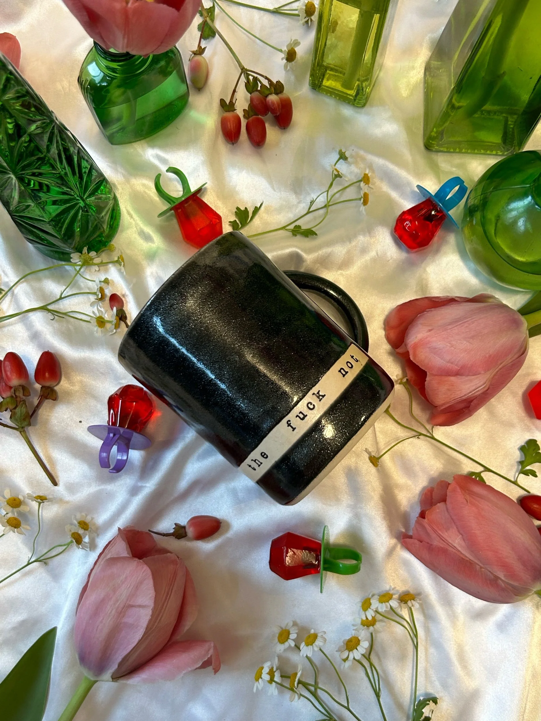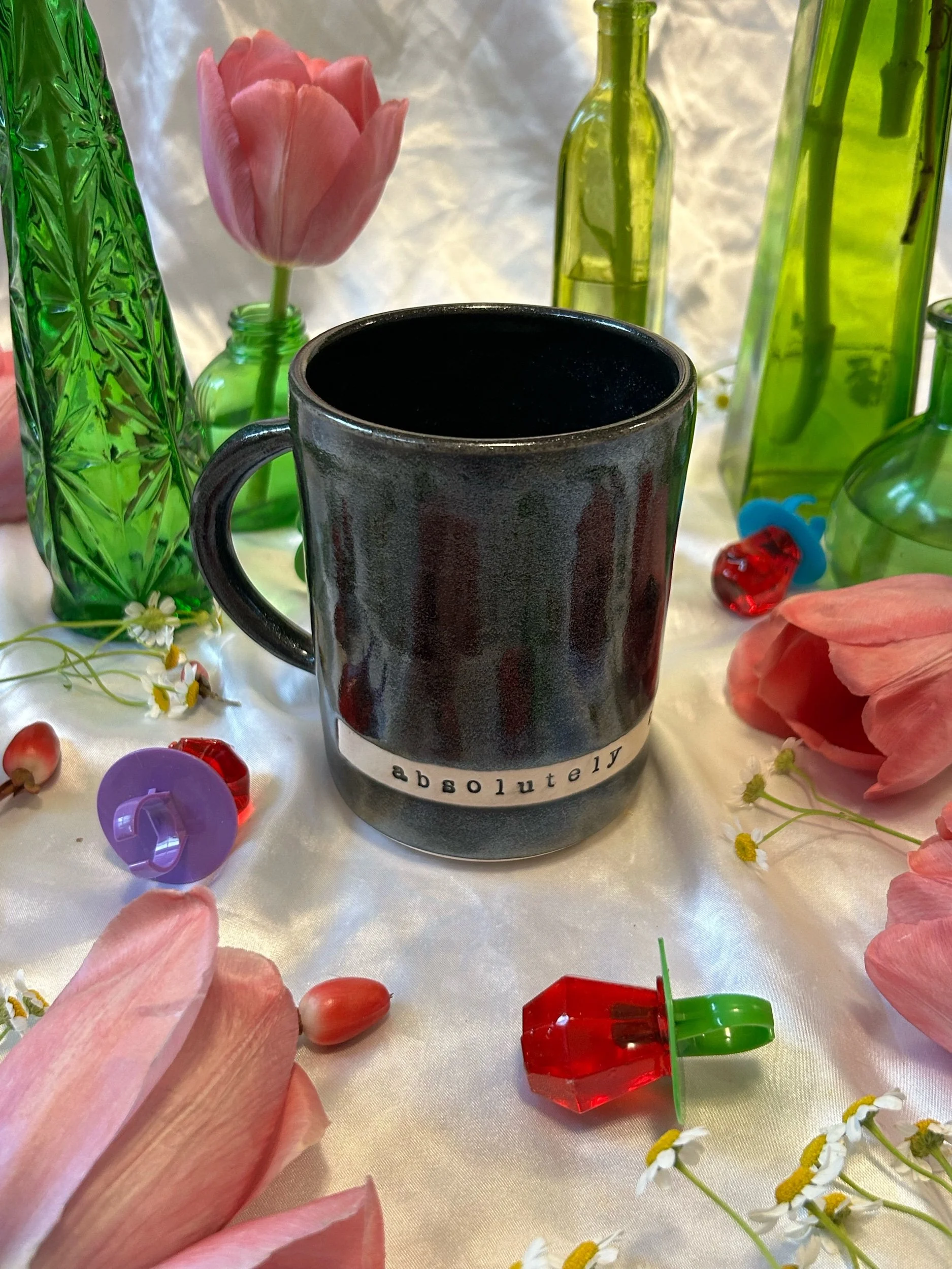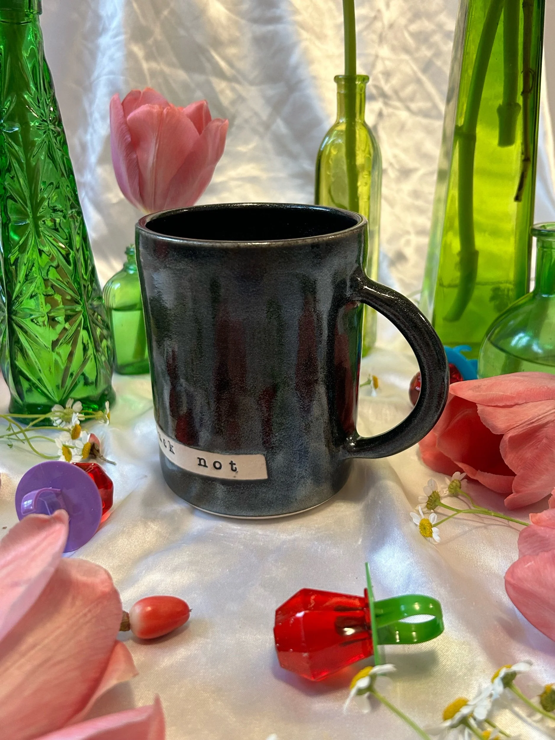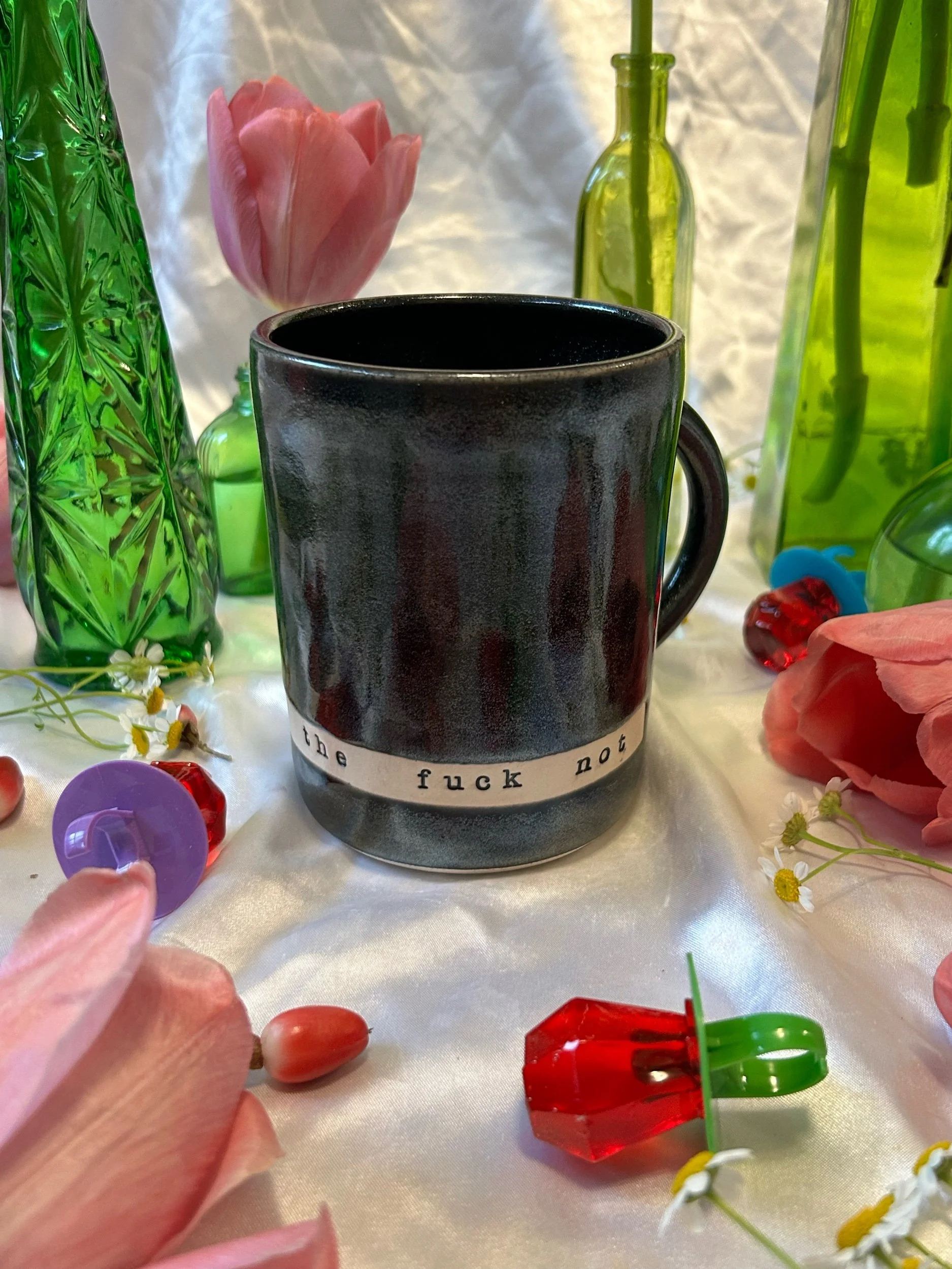 Large mug with handle, decorated with black stamped lettering that reads “absolutely the fuck not” Glazed in sparkly, iridescent black. Holds about 20oz