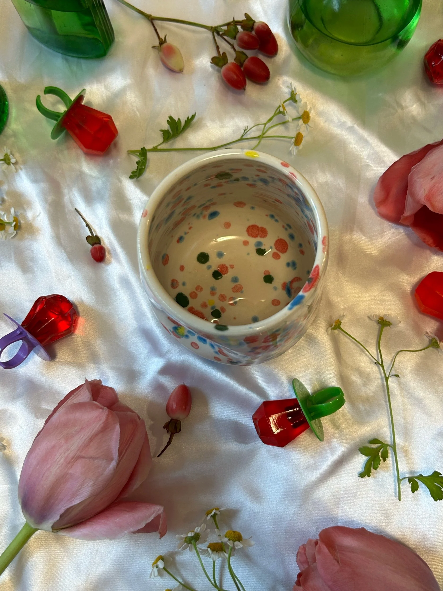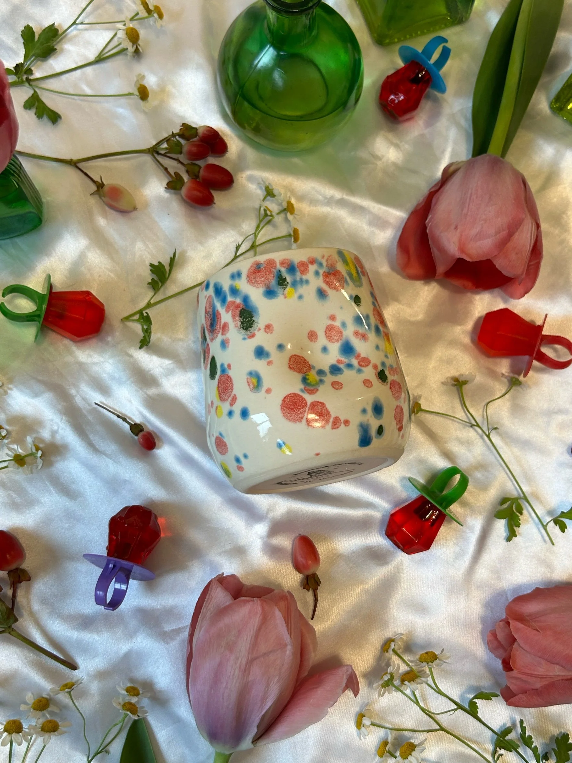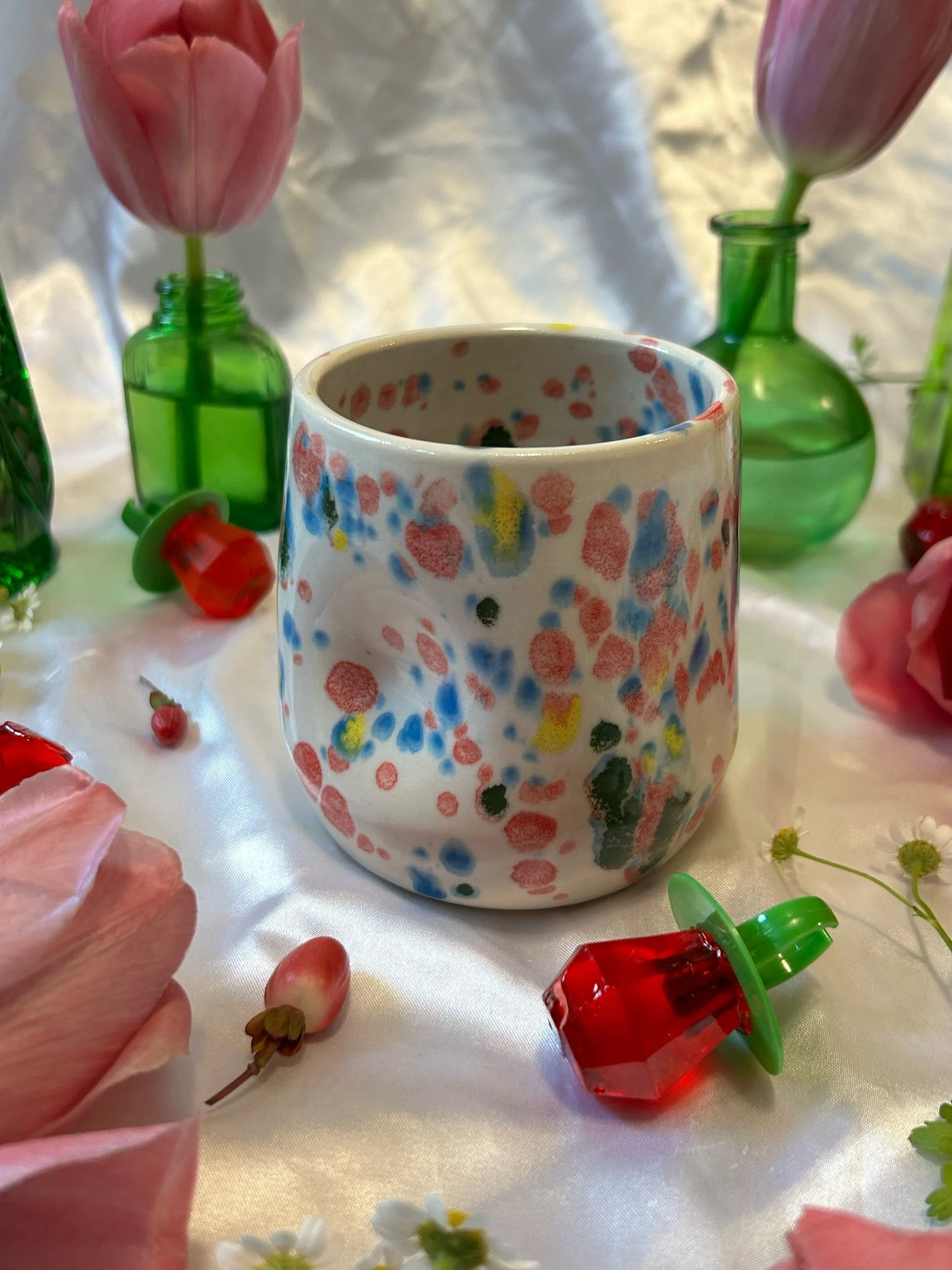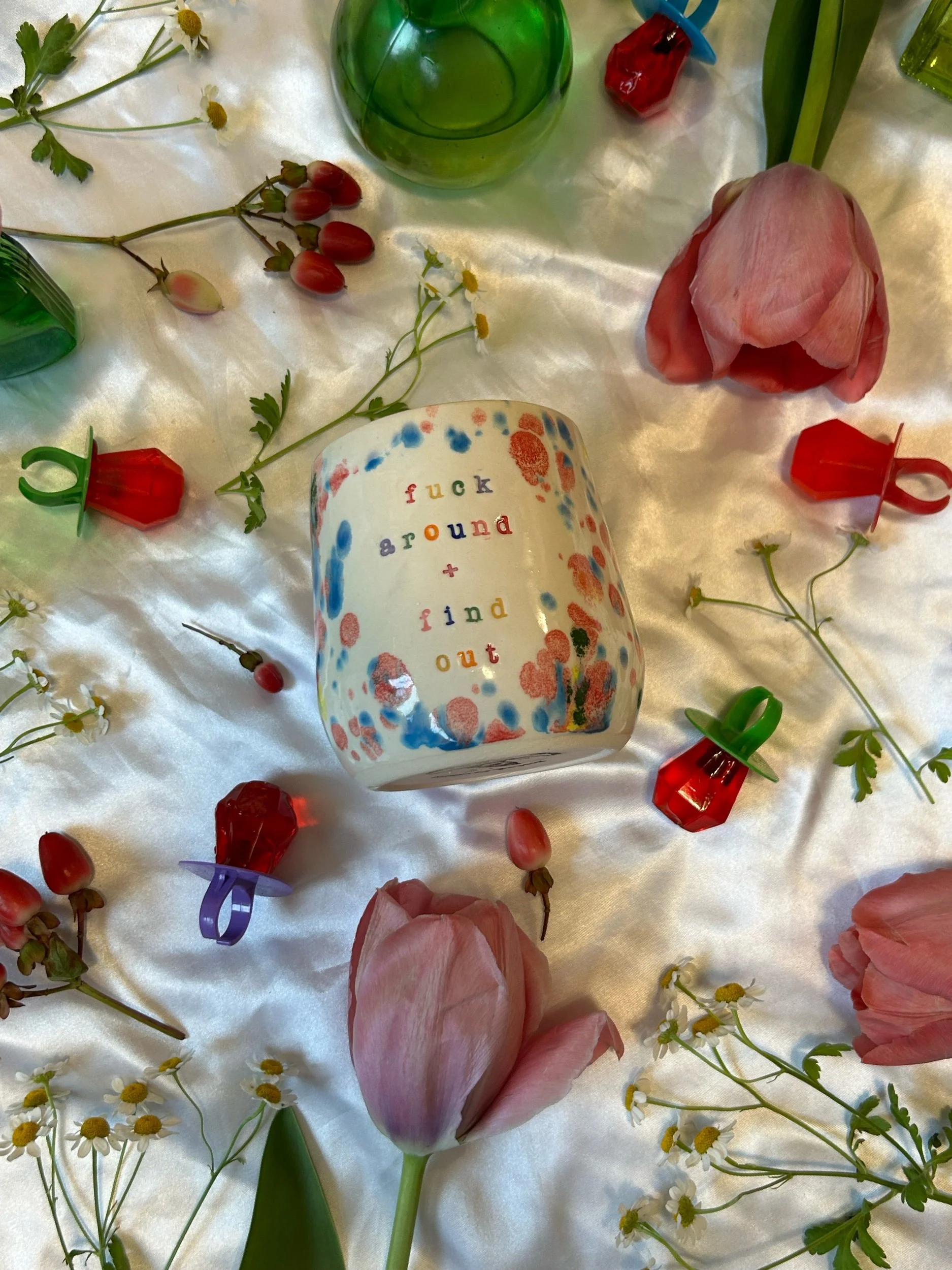 Small tumbler with with thumbprint hold, decorated with rainbow stamped lettering that reads “fuck around + find out” Glazed in rainbow funfetti colors. Holds about 12oz, designed to be comfortable whether you are right or lefthanded.