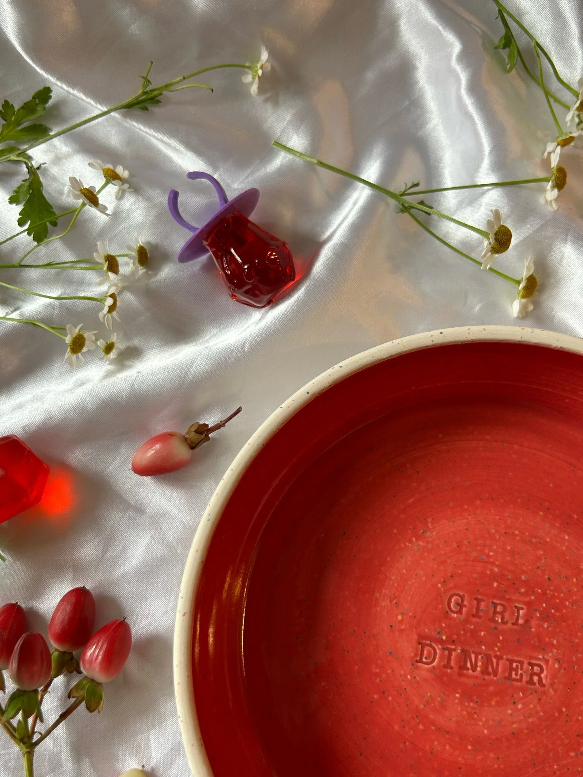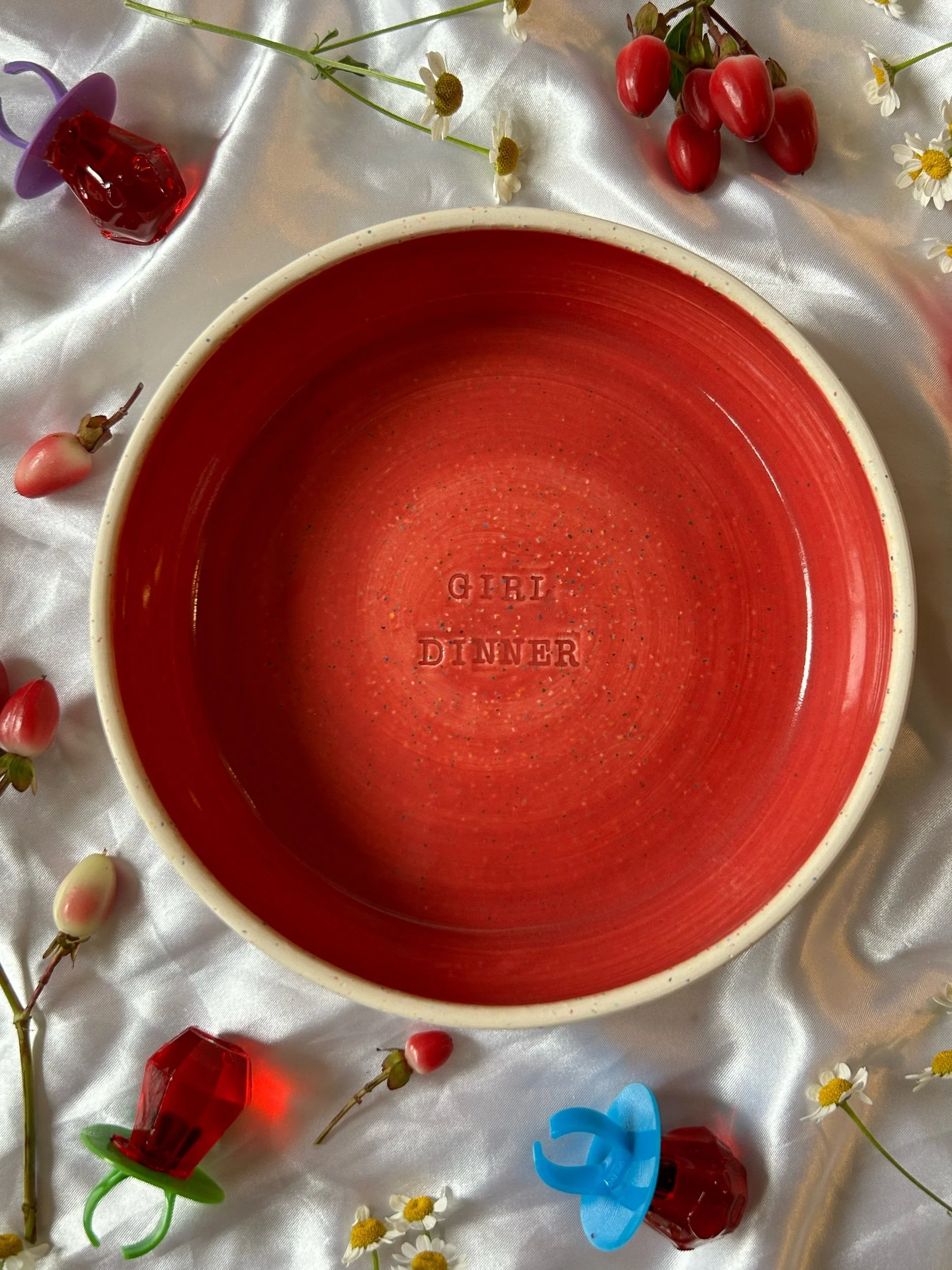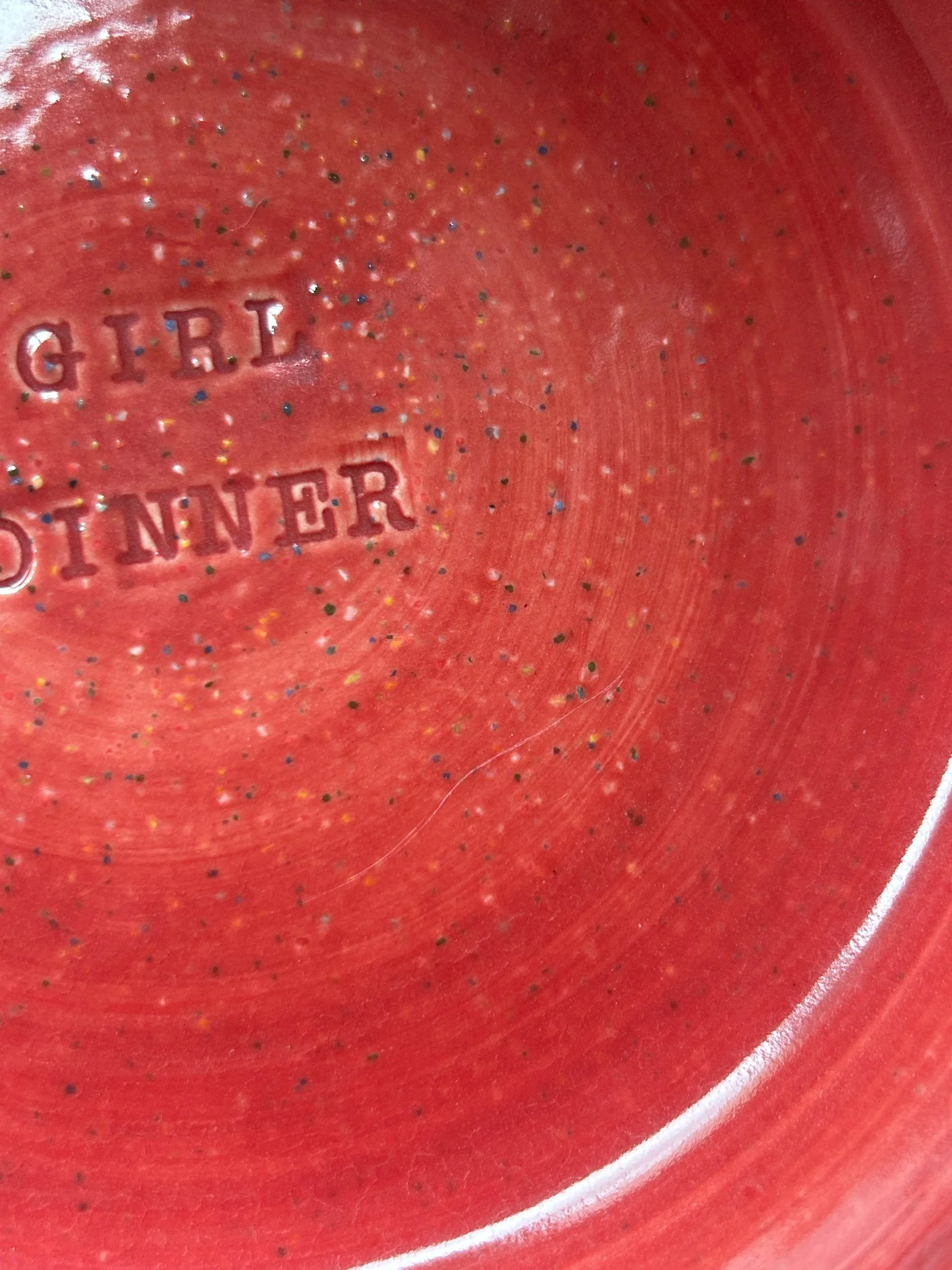 Small blate (kind of a bowl, kind of a plate) made with rainbow speckled clay with stamped lettering that reads “GIRL DINNER“ Glazed in a deep crimson