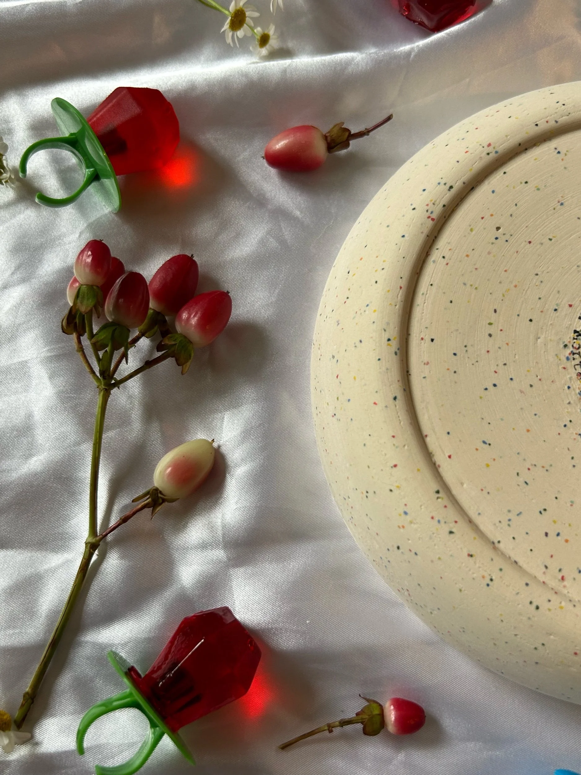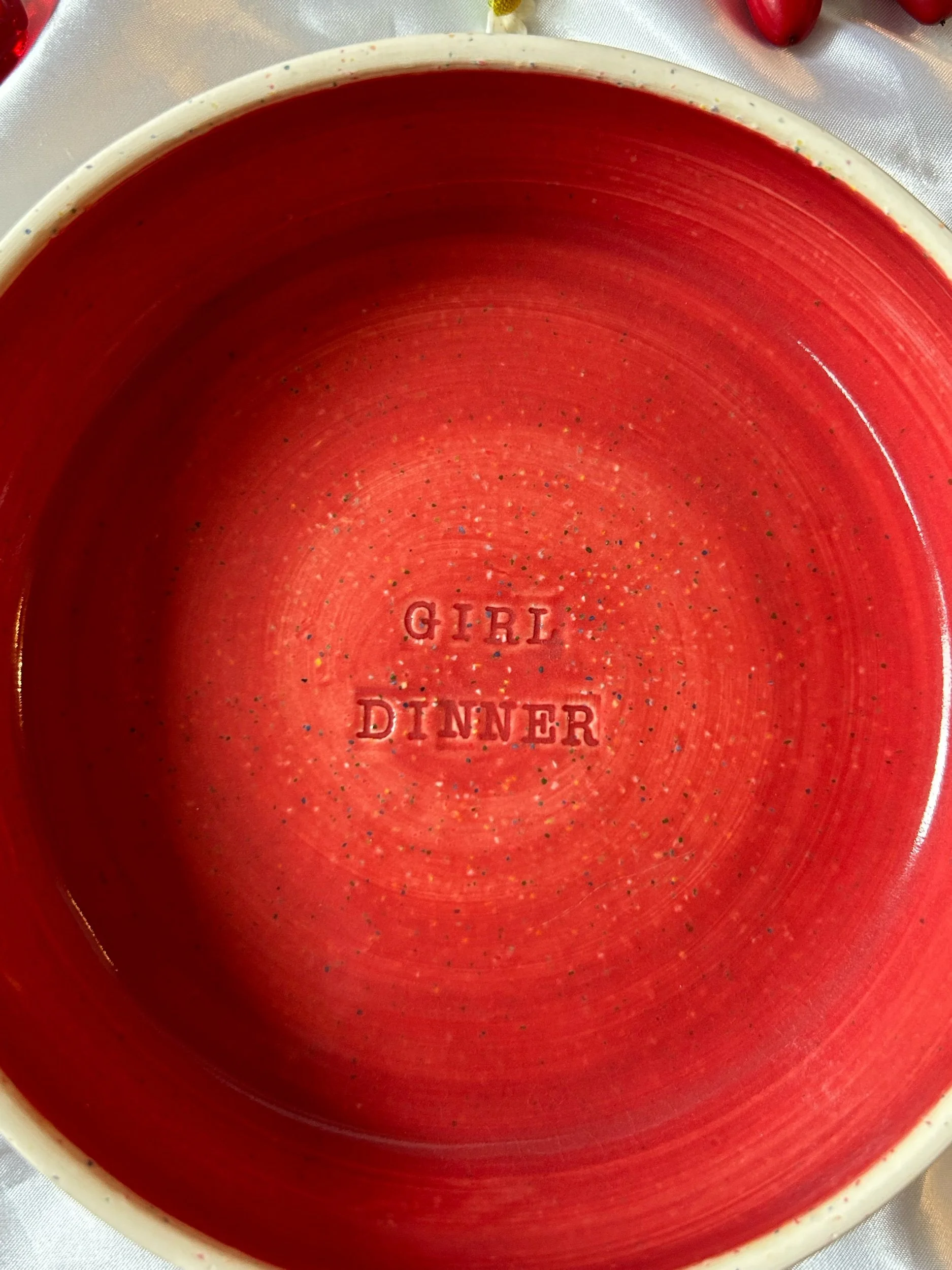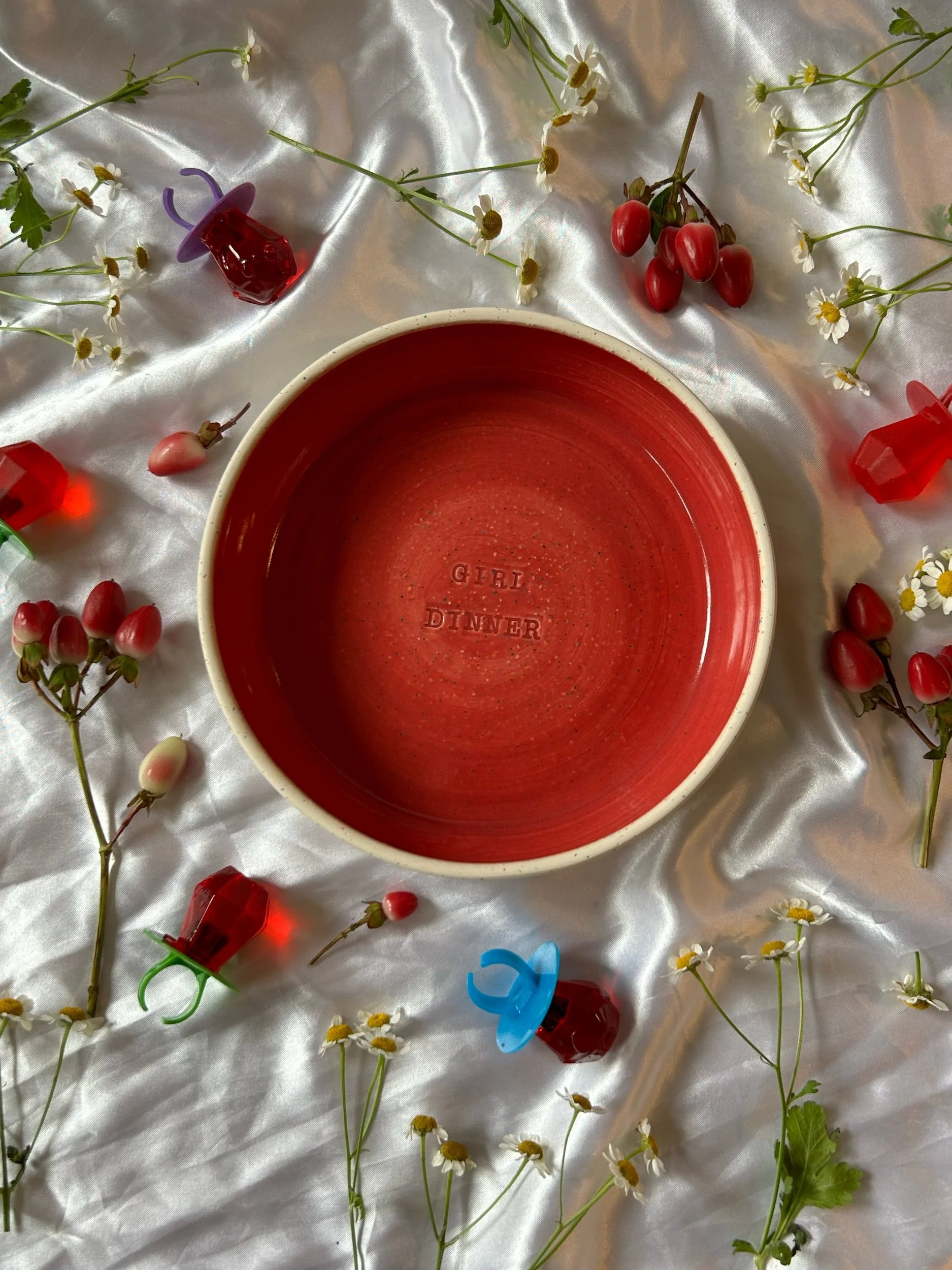 Small blate (kind of a bowl, kind of a plate) made with rainbow speckled clay with stamped lettering that reads “GIRL DINNER“ Glazed in a deep crimson
