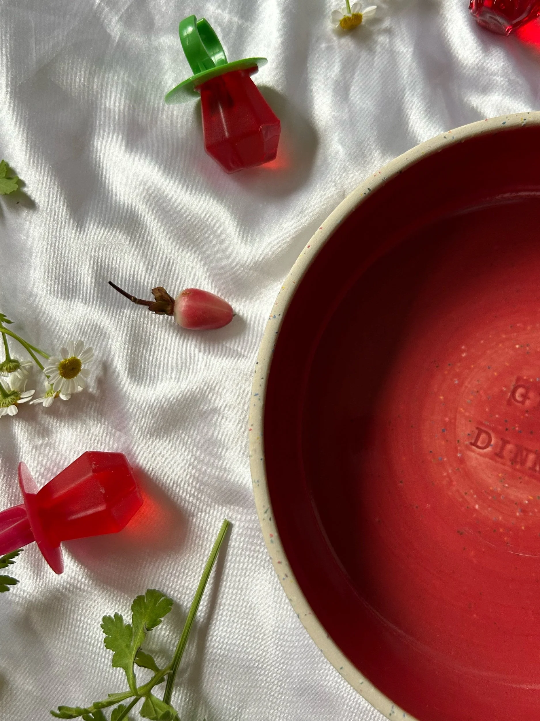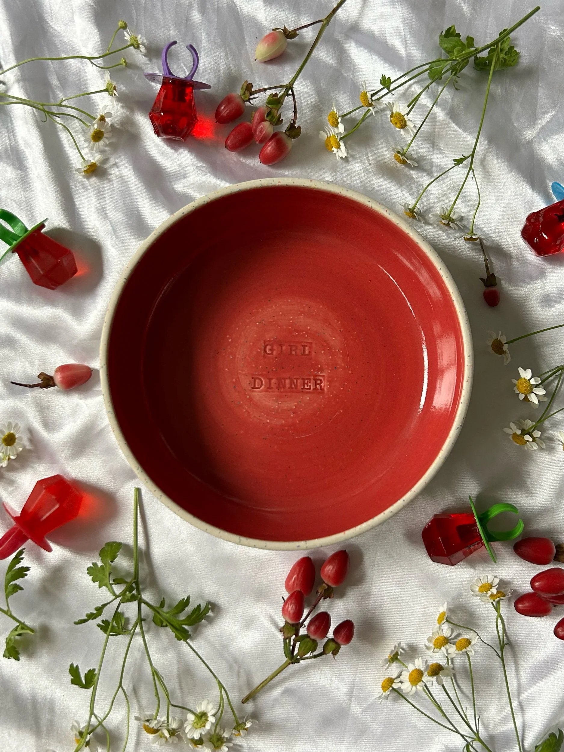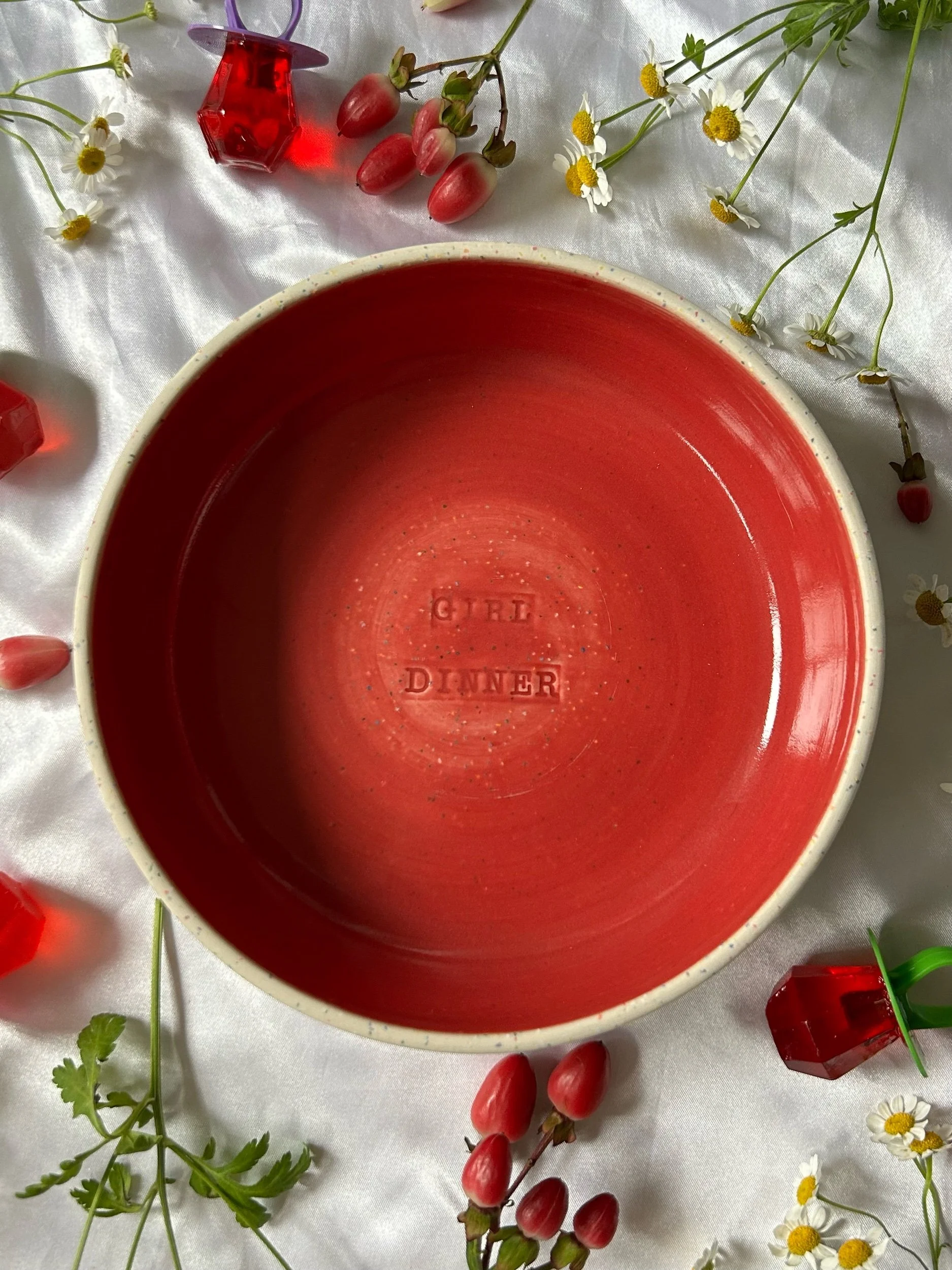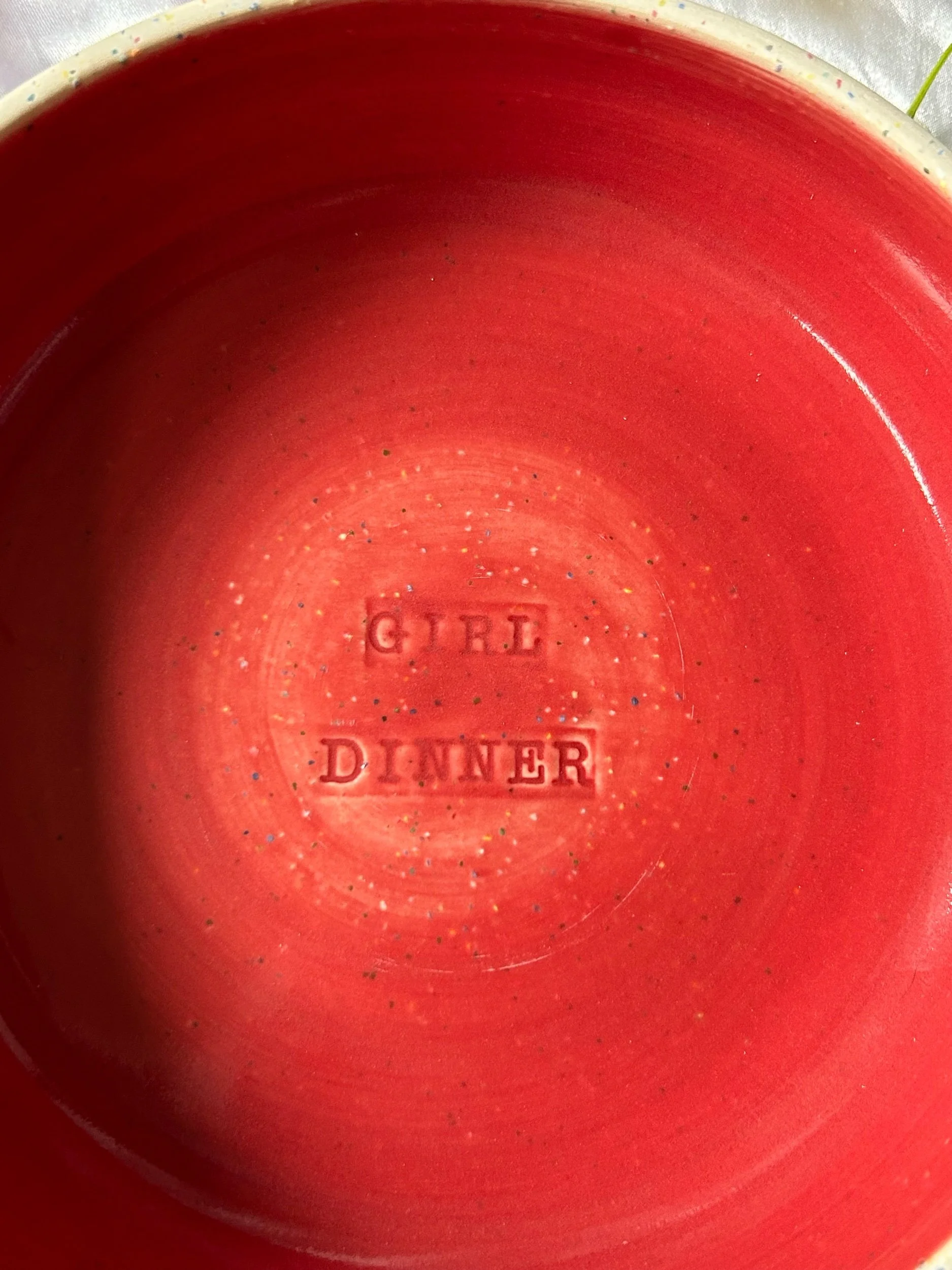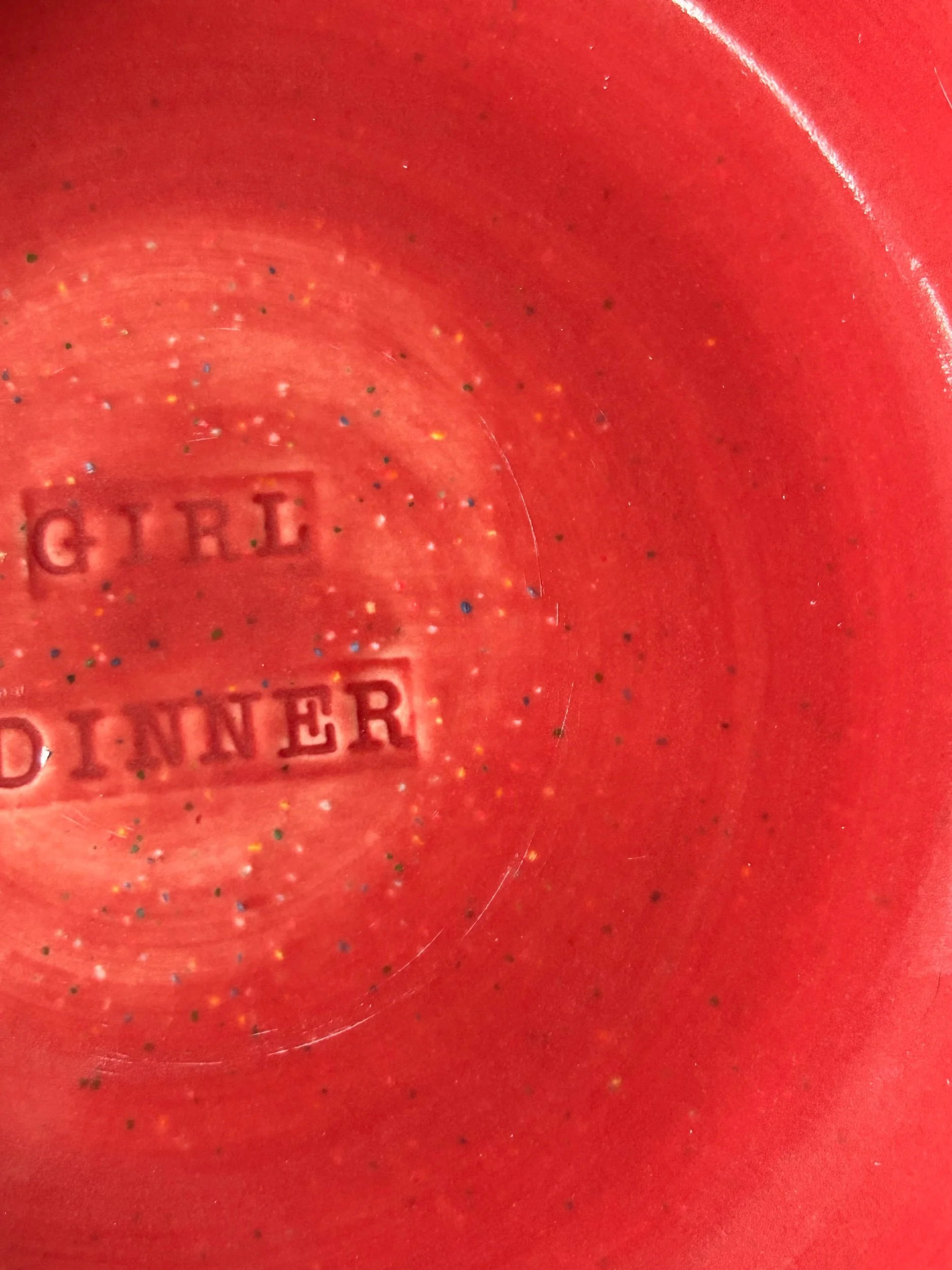 Small blate (kind of a bowl, kind of a plate) made with rainbow speckled clay with stamped lettering that reads “GIRL DINNER“ Glazed in a deep crimson