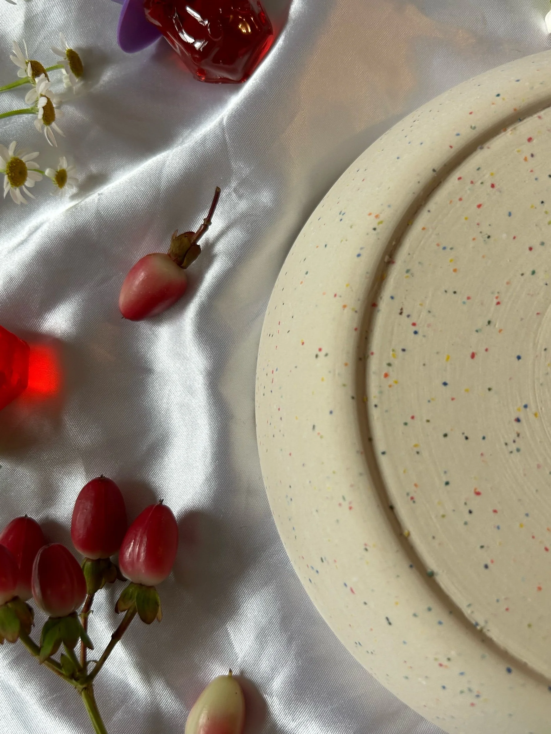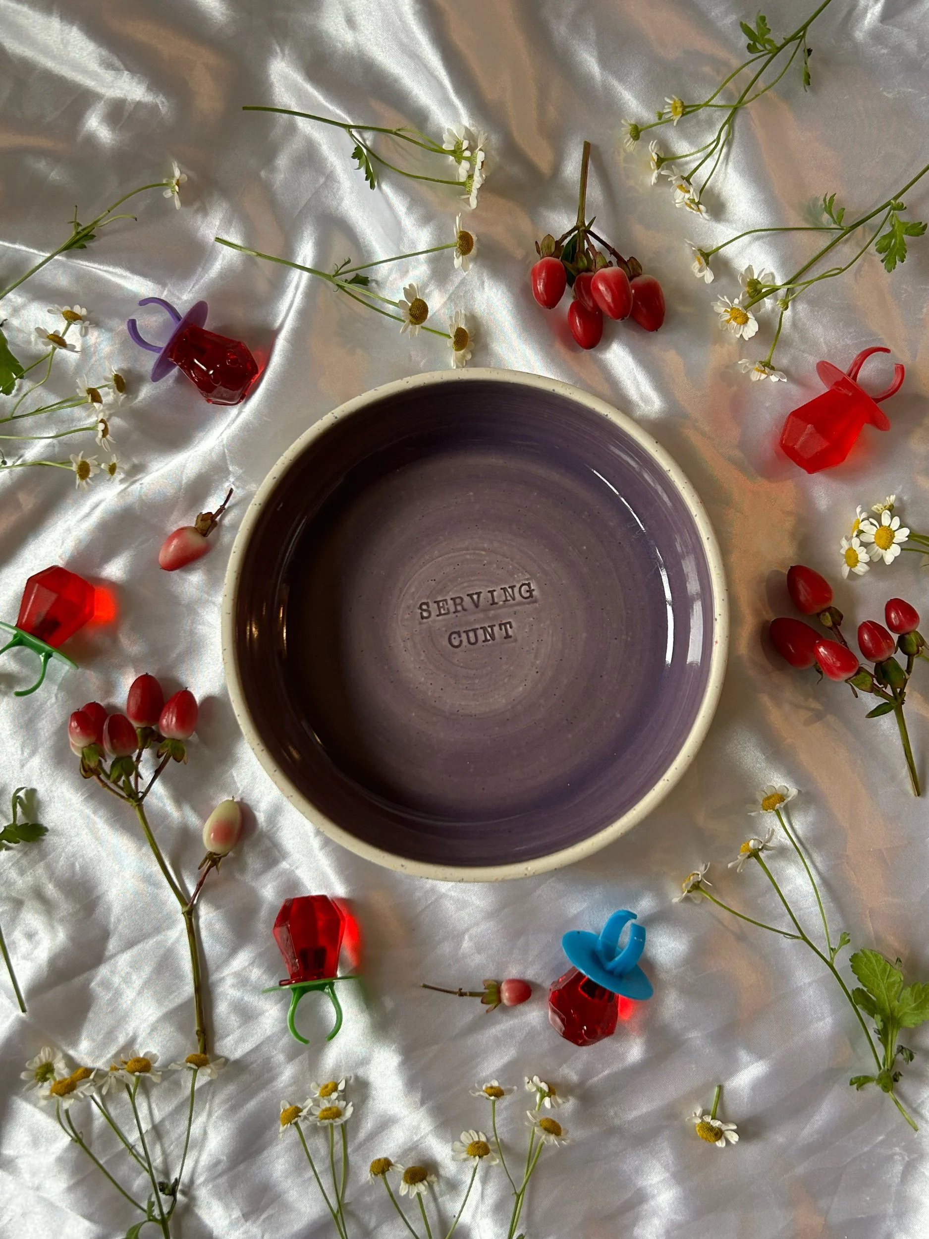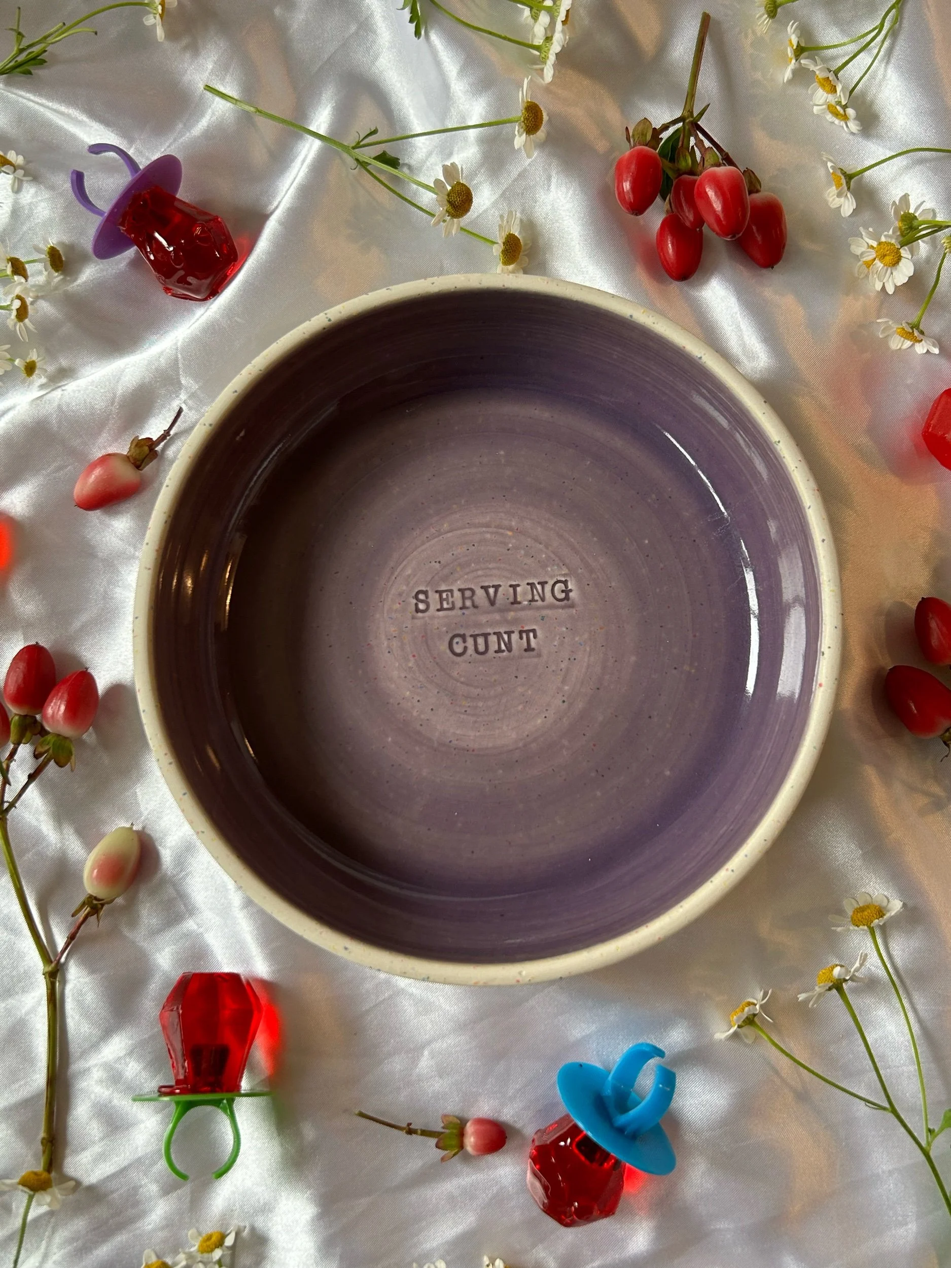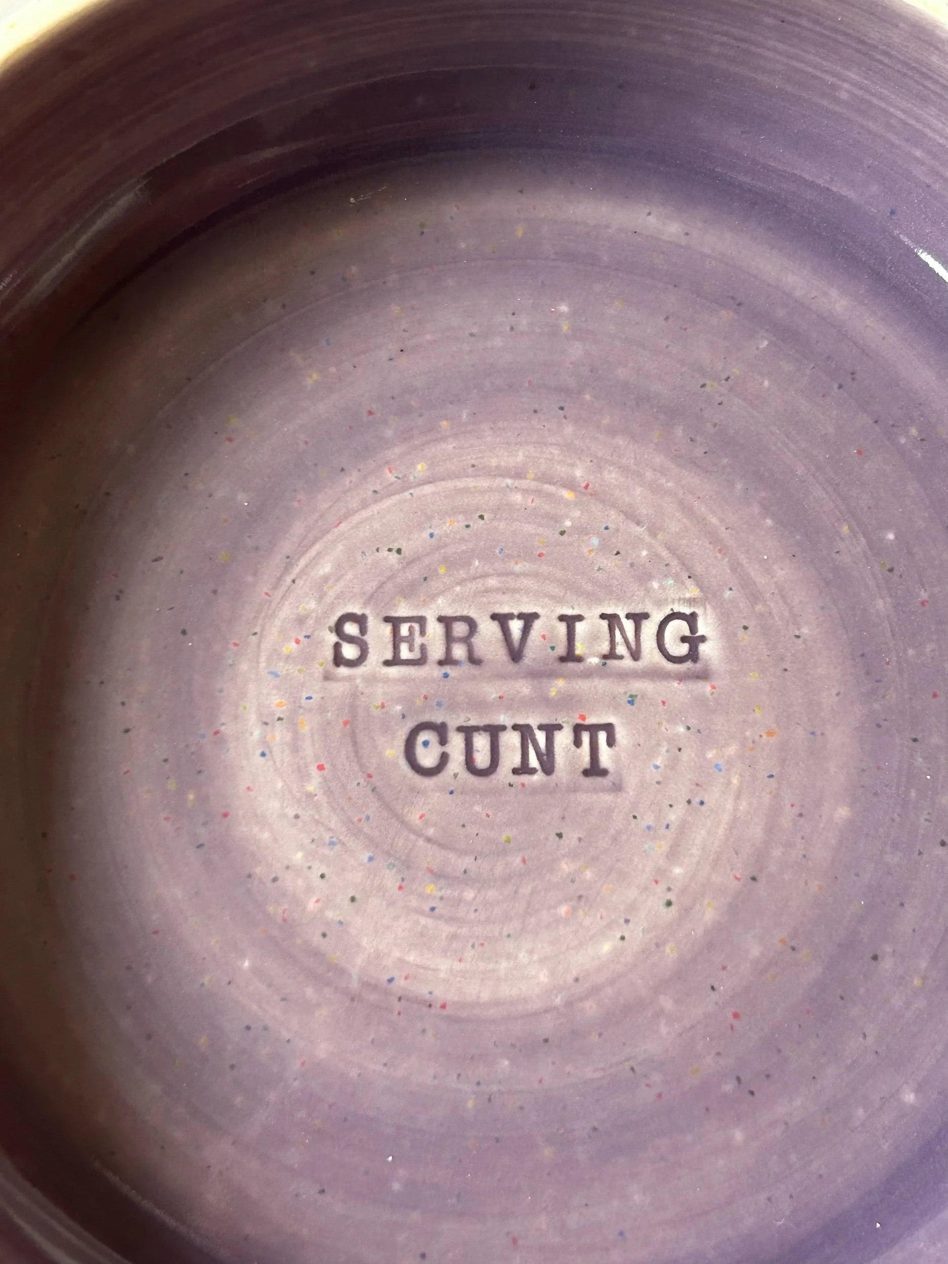 Small blate (kind of a bowl, kind of a plate) made with rainbow speckled clay with stamped lettering that reads “SERVING CUNT“ Glazed in a deep lavender