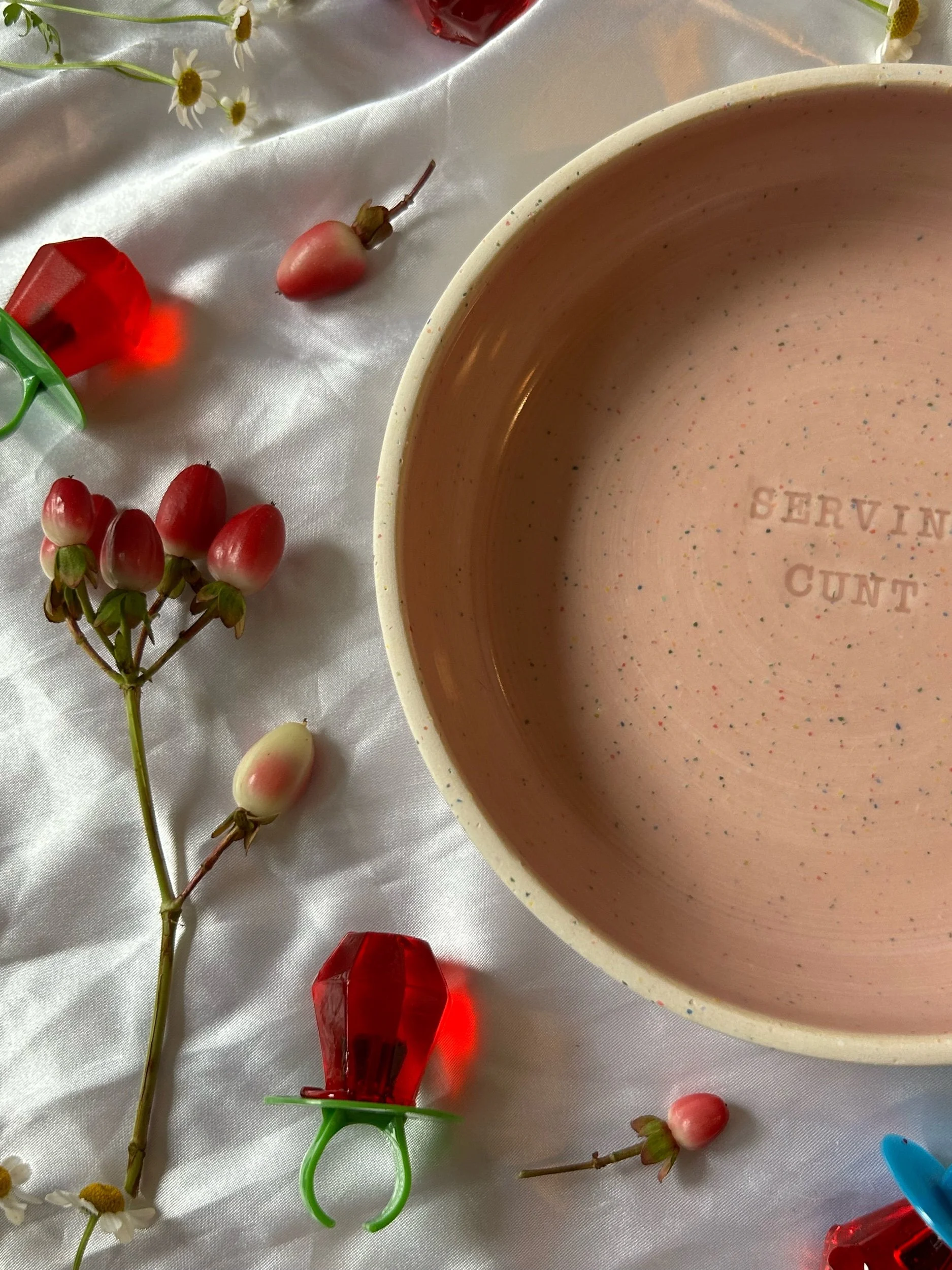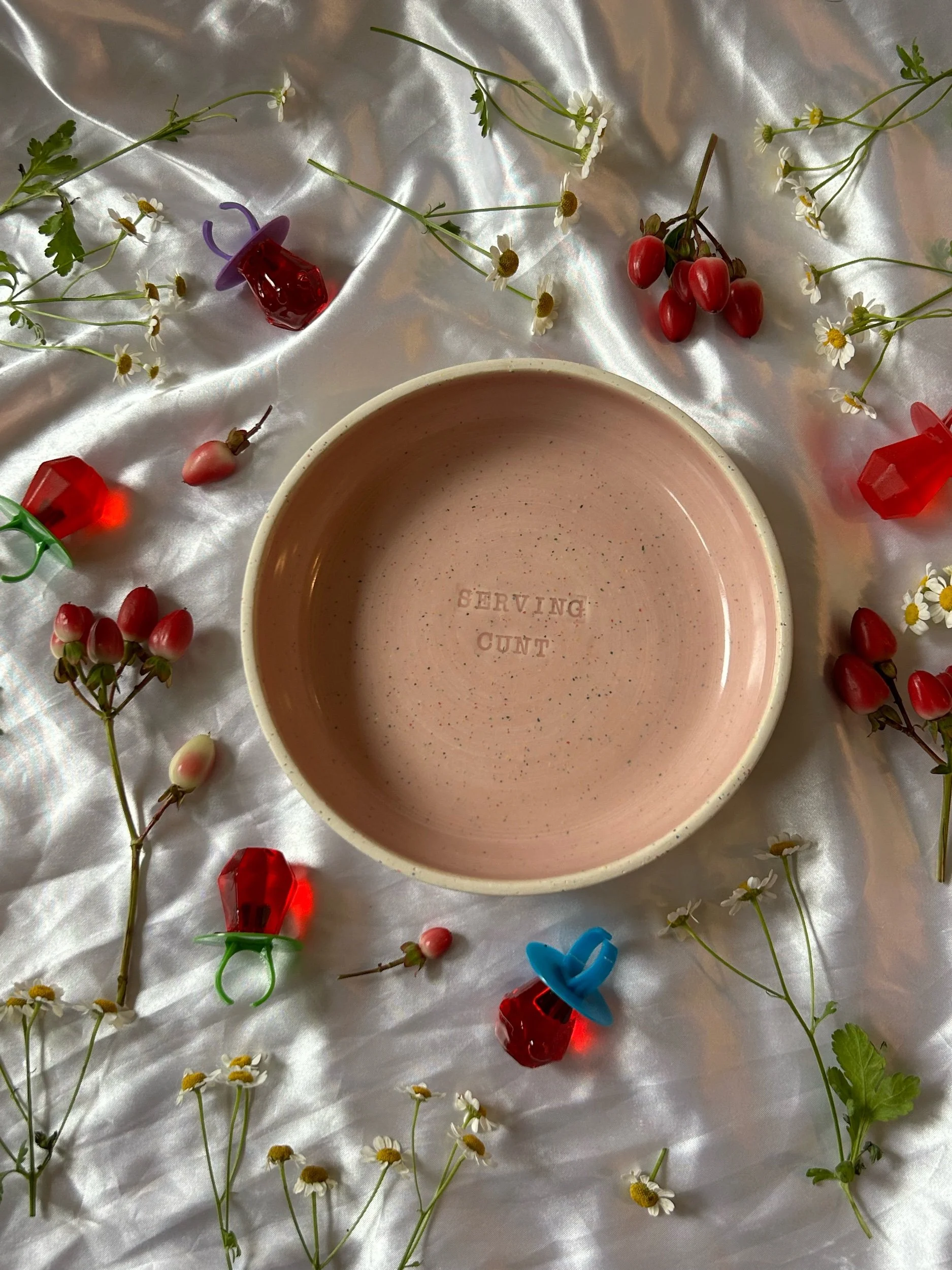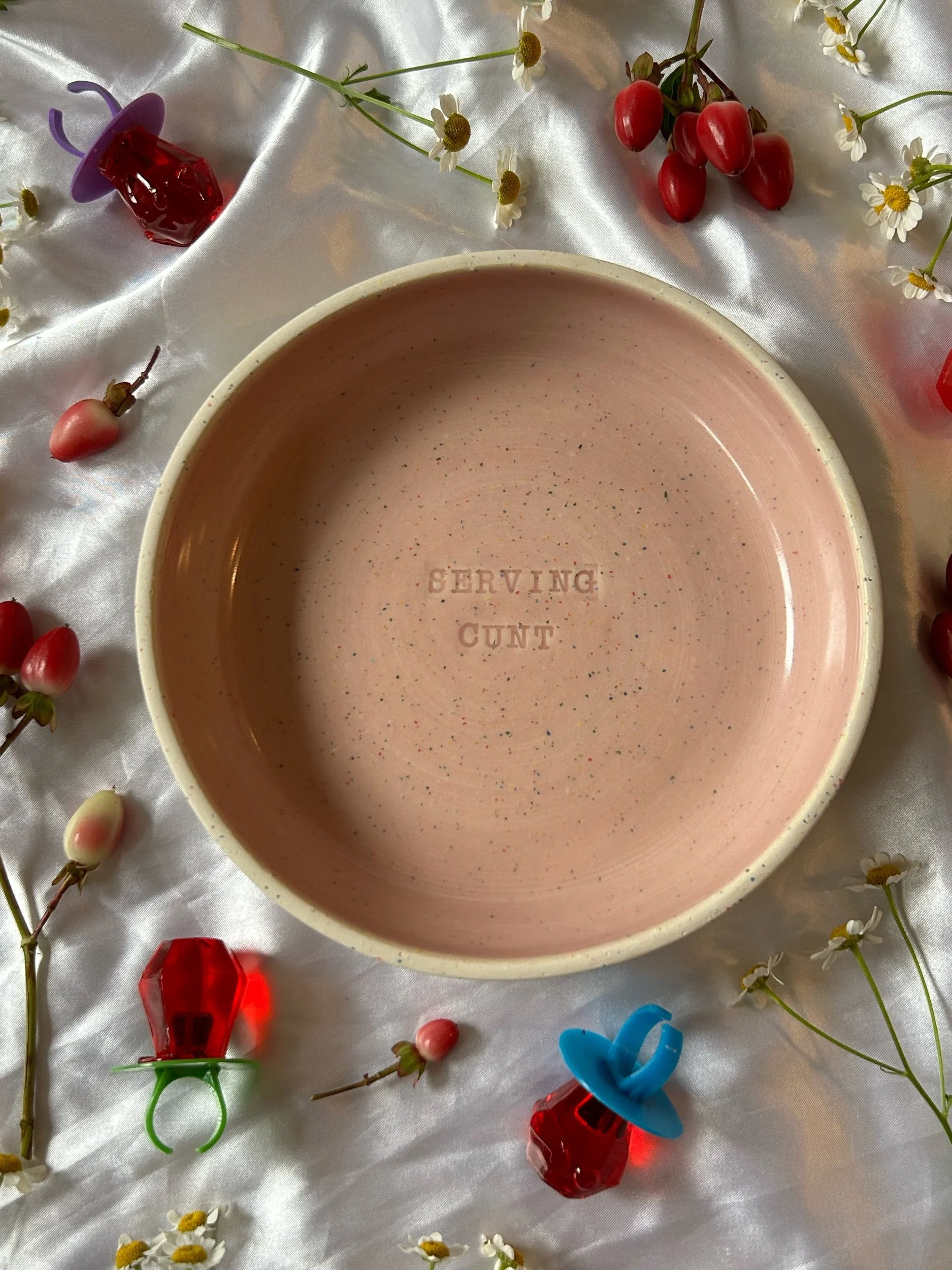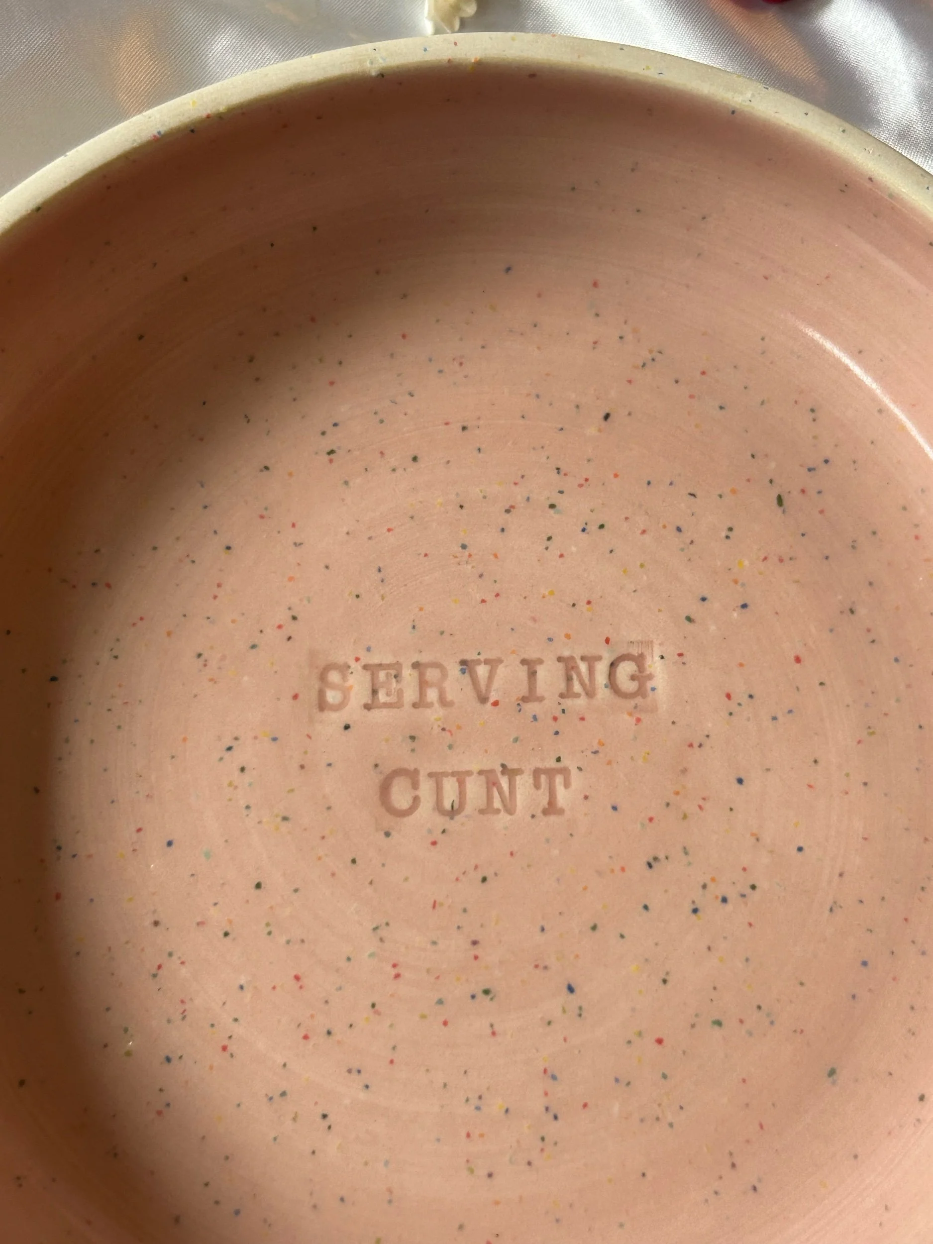 Small blate (kind of a bowl, kind of a plate) made with rainbow speckled clay with stamped lettering that reads “SERVING CUNT“ Glazed in a soft bubblegum pink