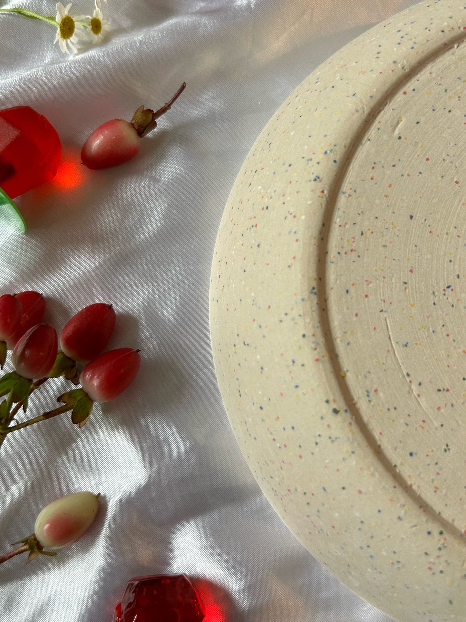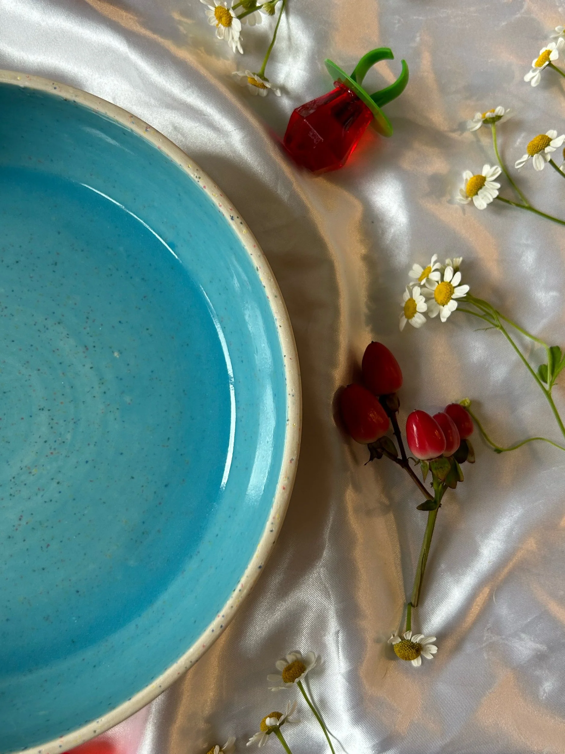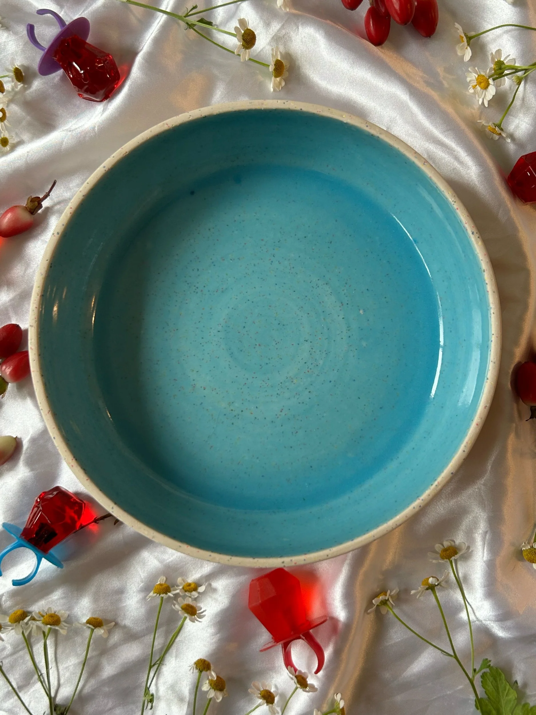Large blate (kind of a bowl, kind of a plate) made with rainbow speckled clay and glazed in a bright baby blue.