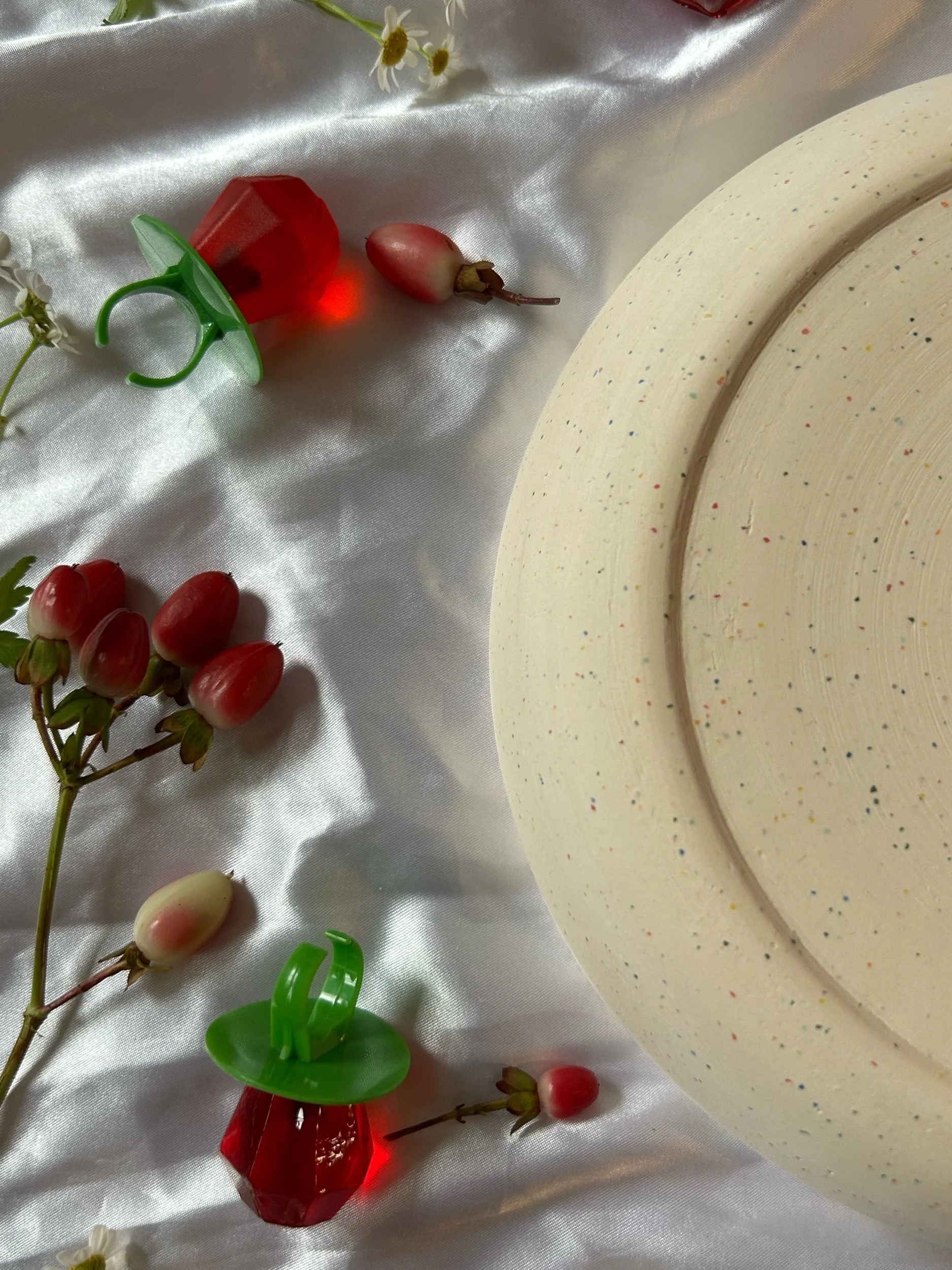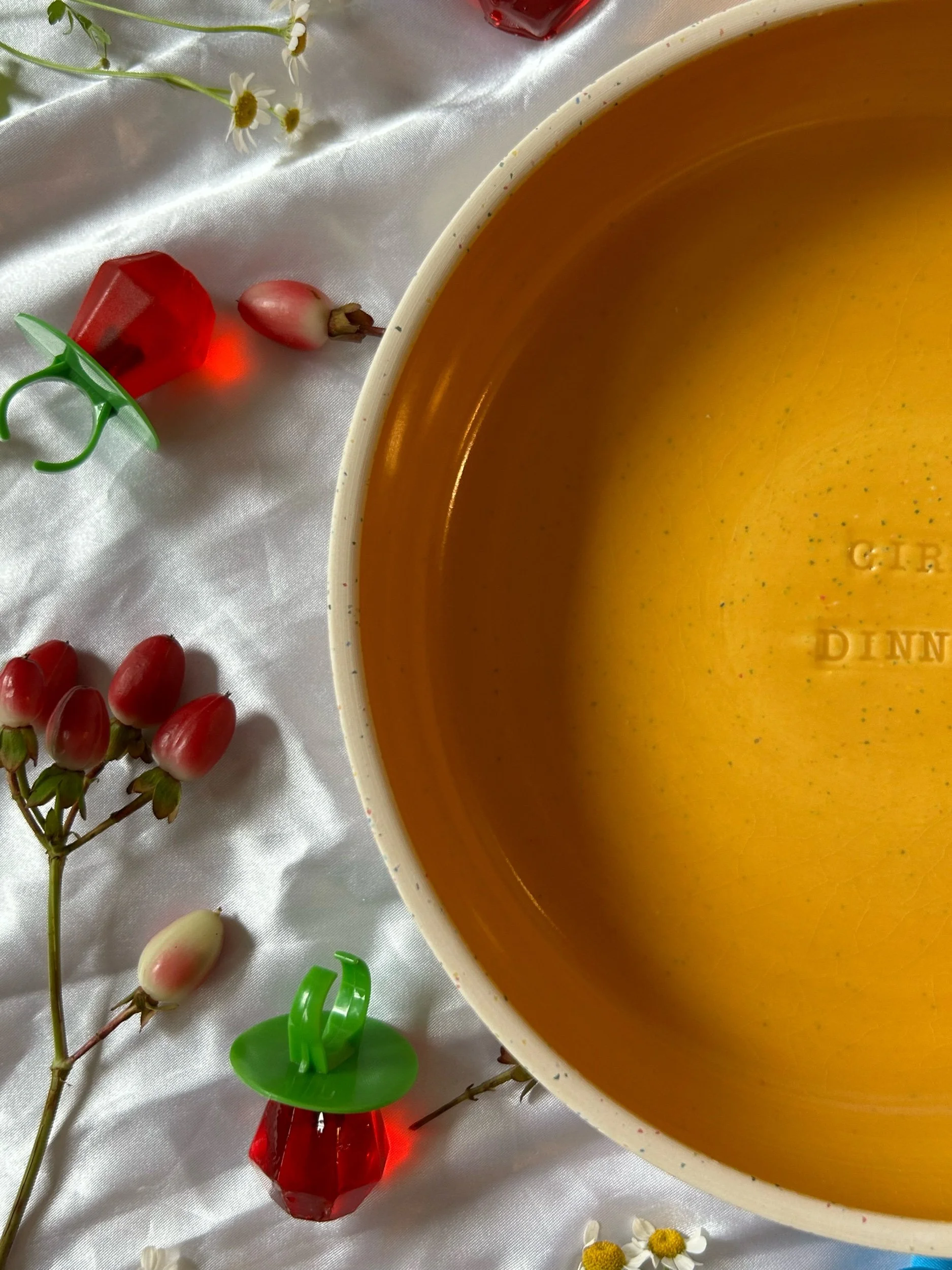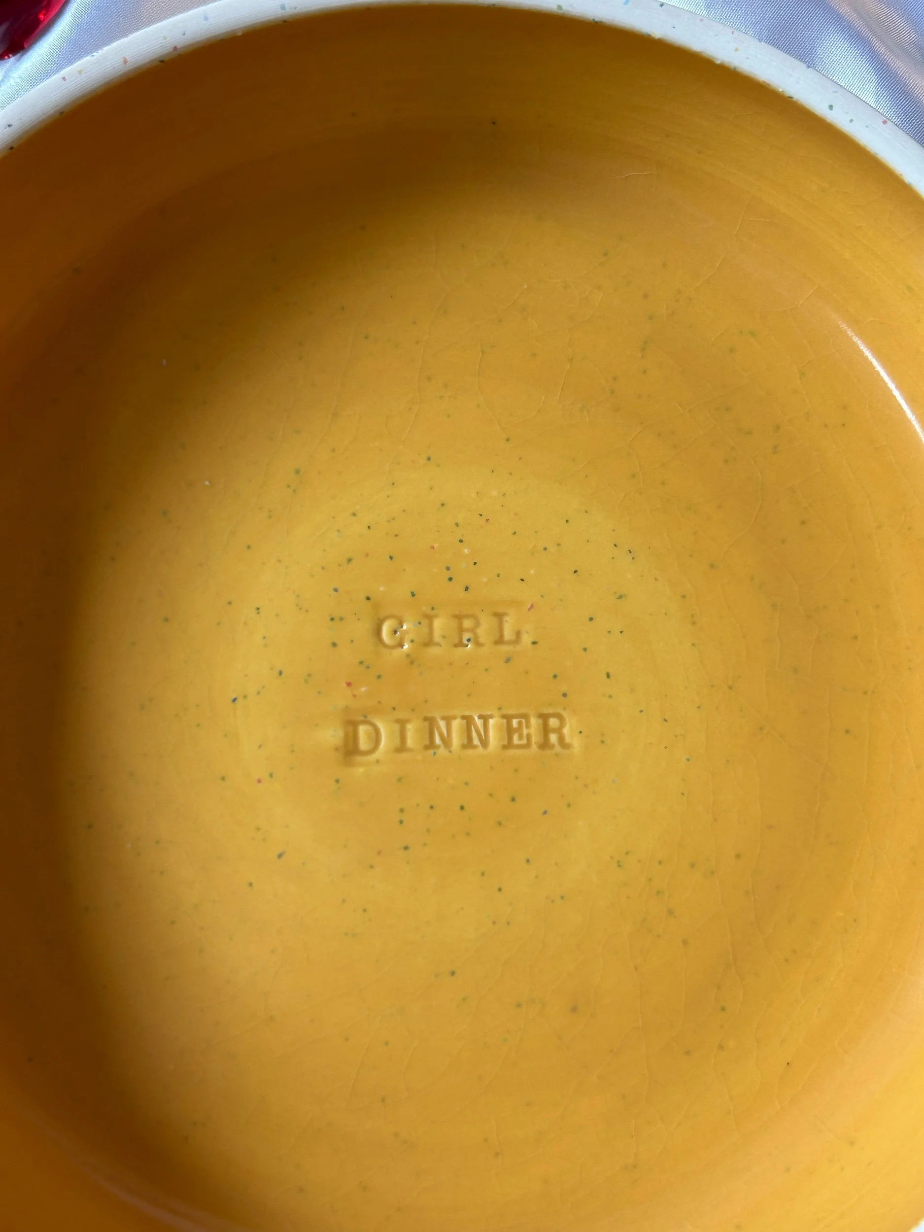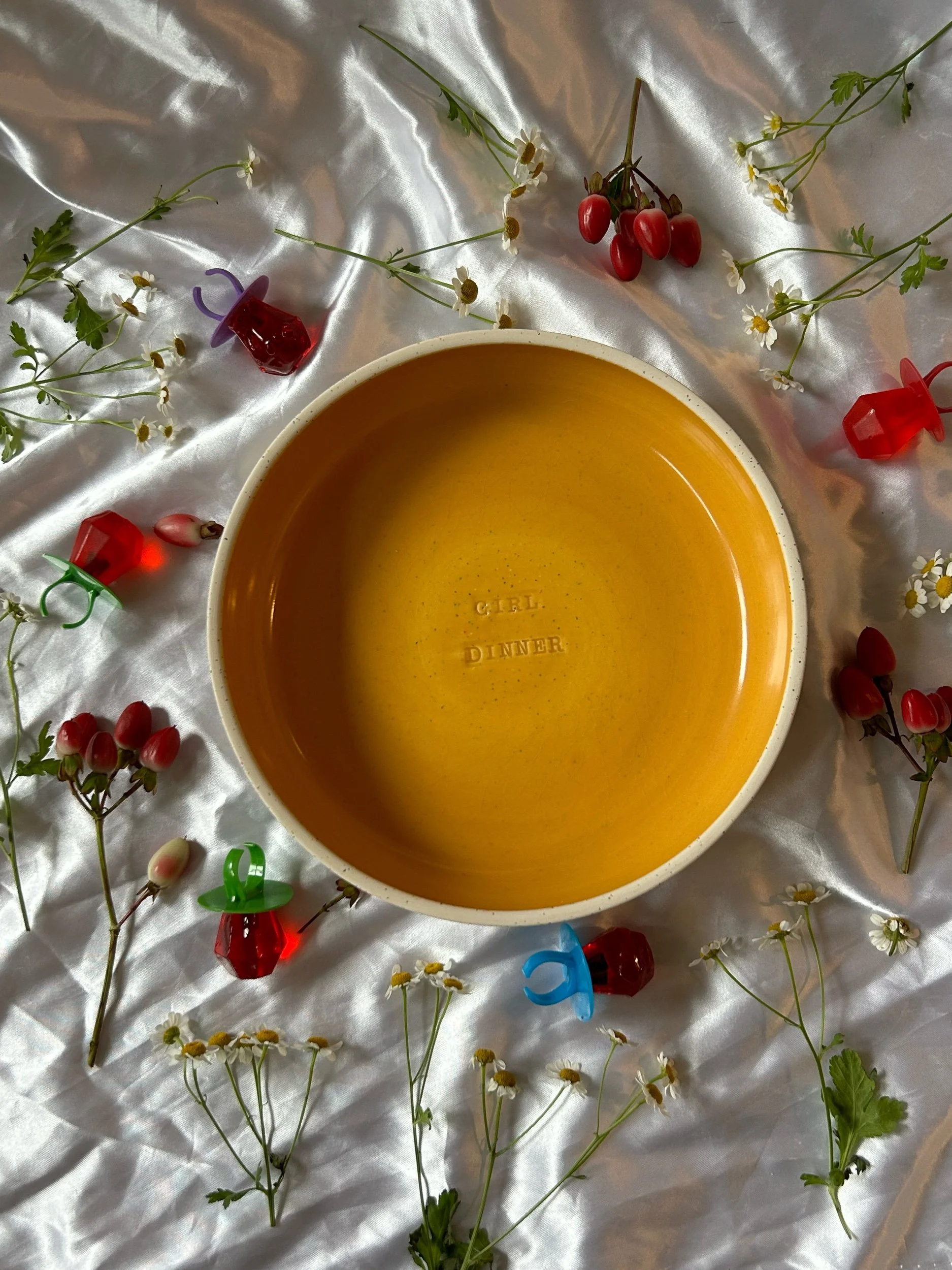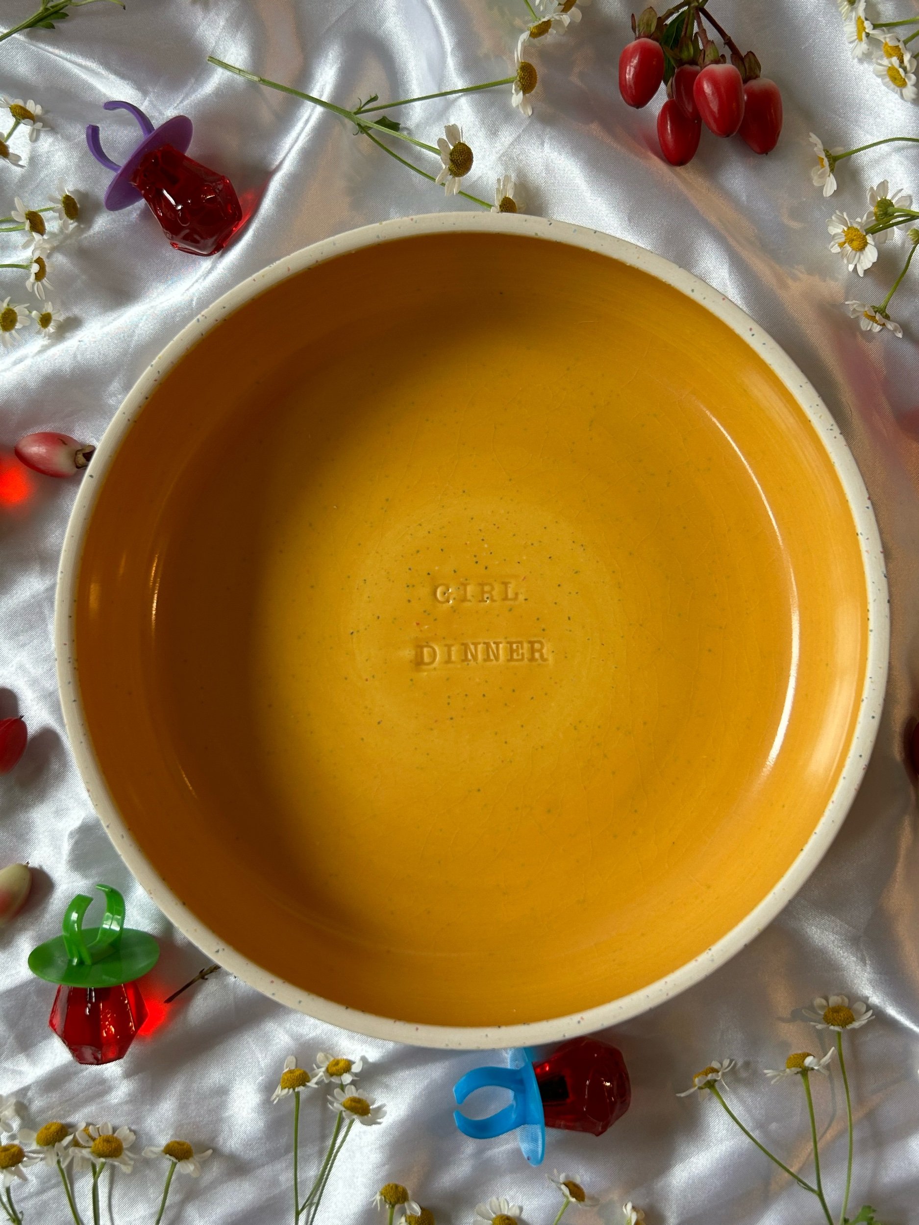 Large blate (kind of a bowl, kind of a plate) made with rainbow speckled clay with stamped lettering that reads “GIRL DINNER“ Glazed in a marigold yellow.