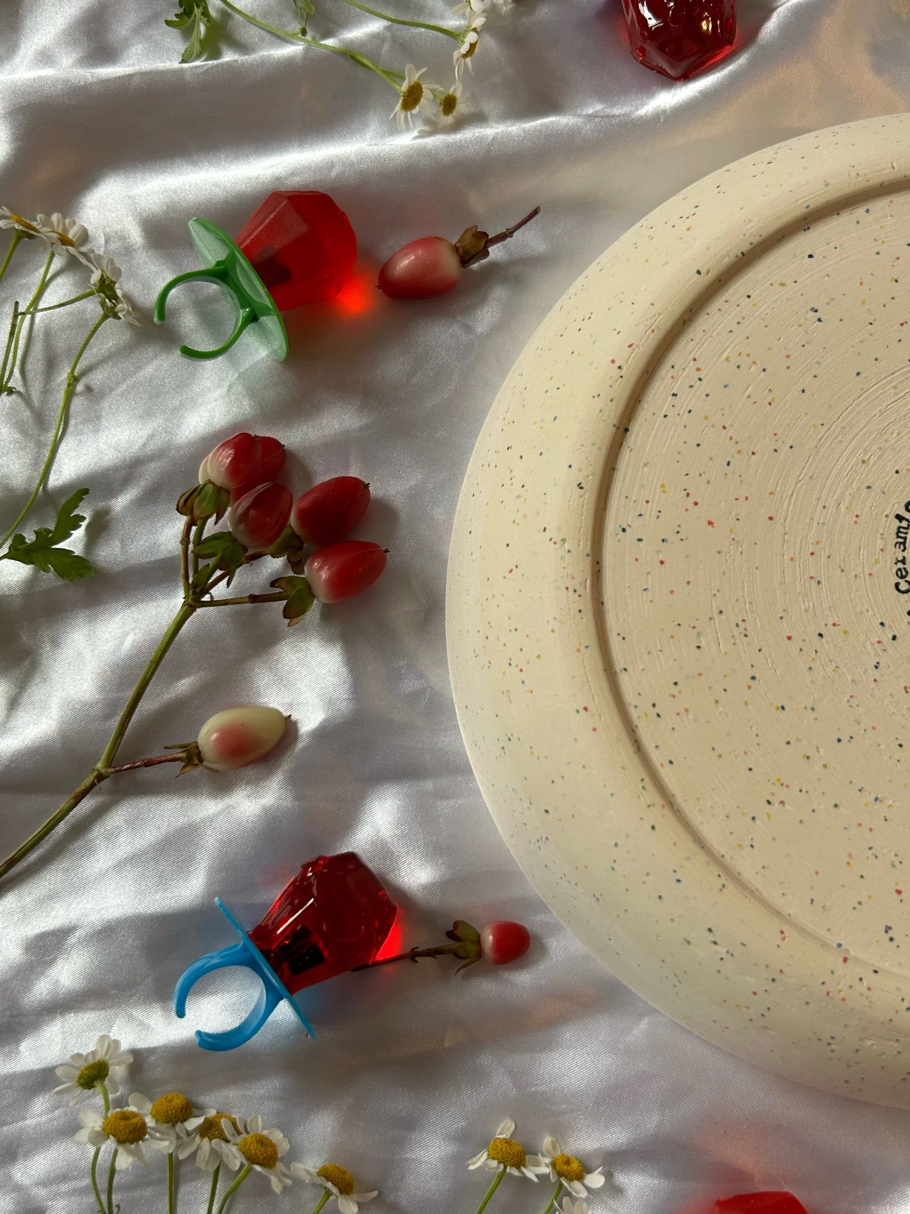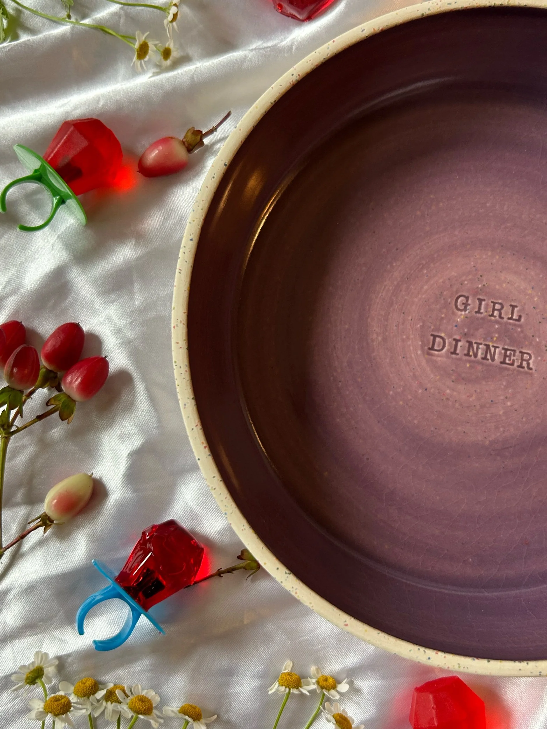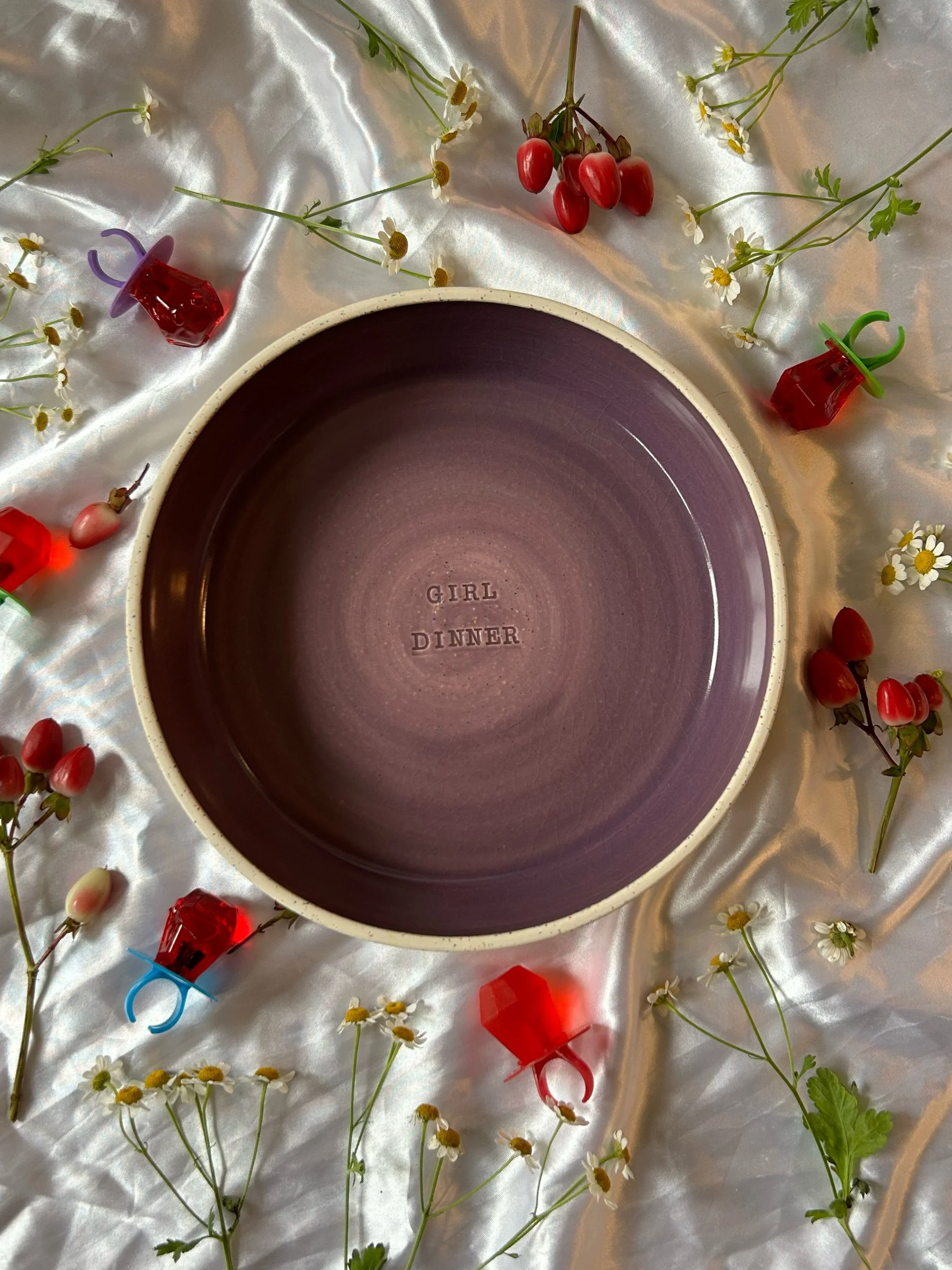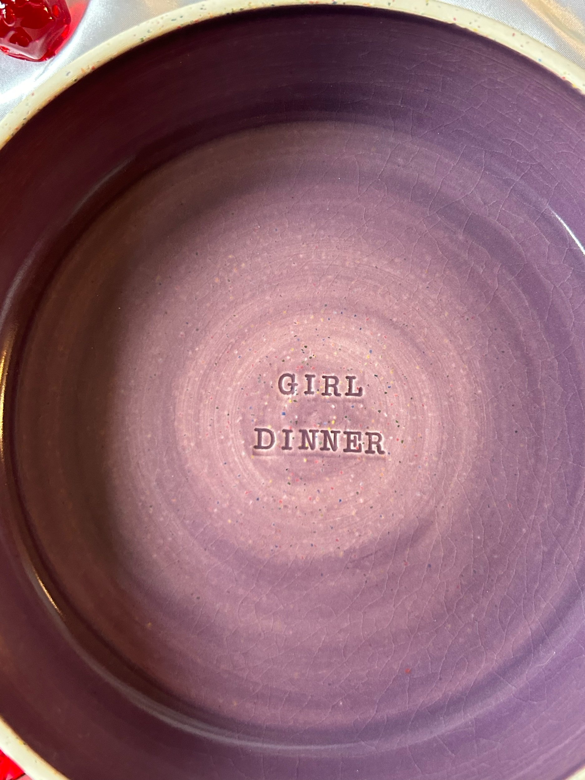 Large blate (kind of a bowl, kind of a plate) made with rainbow speckled clay with stamped lettering that reads “GIRL DINNER“ Glazed in a deep lavender.