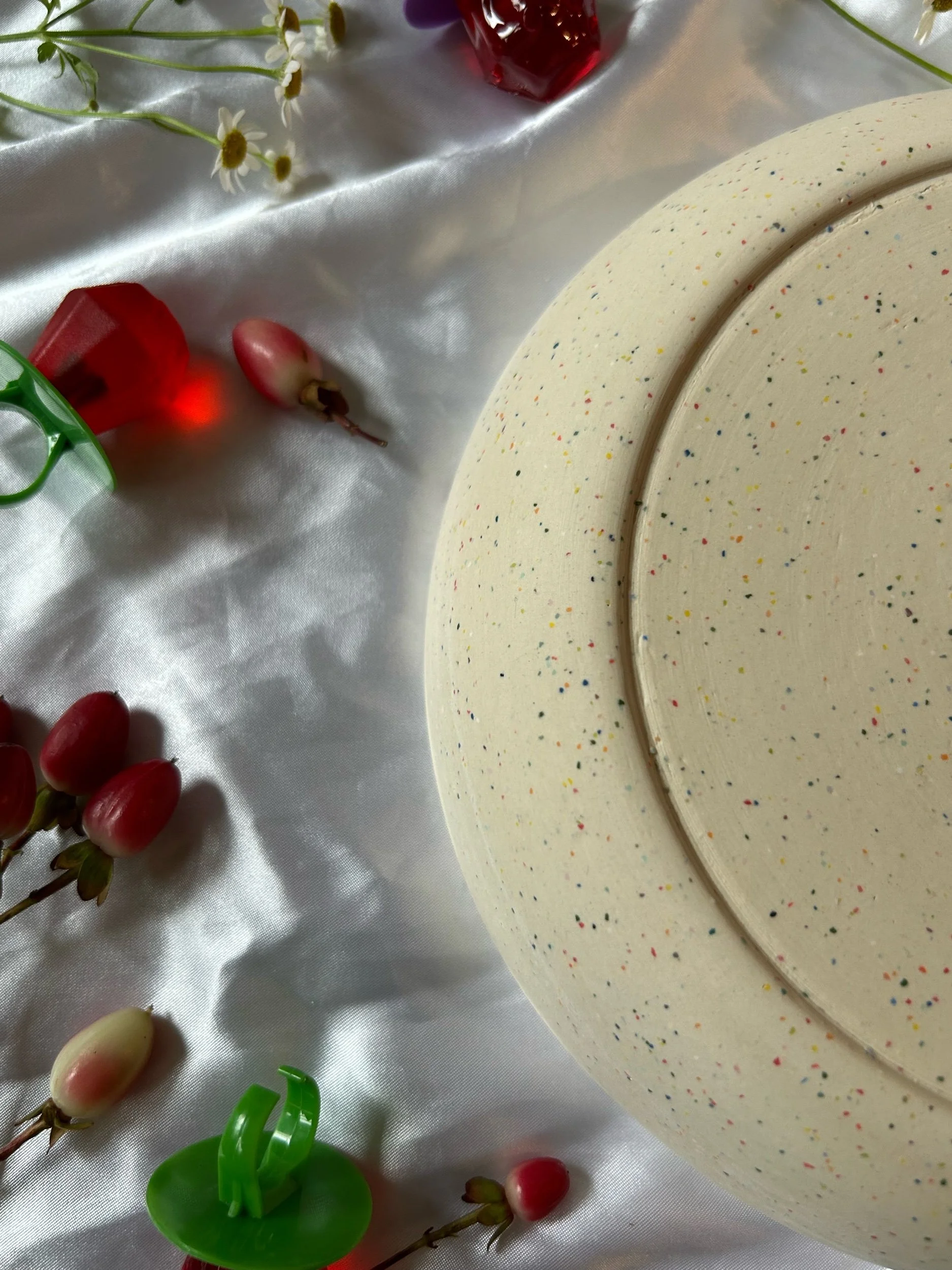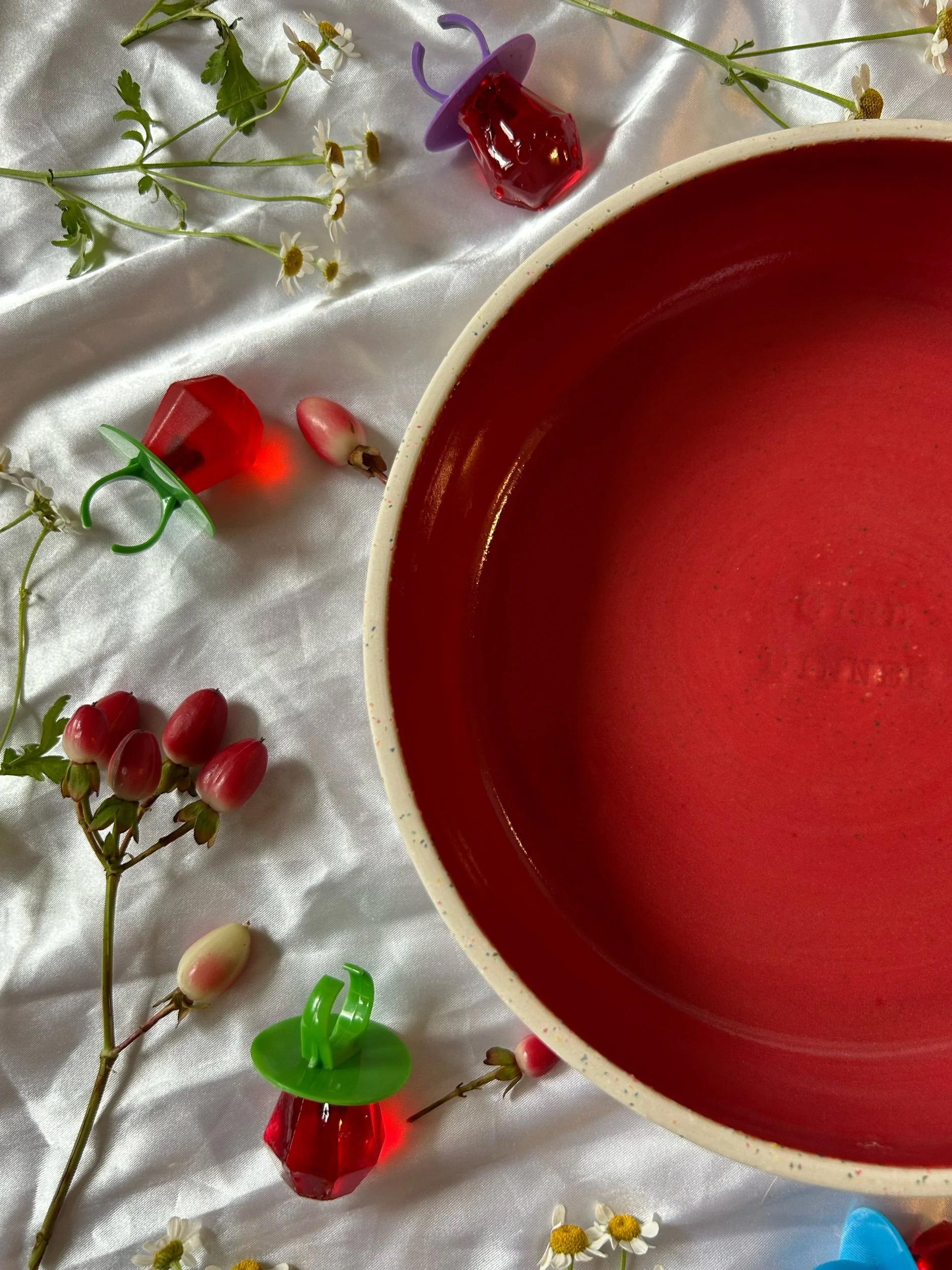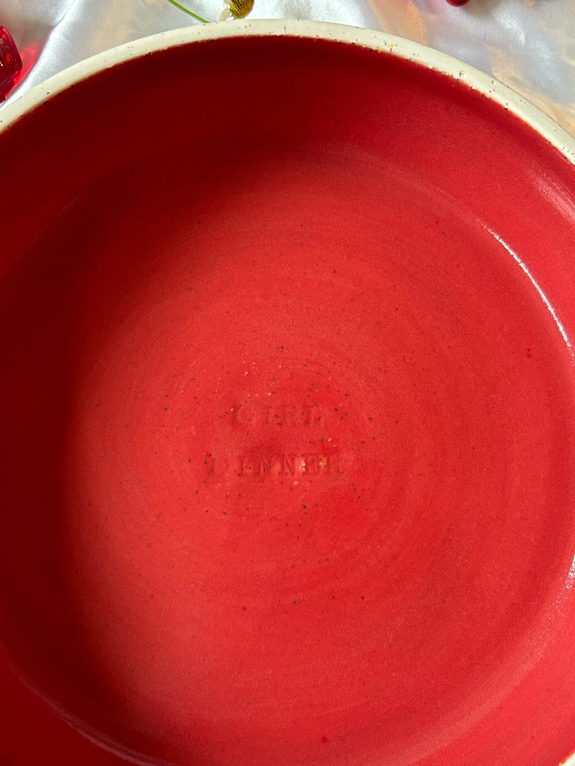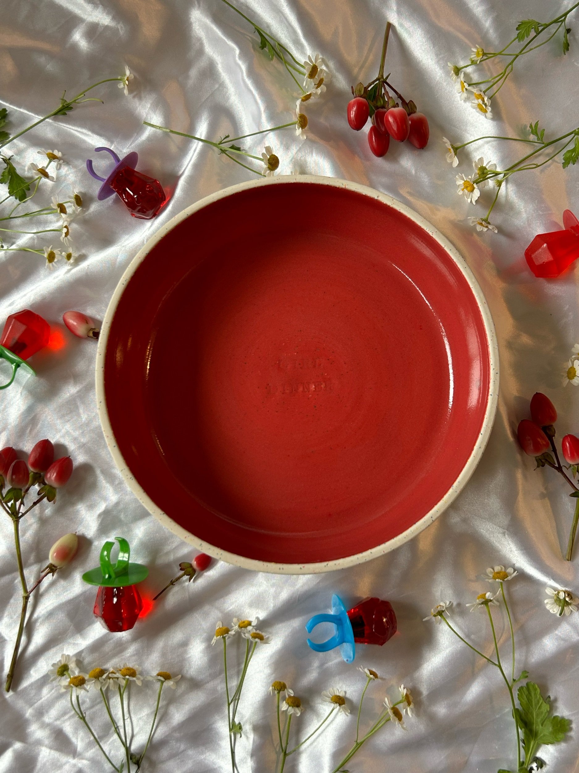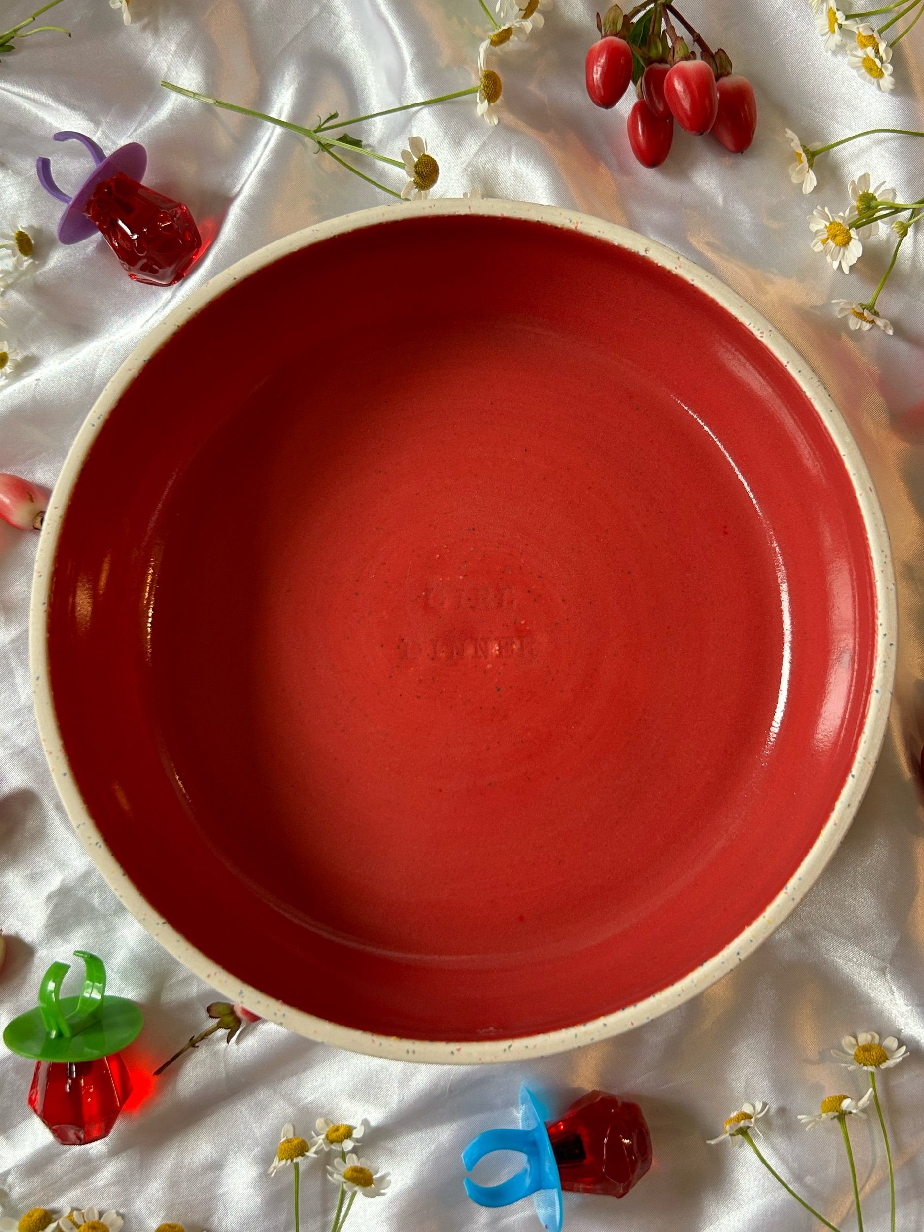 Large blate (kind of a bowl, kind of a plate) made with rainbow speckled clay with stamped lettering that reads “GIRL DINNER“ Glazed in a deep crimson.