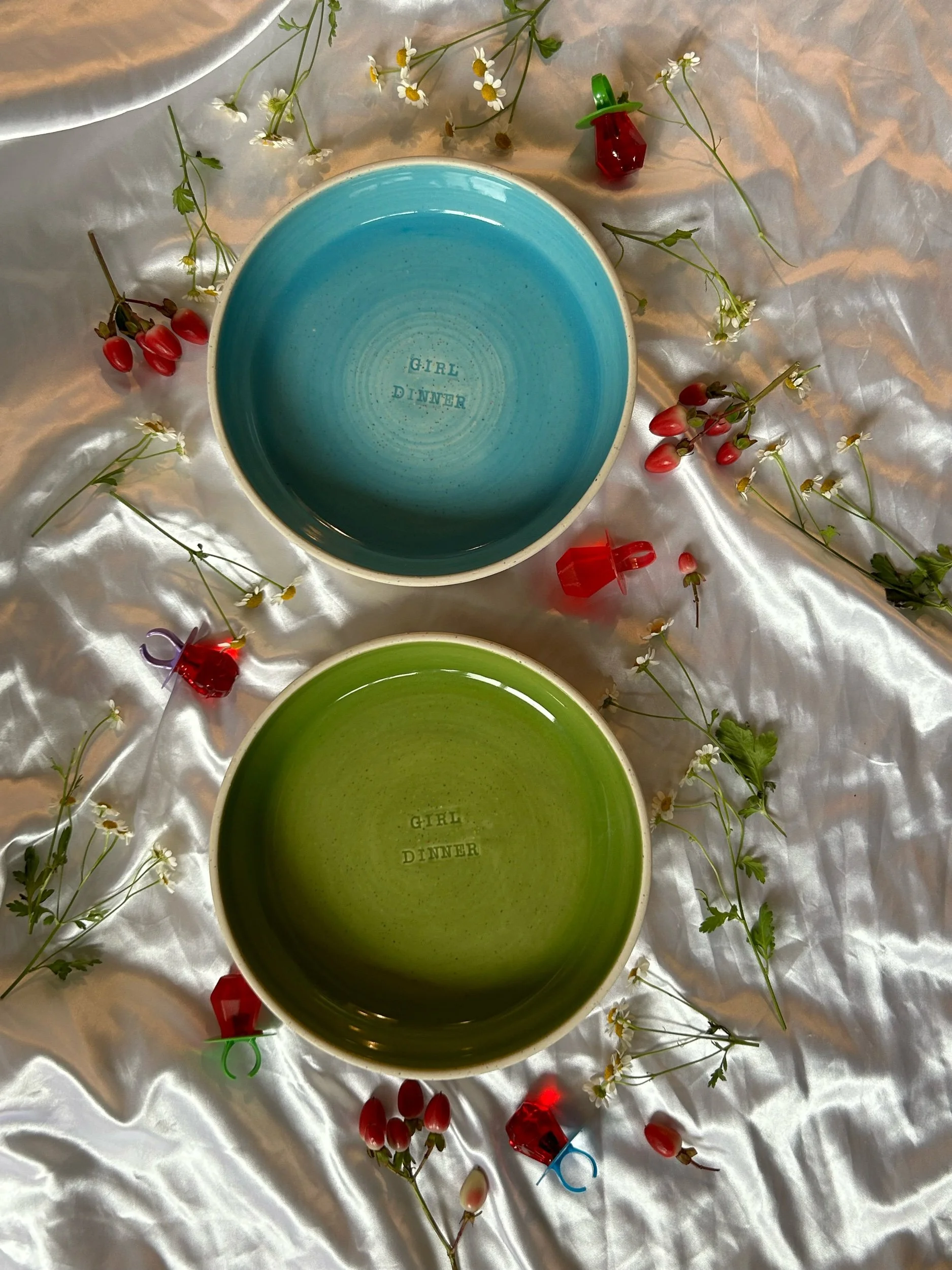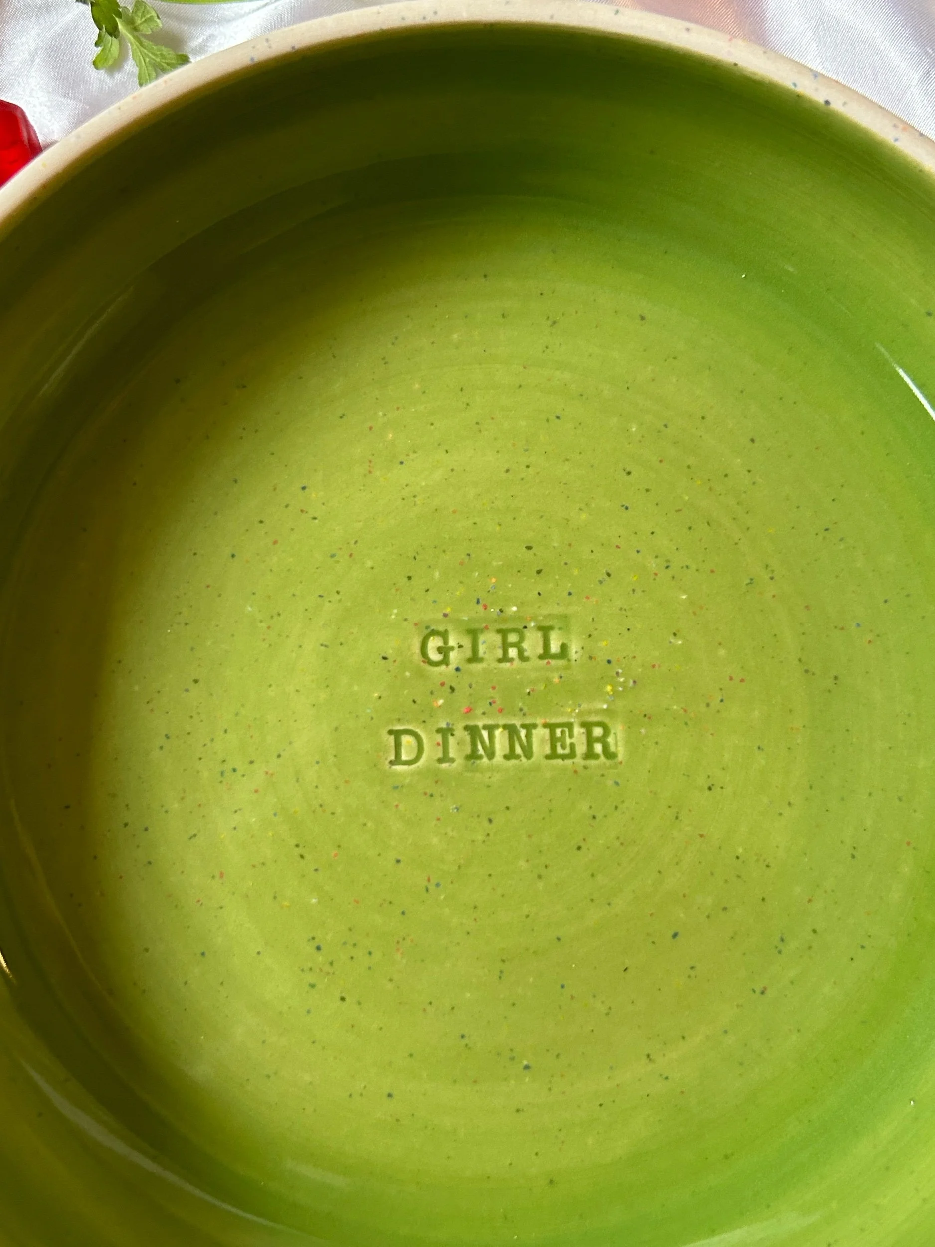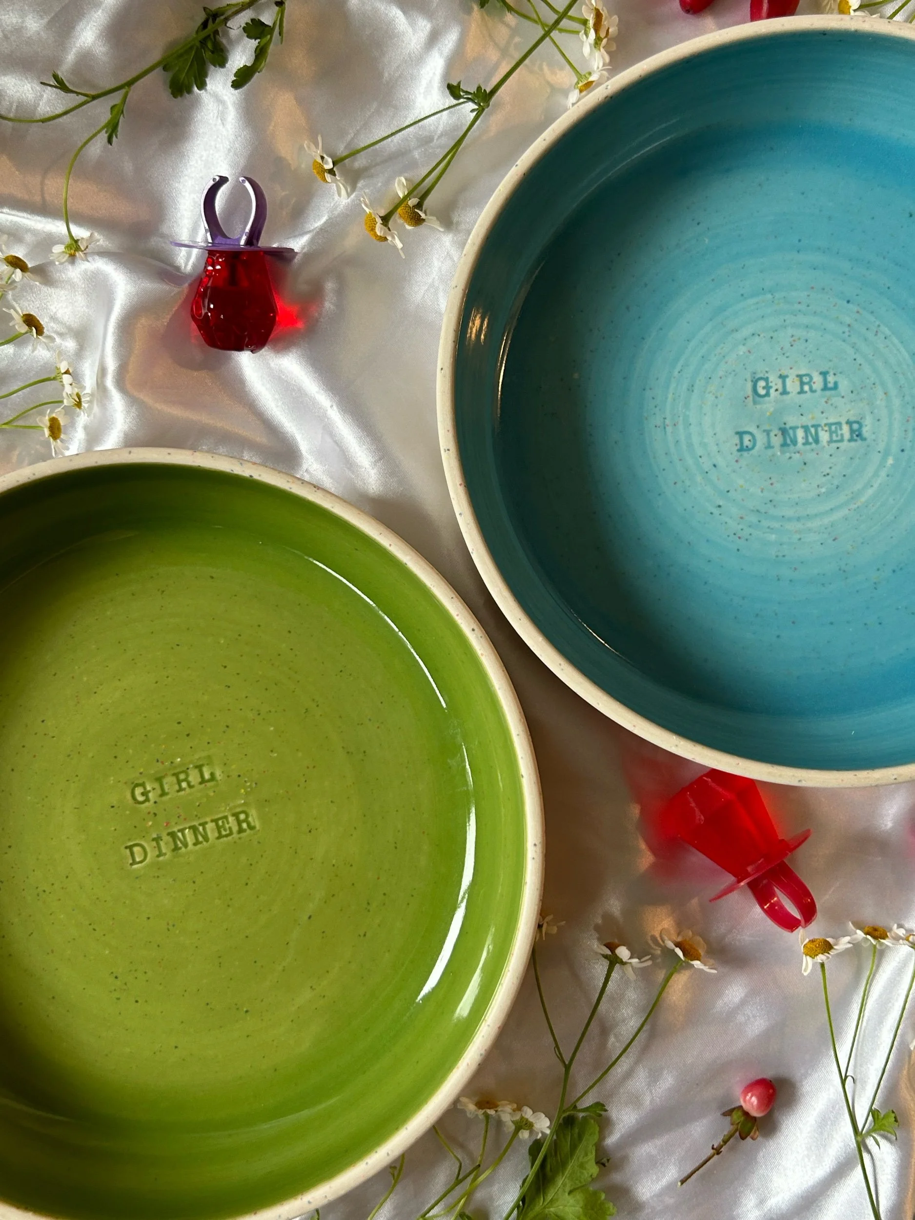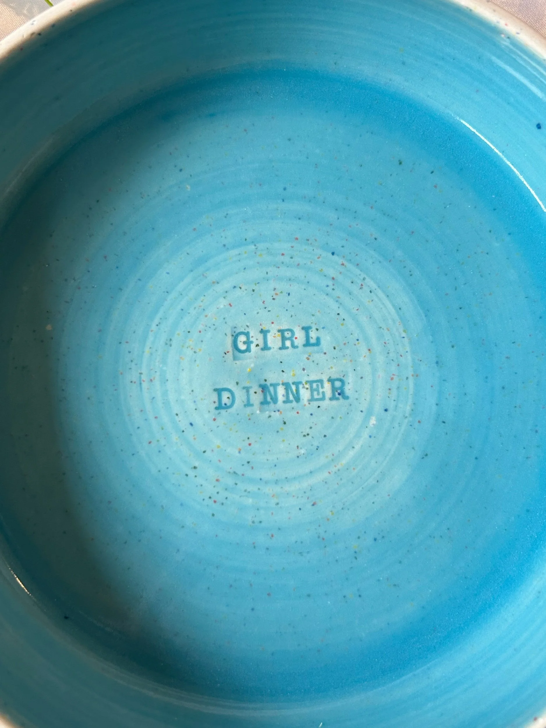Set of two large blates (kind of a bowl, kind of a plate) made with rainbow speckled clay with stamped lettering that reads “GIRL DINNER”