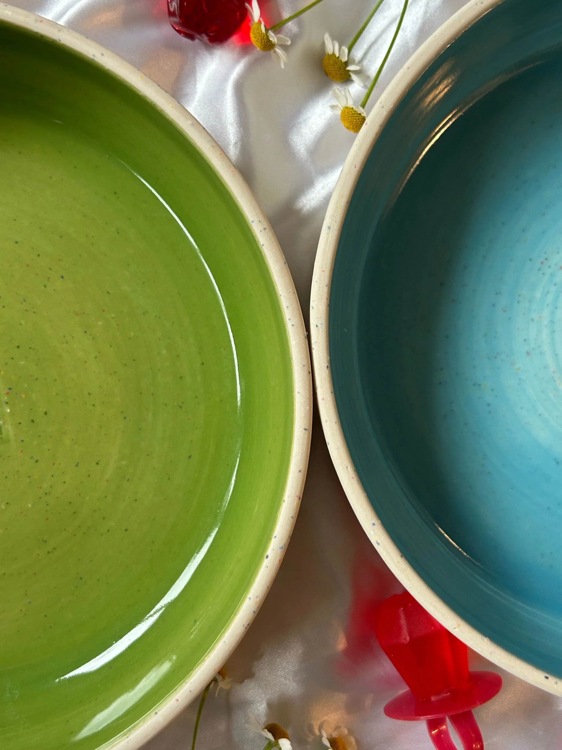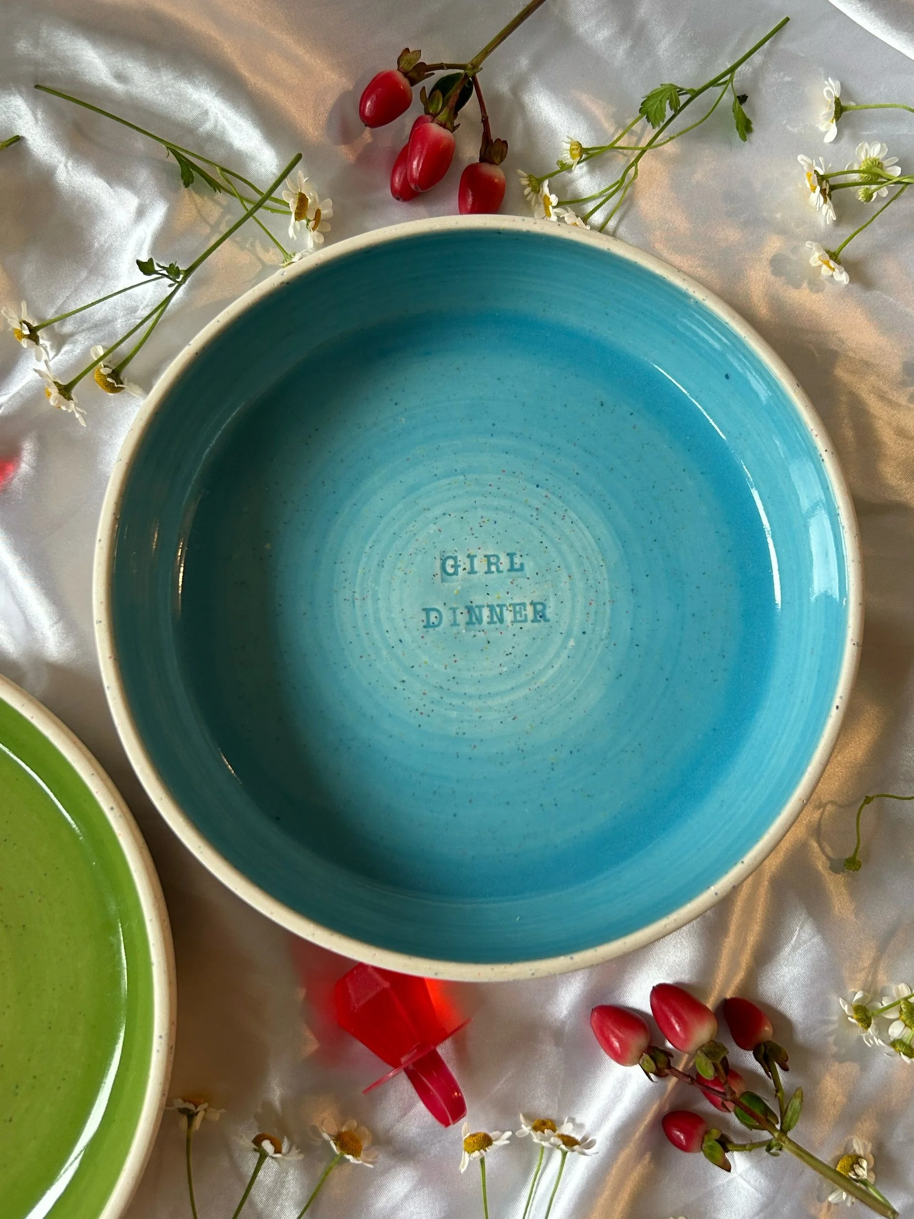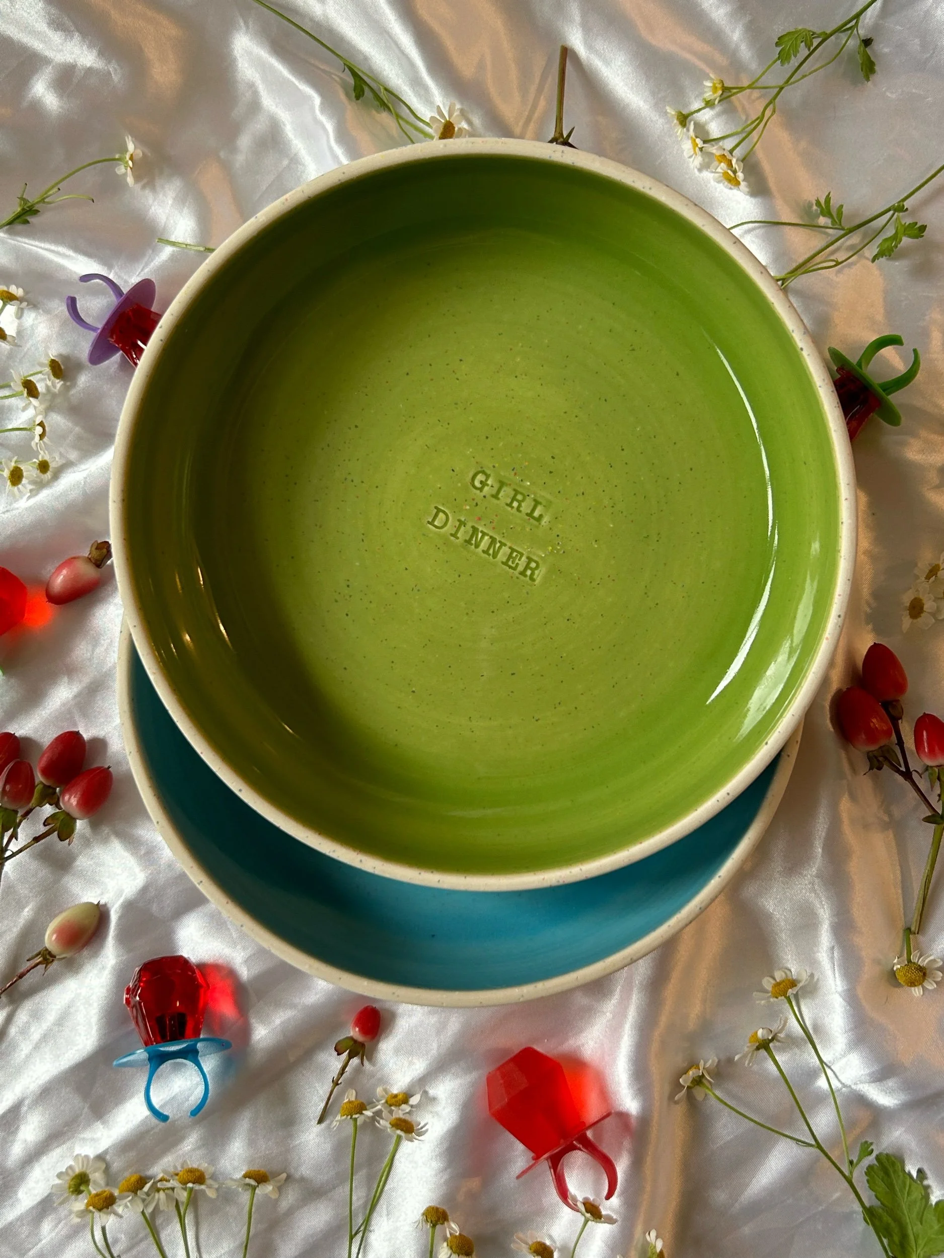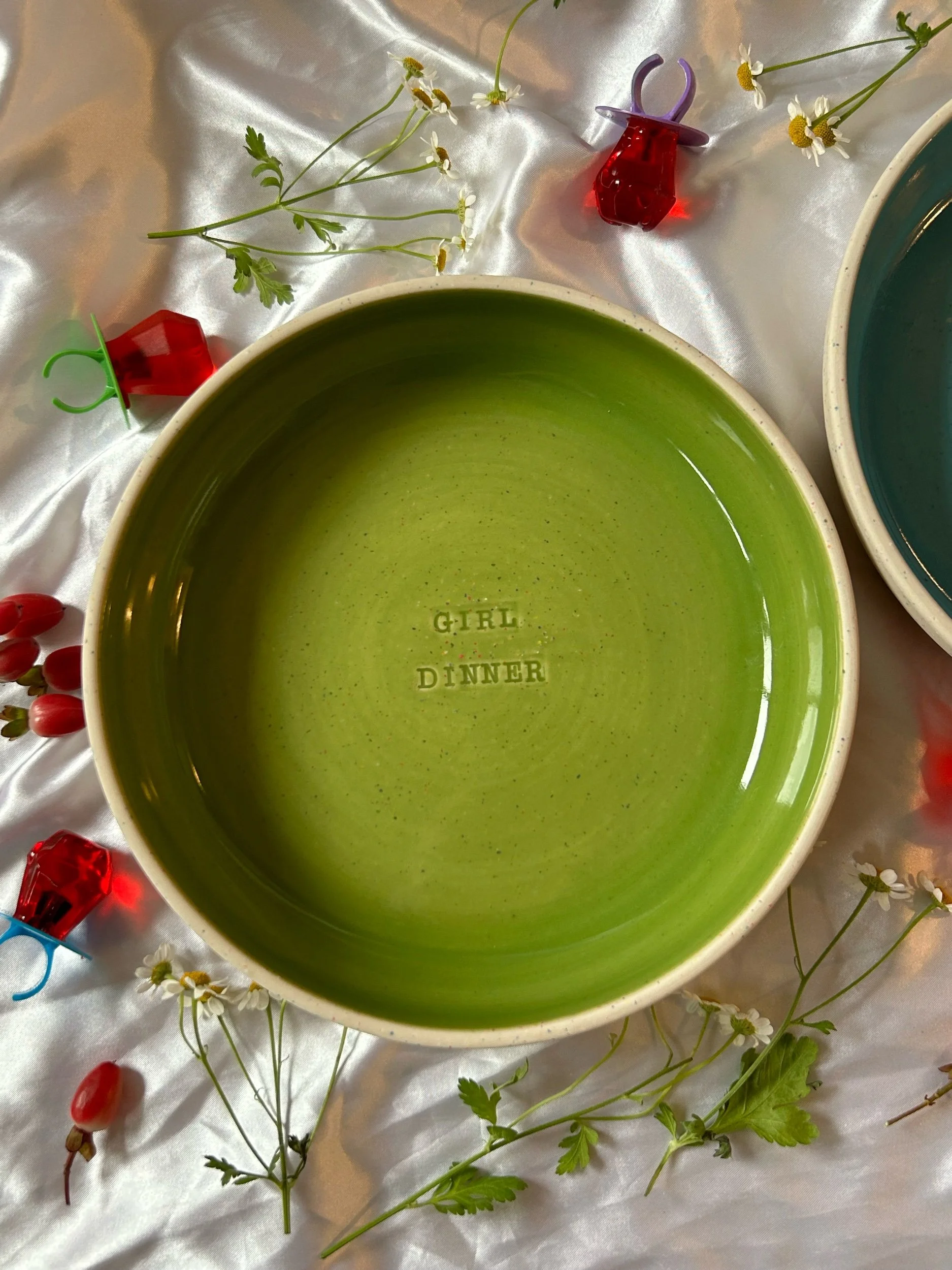 Set of two large blates (kind of a bowl, kind of a plate) made with rainbow speckled clay with stamped lettering that reads “GIRL DINNER”