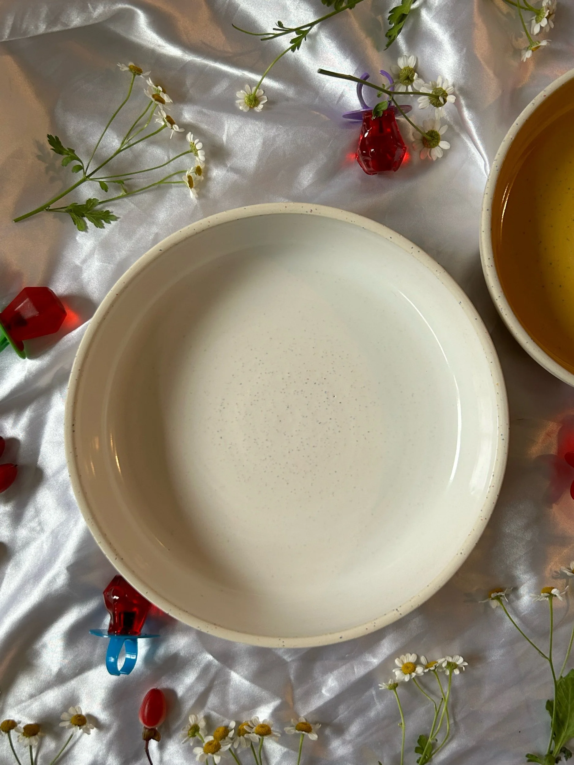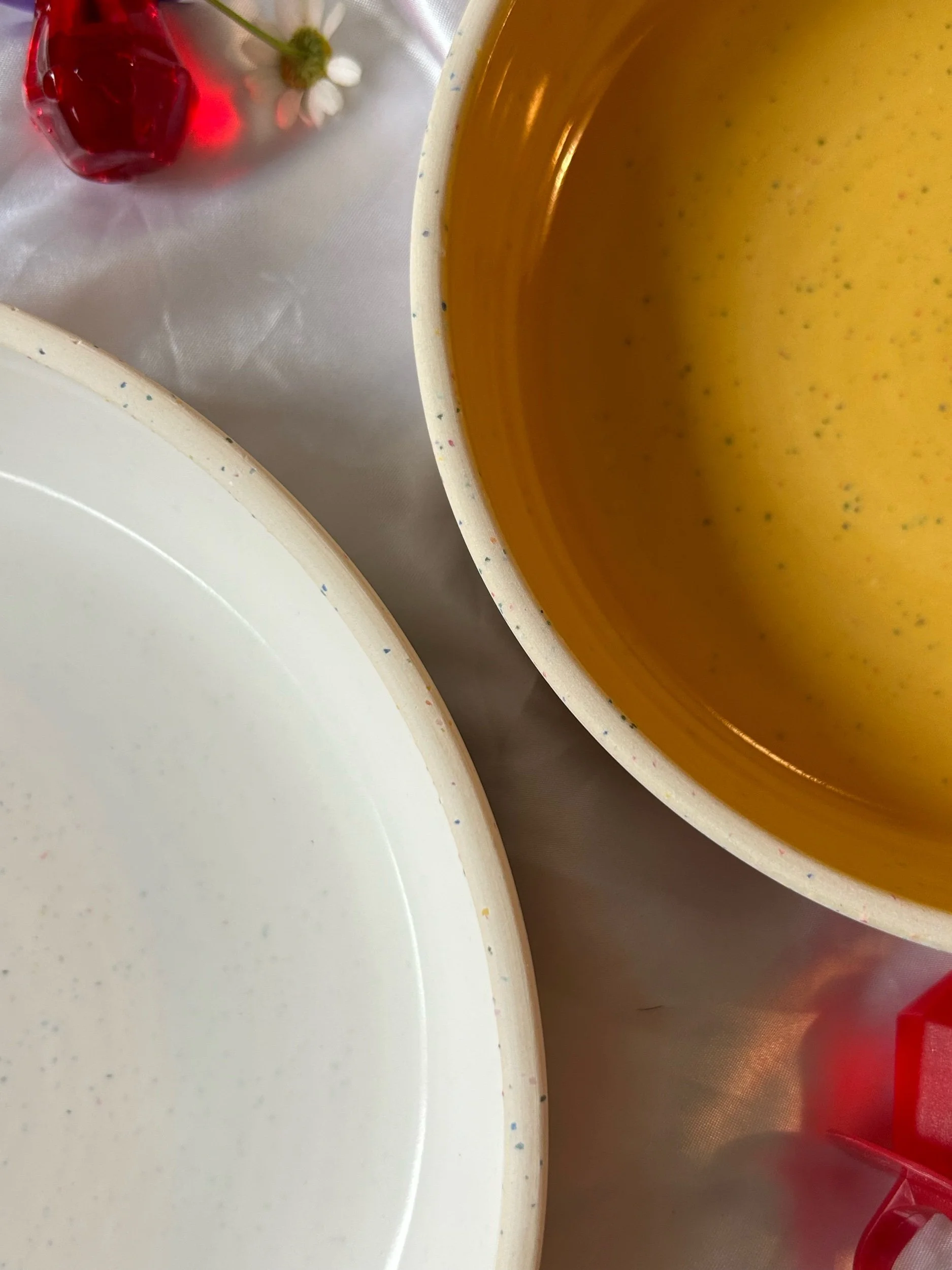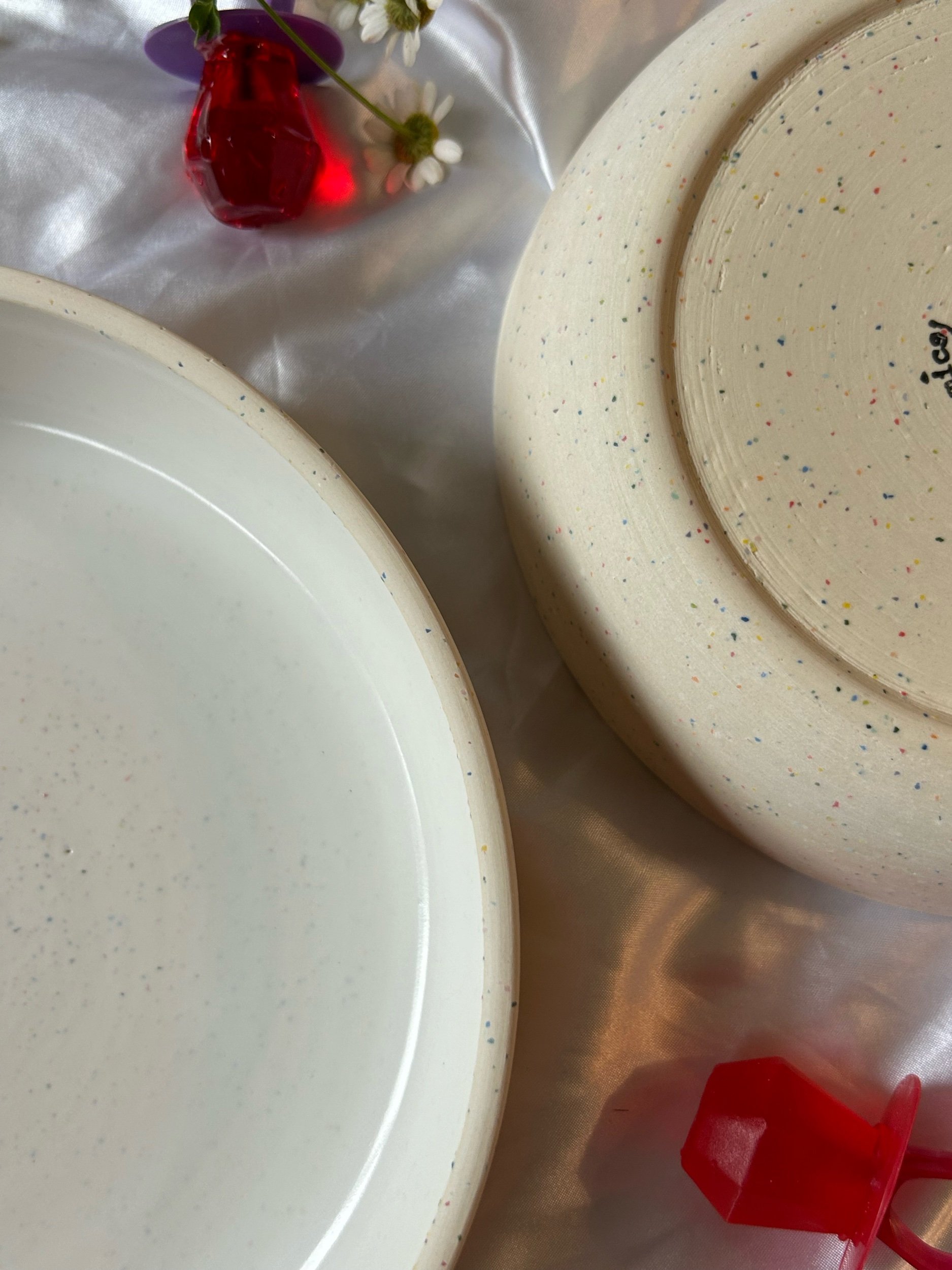 Set of two blates (kind of a bowl, kind of a plate) one large and one small, made with rainbow speckled clay.