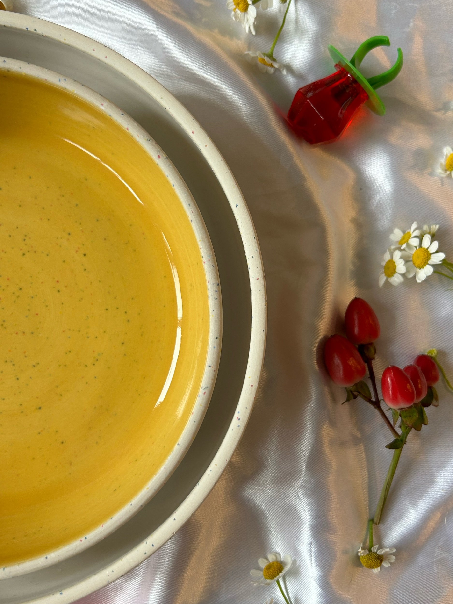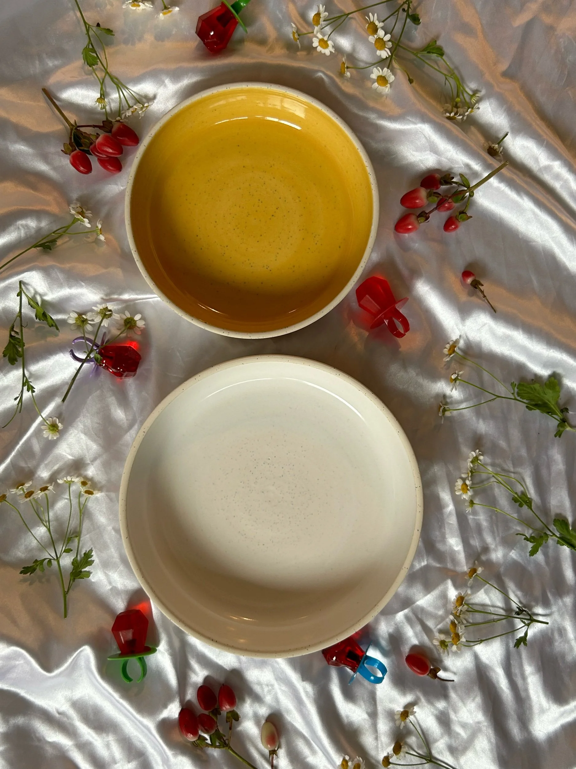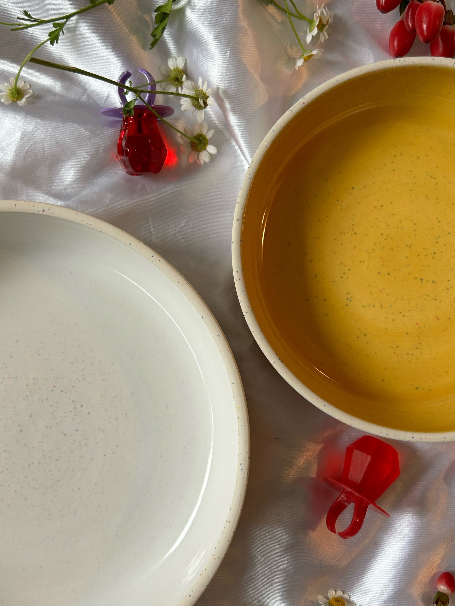 Set of two blates (kind of a bowl, kind of a plate) one large and one small, made with rainbow speckled clay.