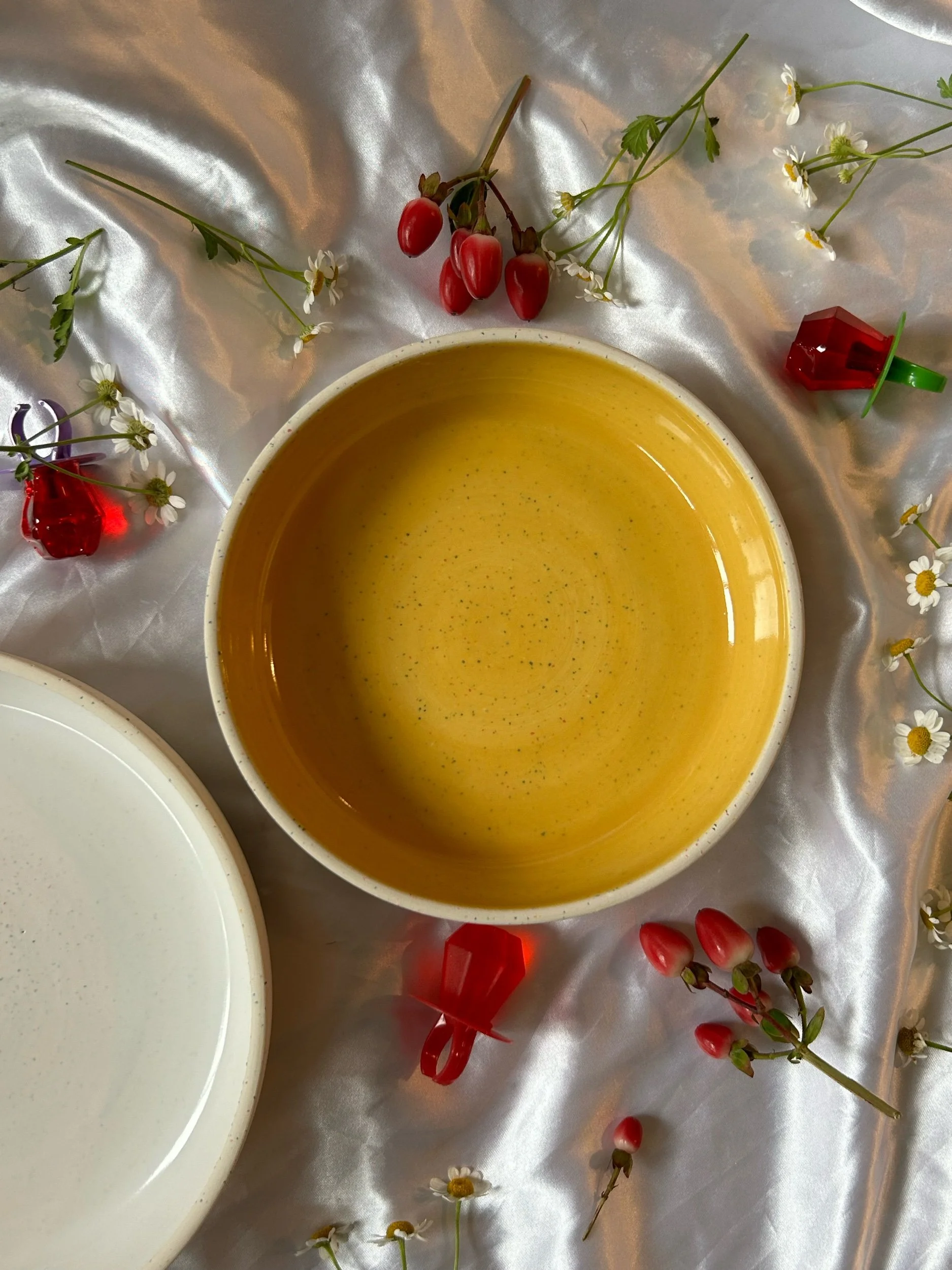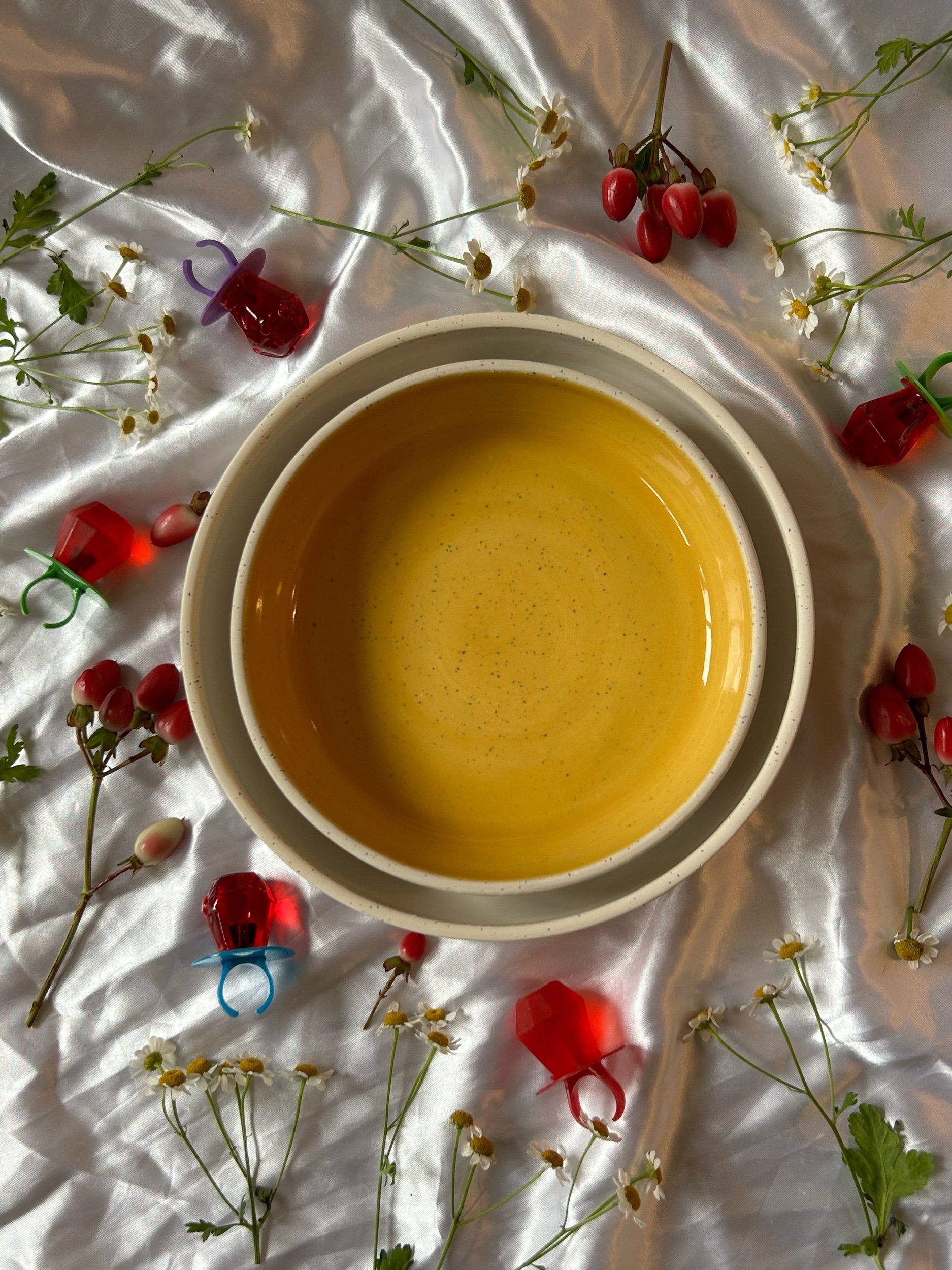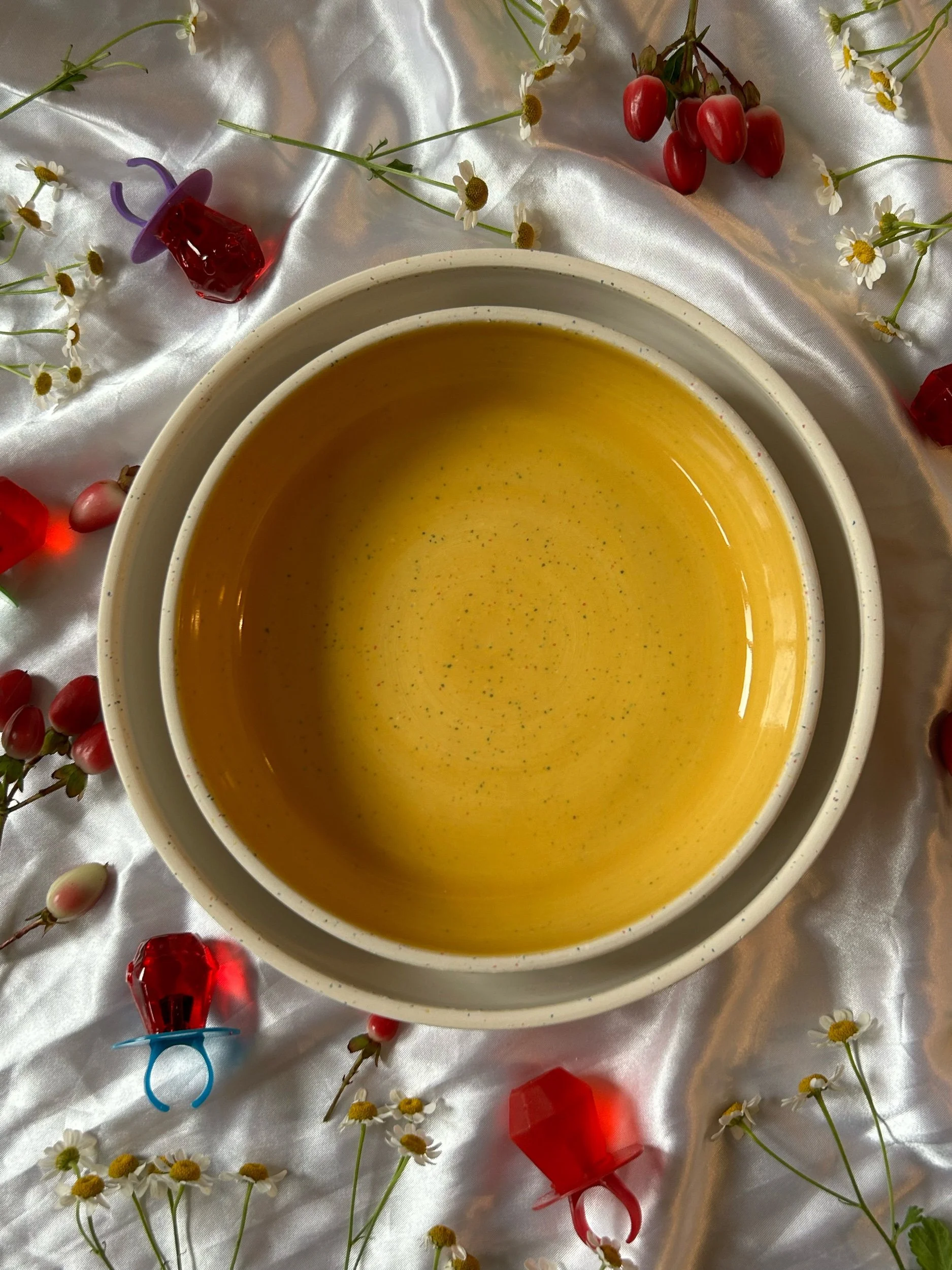 The large is glazed in a soft white and the small in marigold yellow. Stacked together they look like a perfect fried egg!