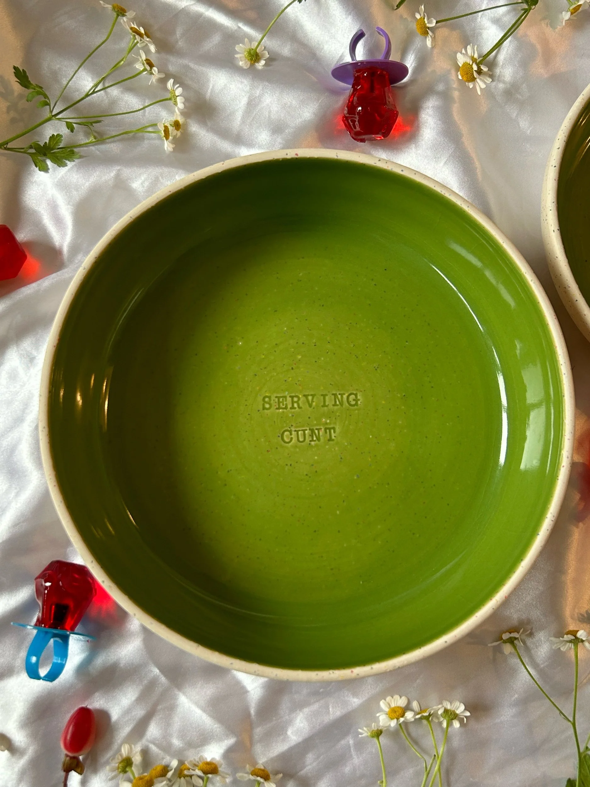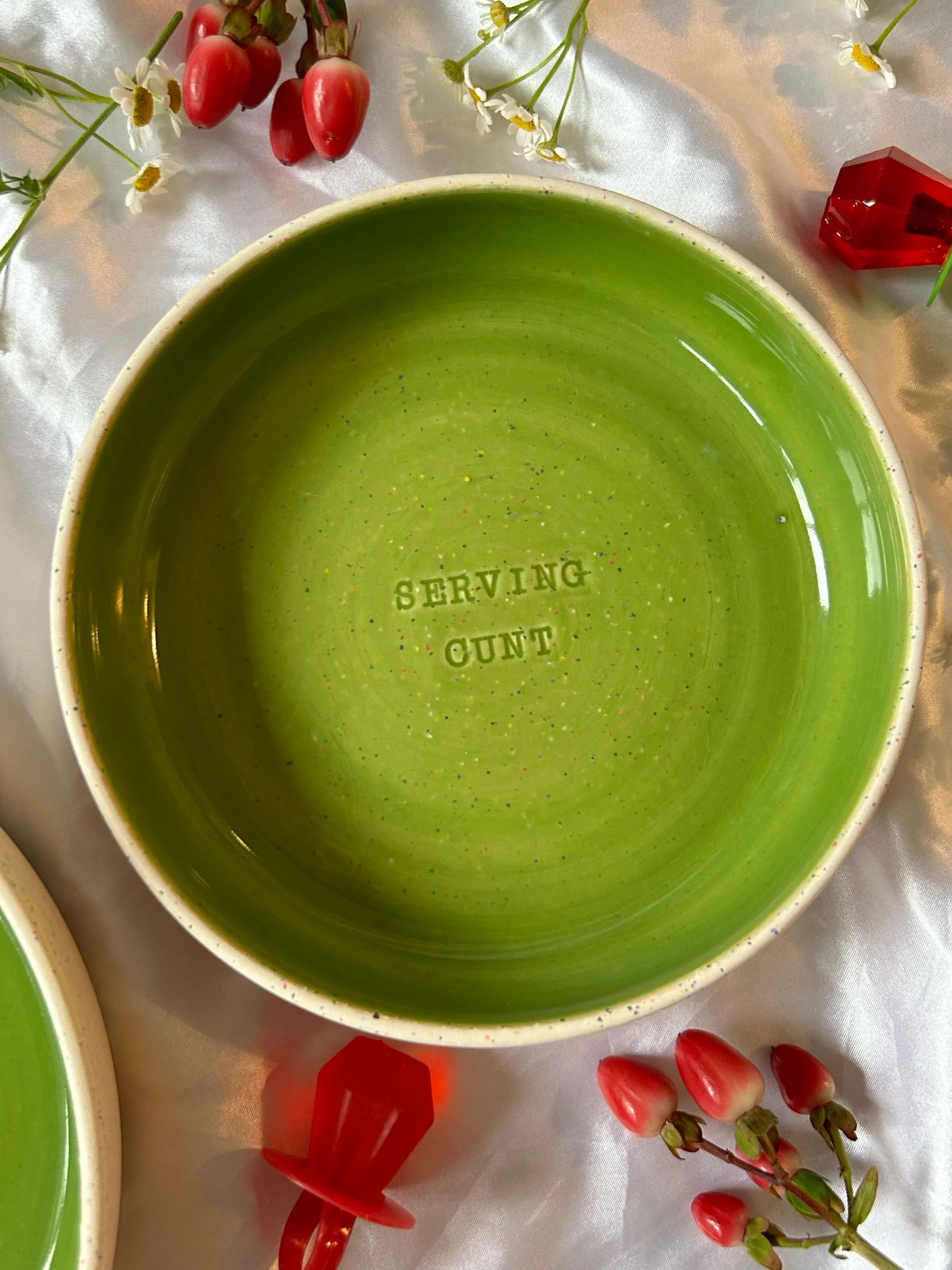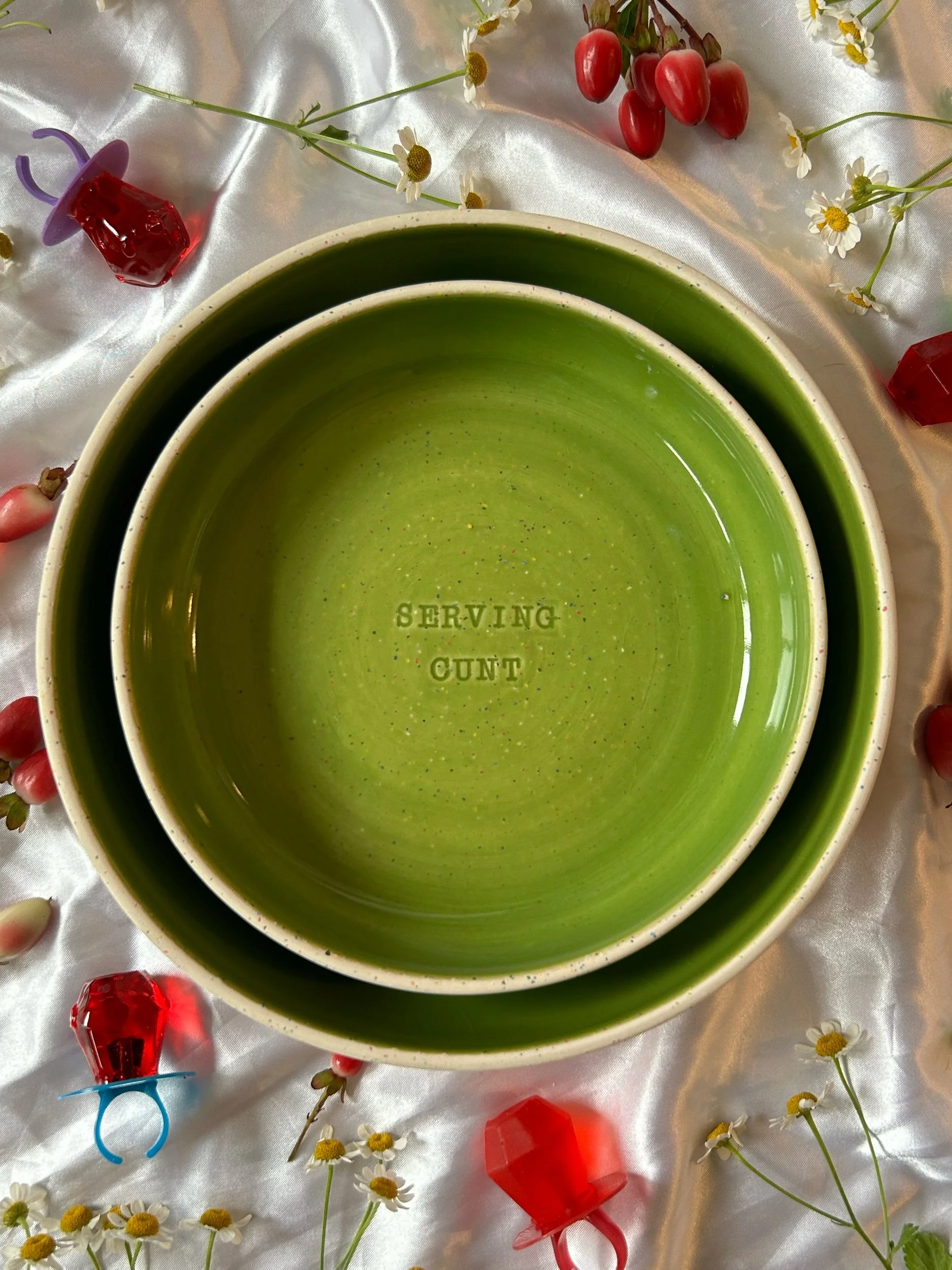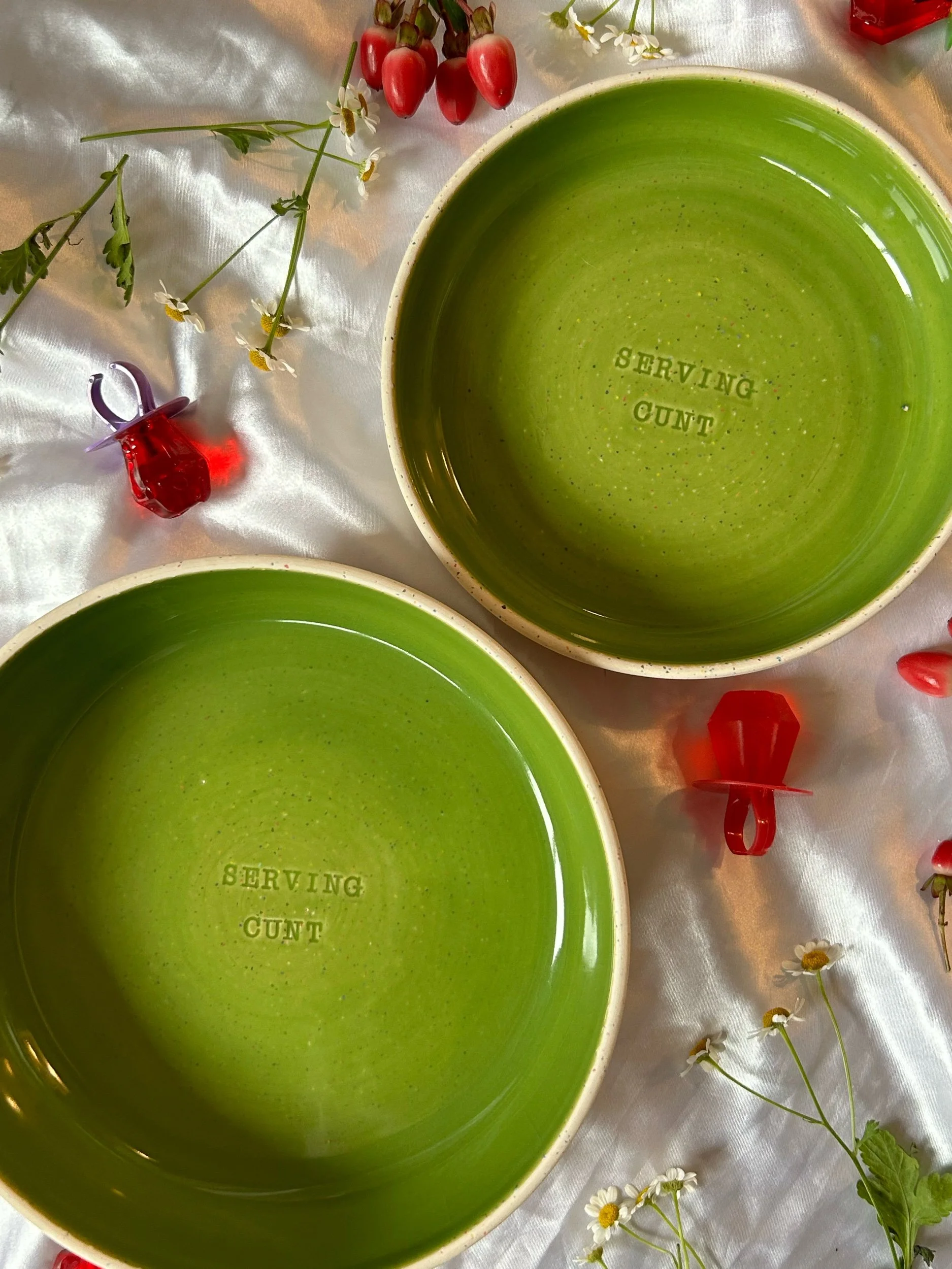 Set of two blates (kind of a bowl, kind of a plate) one small and one large, made with rainbow speckled clay with stamped lettering that reads “Serving Cunt”
