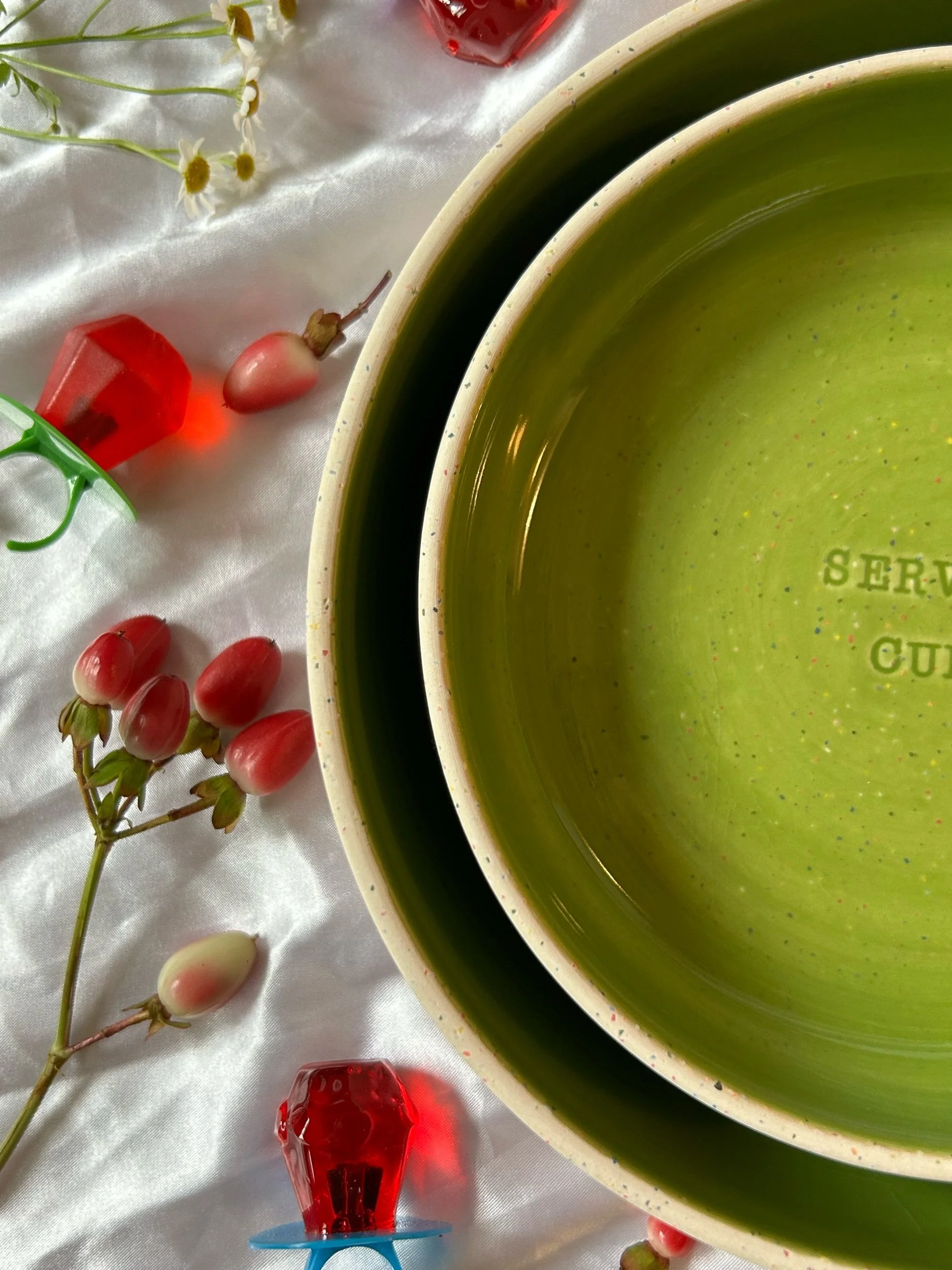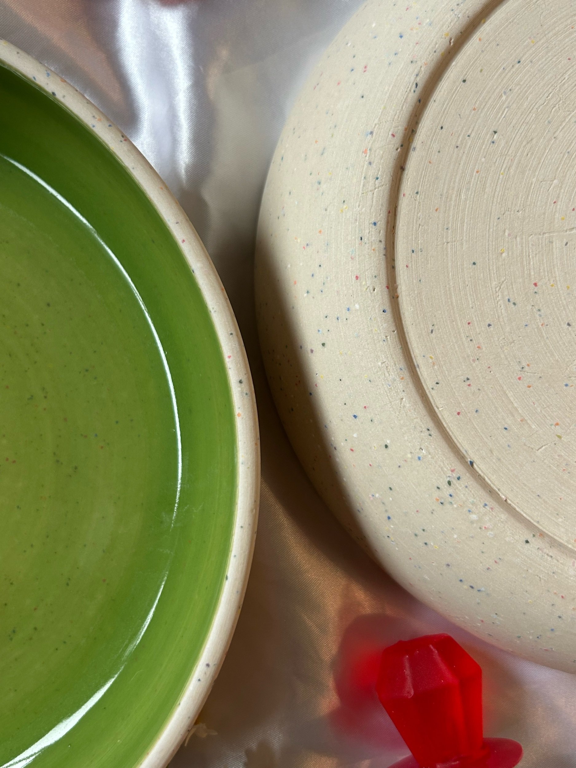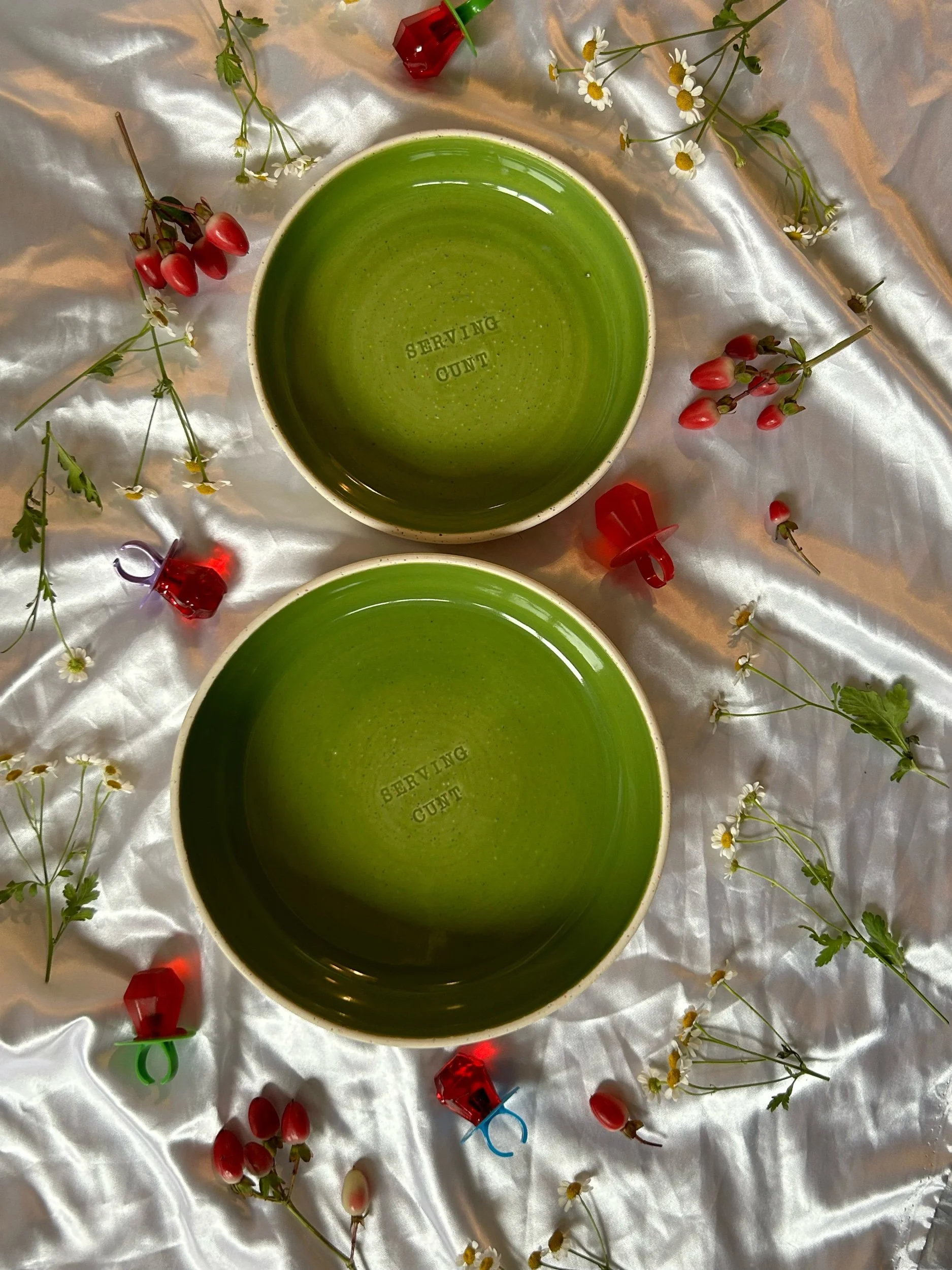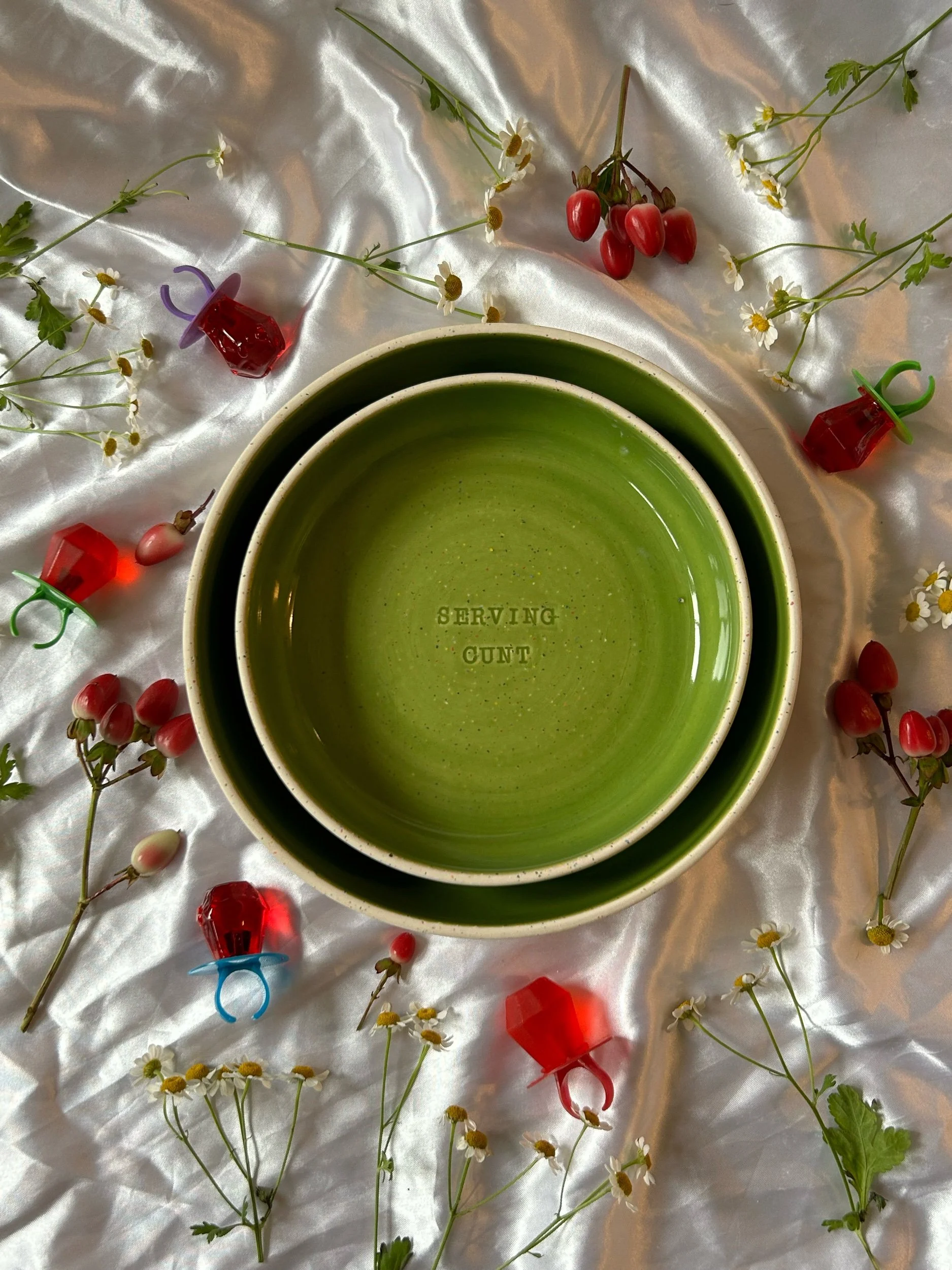 Set of two blates (kind of a bowl, kind of a plate) one small and one large, made with rainbow speckled clay with stamped lettering that reads “Serving Cunt”