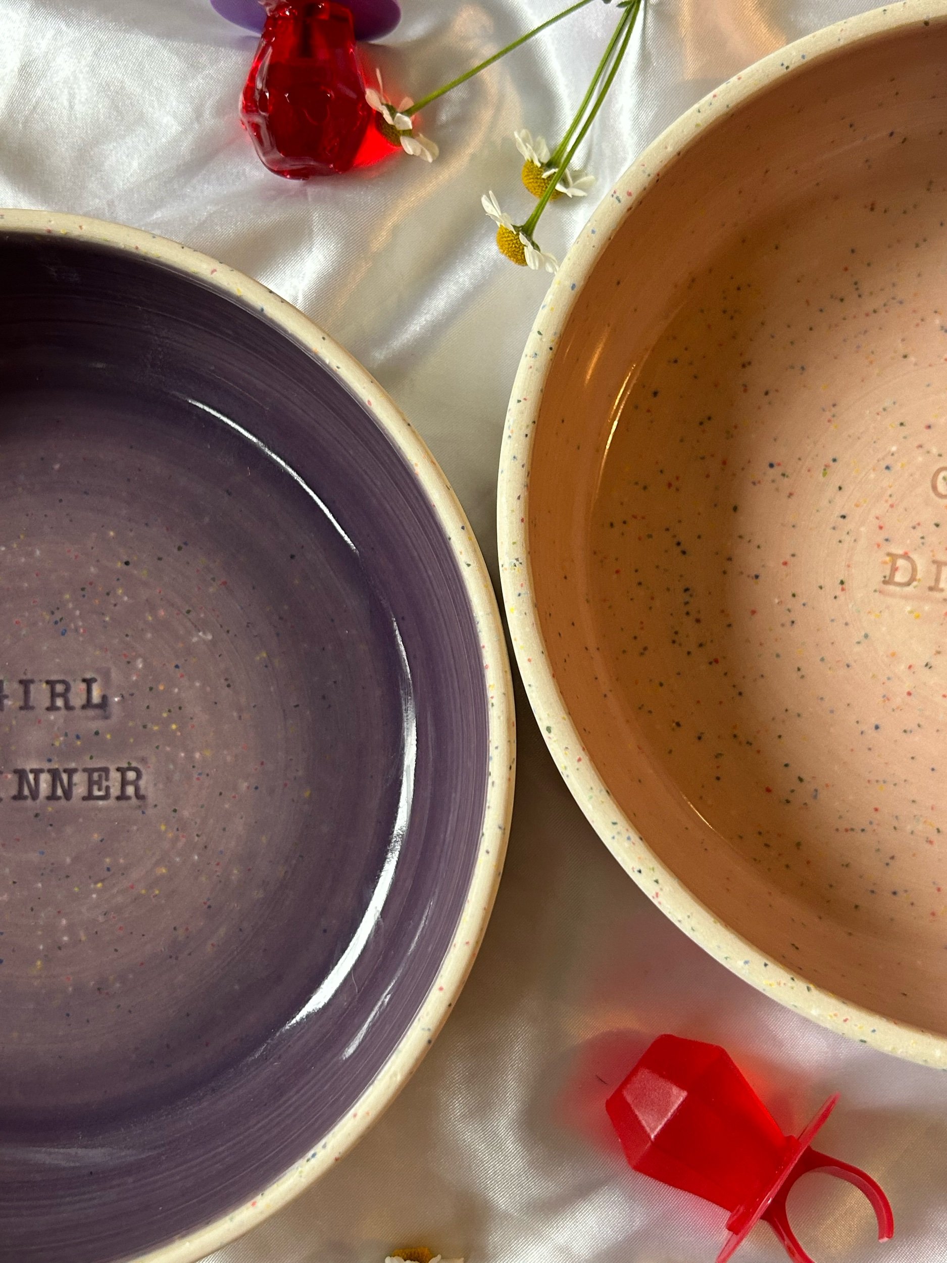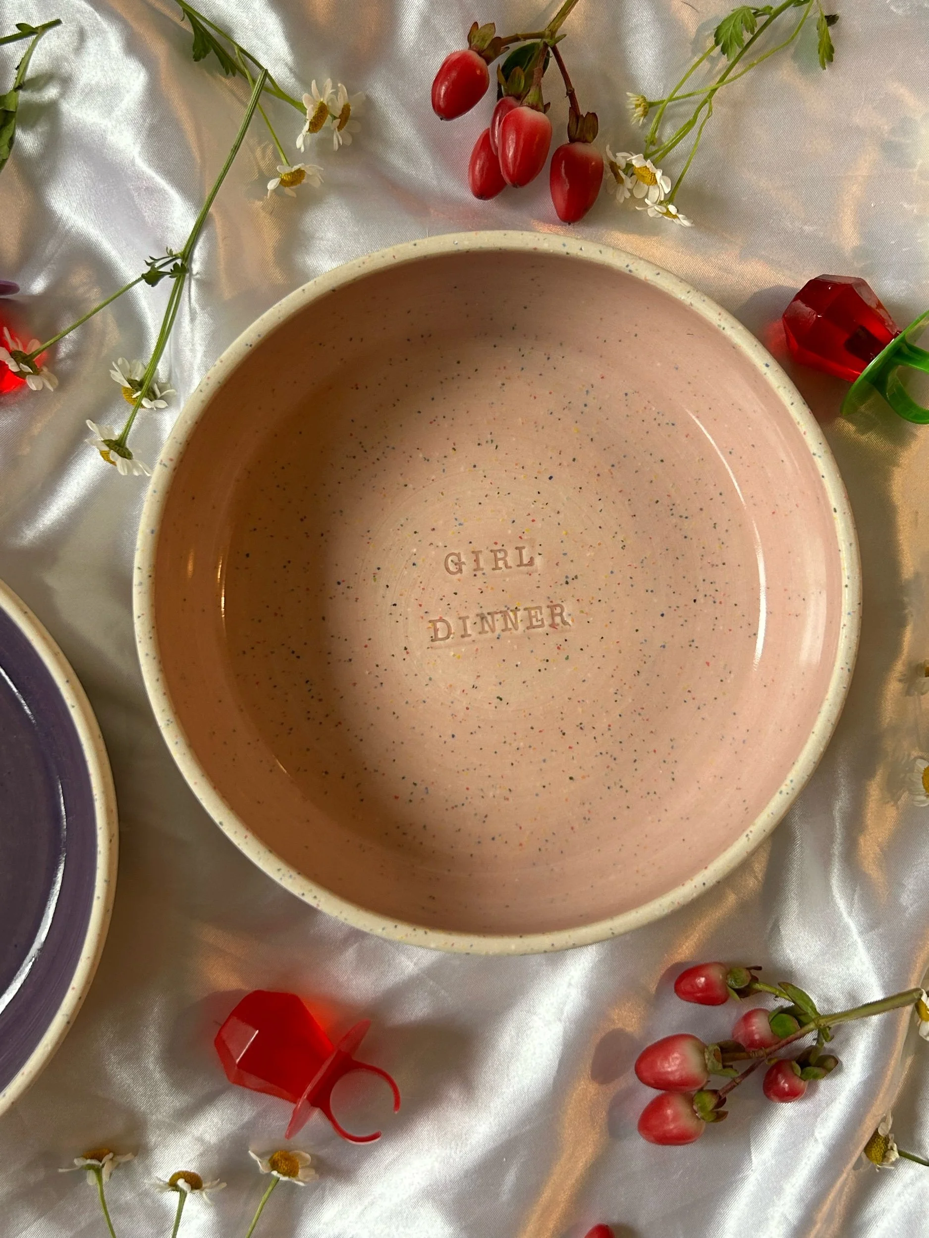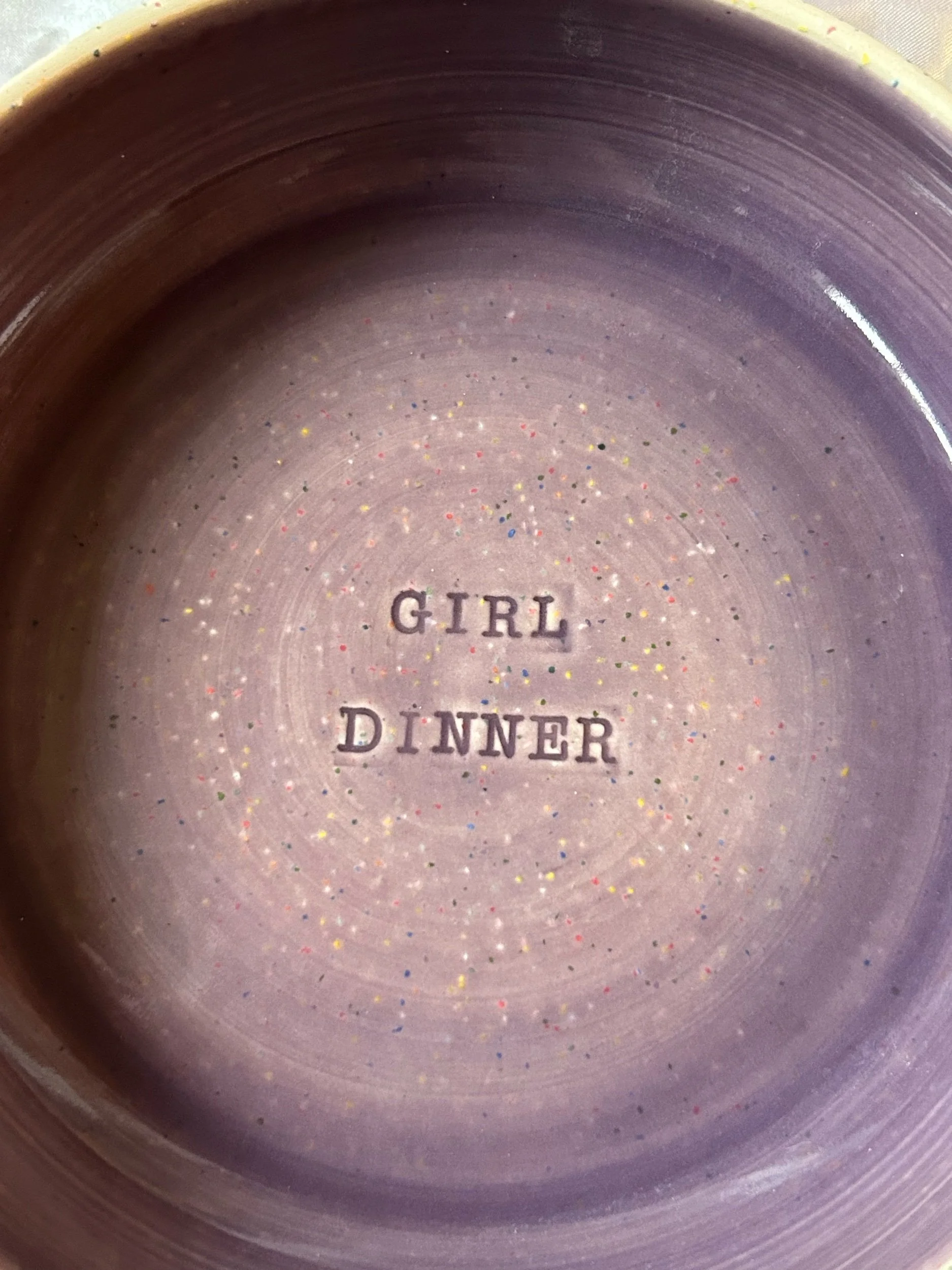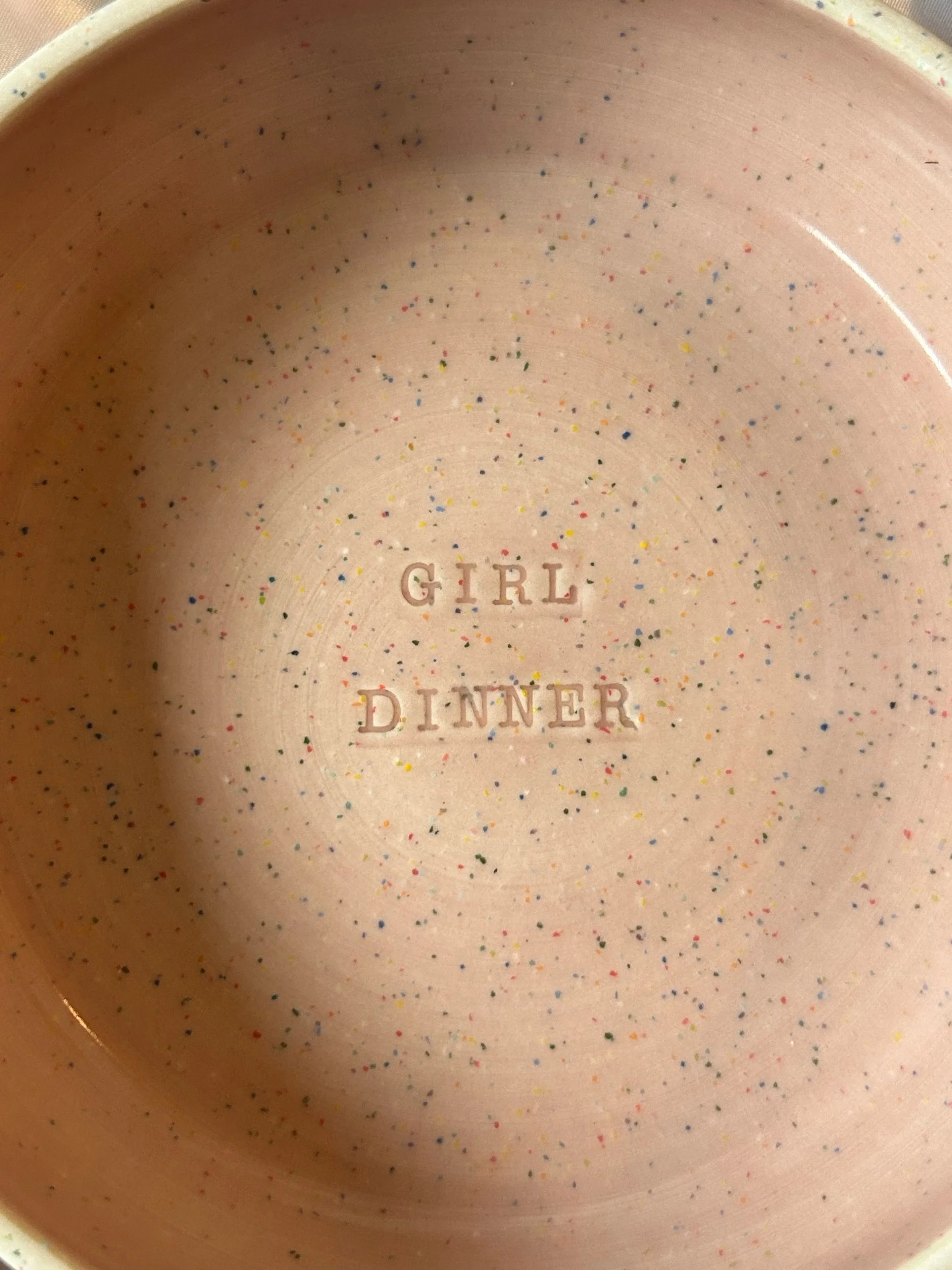 Set of two small blates (kind of a bowl, kind of a plate) made with rainbow speckled clay with stamped lettering that reads “GIRL DINNER“