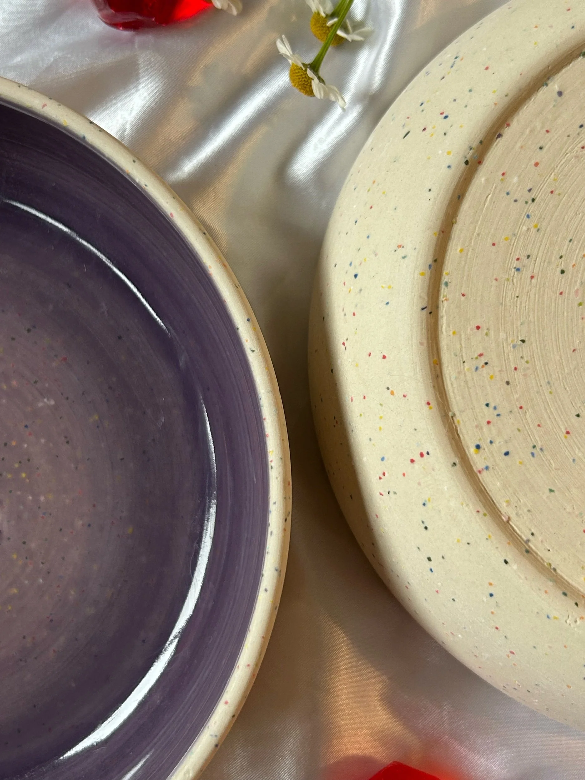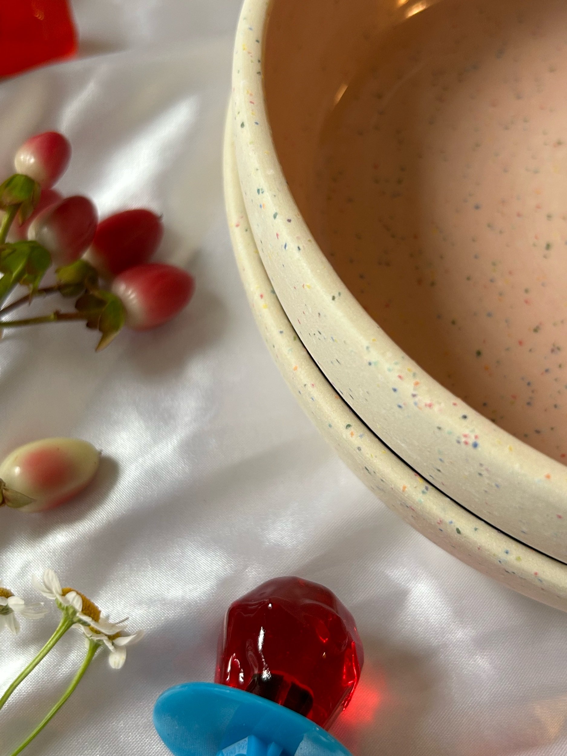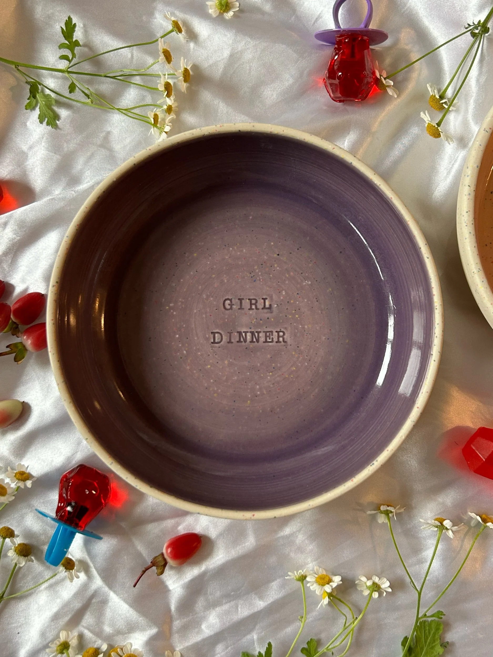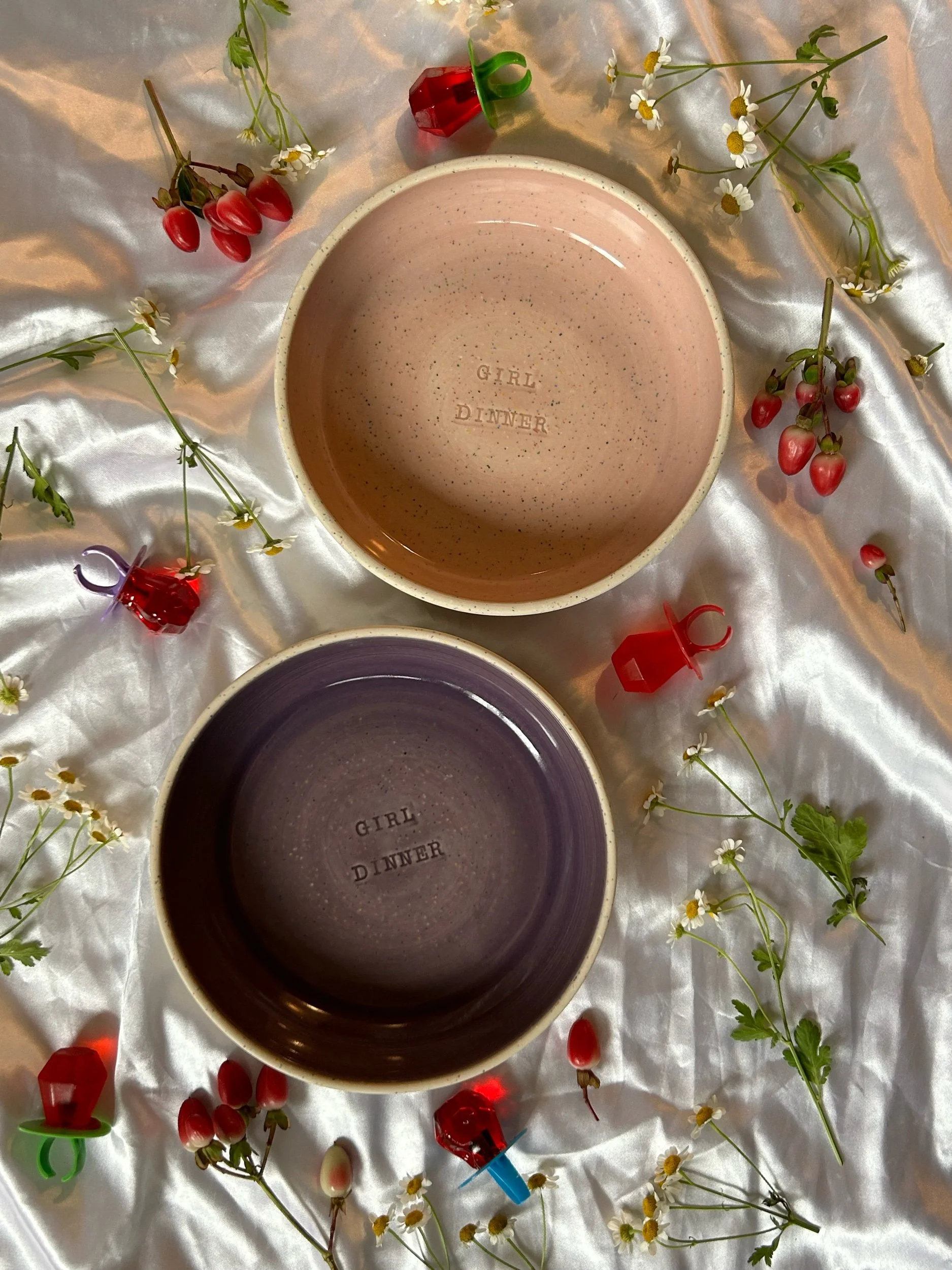 Set of two small blates (kind of a bowl, kind of a plate) made with rainbow speckled clay with stamped lettering that reads “GIRL DINNER“