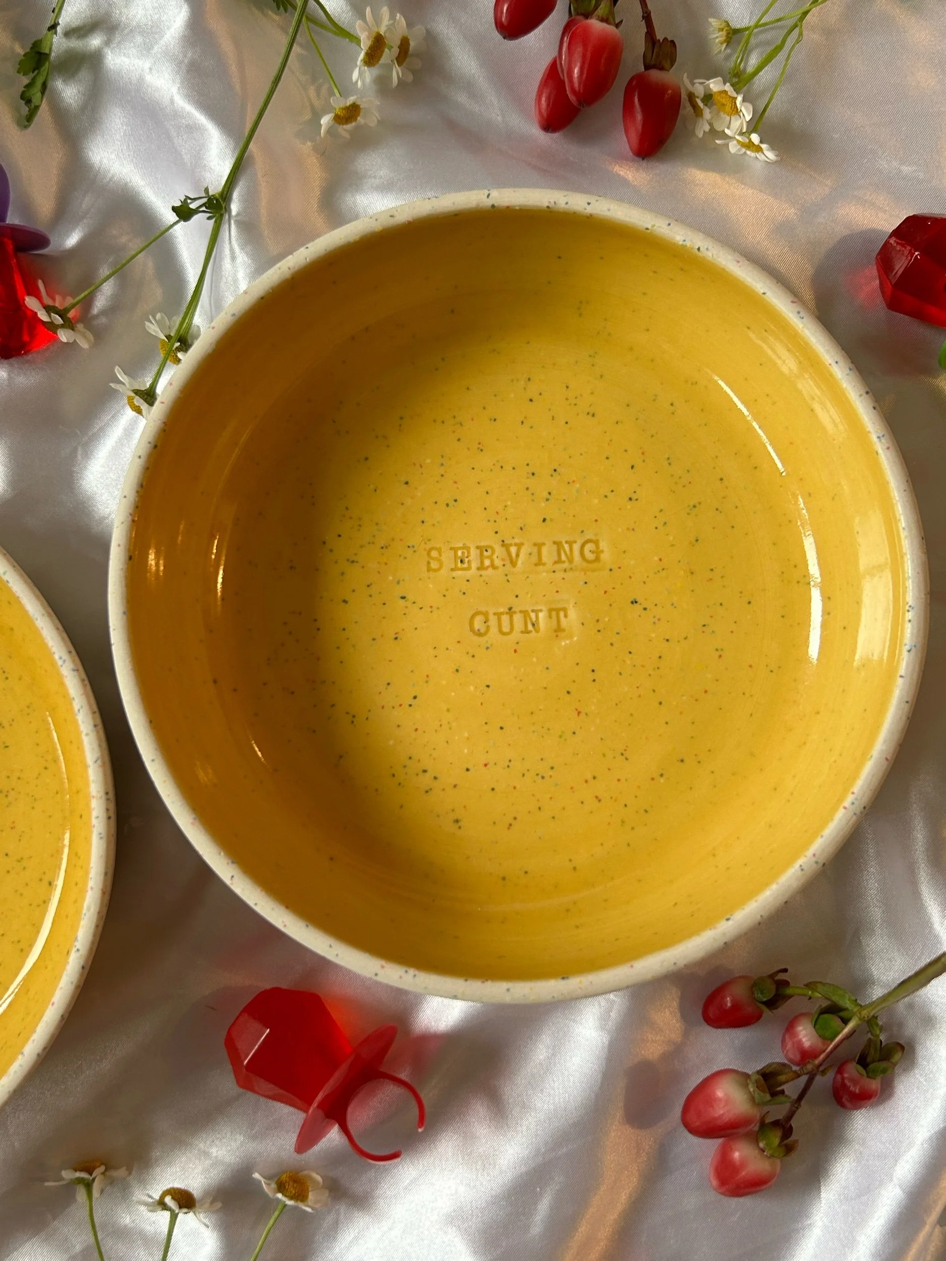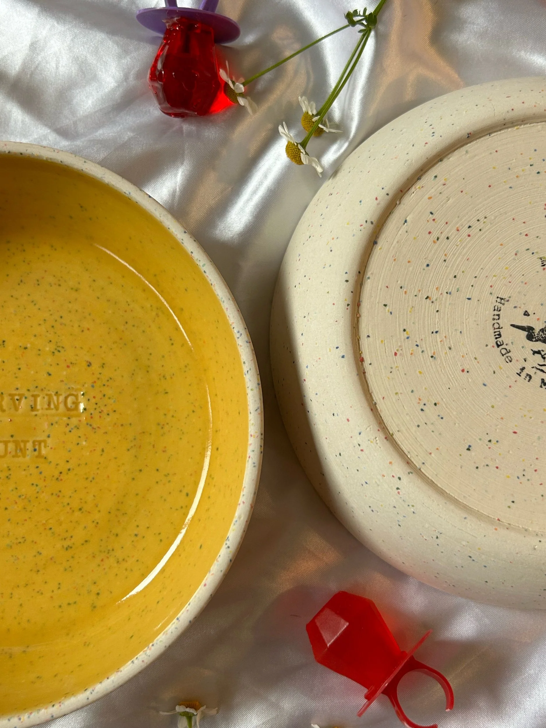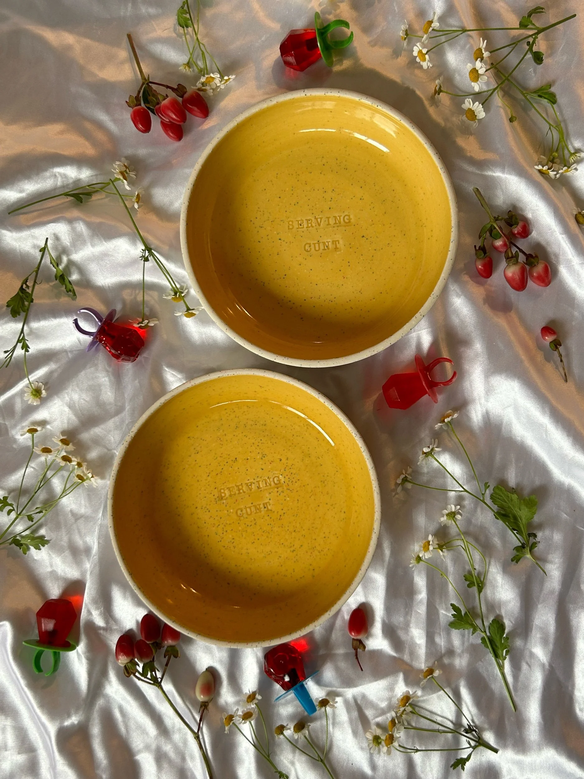 Set of two small blates (kind of a bowl, kind of a plate) made with rainbow speckled clay with stamped lettering that reads “GIRL DINNER“ Glazed in a rich, marigold yellow.