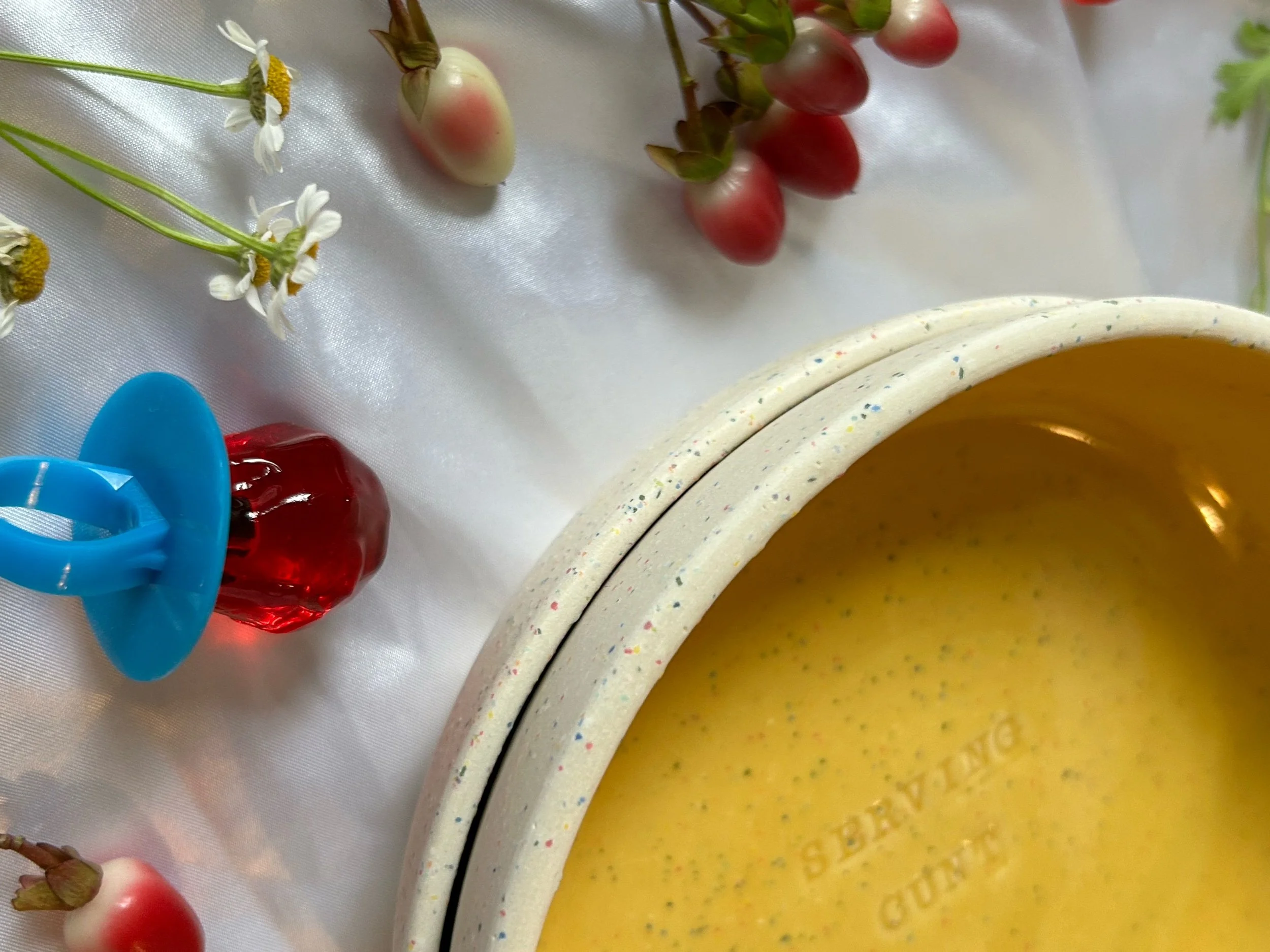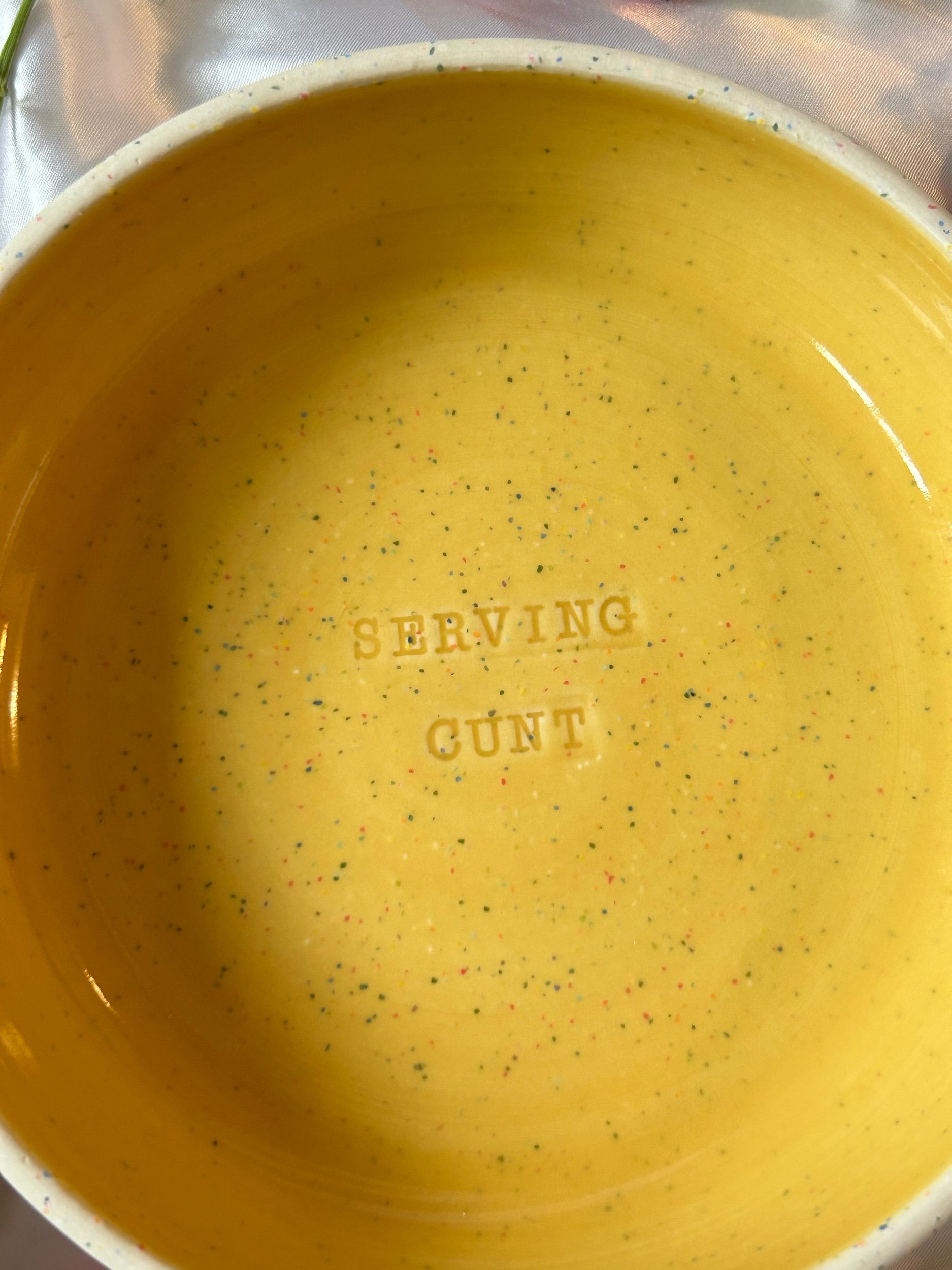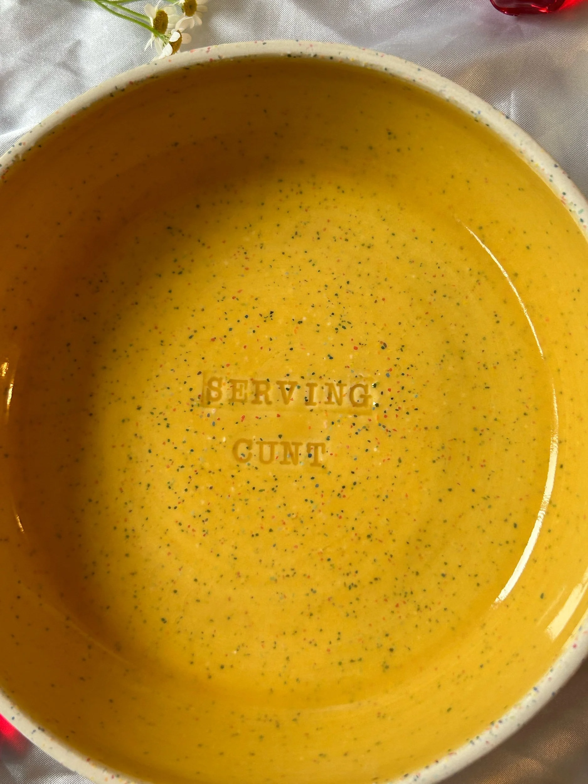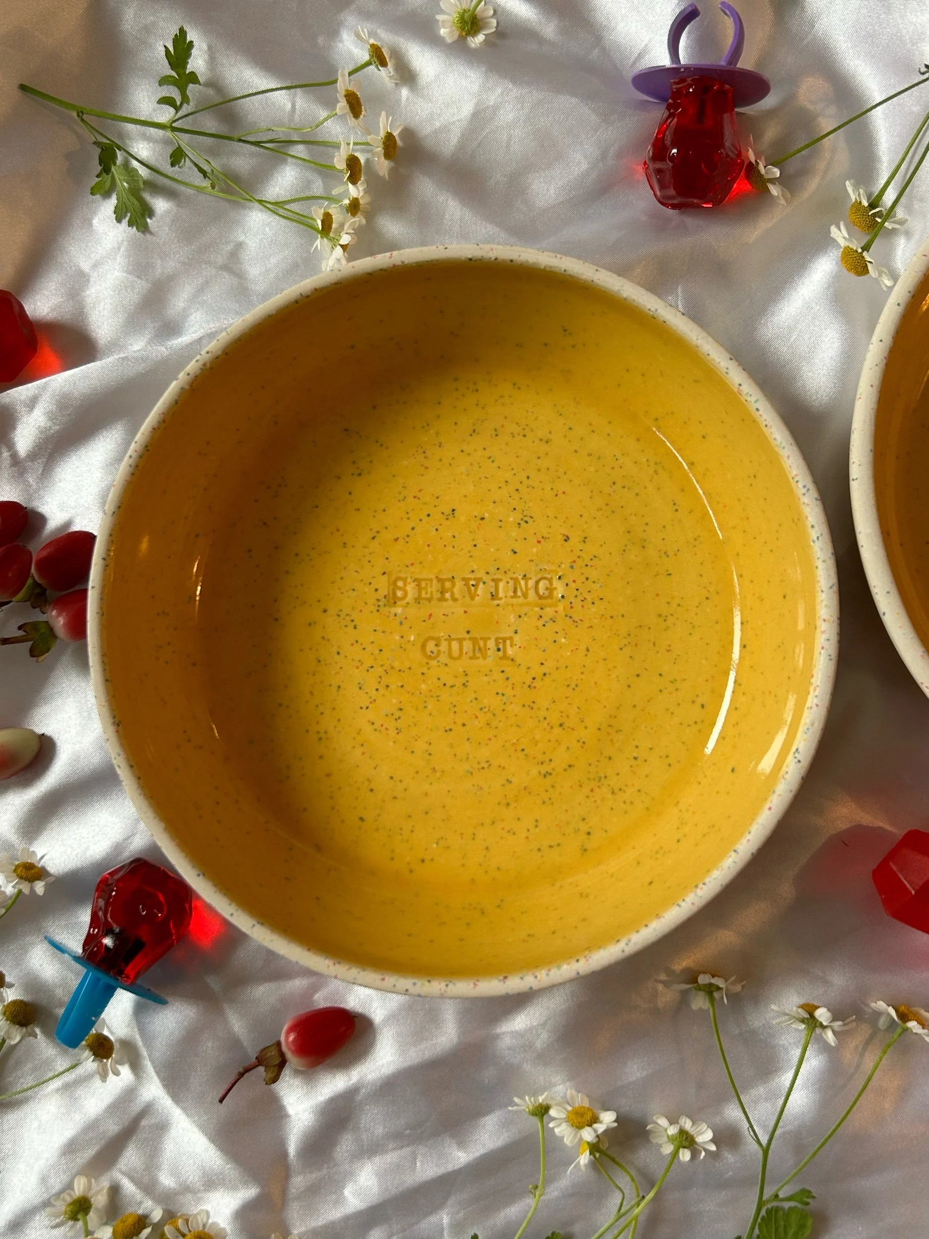 Set of two small blates (kind of a bowl, kind of a plate) made with rainbow speckled clay with stamped lettering that reads “GIRL DINNER“ Glazed in a rich, marigold yellow.