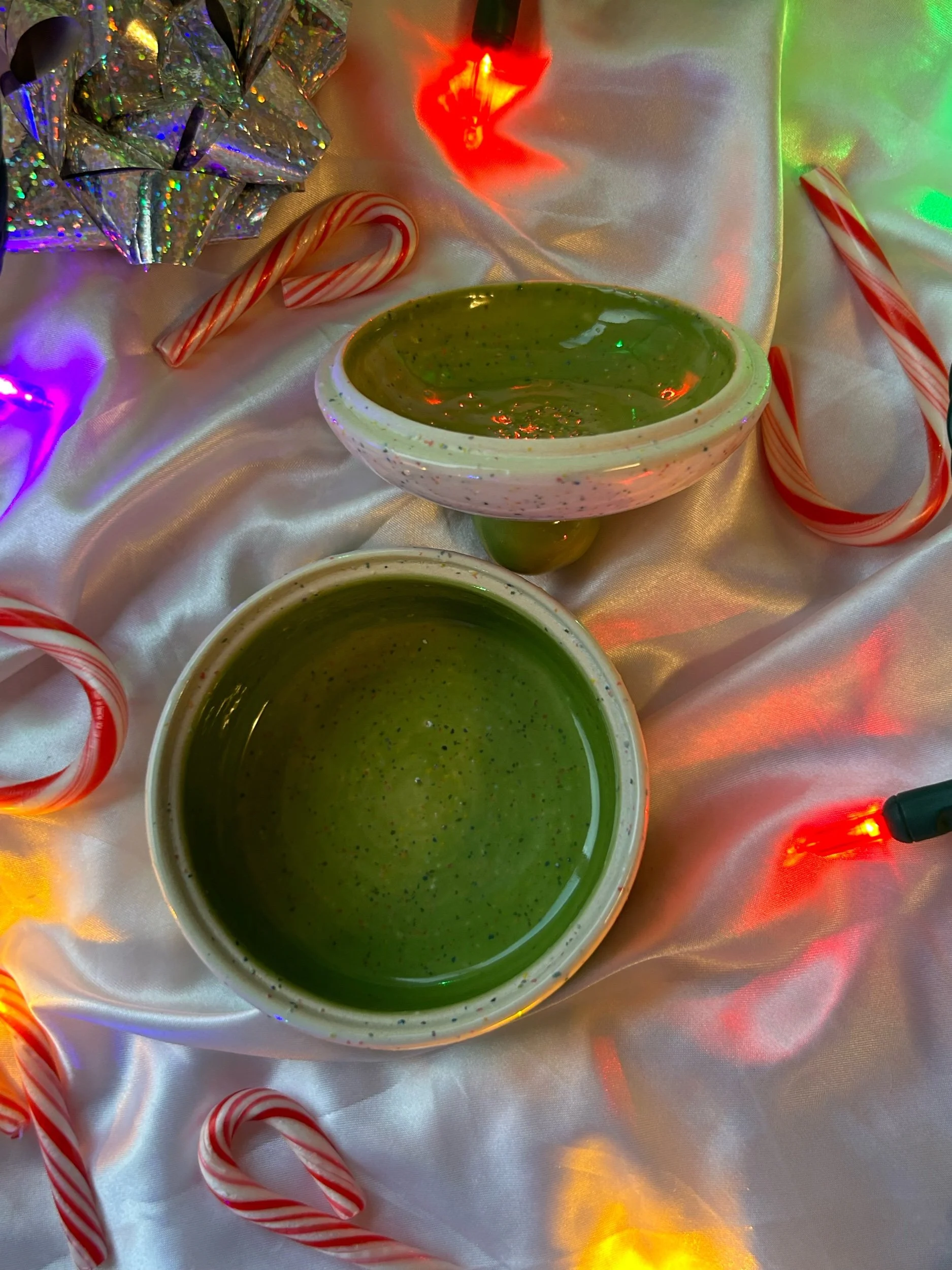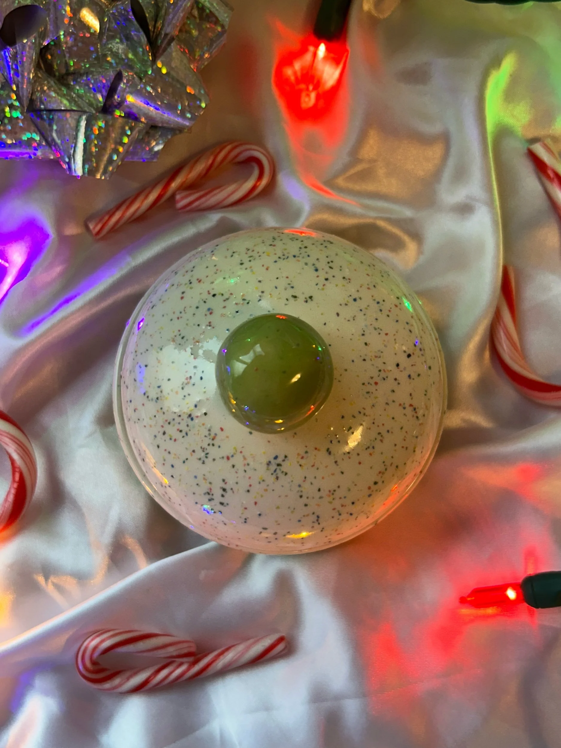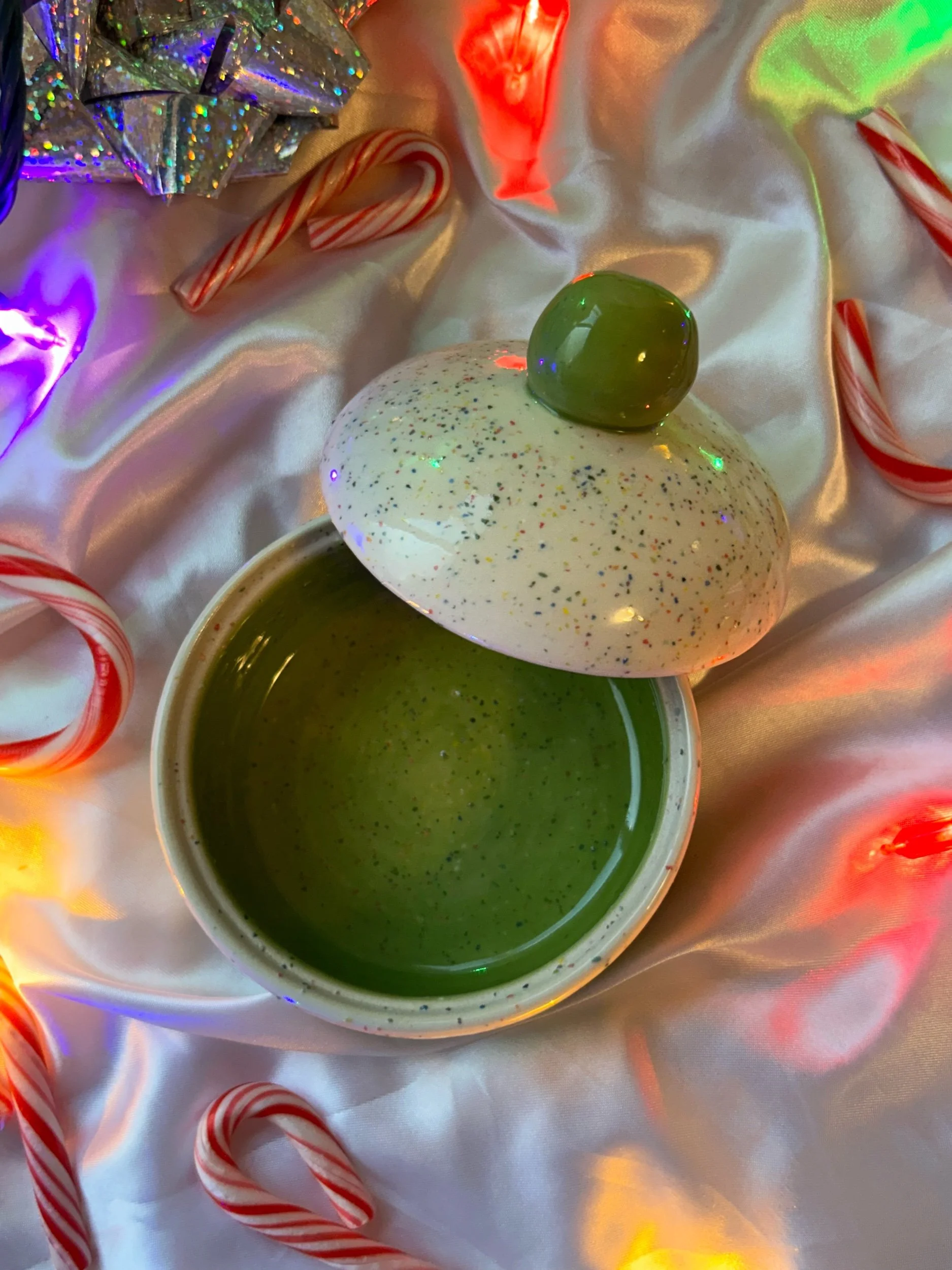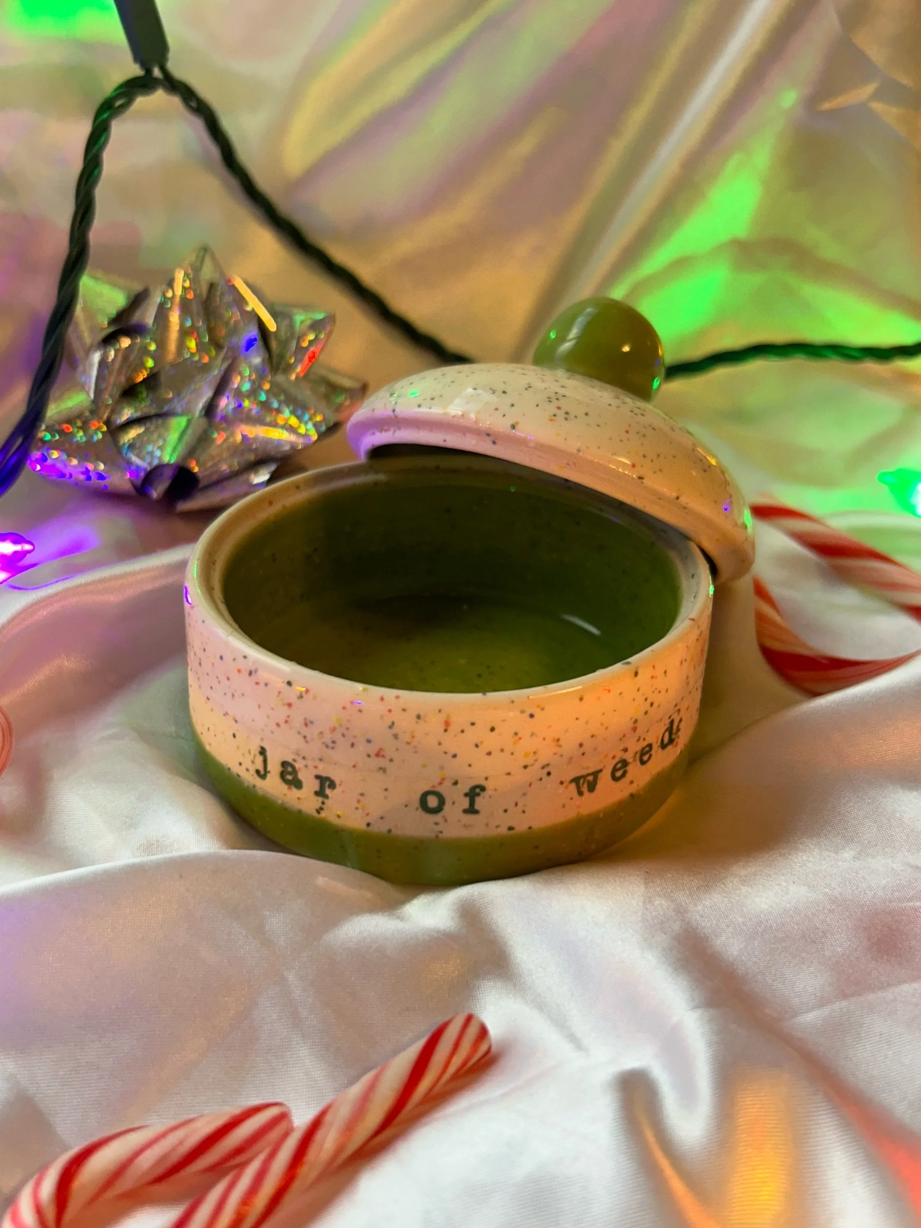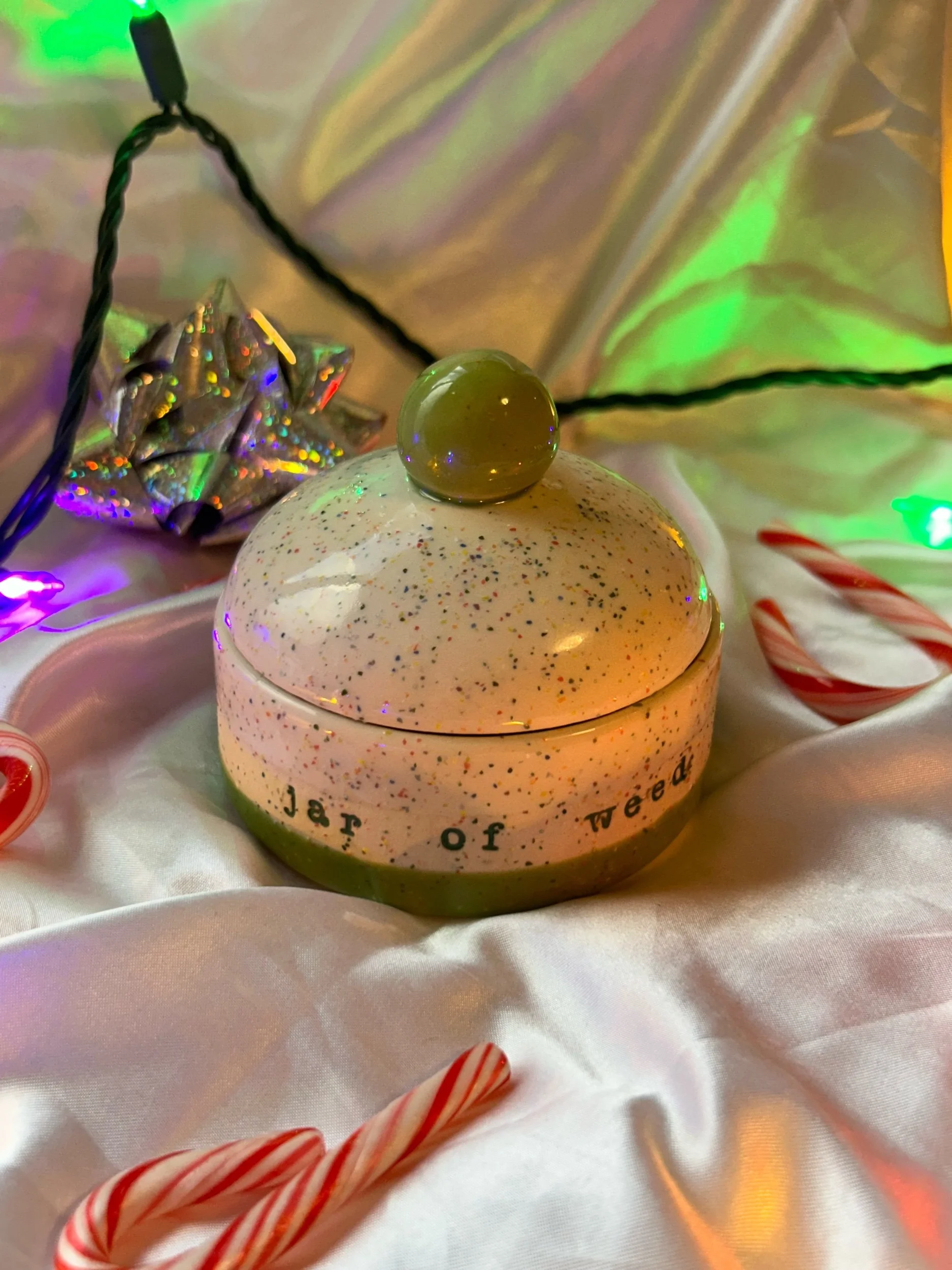 Small lidded jar made with rainbow speckled clay. Glazed in alternating green and clear colors with green stamped lettering that reads “jar of weed”